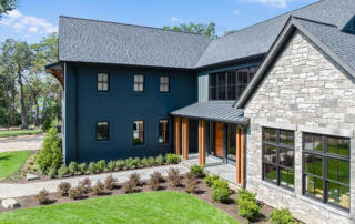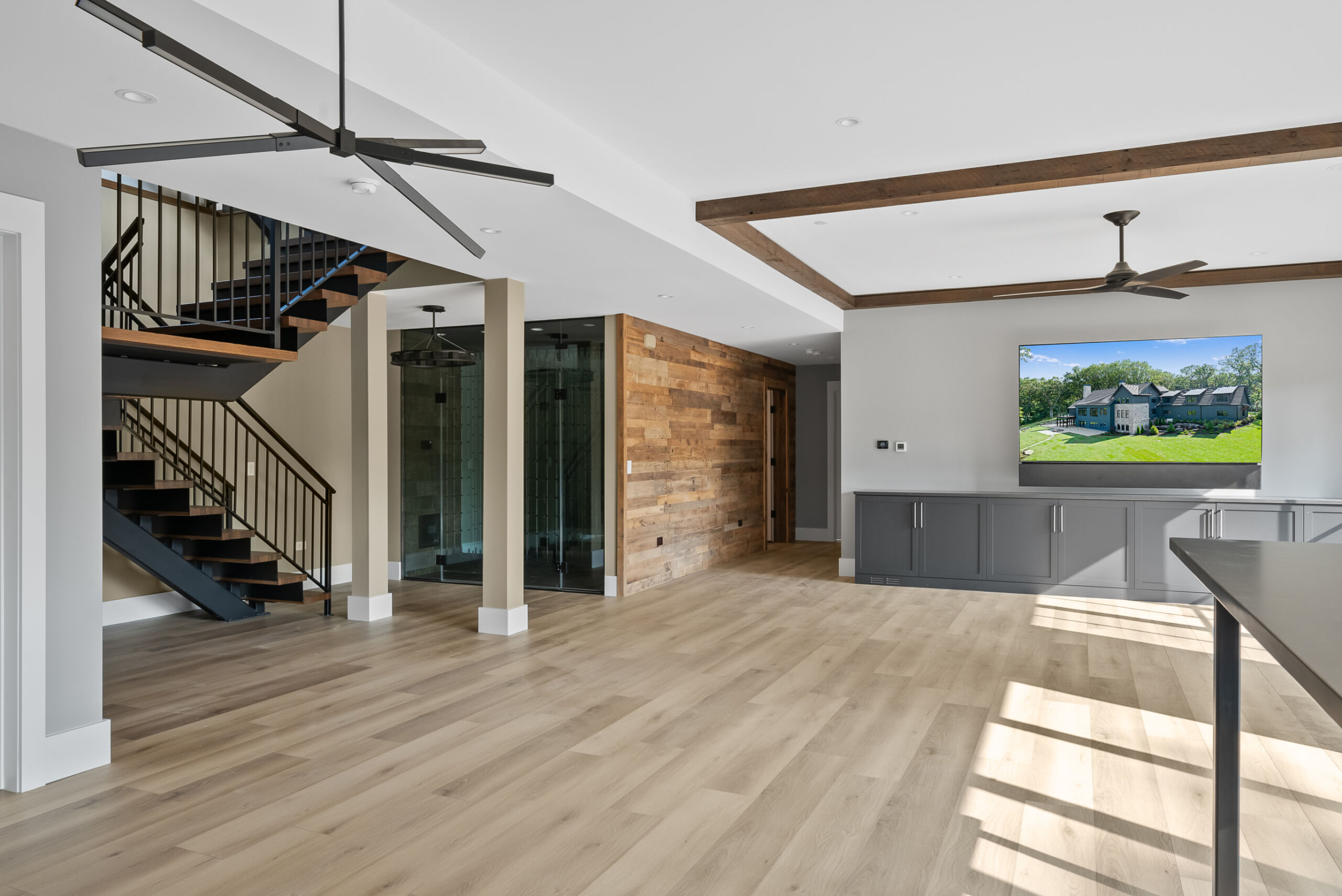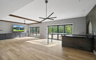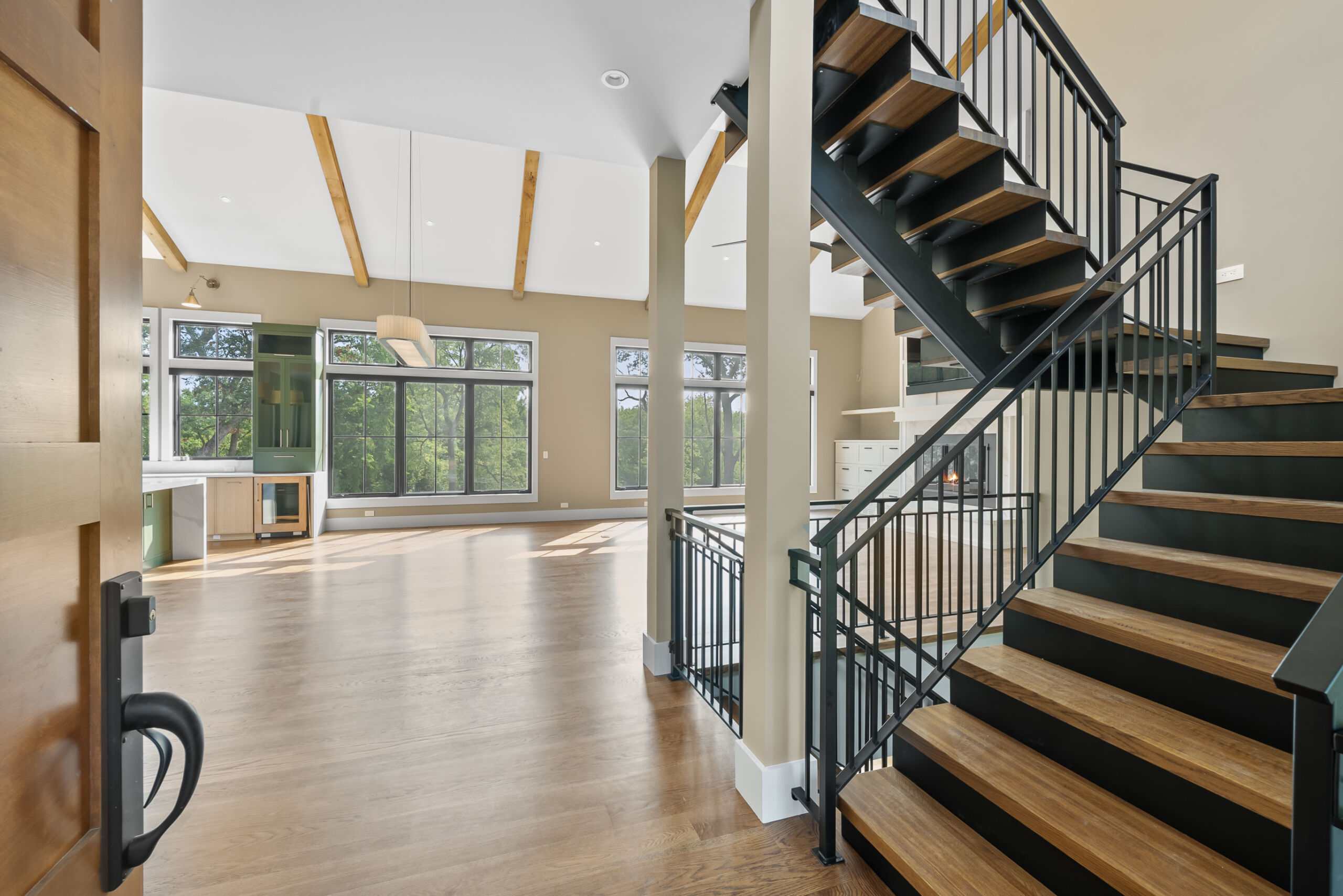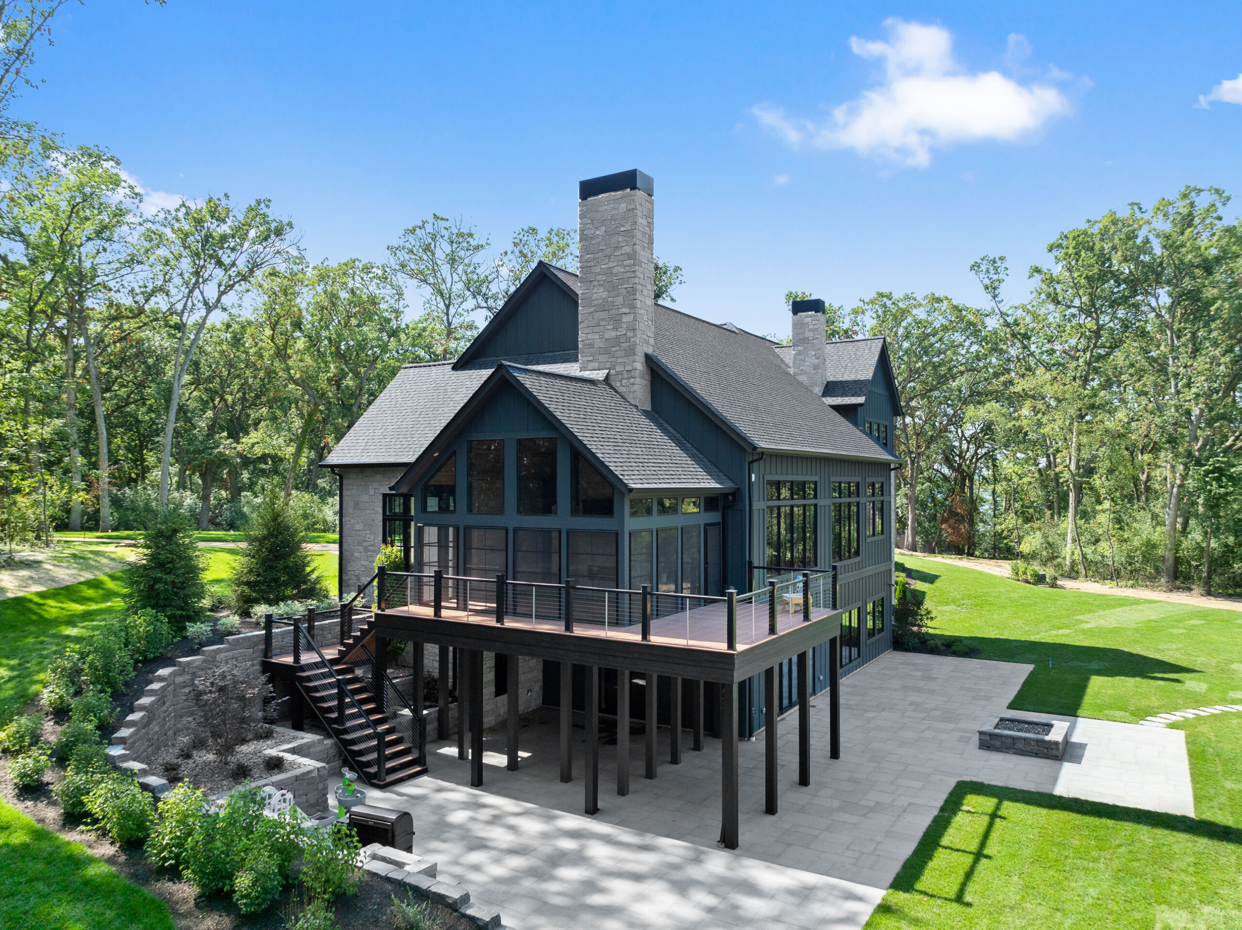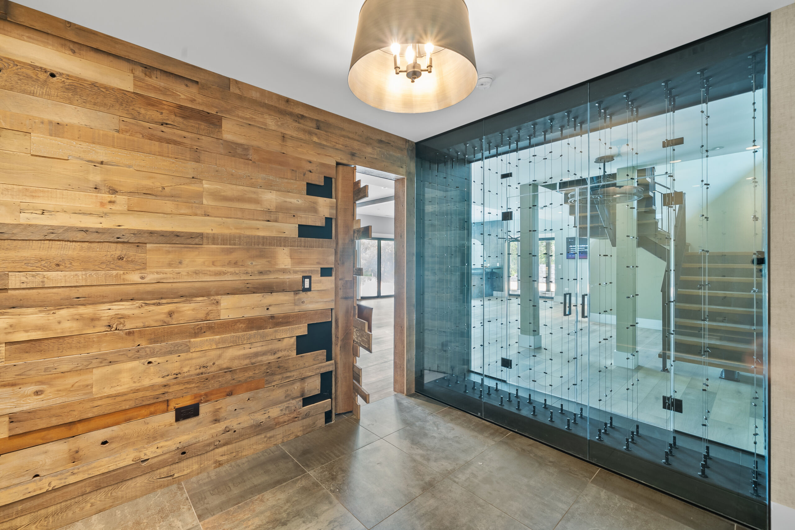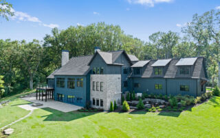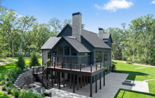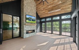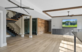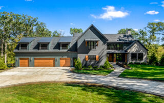 Matustik Builders crafted this stunning modern farmhouse in Lake Geneva, Wisconsin, with family living in mind. Upon entering, you're greeted by a striking floating staircase that leads to a great room with floor-to-ceiling windows offering beautiful wooded views. The gourmet kitchen features custom cabinets and warm, inviting colors. A charming three-season room with a stone fireplace and wood plank ceiling adds to the home's cozy appeal. One of the standout features is a hidden room on the lower level, cleverly concealed within wood paneling, perfect for unwinding with a bottle from the impressive wine room. The lower level also includes a finished bar area and a workout room.