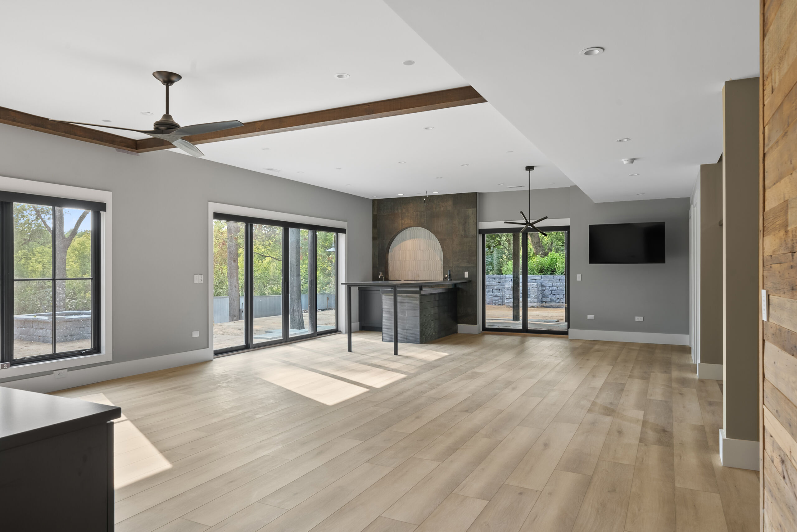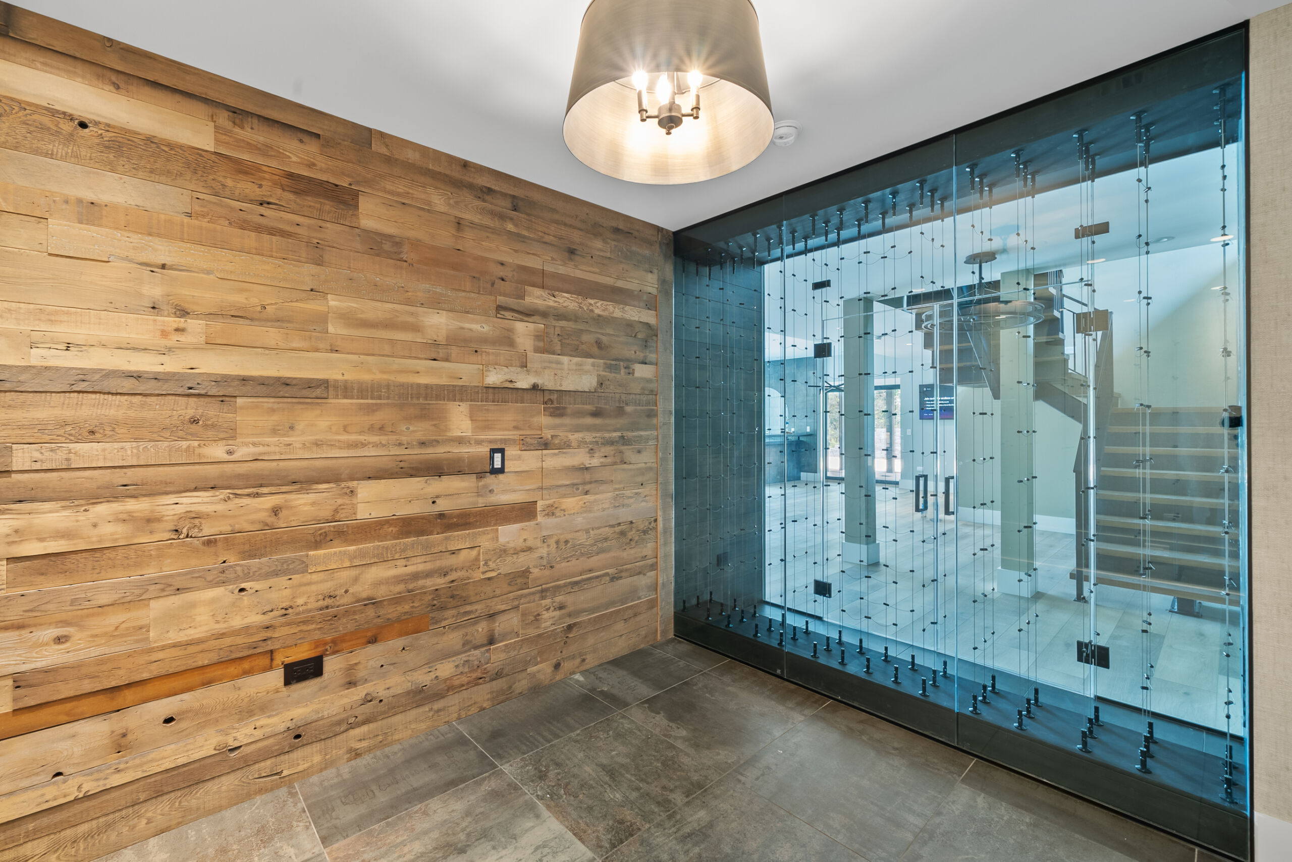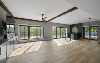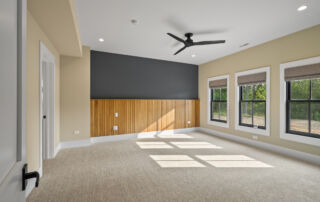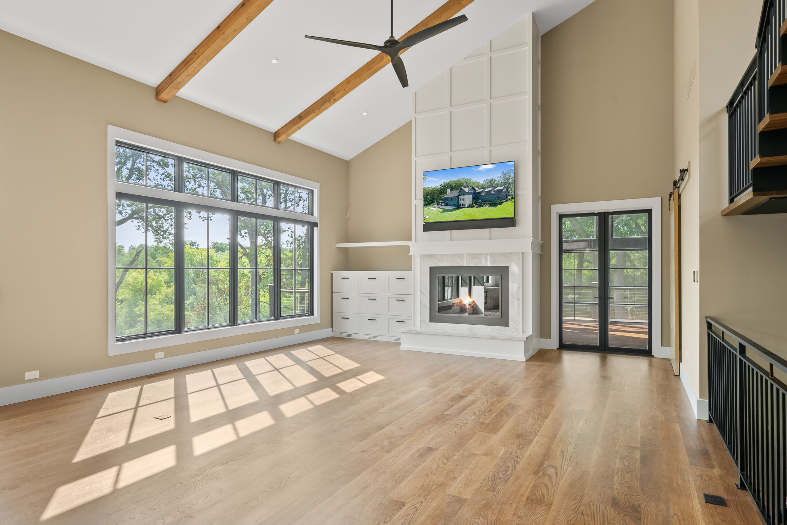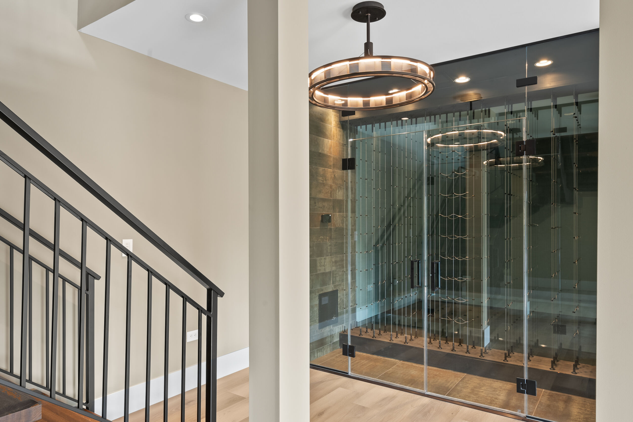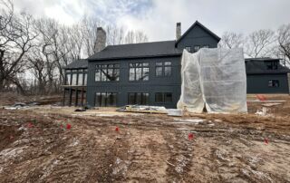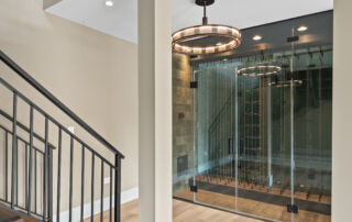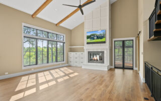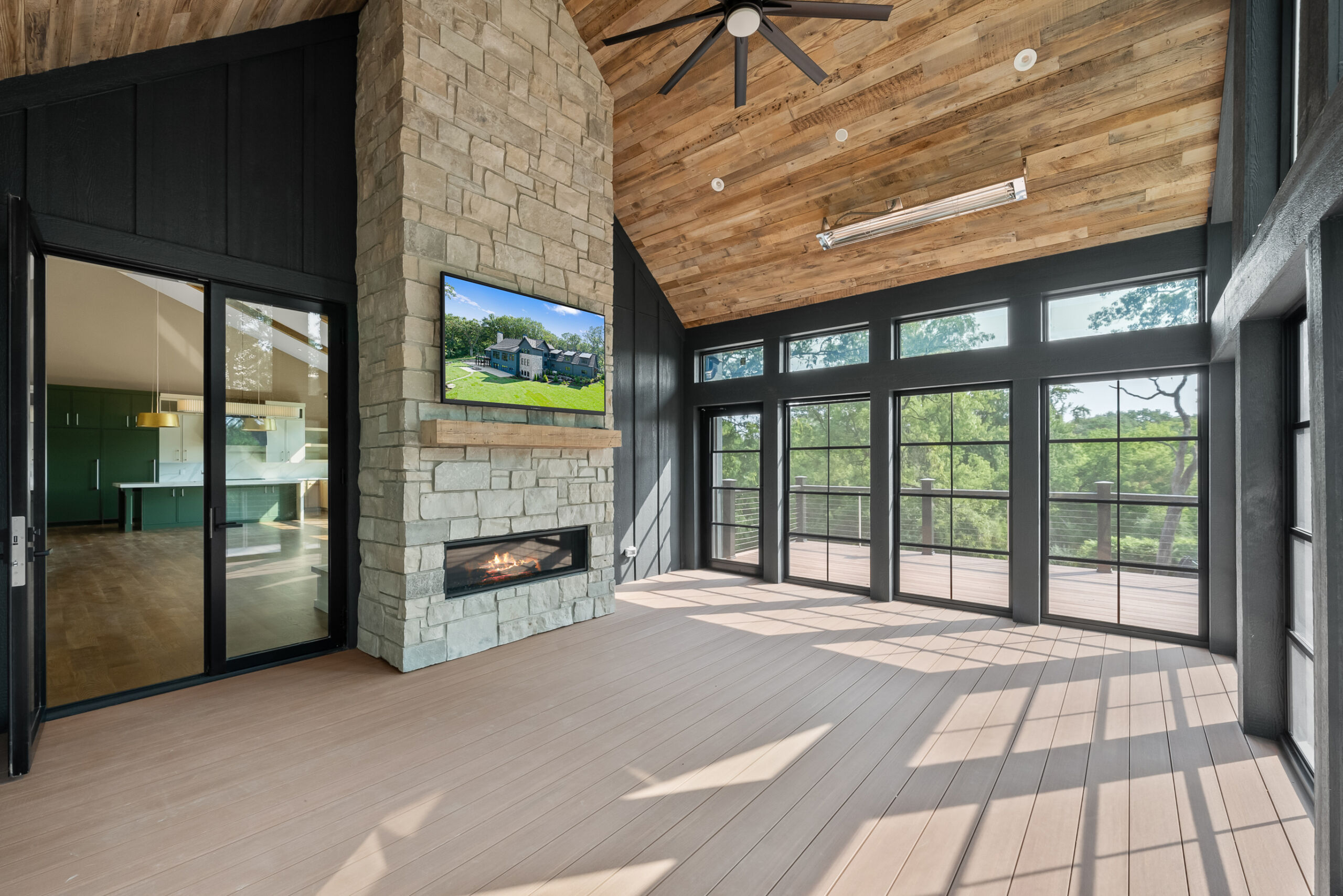 Matustik Builders crafted this stunning modern farmhouse in Lake Geneva, Wisconsin, with family living in mind. Upon entering, you're greeted by a striking floating staircase that leads to a great room with floor-to-ceiling windows offering beautiful wooded views. The gourmet kitchen features custom cabinets and warm, inviting colors. A charming three-season room with a stone fireplace and wood plank ceiling adds to the home's cozy appeal. One of the standout features is a hidden room on the lower level, cleverly concealed within wood paneling, perfect for unwinding with a bottle from the impressive wine room. The lower level also includes a finished bar area and a workout room.