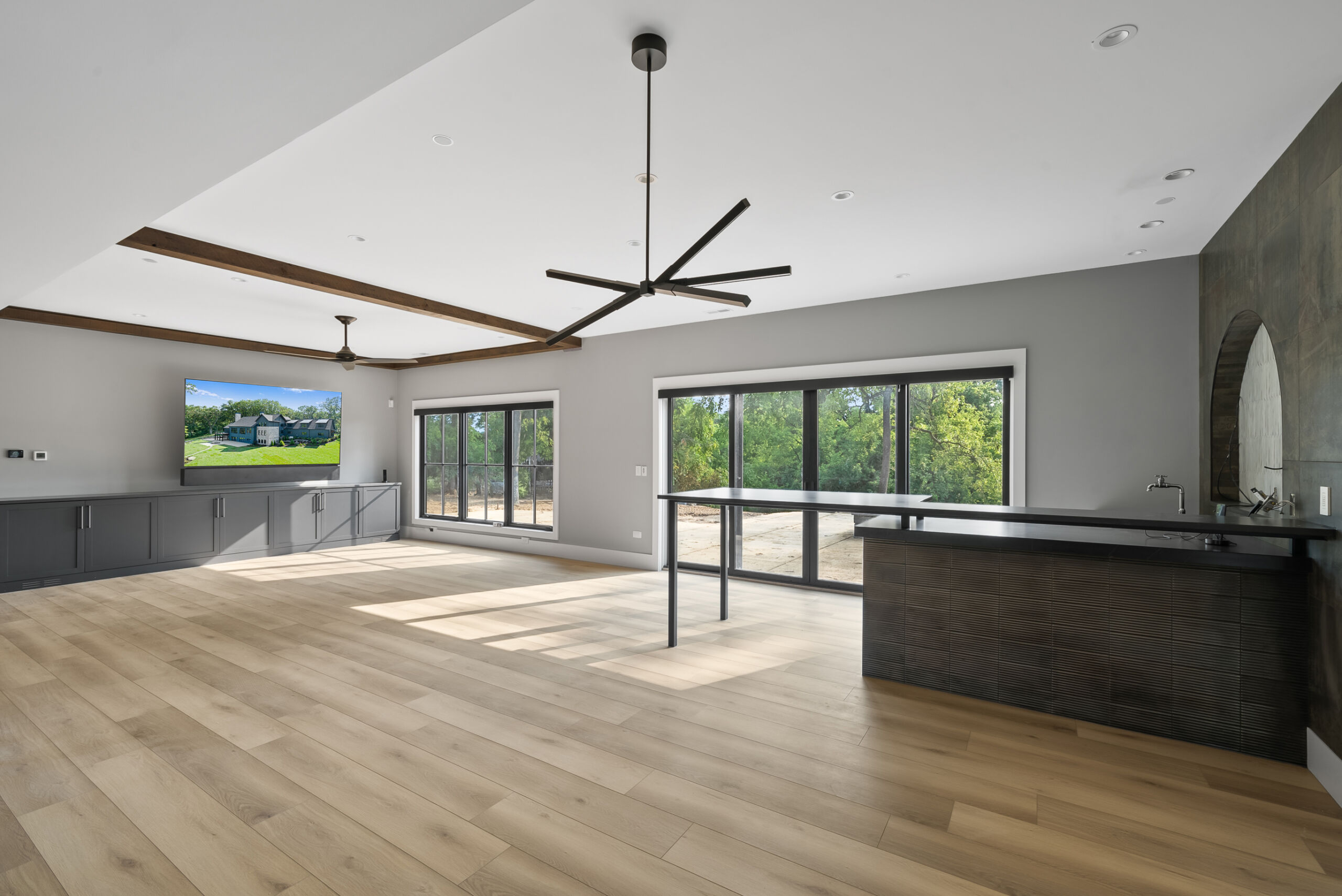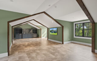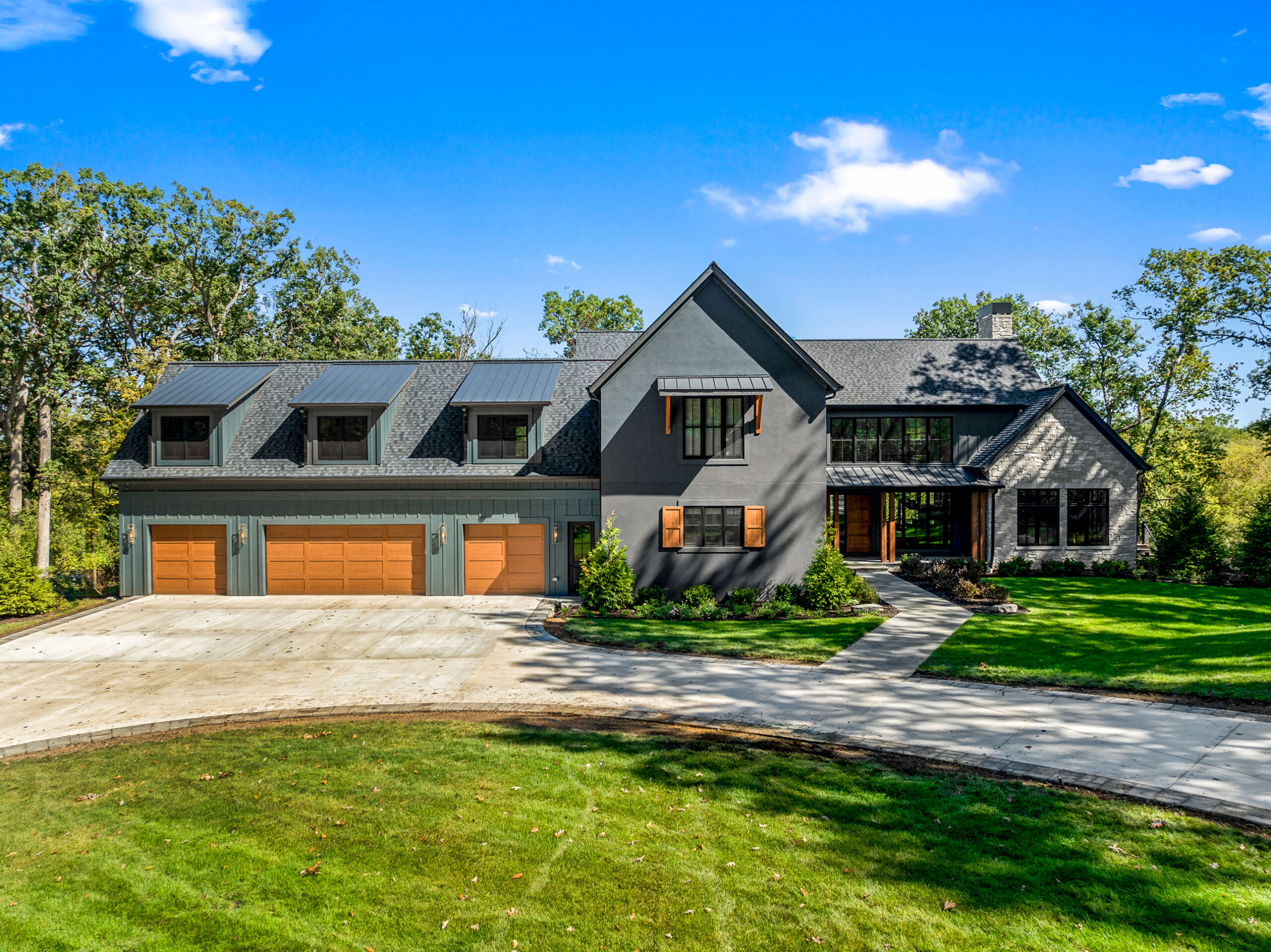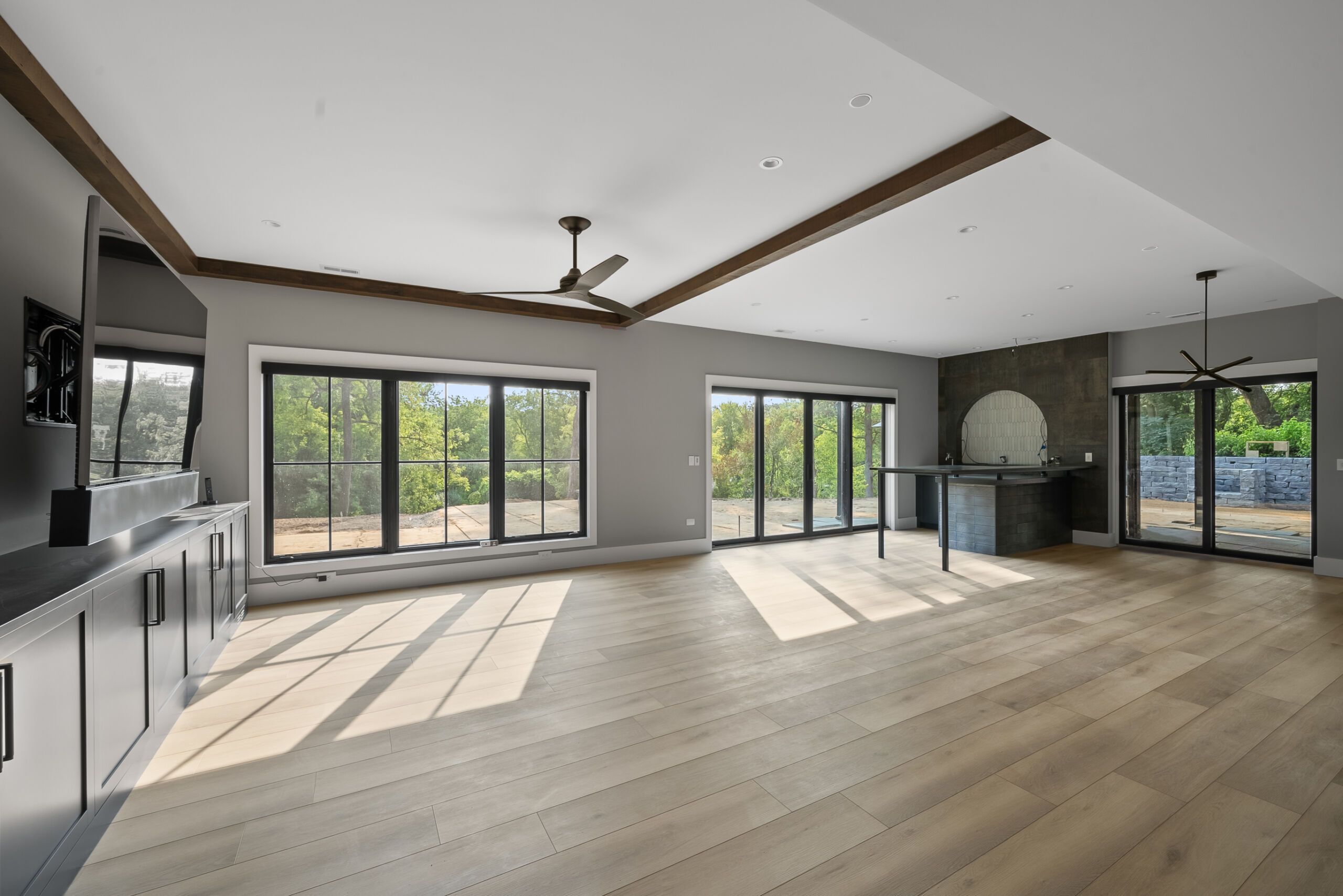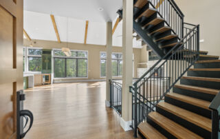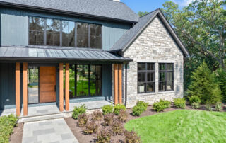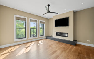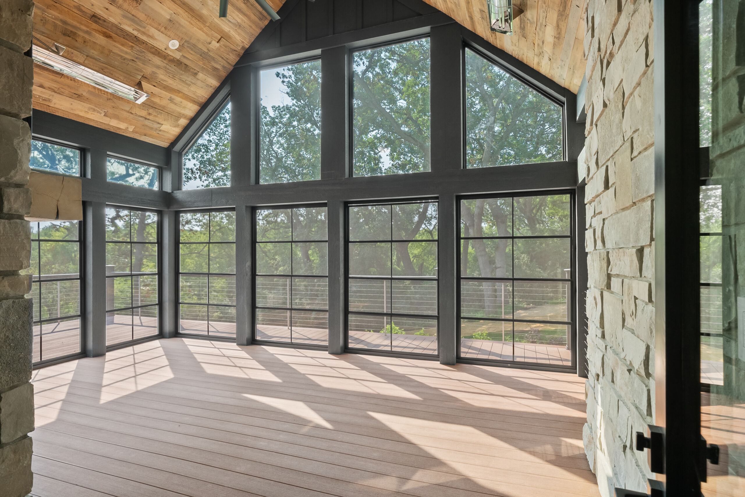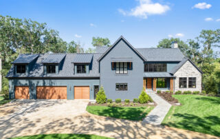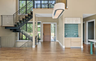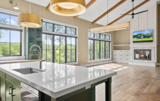 Matustik Builders crafted this stunning modern farmhouse in Lake Geneva, Wisconsin, with family living in mind. Upon entering, you're greeted by a striking floating staircase that leads to a great room with floor-to-ceiling windows offering beautiful wooded views. The gourmet kitchen features custom cabinets and warm, inviting colors. A charming three-season room with a stone fireplace and wood plank ceiling adds to the home's cozy appeal. One of the standout features is a hidden room on the lower level, cleverly concealed within wood paneling, perfect for unwinding with a bottle from the impressive wine room. The lower level also includes a finished bar area and a workout room.