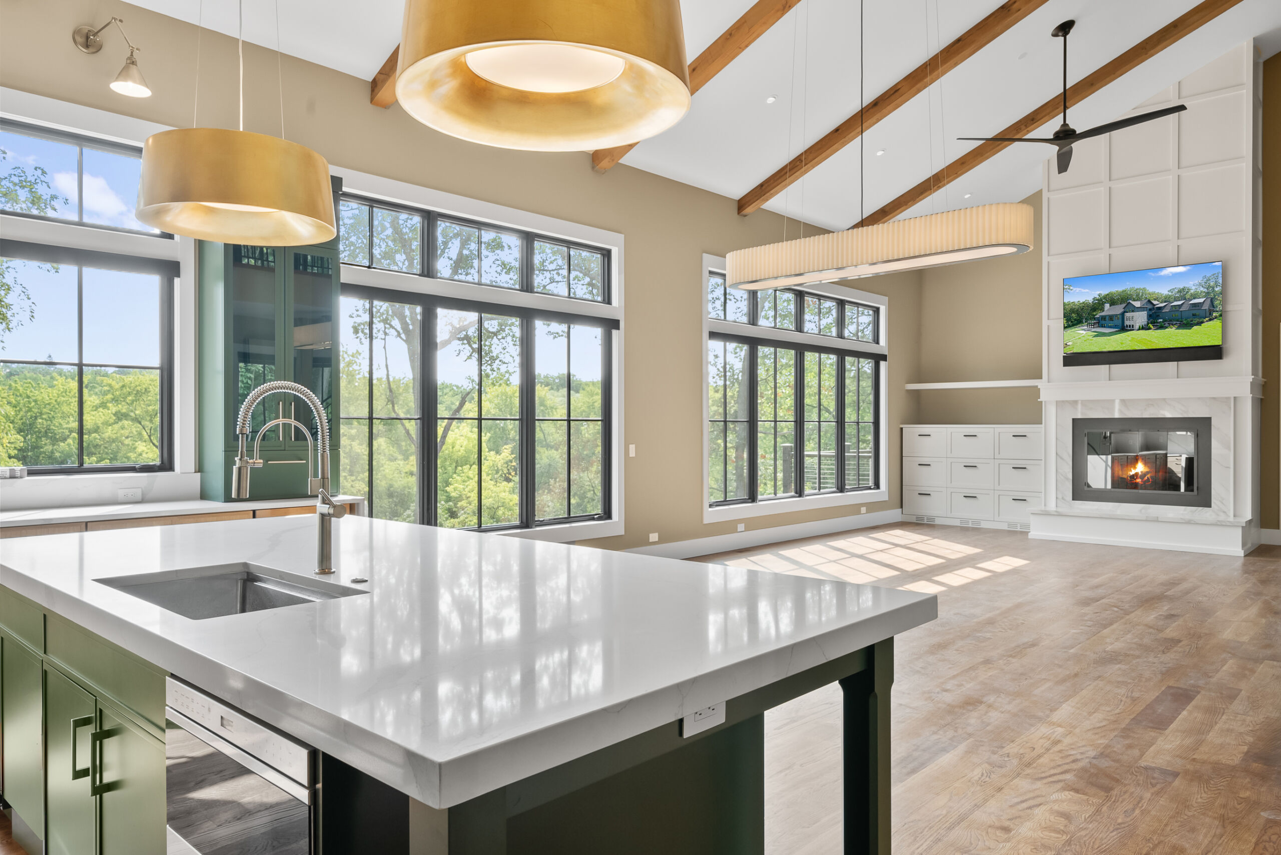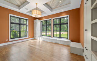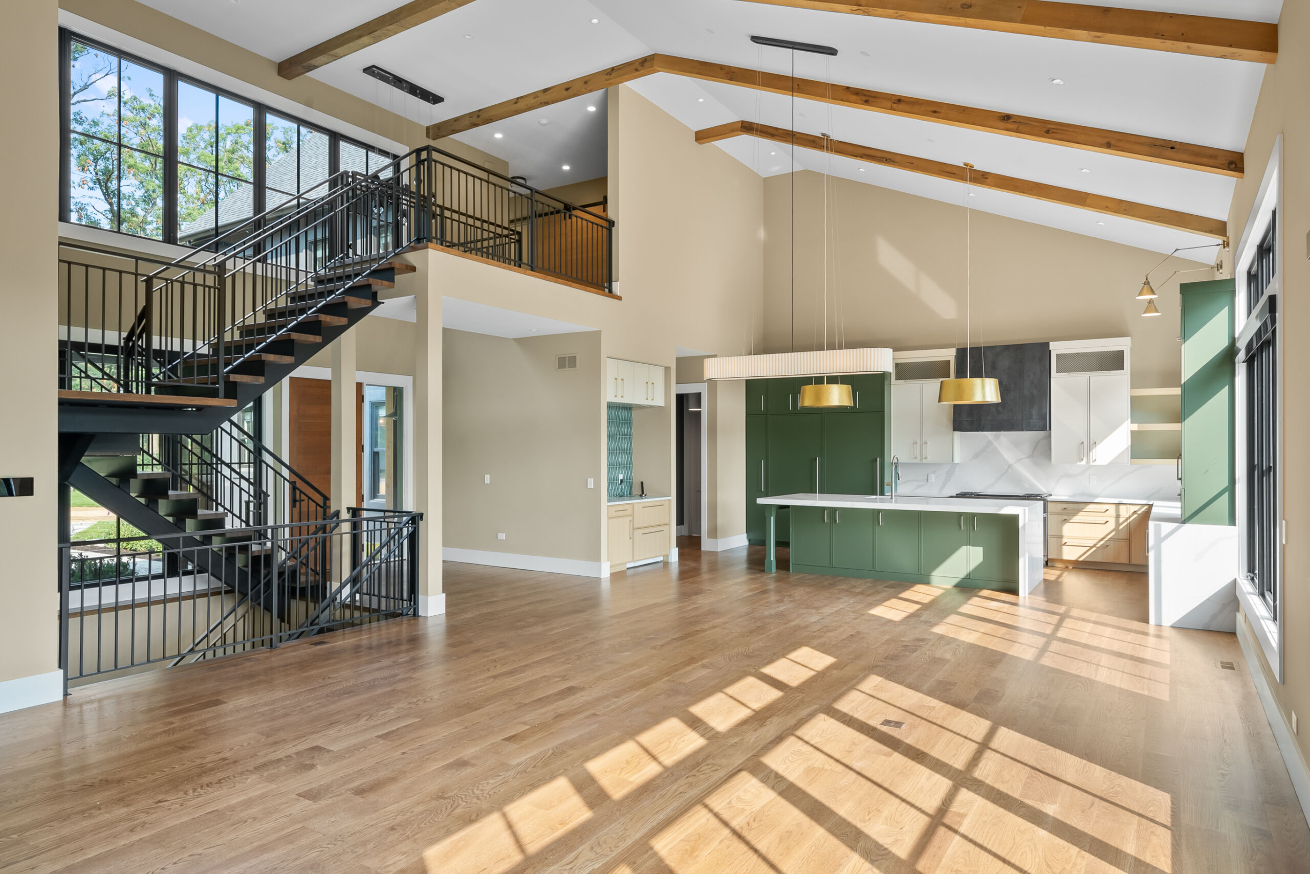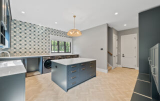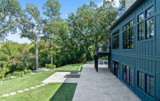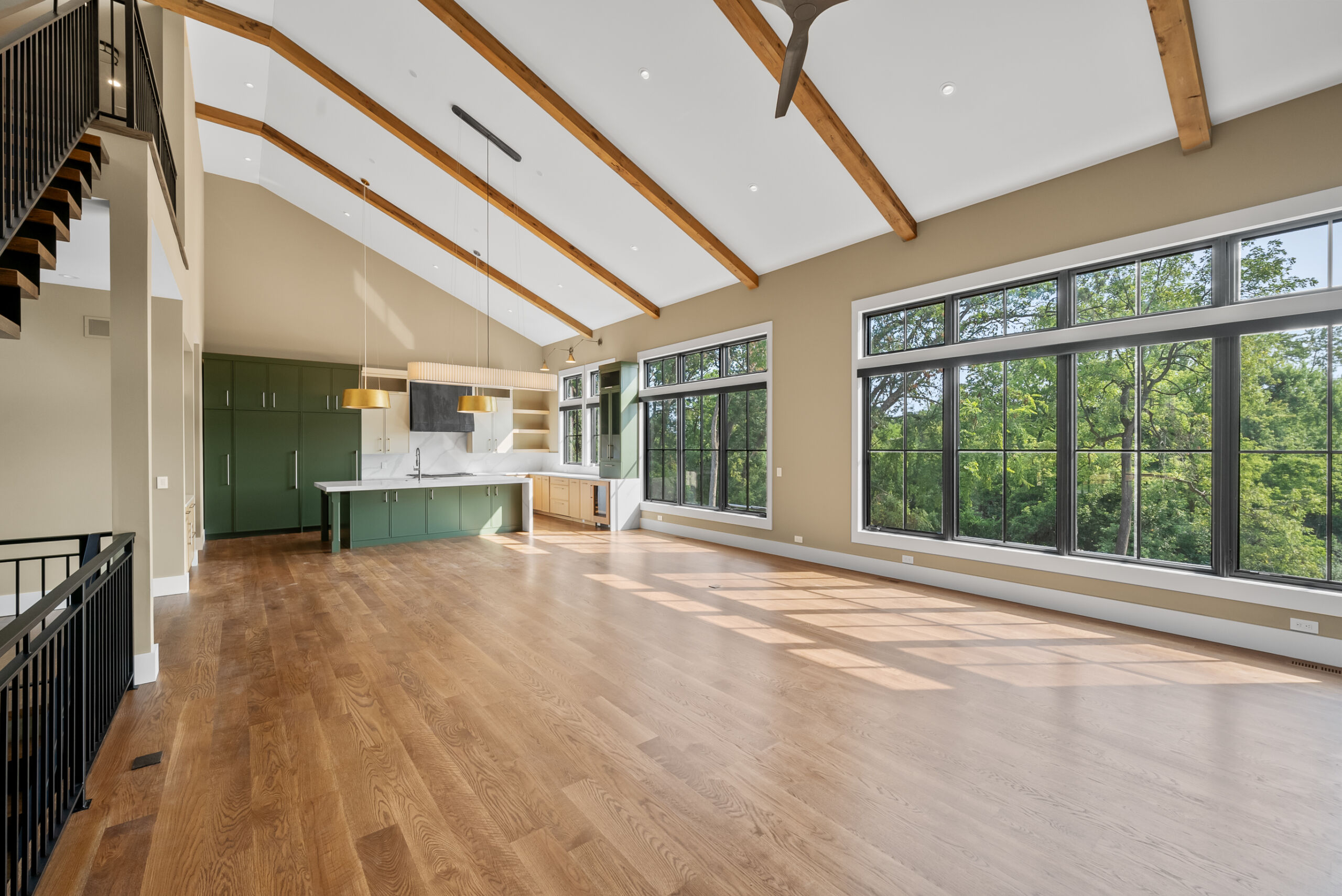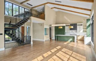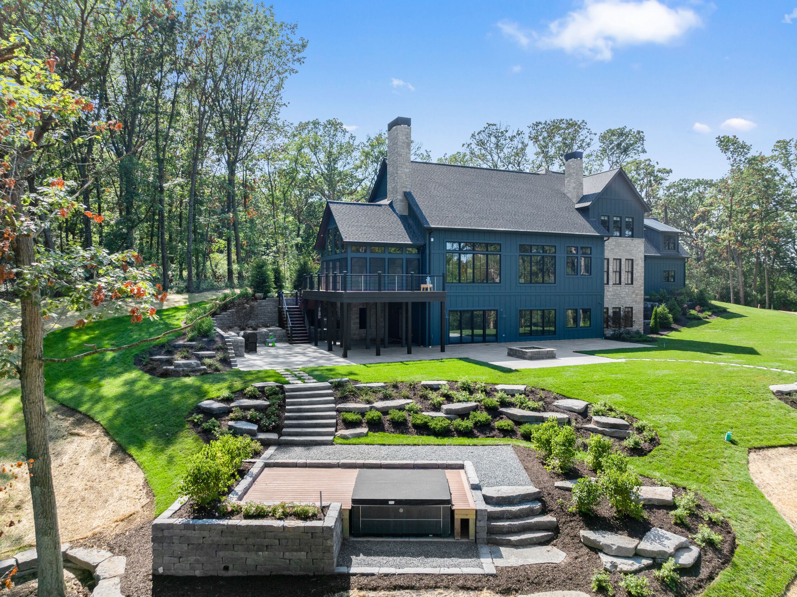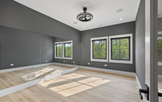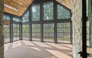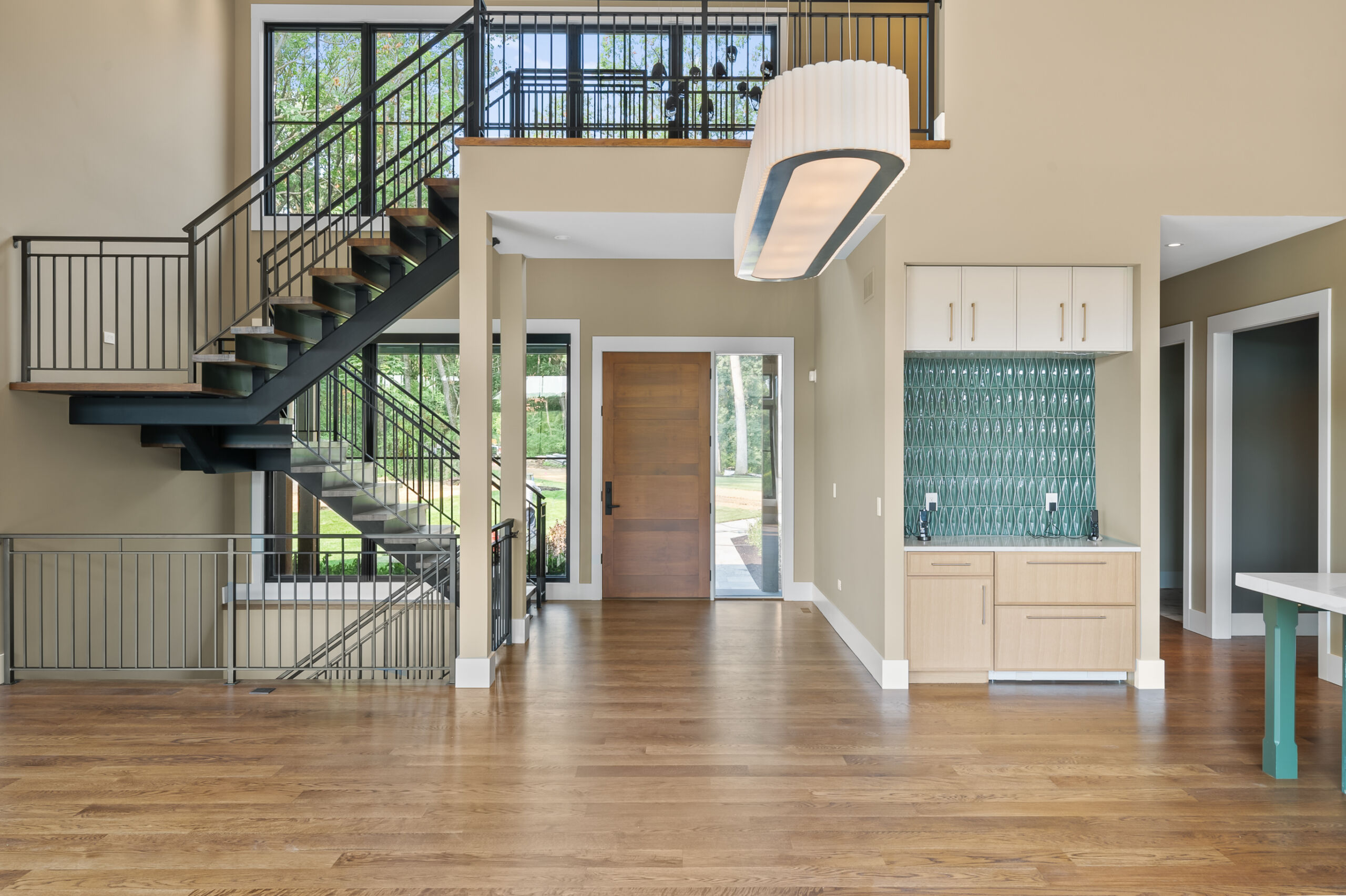 Matustik Builders crafted this stunning modern farmhouse in Lake Geneva, Wisconsin, with family living in mind. Upon entering, you're greeted by a striking floating staircase that leads to a great room with floor-to-ceiling windows offering beautiful wooded views. The gourmet kitchen features custom cabinets and warm, inviting colors. A charming three-season room with a stone fireplace and wood plank ceiling adds to the home's cozy appeal. One of the standout features is a hidden room on the lower level, cleverly concealed within wood paneling, perfect for unwinding with a bottle from the impressive wine room. The lower level also includes a finished bar area and a workout room.