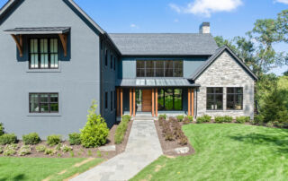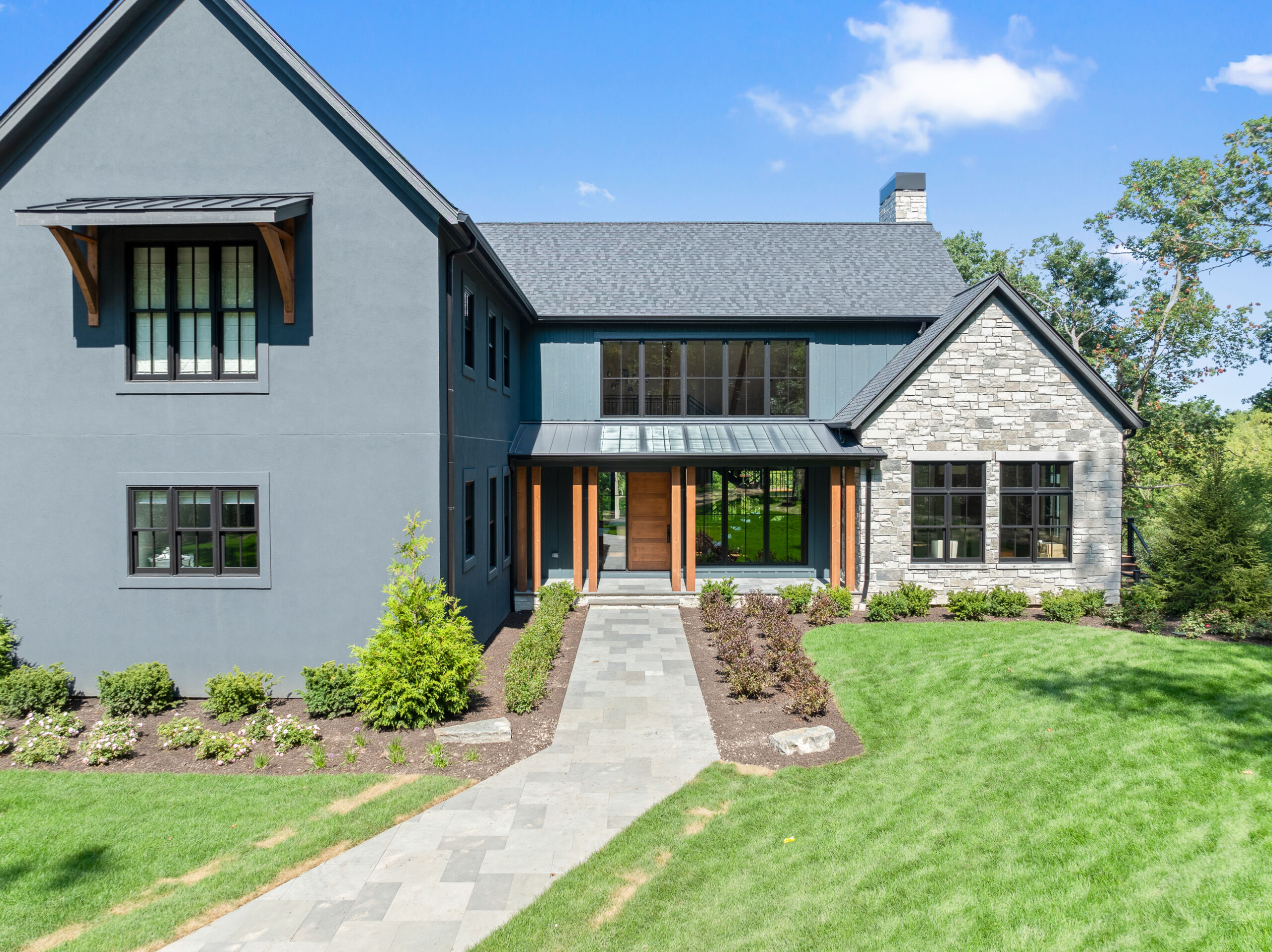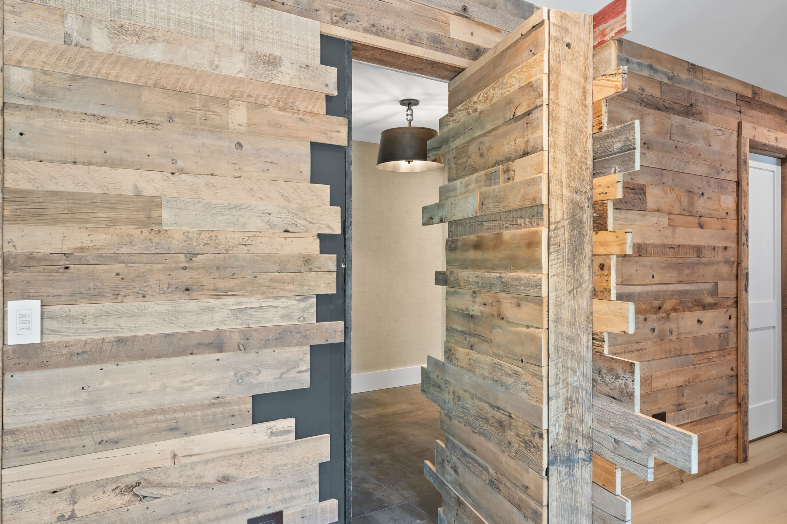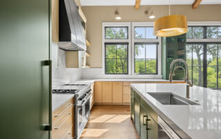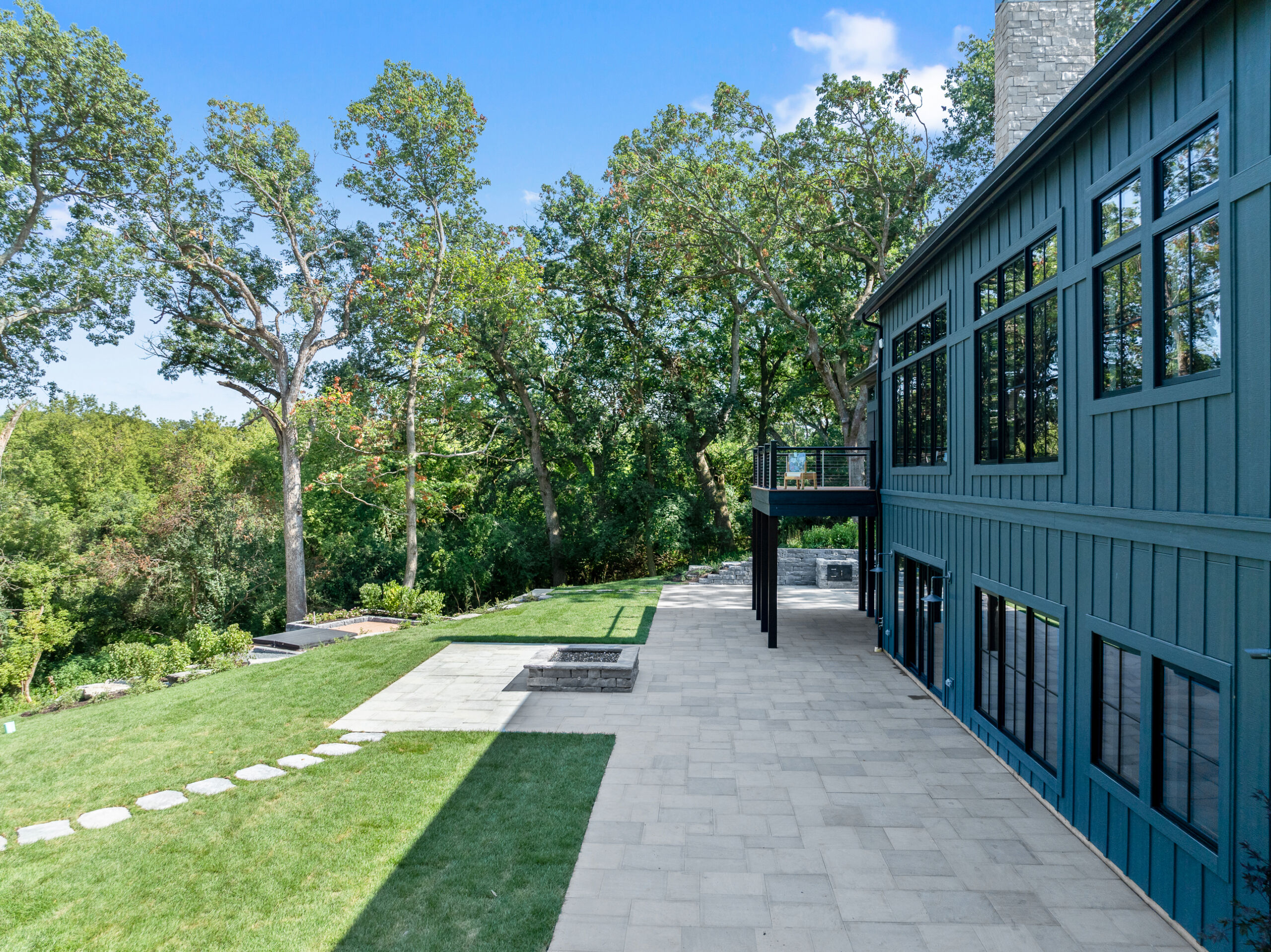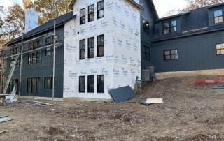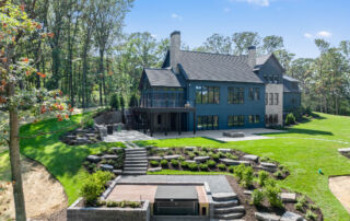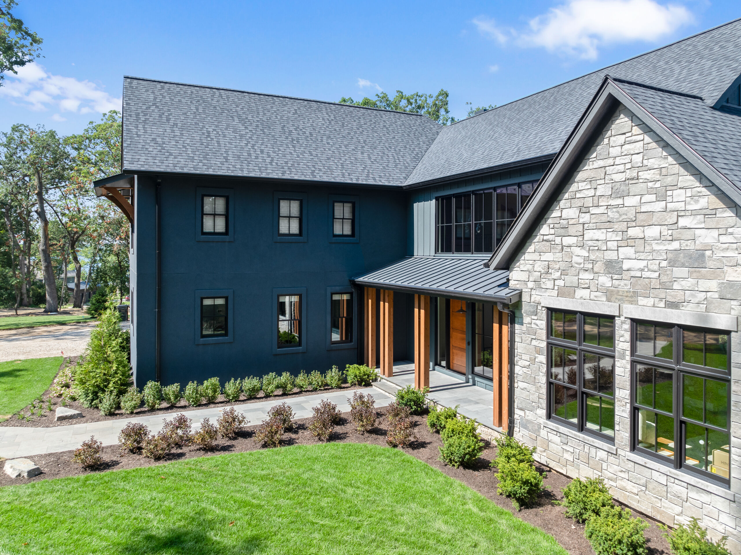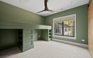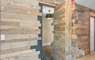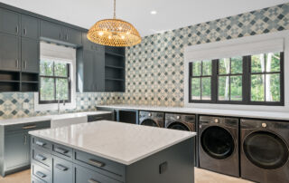 Matustik Builders crafted this stunning modern farmhouse in Lake Geneva, Wisconsin, with family living in mind. Upon entering, you're greeted by a striking floating staircase that leads to a great room with floor-to-ceiling windows offering beautiful wooded views. The gourmet kitchen features custom cabinets and warm, inviting colors. A charming three-season room with a stone fireplace and wood plank ceiling adds to the home's cozy appeal. One of the standout features is a hidden room on the lower level, cleverly concealed within wood paneling, perfect for unwinding with a bottle from the impressive wine room. The lower level also includes a finished bar area and a workout room.