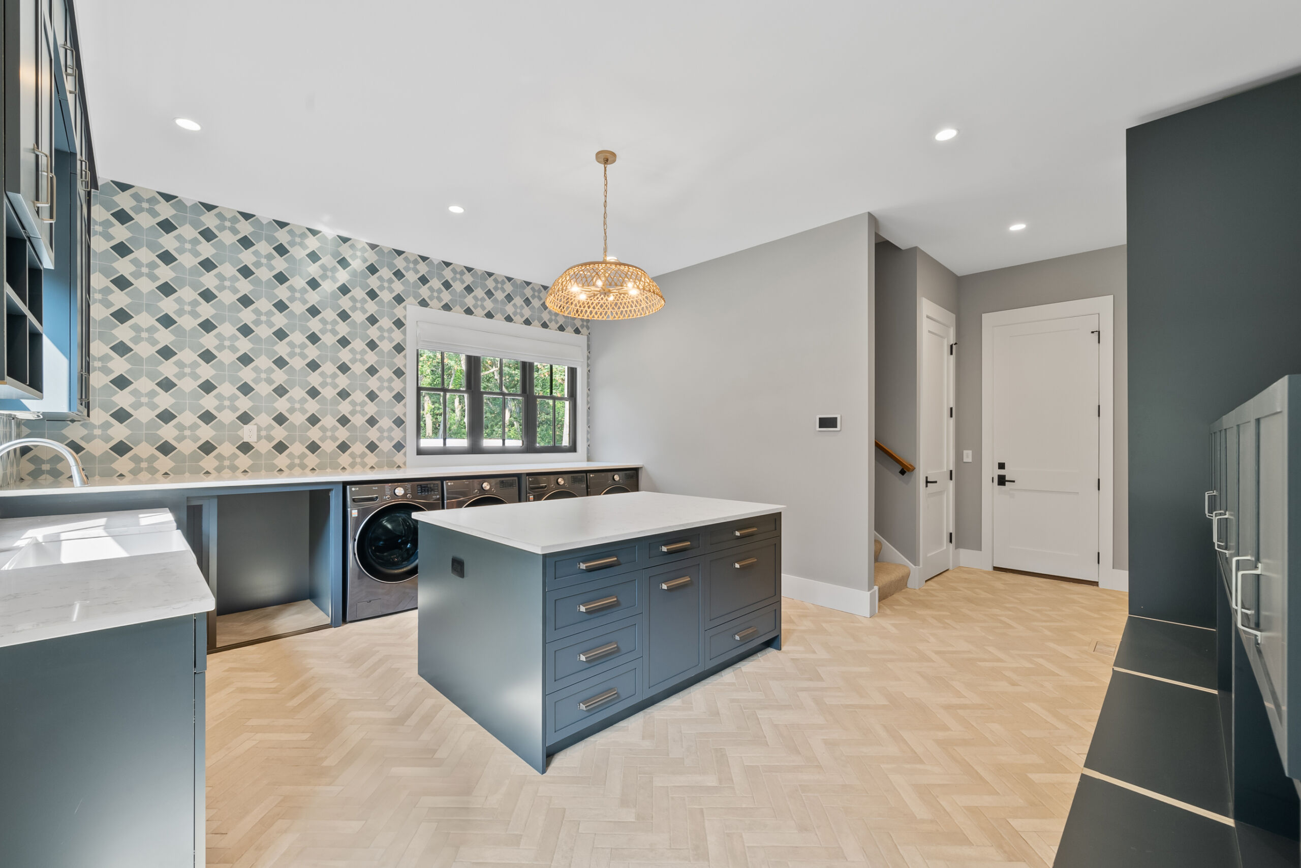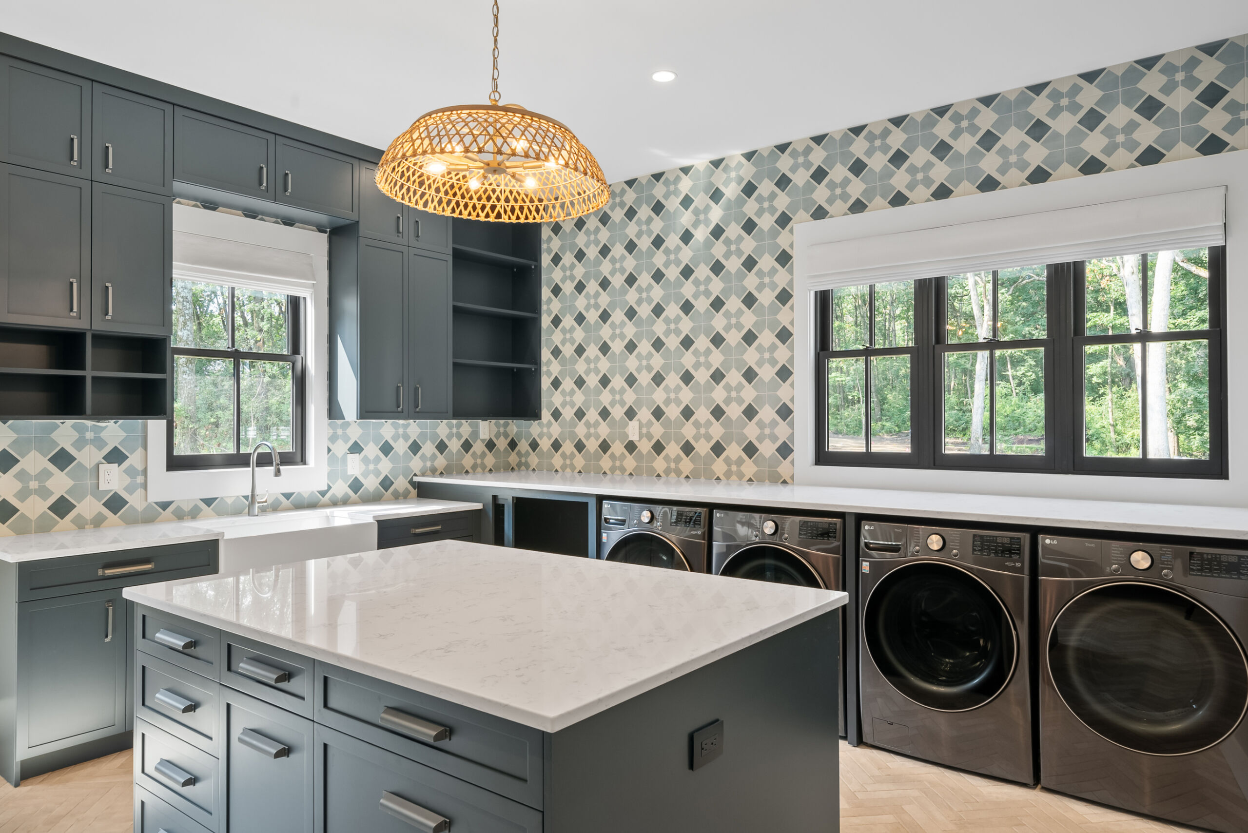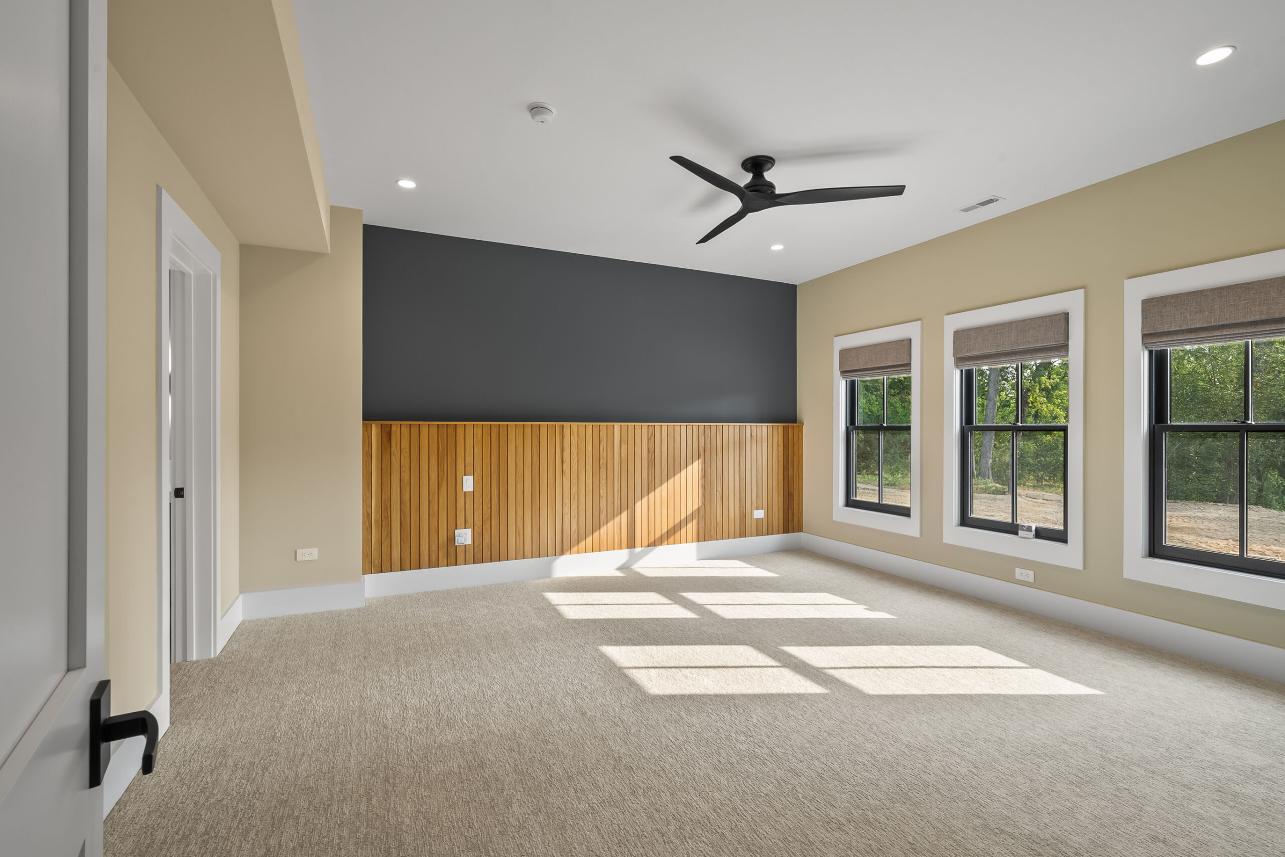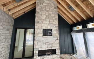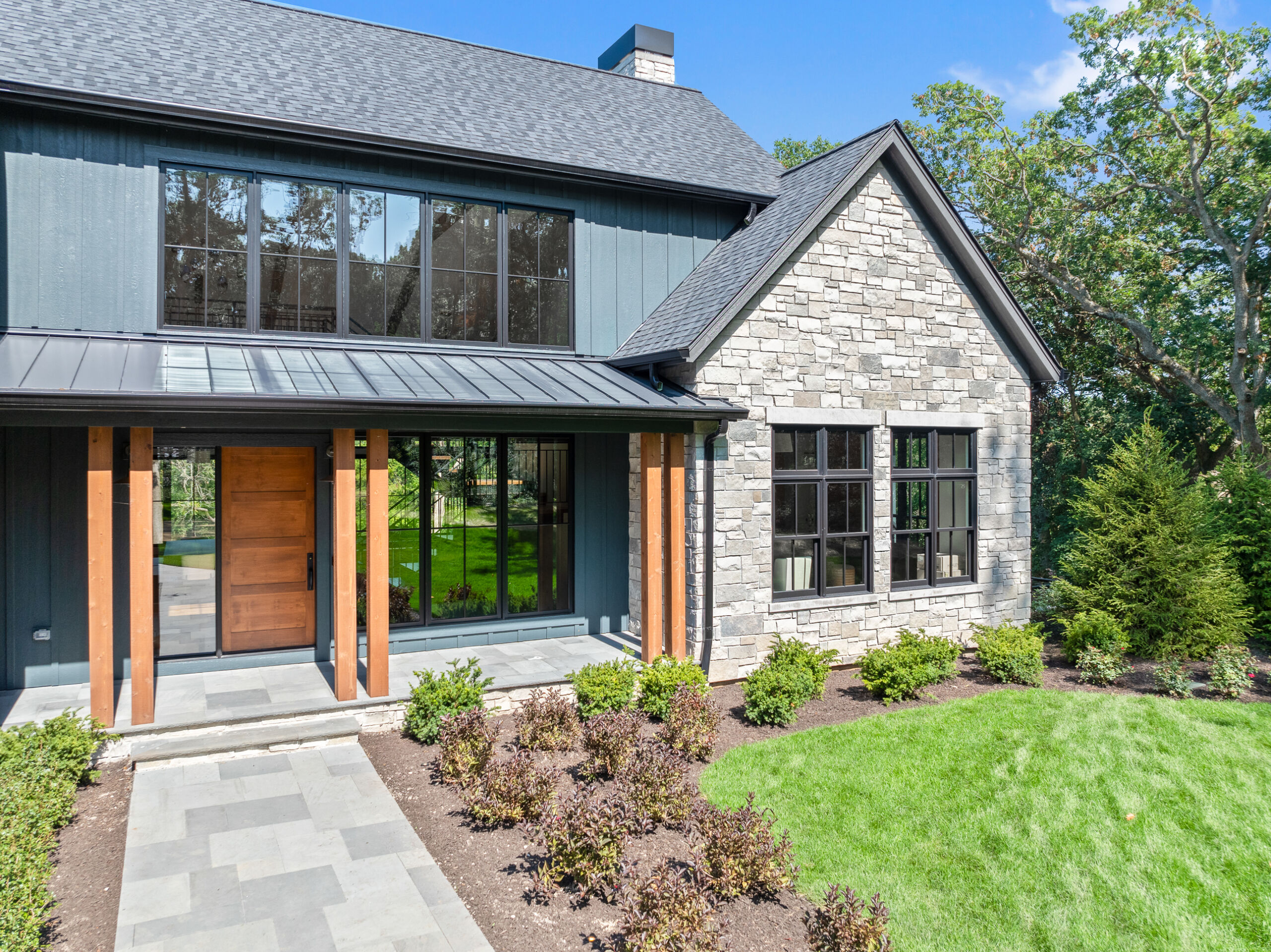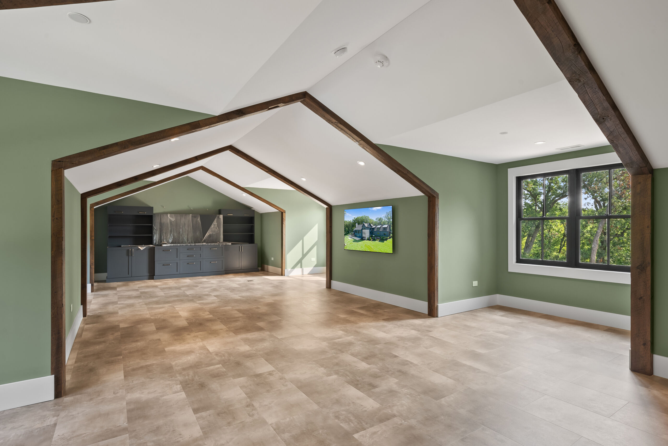 Matustik Builders crafted this stunning modern farmhouse in Lake Geneva, Wisconsin, with family living in mind. Upon entering, you're greeted by a striking floating staircase that leads to a great room with floor-to-ceiling windows offering beautiful wooded views. The gourmet kitchen features custom cabinets and warm, inviting colors. A charming three-season room with a stone fireplace and wood plank ceiling adds to the home's cozy appeal. One of the standout features is a hidden room on the lower level, cleverly concealed within wood paneling, perfect for unwinding with a bottle from the impressive wine room. The lower level also includes a finished bar area and a workout room.