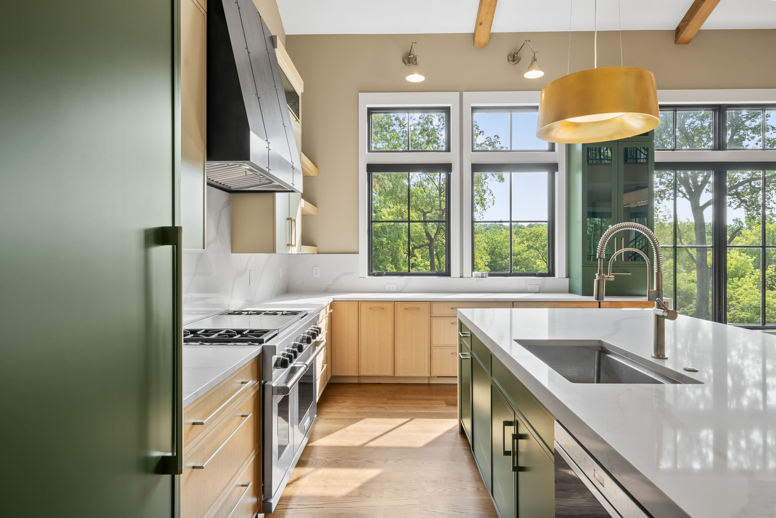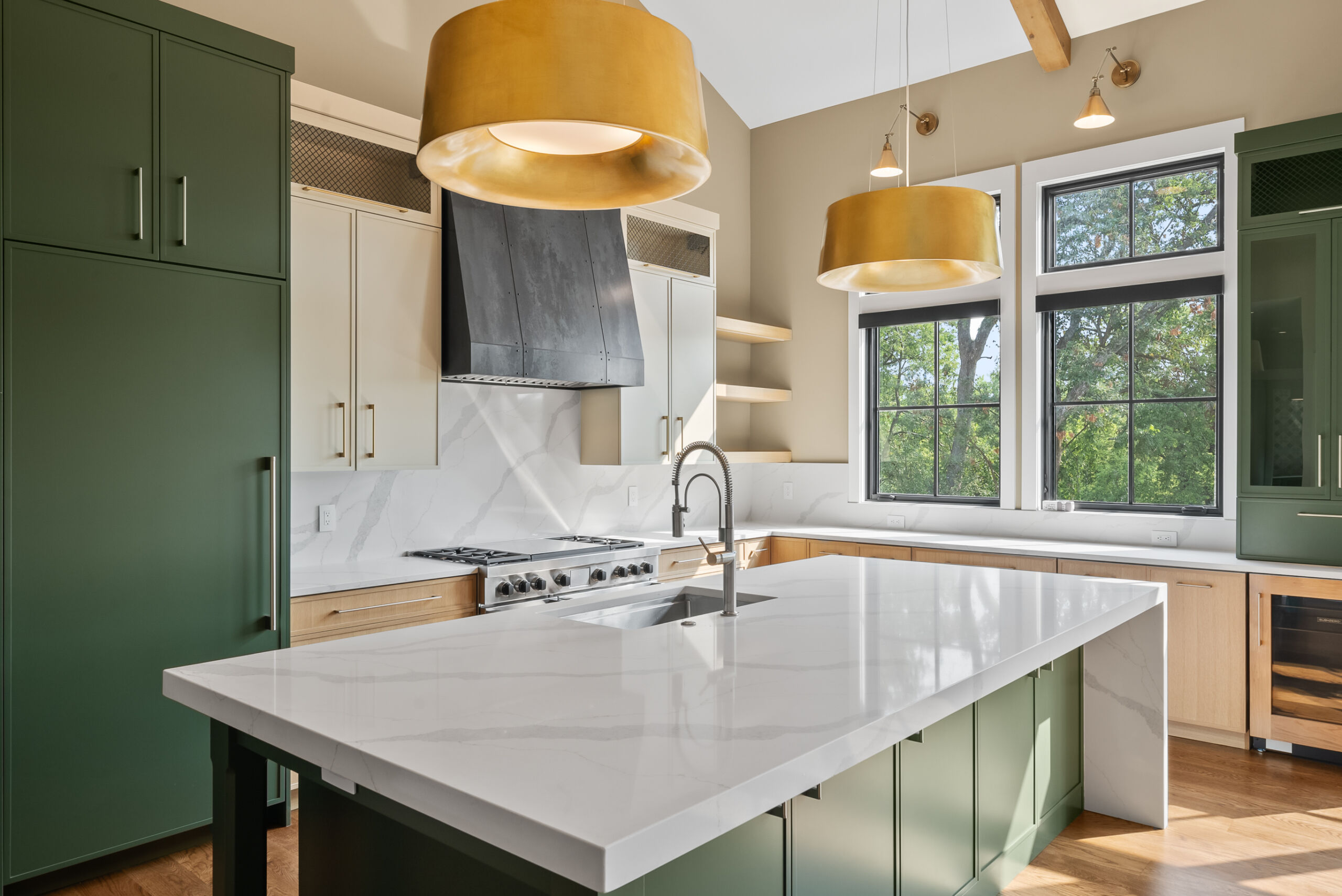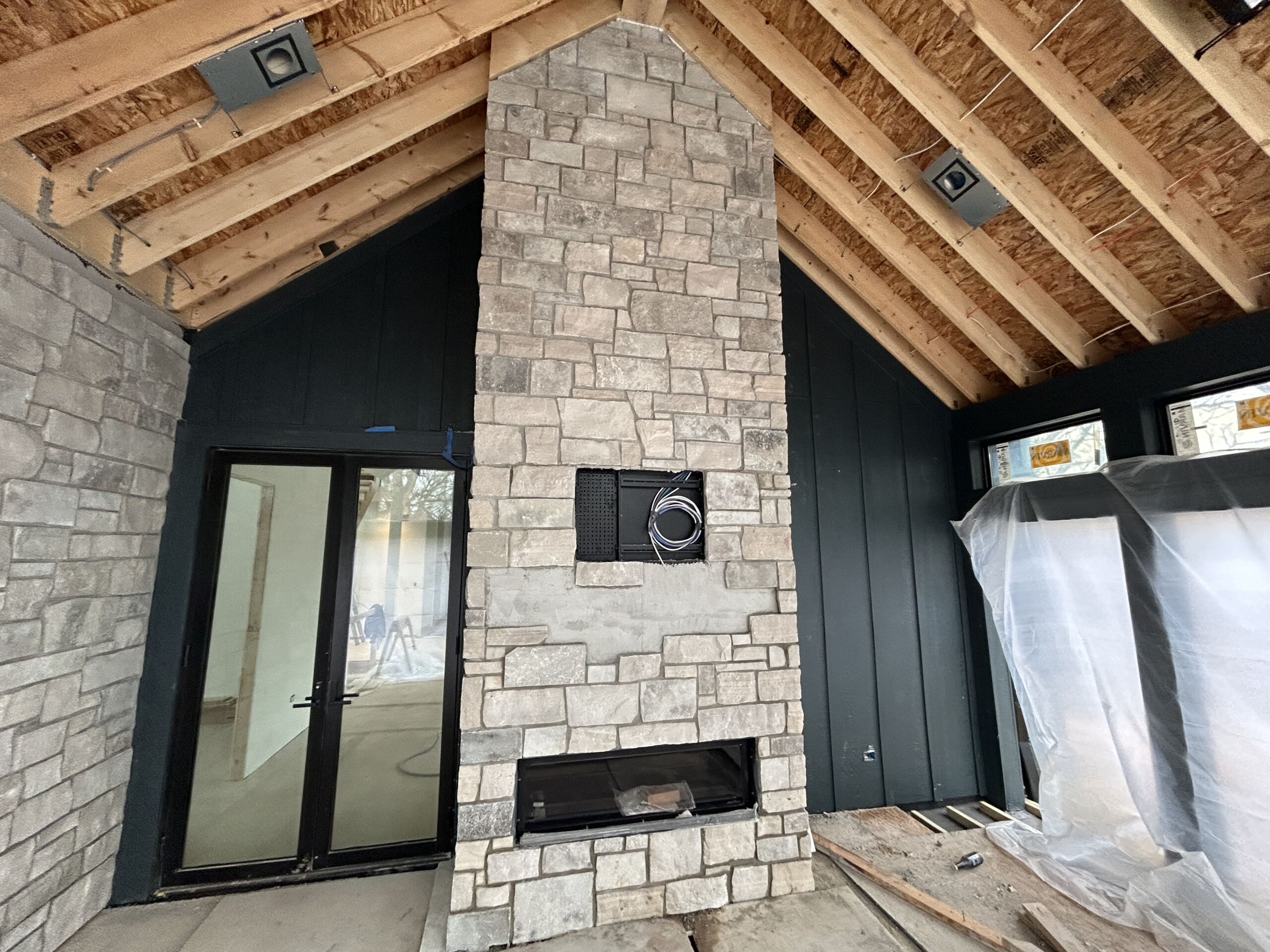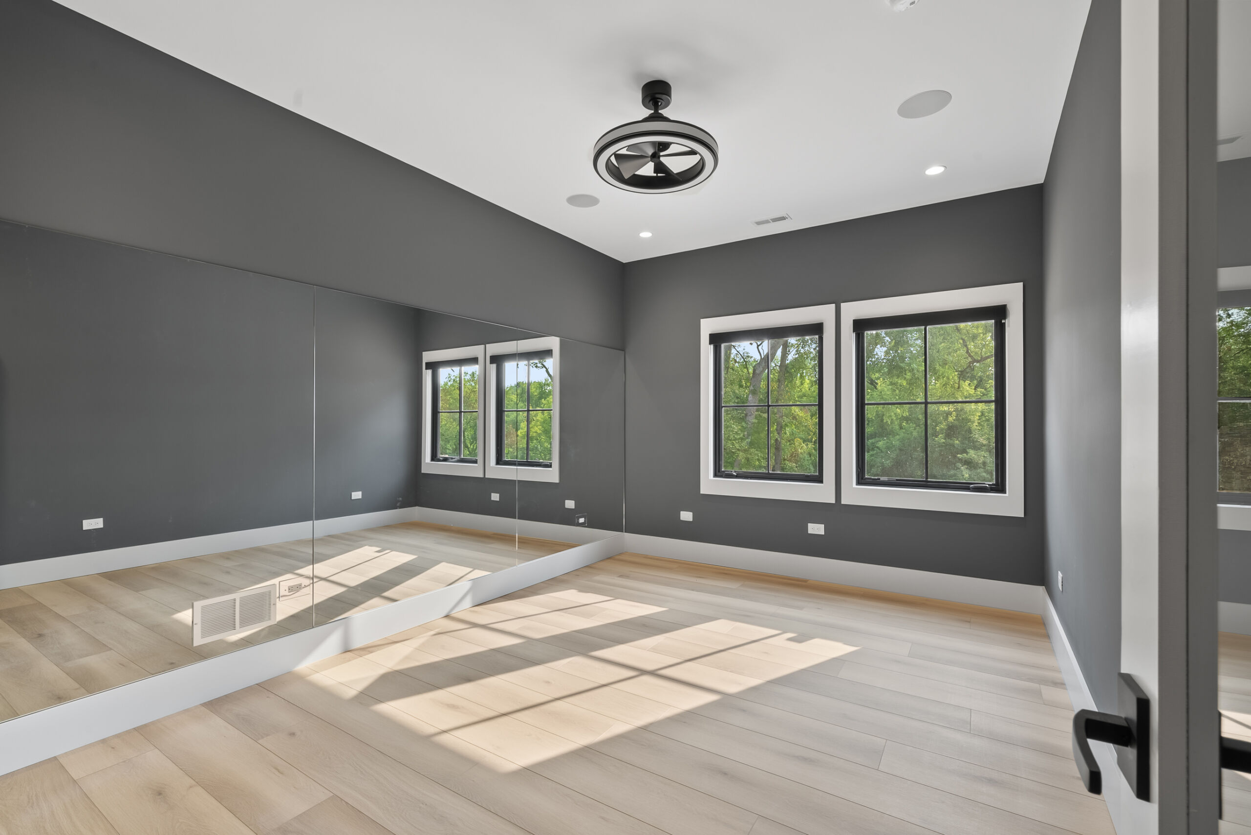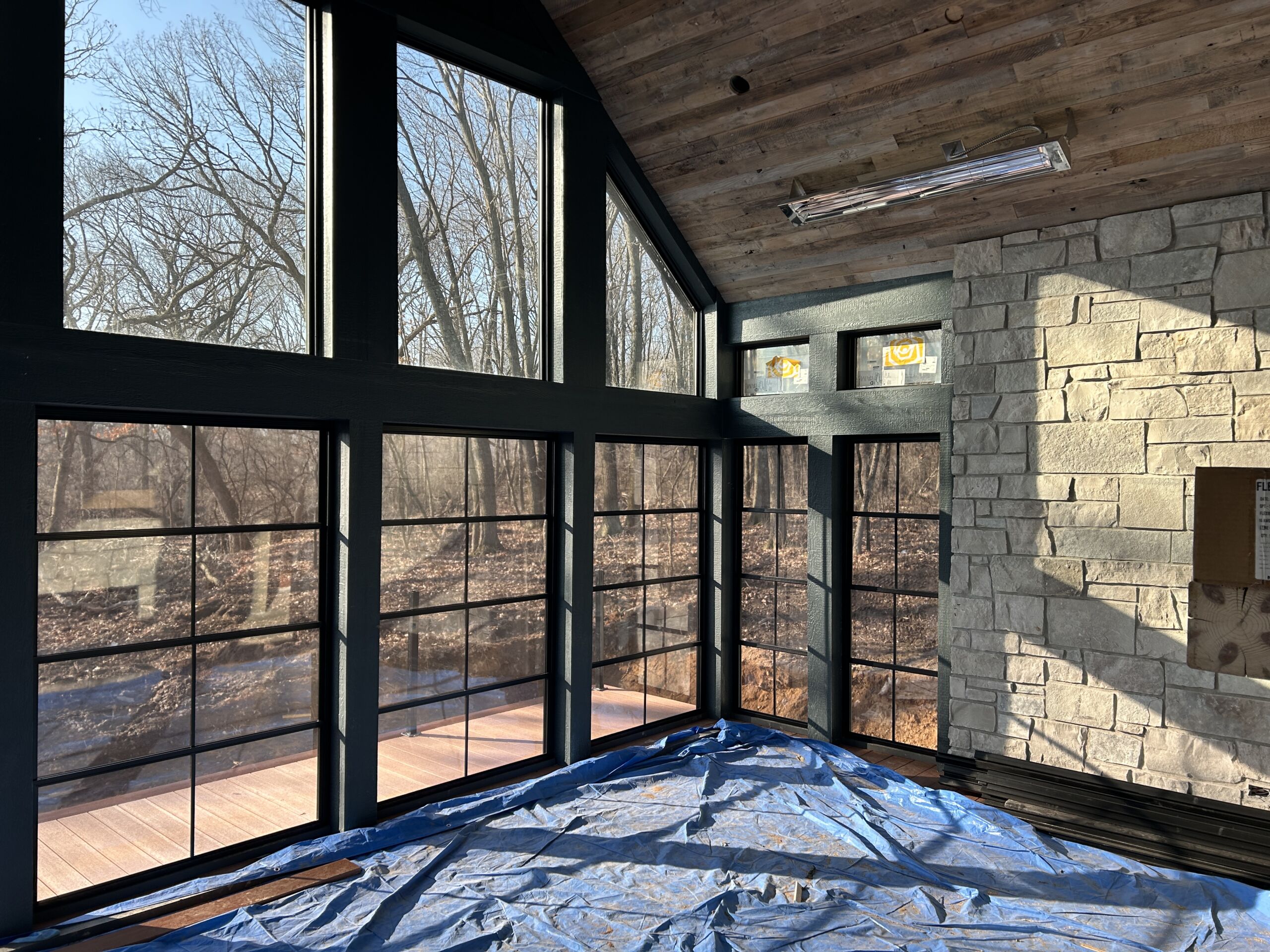 Matustik Builders crafted this stunning modern farmhouse in Lake Geneva, Wisconsin, with family living in mind. Upon entering, you're greeted by a striking floating staircase that leads to a great room with floor-to-ceiling windows offering beautiful wooded views. The gourmet kitchen features custom cabinets and warm, inviting colors. A charming three-season room with a stone fireplace and wood plank ceiling adds to the home's cozy appeal. One of the standout features is a hidden room on the lower level, cleverly concealed within wood paneling, perfect for unwinding with a bottle from the impressive wine room. The lower level also includes a finished bar area and a workout room.