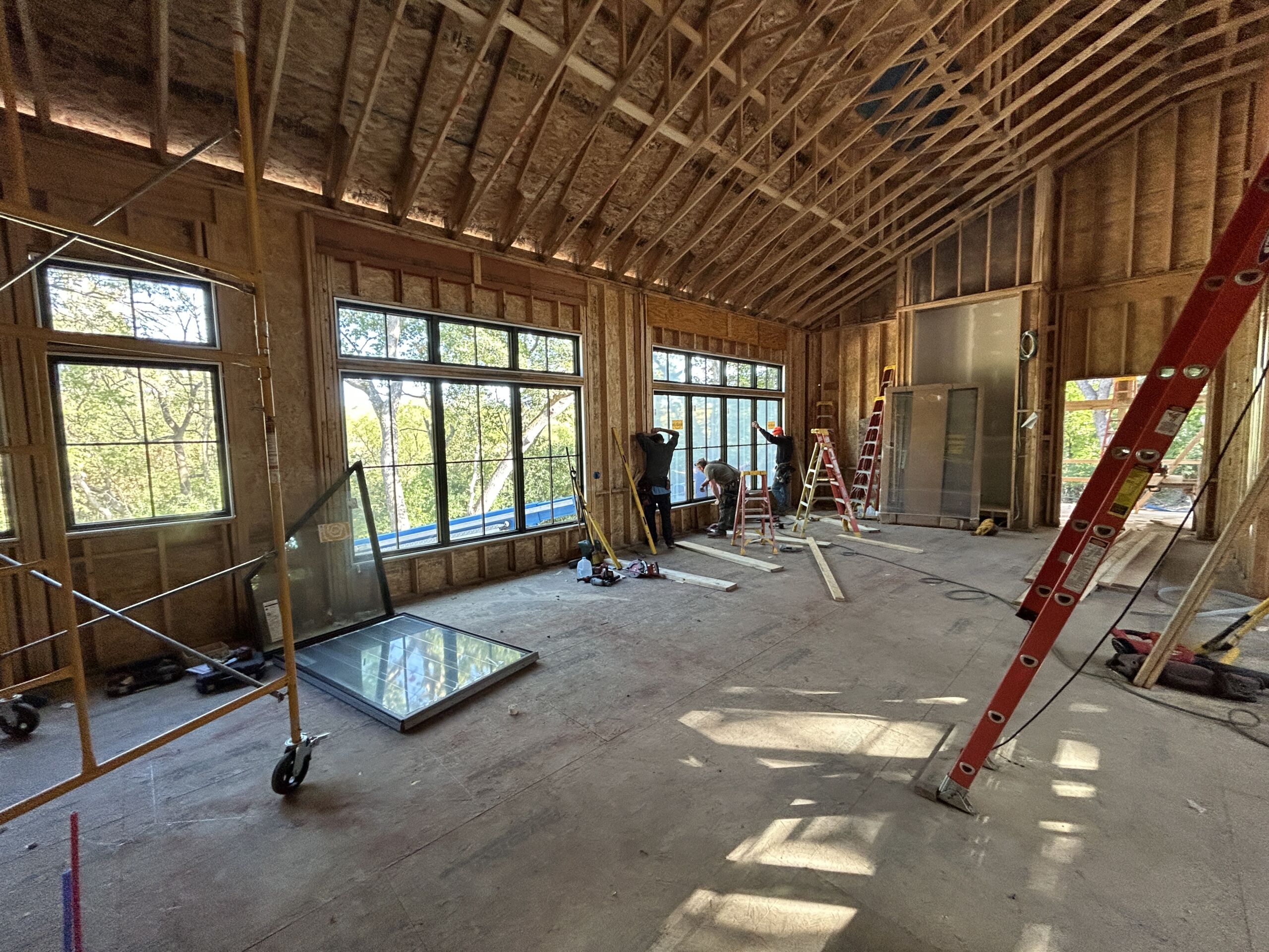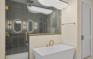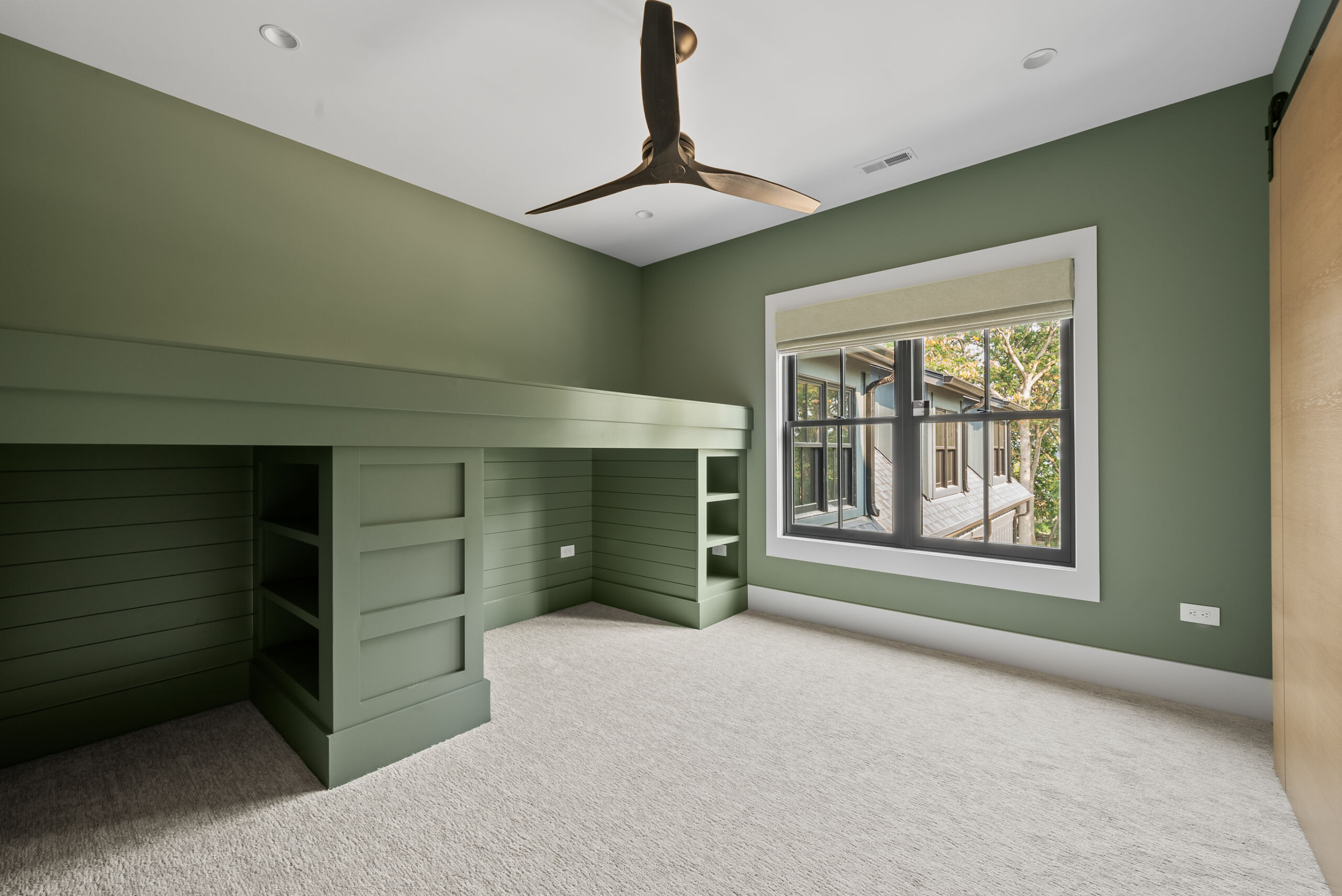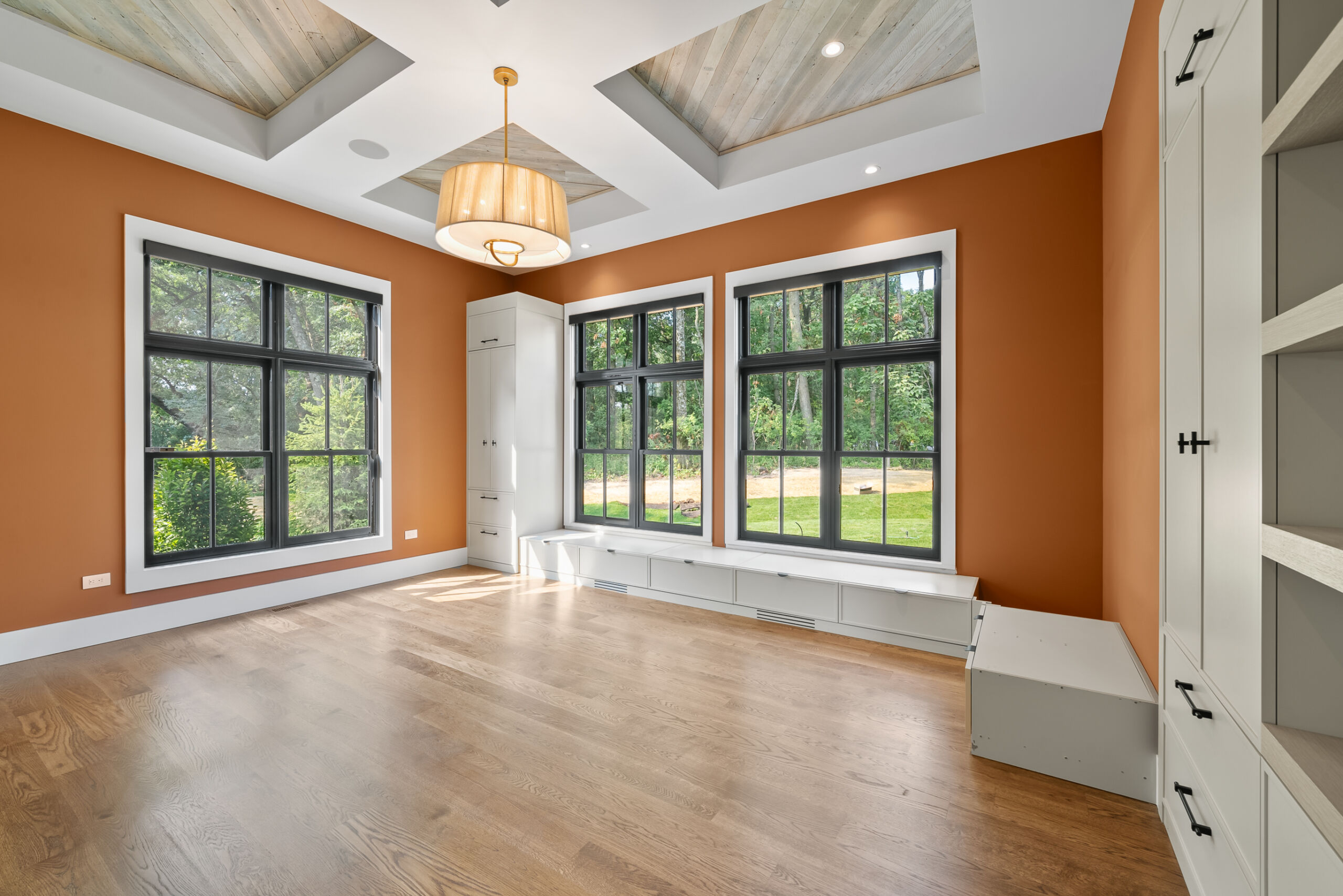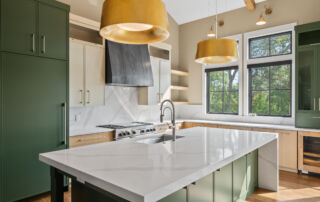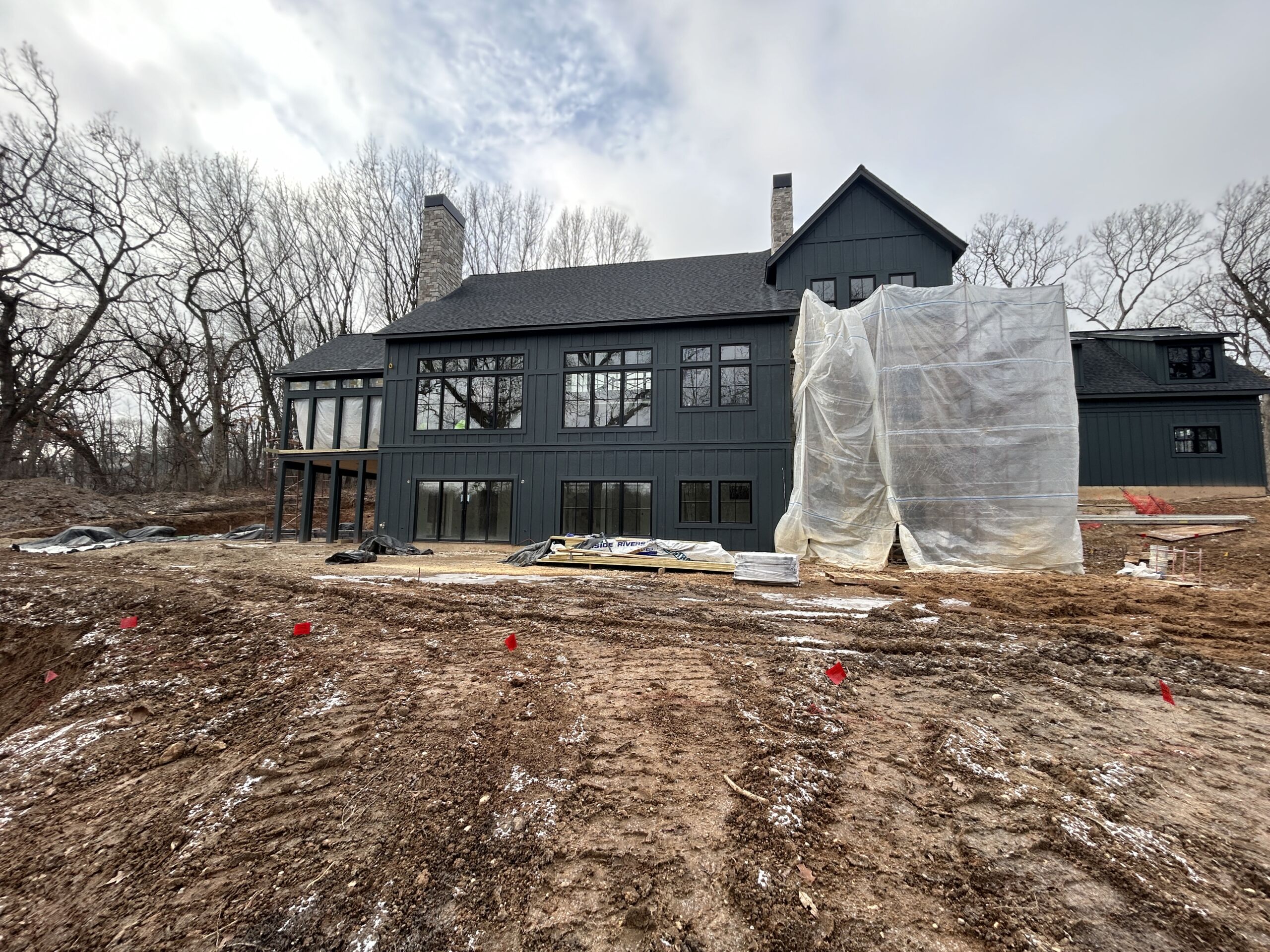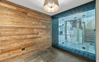 Matustik Builders crafted this stunning modern farmhouse in Lake Geneva, Wisconsin, with family living in mind. Upon entering, you're greeted by a striking floating staircase that leads to a great room with floor-to-ceiling windows offering beautiful wooded views. The gourmet kitchen features custom cabinets and warm, inviting colors. A charming three-season room with a stone fireplace and wood plank ceiling adds to the home's cozy appeal. One of the standout features is a hidden room on the lower level, cleverly concealed within wood paneling, perfect for unwinding with a bottle from the impressive wine room. The lower level also includes a finished bar area and a workout room.