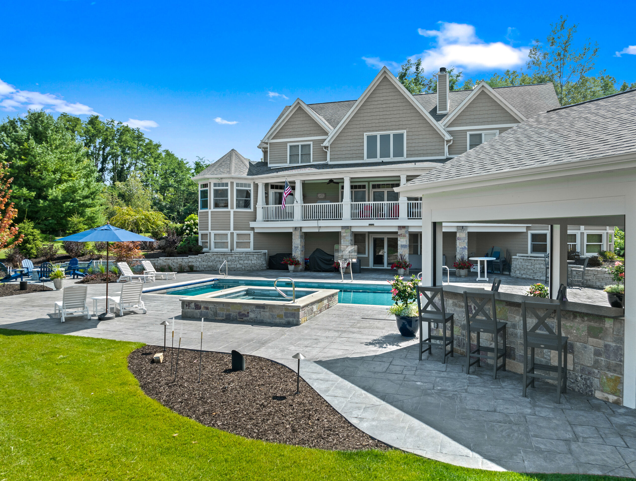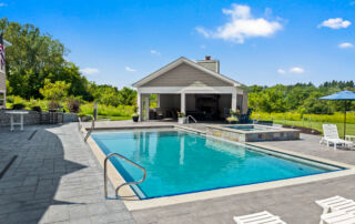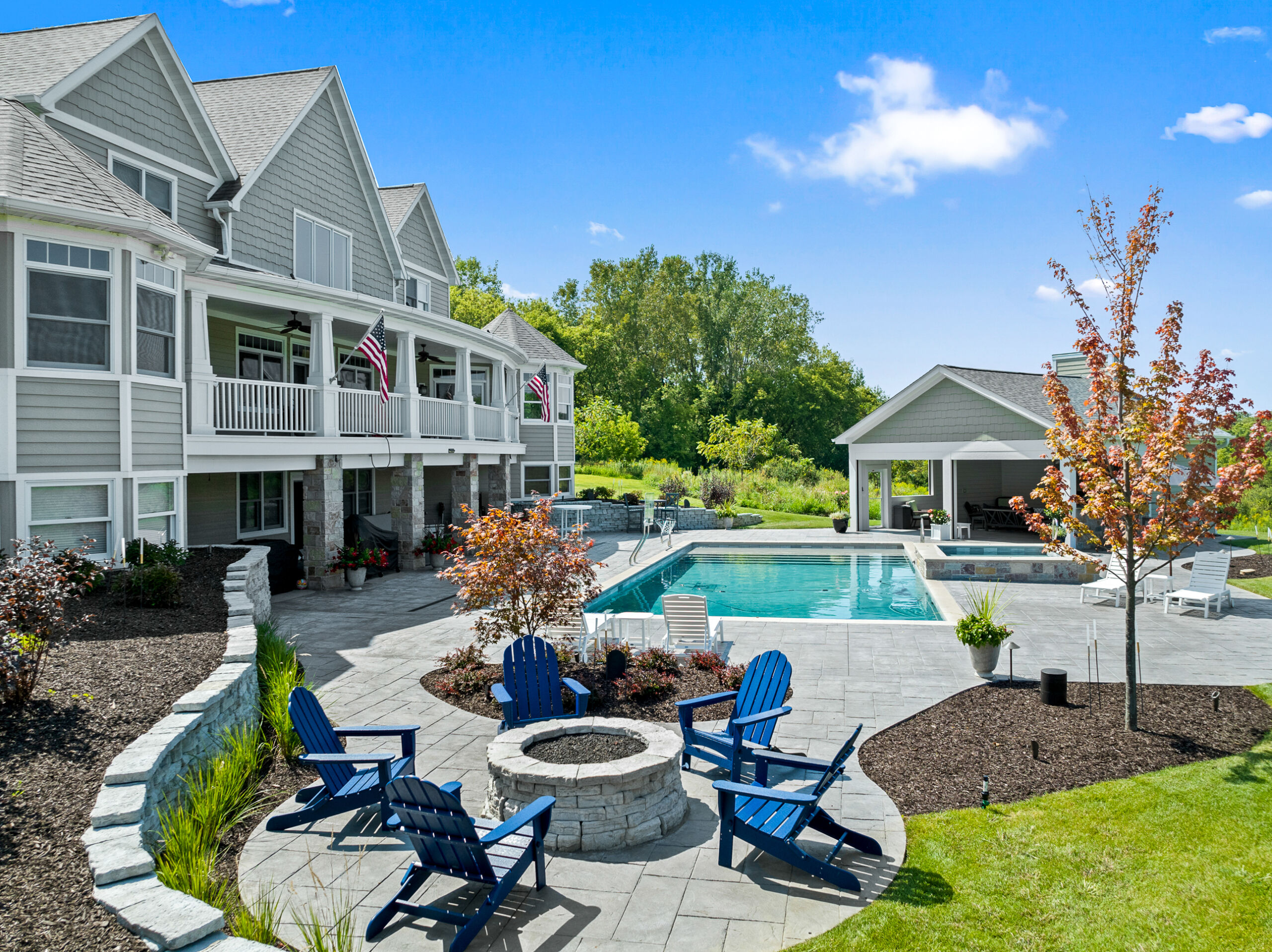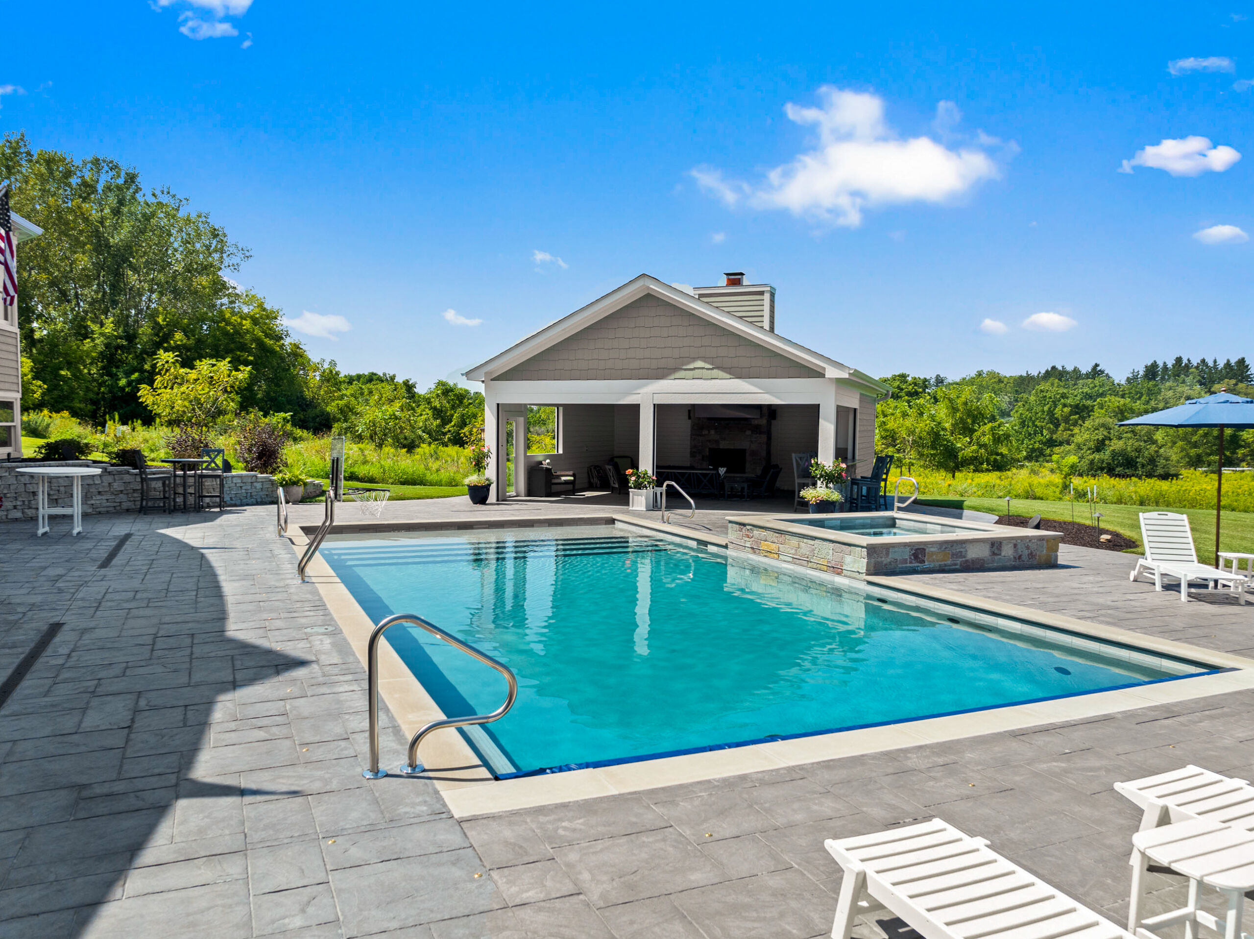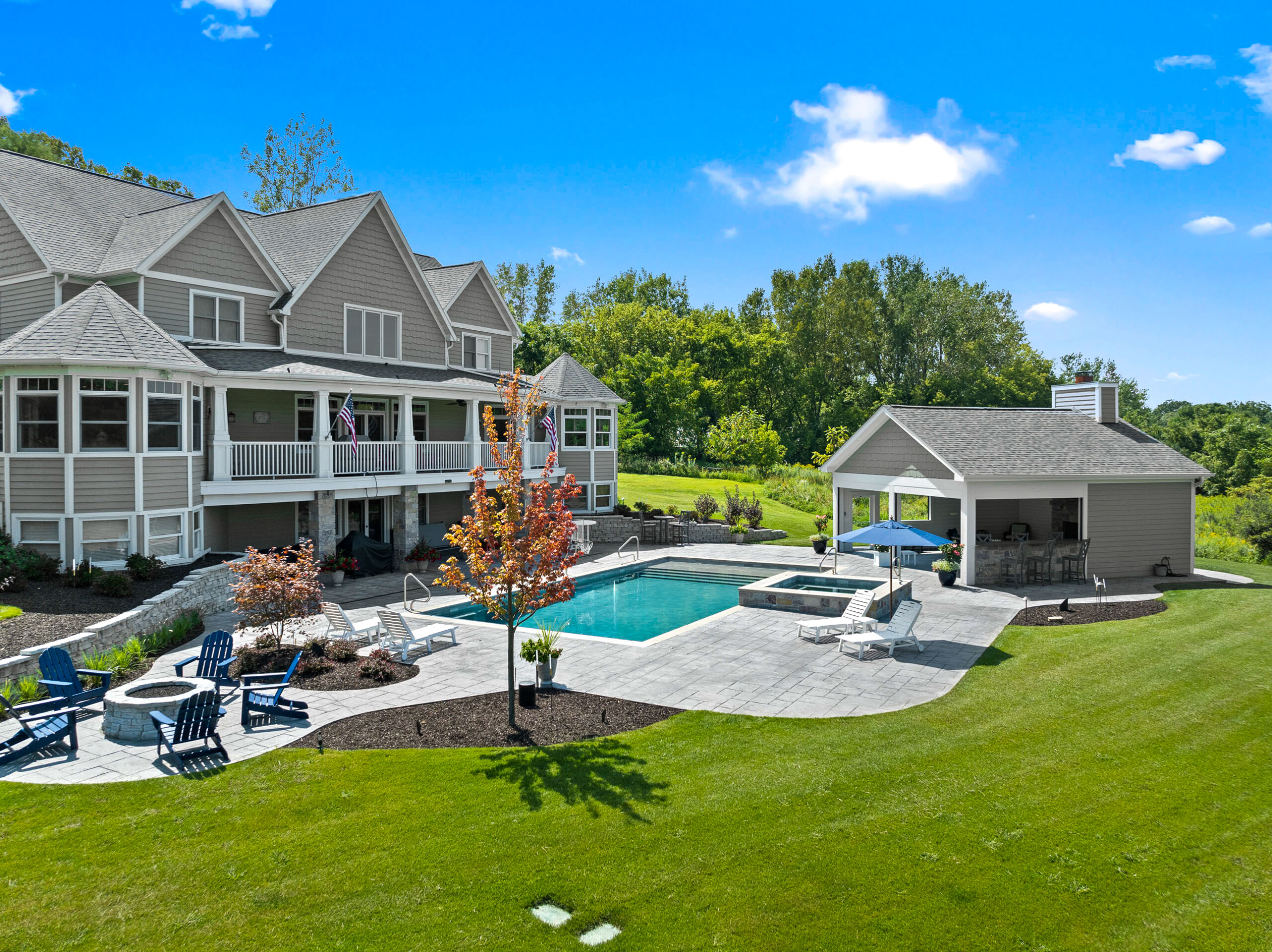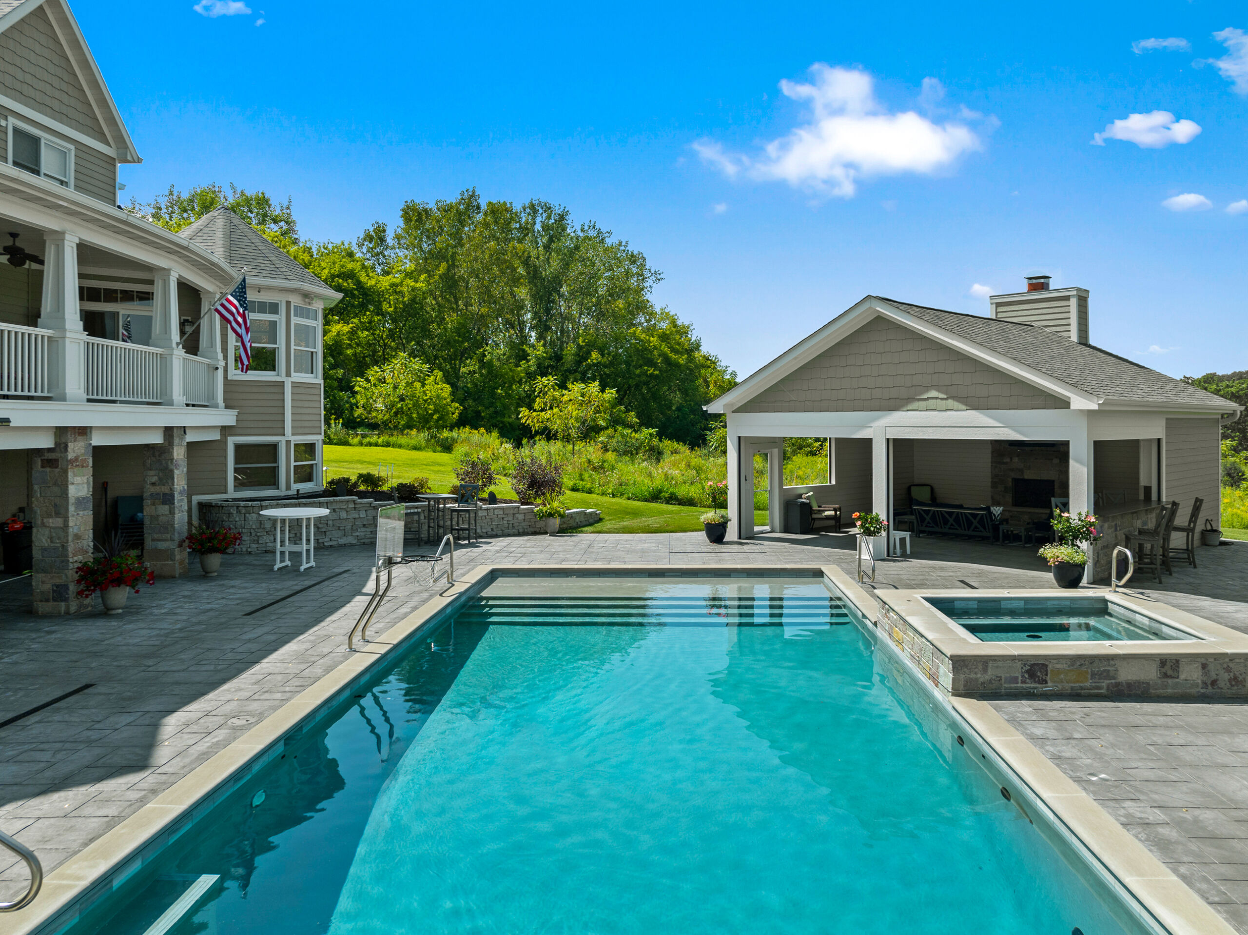 Matustik Builders transformed this Lake Geneva, Wisconsin backyard into a stunning paradise with a custom pool, built-in spa, and pool house featuring a fireplace, outdoor kitchen, and bar.
