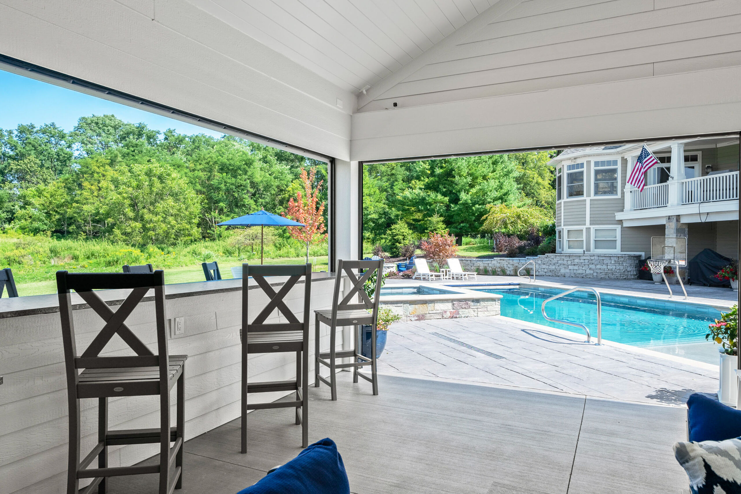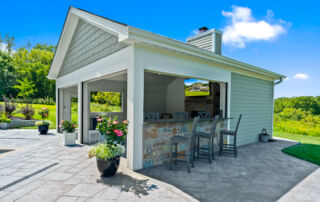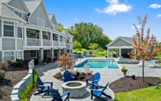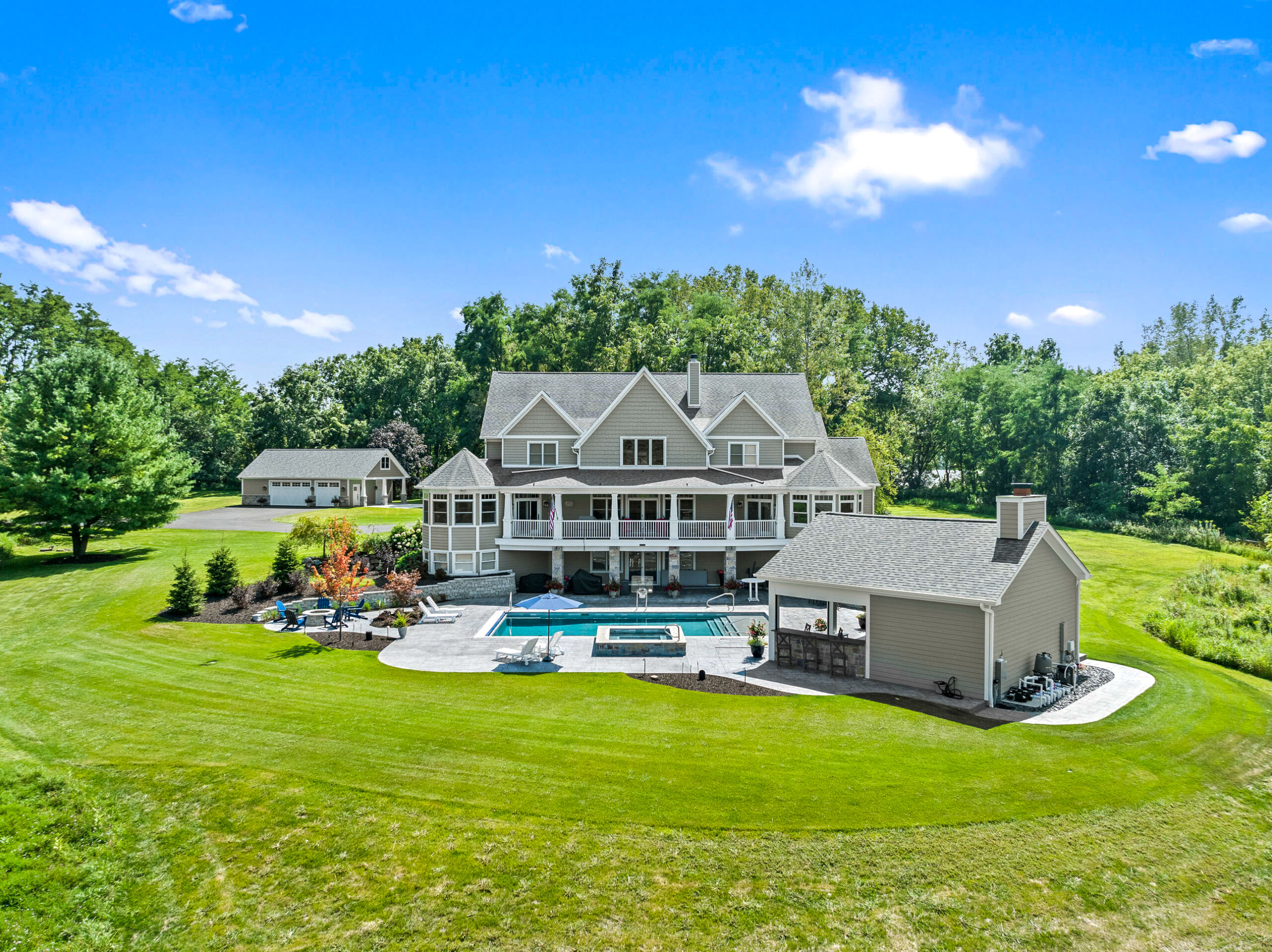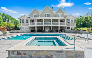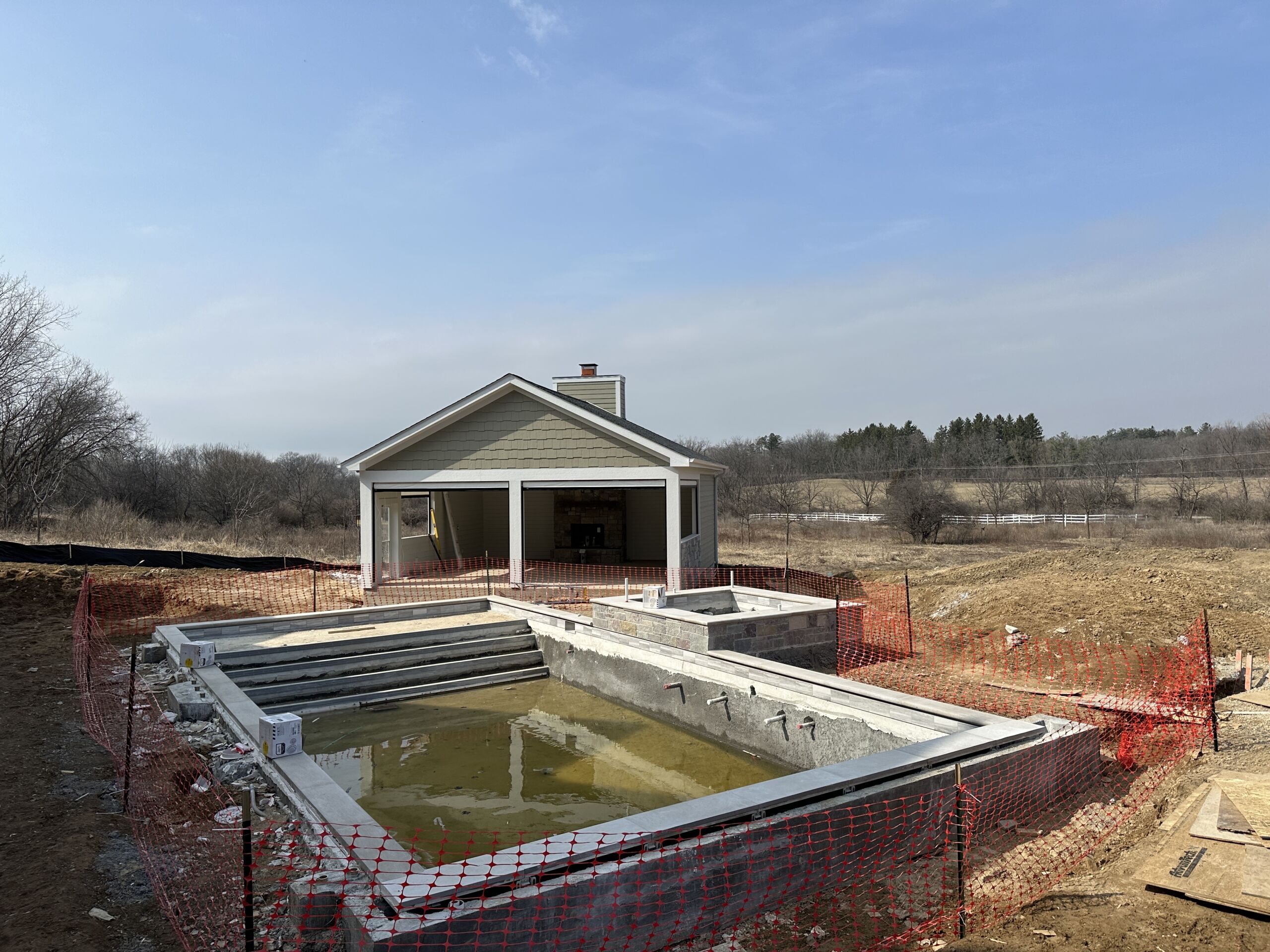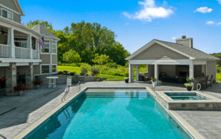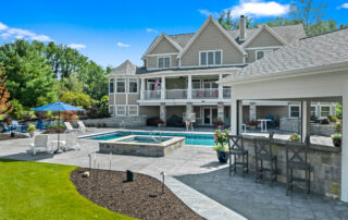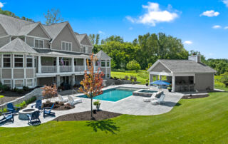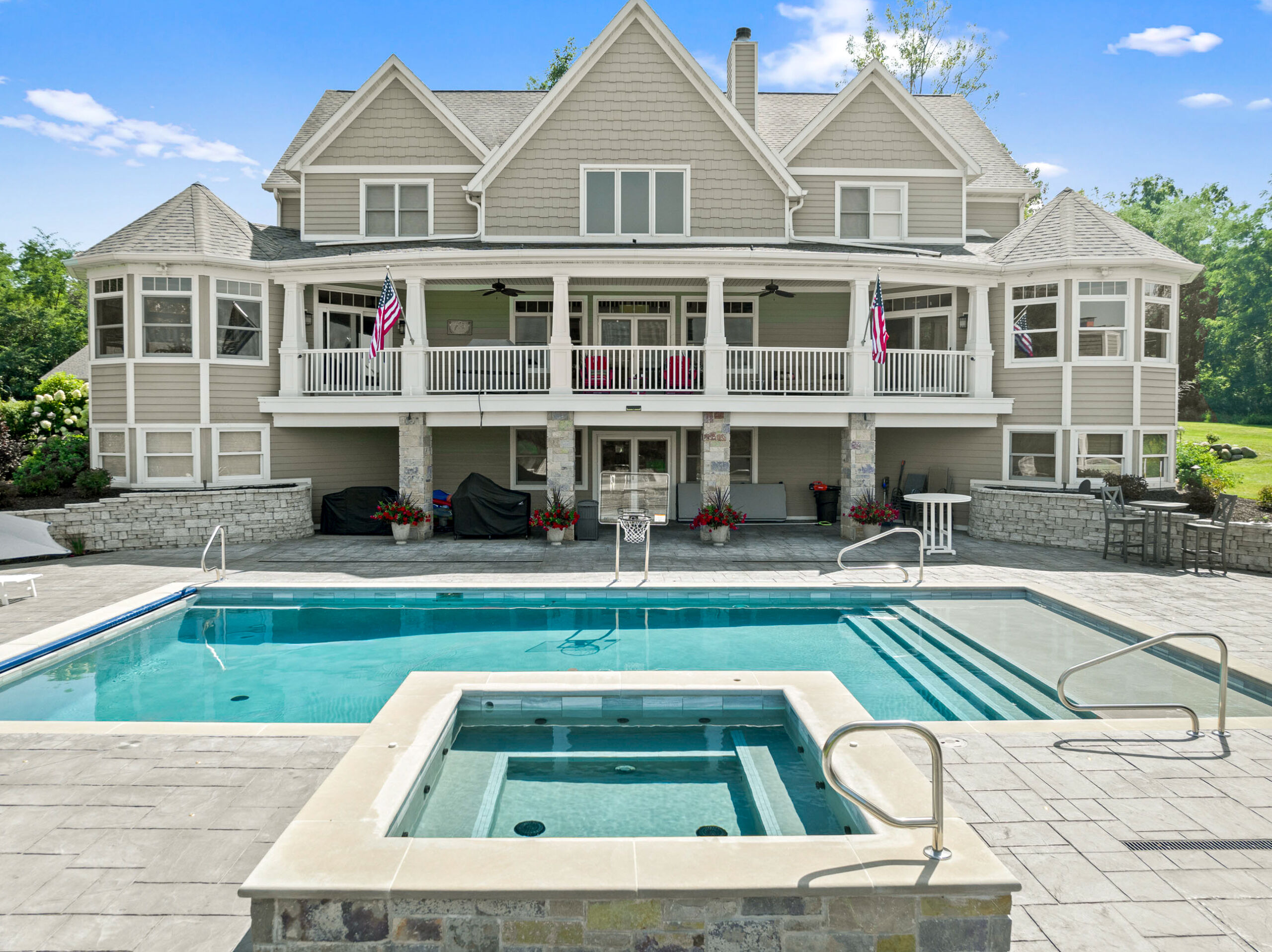 Matustik Builders transformed this Lake Geneva, Wisconsin backyard into a stunning paradise with a custom pool, built-in spa, and pool house featuring a fireplace, outdoor kitchen, and bar.