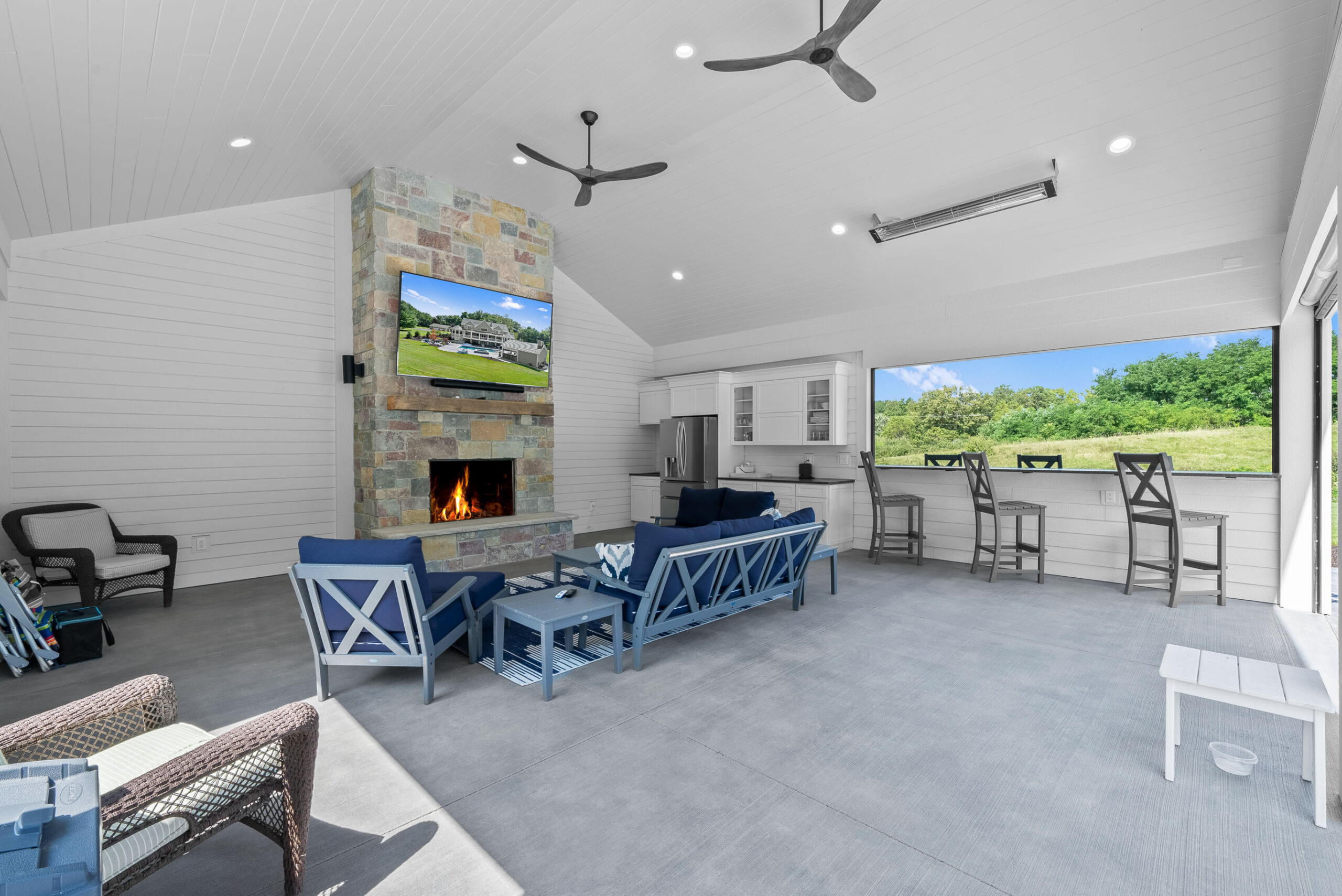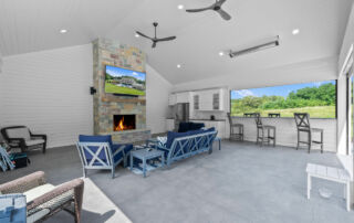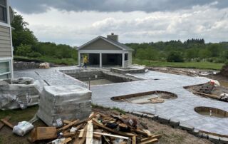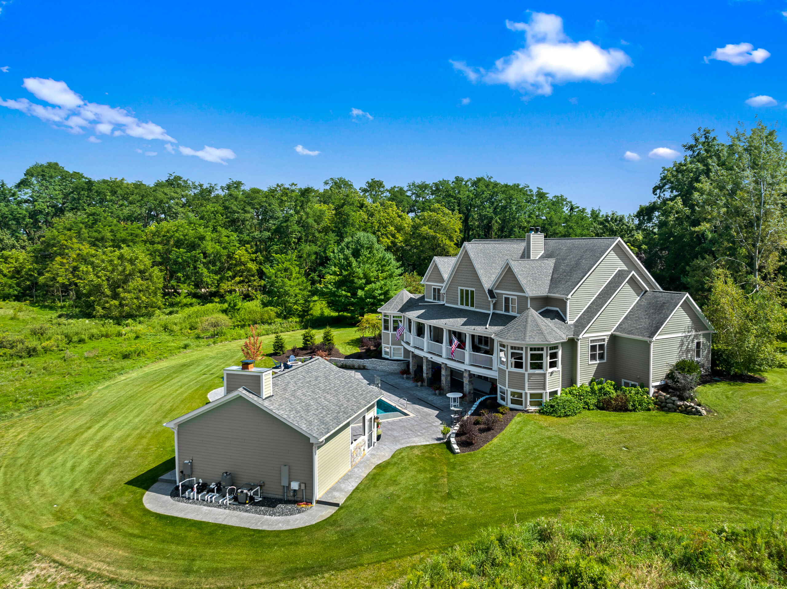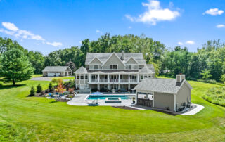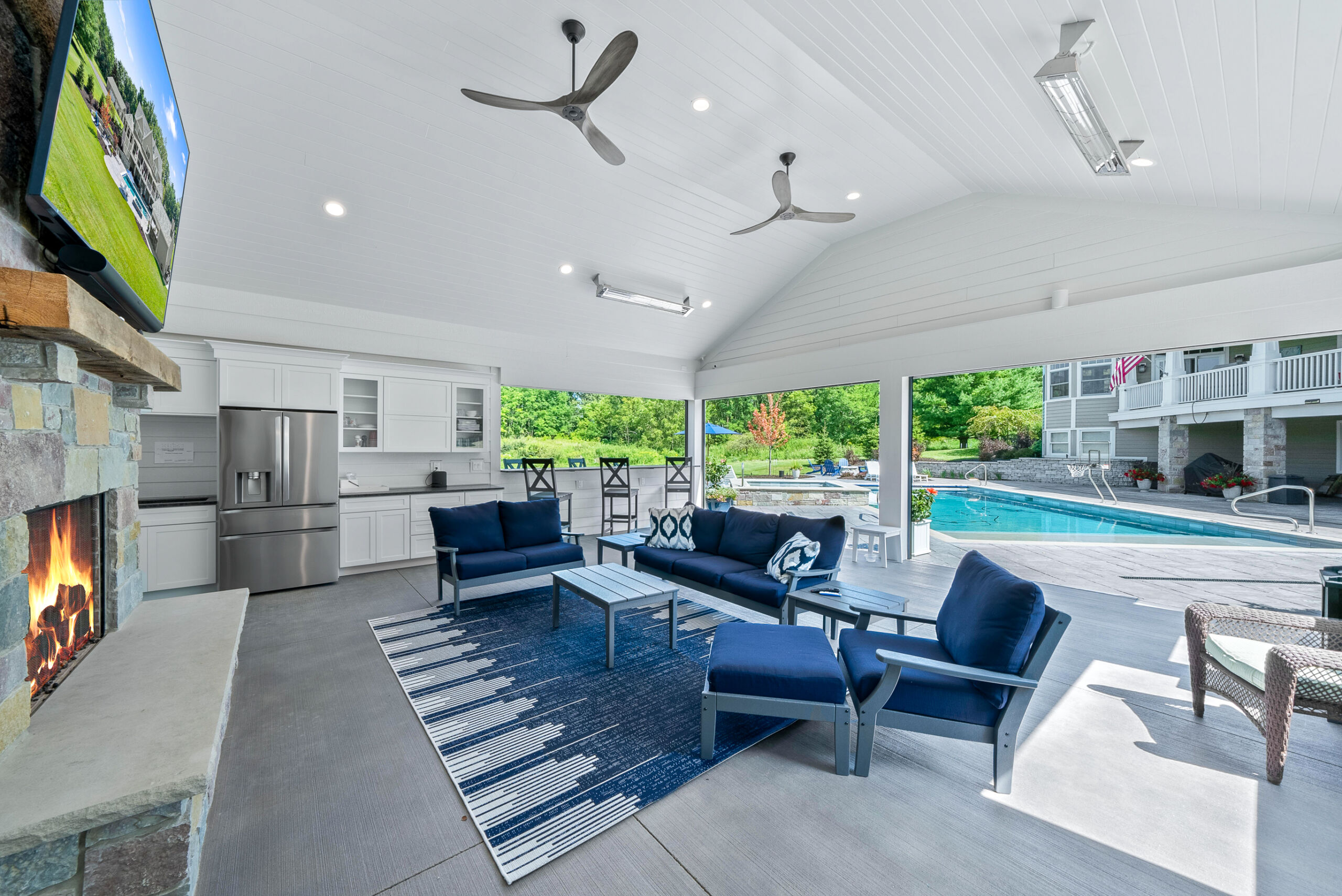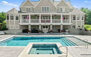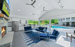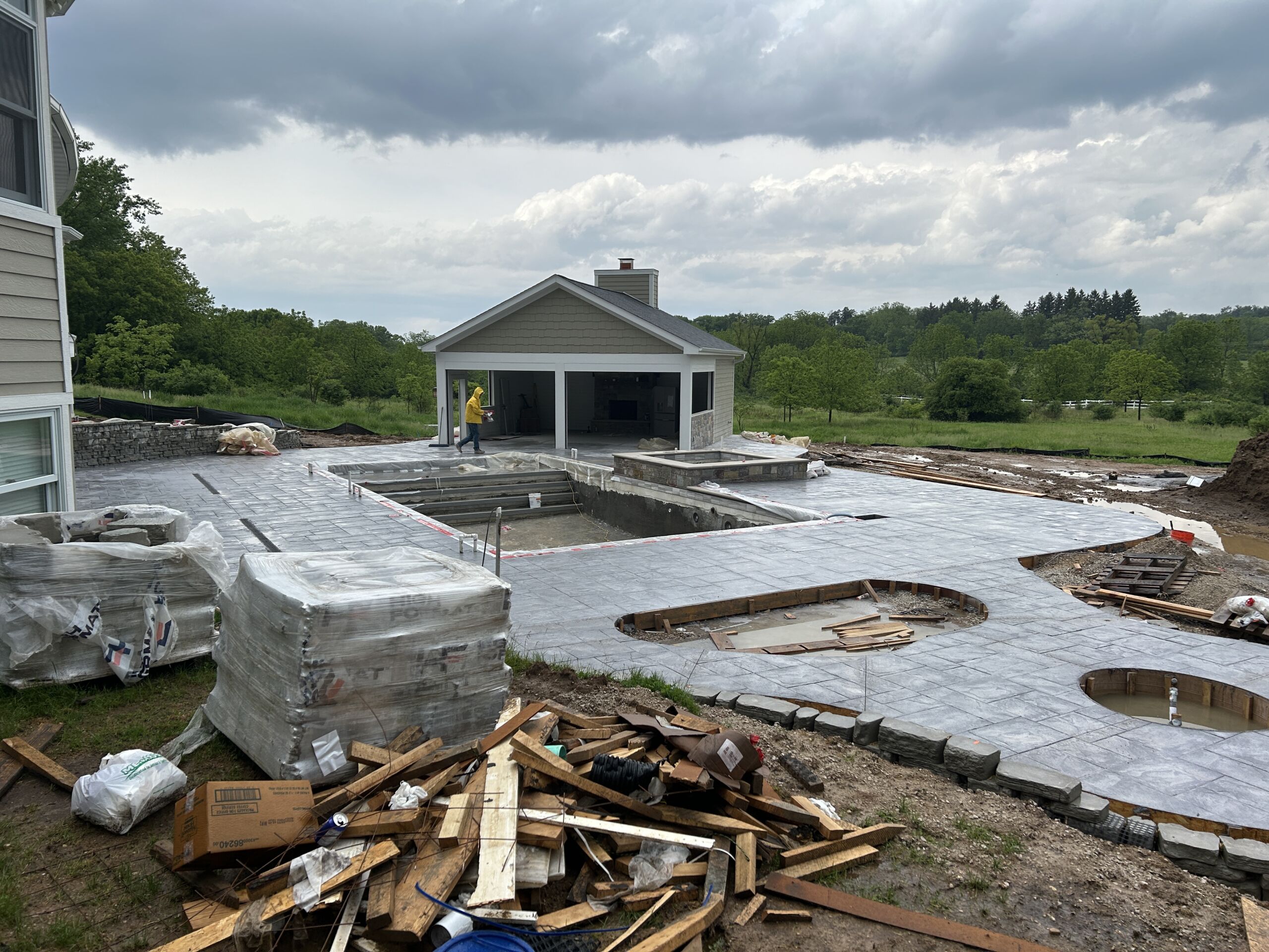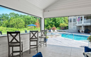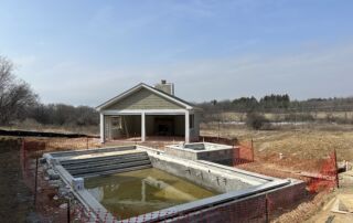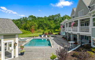 Matustik Builders transformed this Lake Geneva, Wisconsin backyard into a stunning paradise with a custom pool, built-in spa, and pool house featuring a fireplace, outdoor kitchen, and bar.