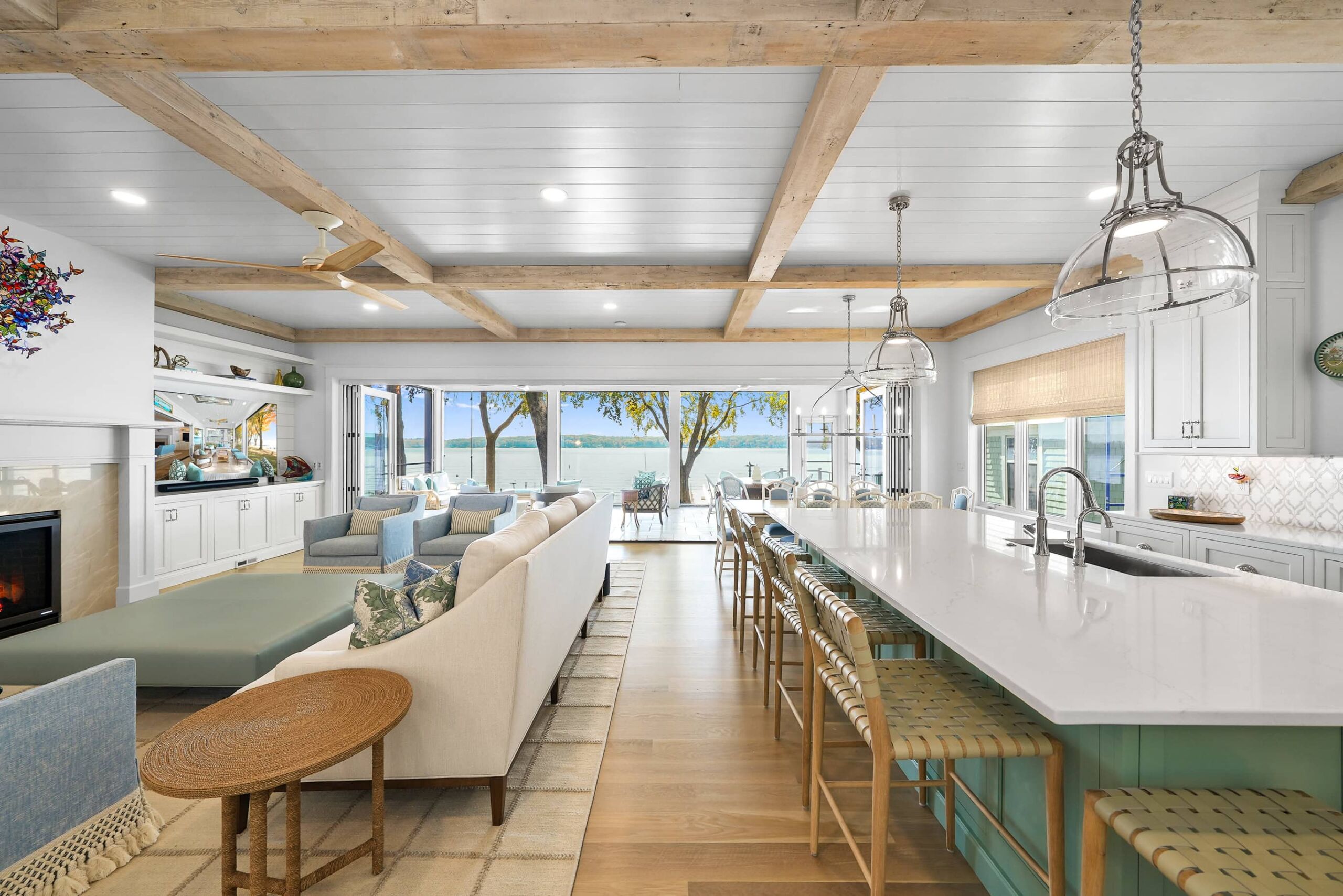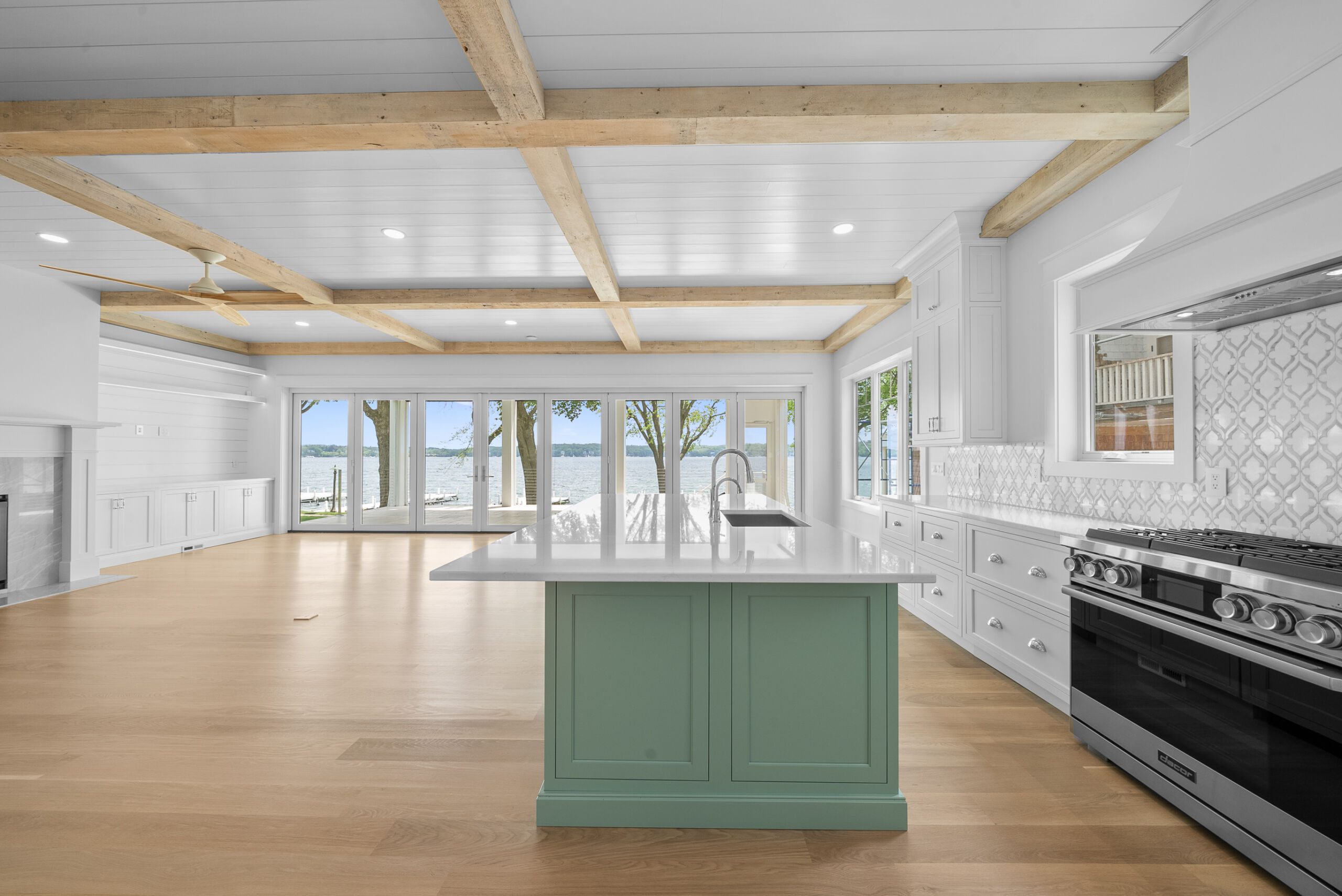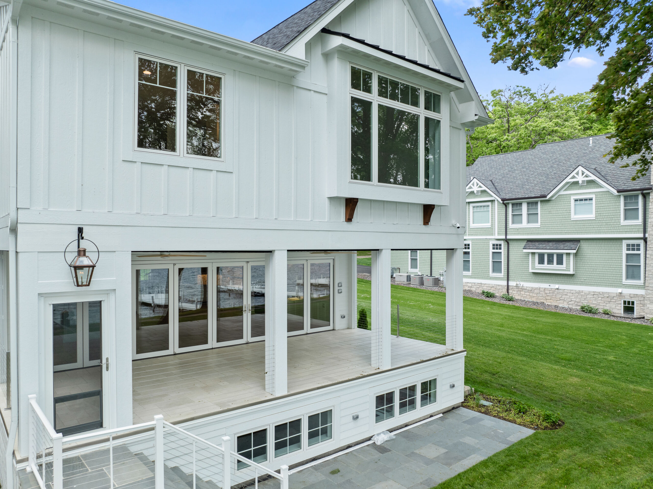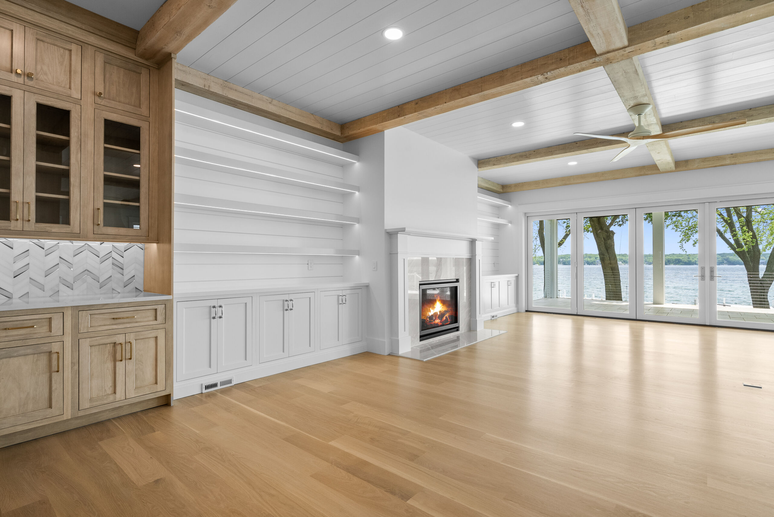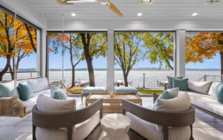 Matustik Builders collaborated with the homeowners to bring their vision to life on this stunning narrow-lot home on the shores of Lake Geneva, Wisconsin. Thoughtfully designed to maximize space and embrace breathtaking lake views, this custom home features an open floor plan perfect for entertaining. Highlights include:fully retractable doors for seamless indoor-outdoor living, exposed wood beams for timeless charm, a gourmet kitchen with a separate support kitchen, a spacious front porch with sweeping lake views and a fully finished lower level with a state-of-the-art golf simulator Every detail reflects luxury, function, and craftsmanship.