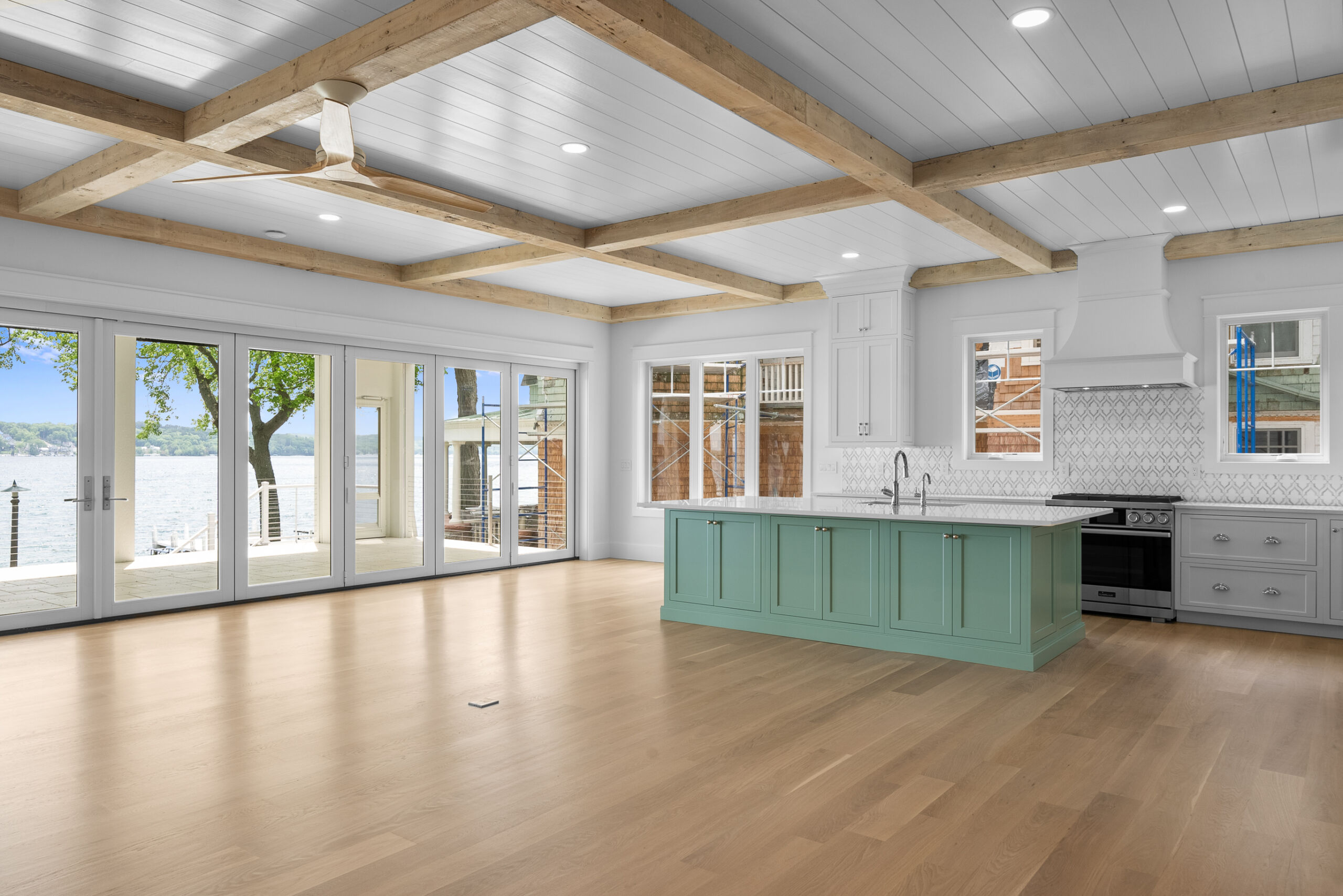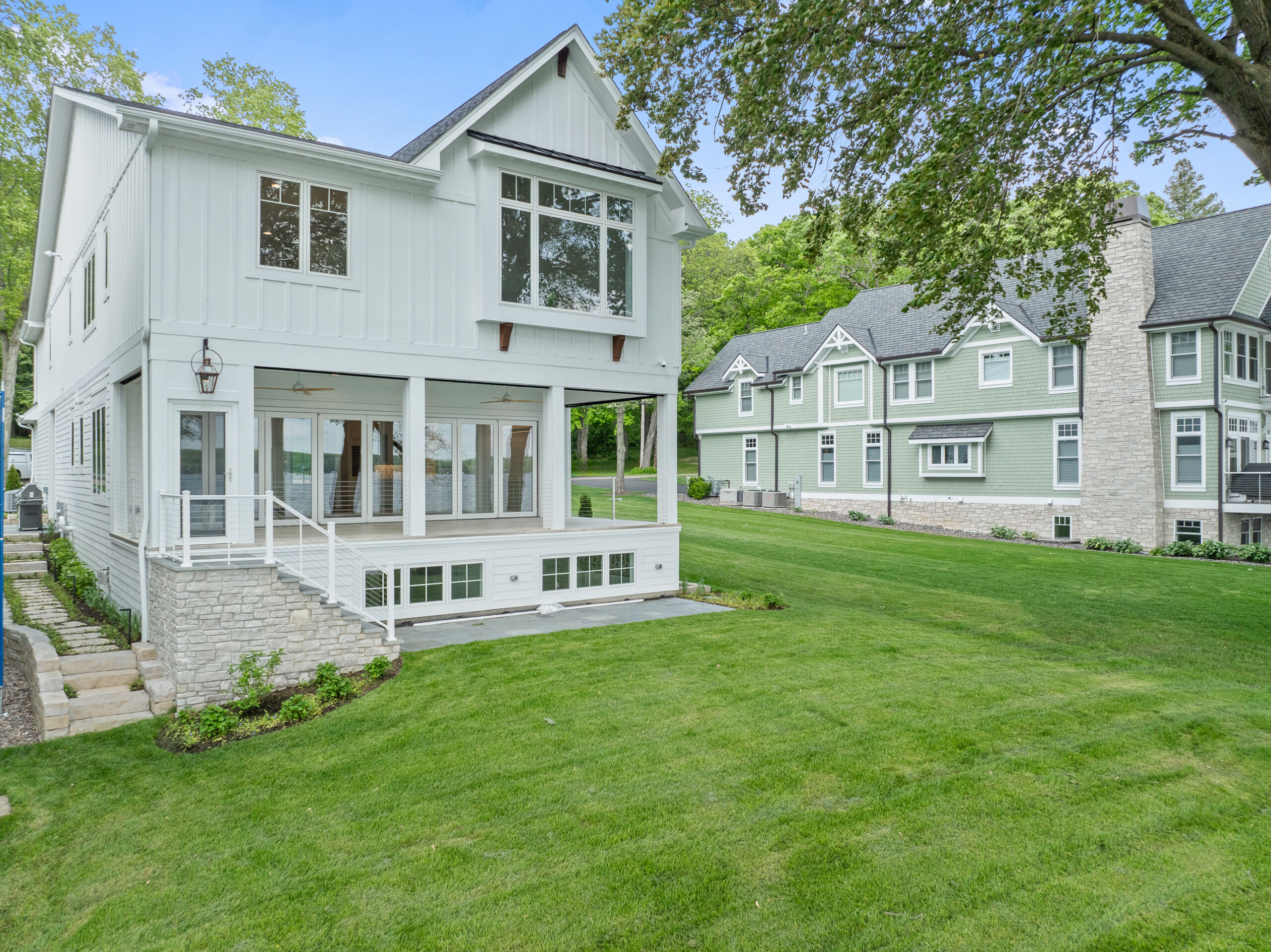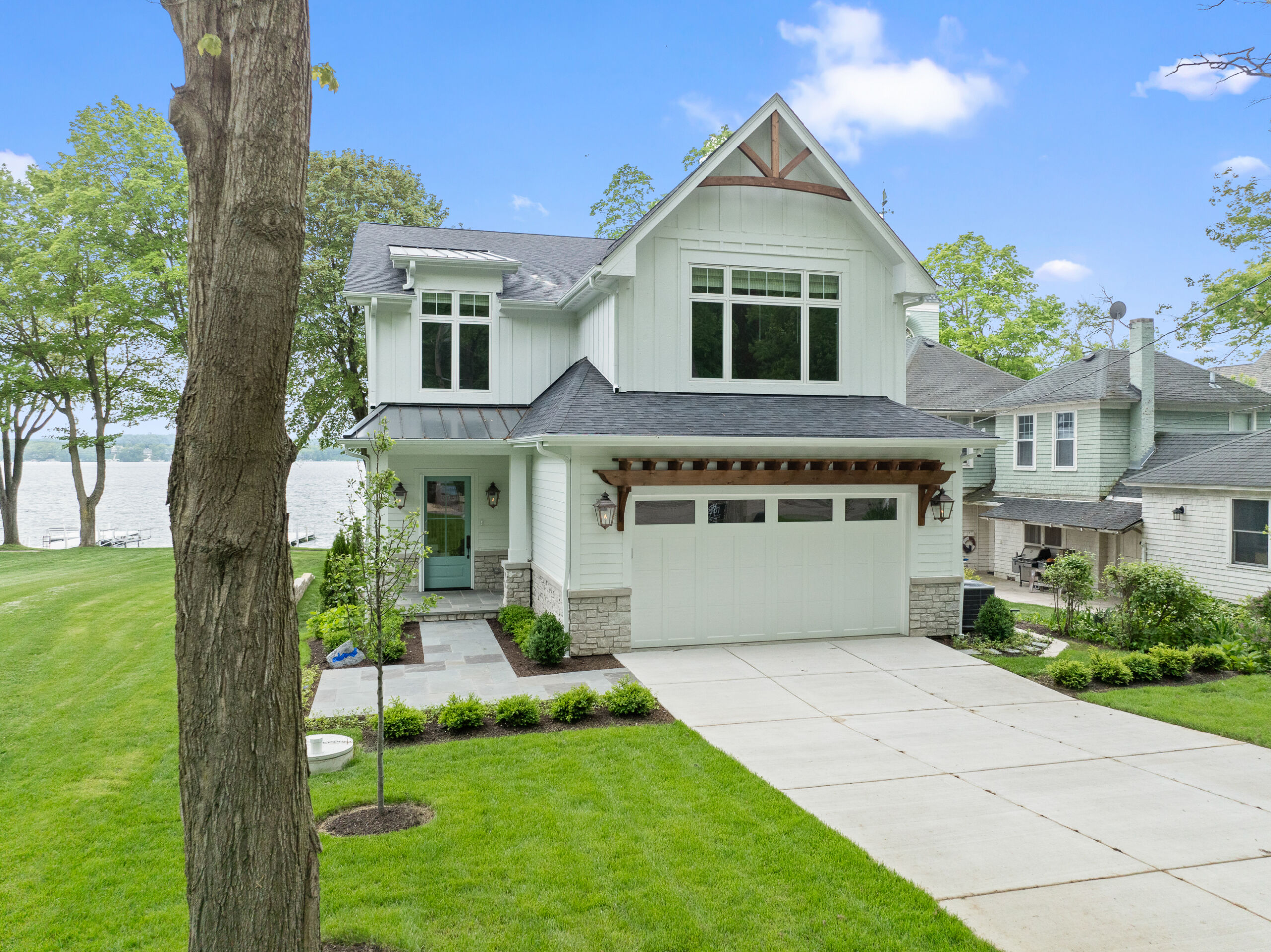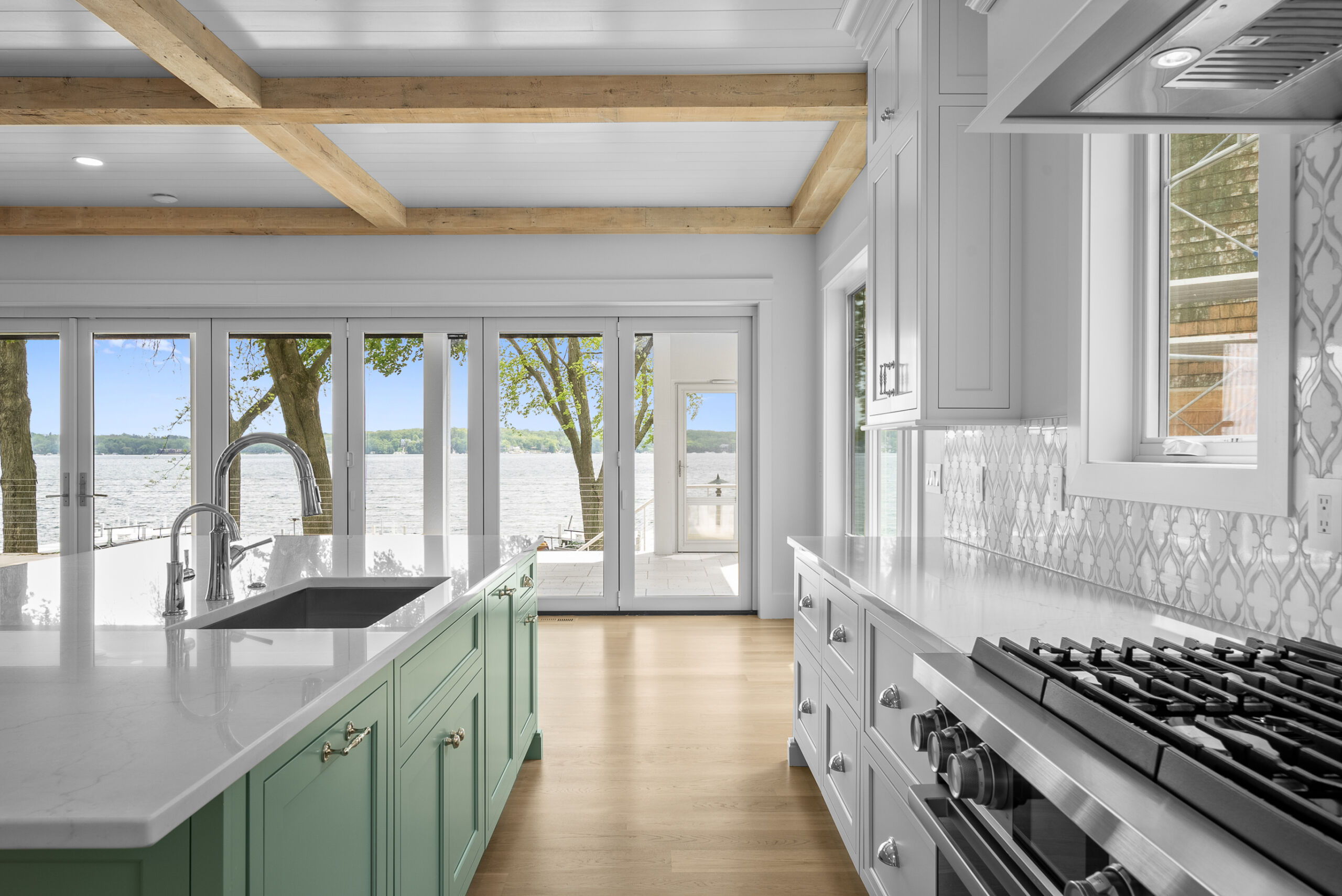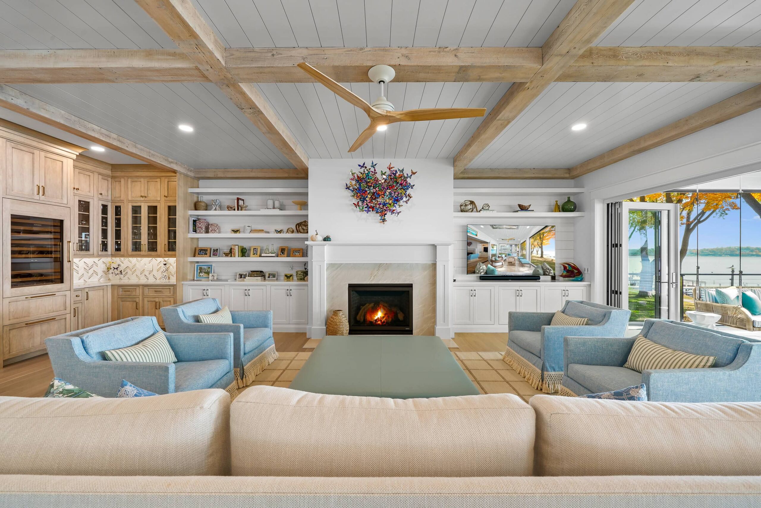 Matustik Builders collaborated with the homeowners to bring their vision to life on this stunning narrow-lot home on the shores of Lake Geneva, Wisconsin. Thoughtfully designed to maximize space and embrace breathtaking lake views, this custom home features an open floor plan perfect for entertaining. Highlights include:fully retractable doors for seamless indoor-outdoor living, exposed wood beams for timeless charm, a gourmet kitchen with a separate support kitchen, a spacious front porch with sweeping lake views and a fully finished lower level with a state-of-the-art golf simulator Every detail reflects luxury, function, and craftsmanship.