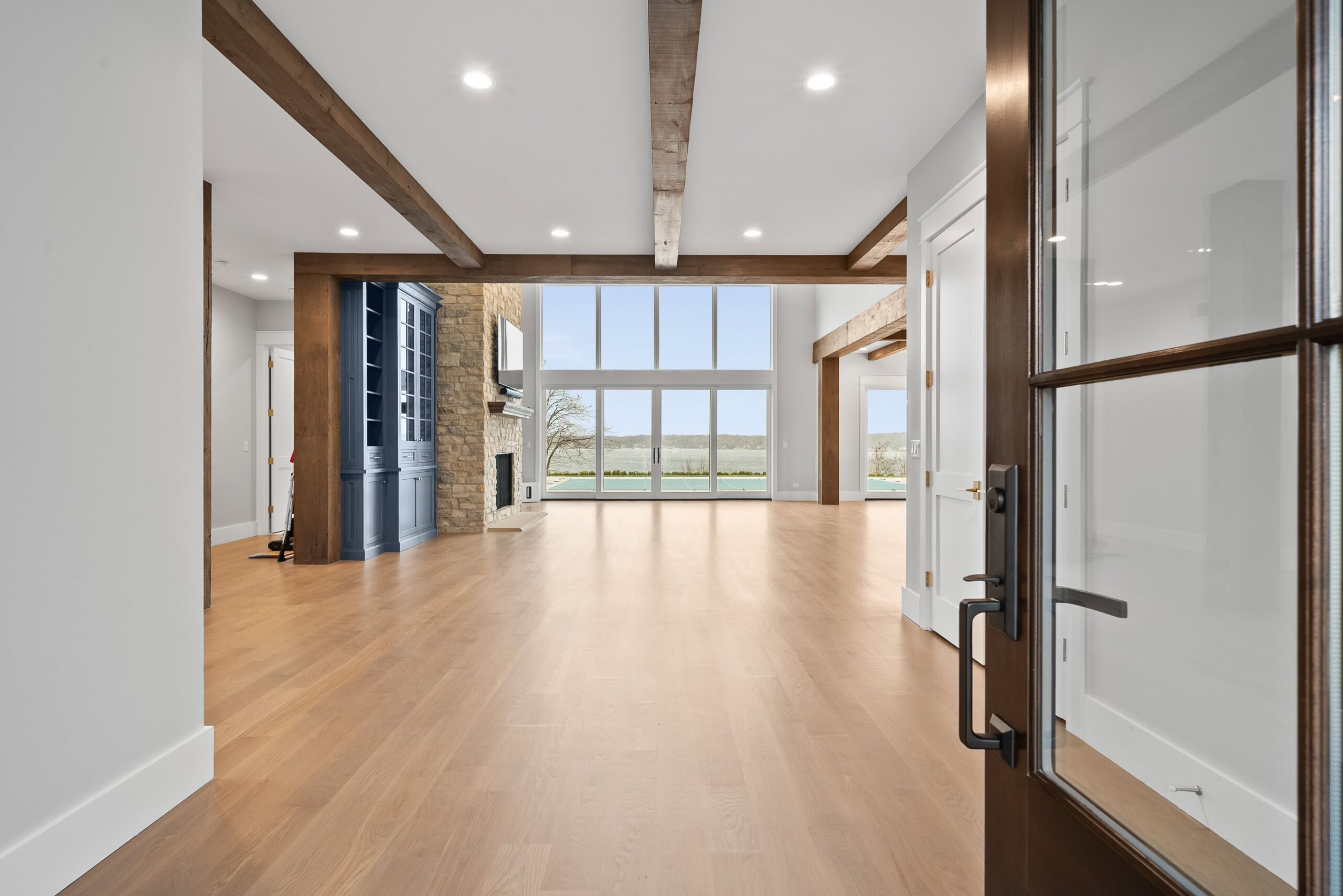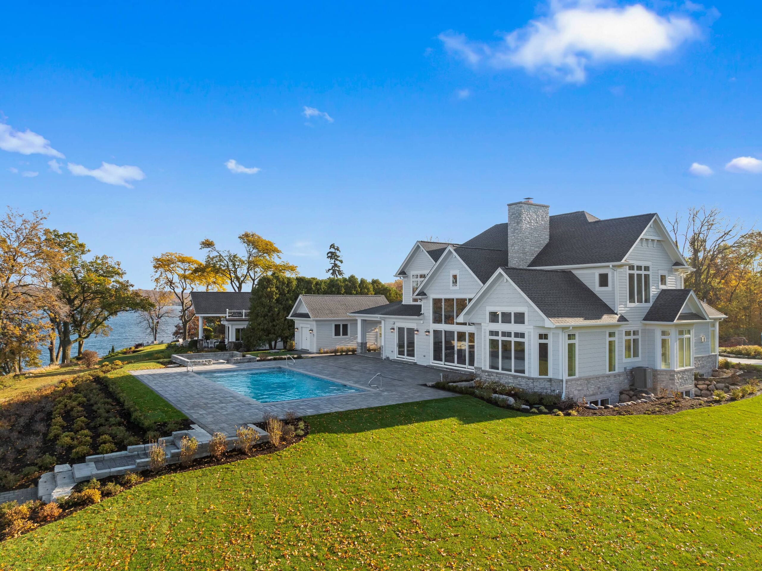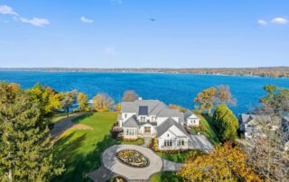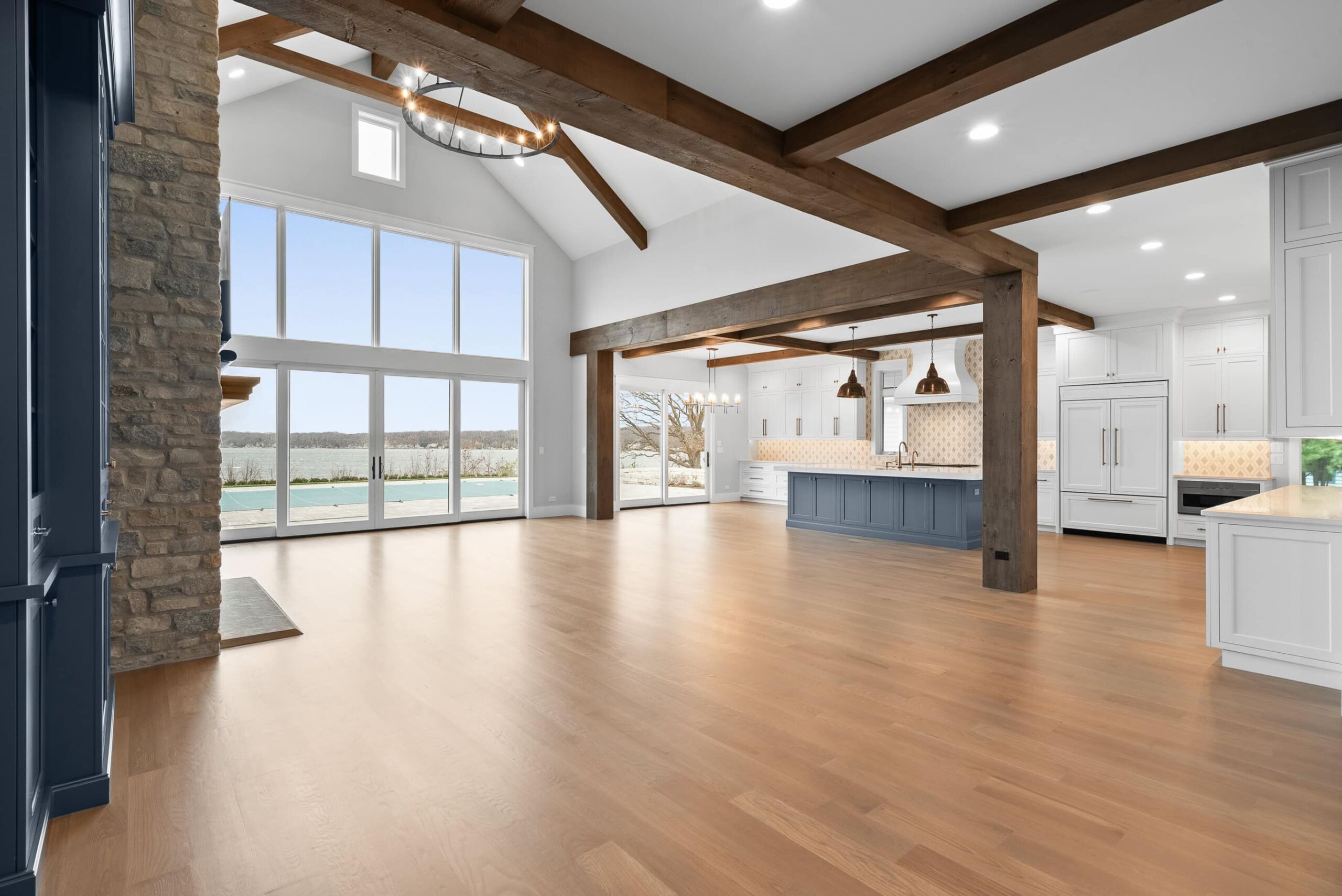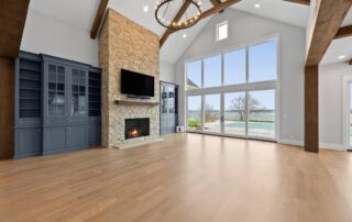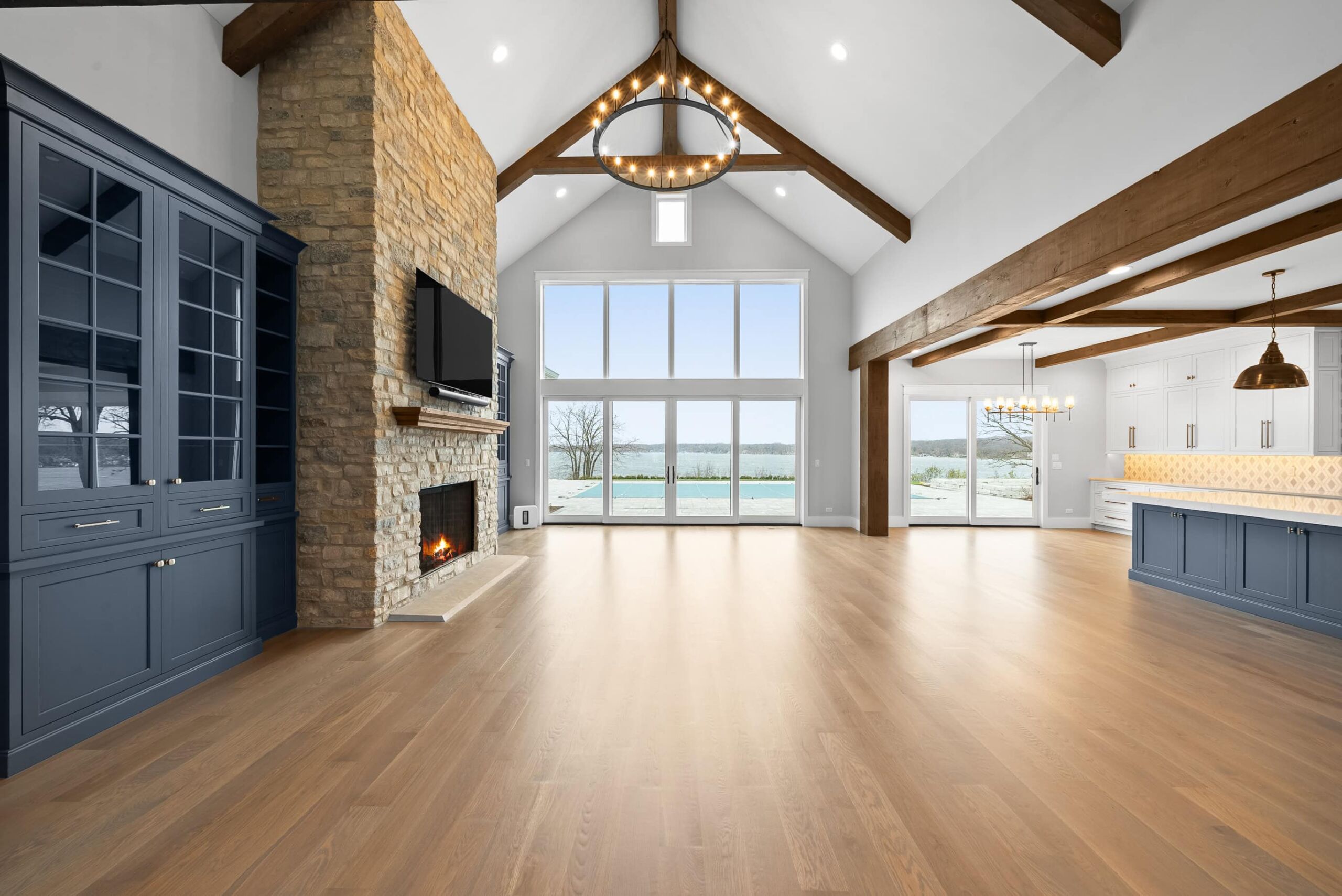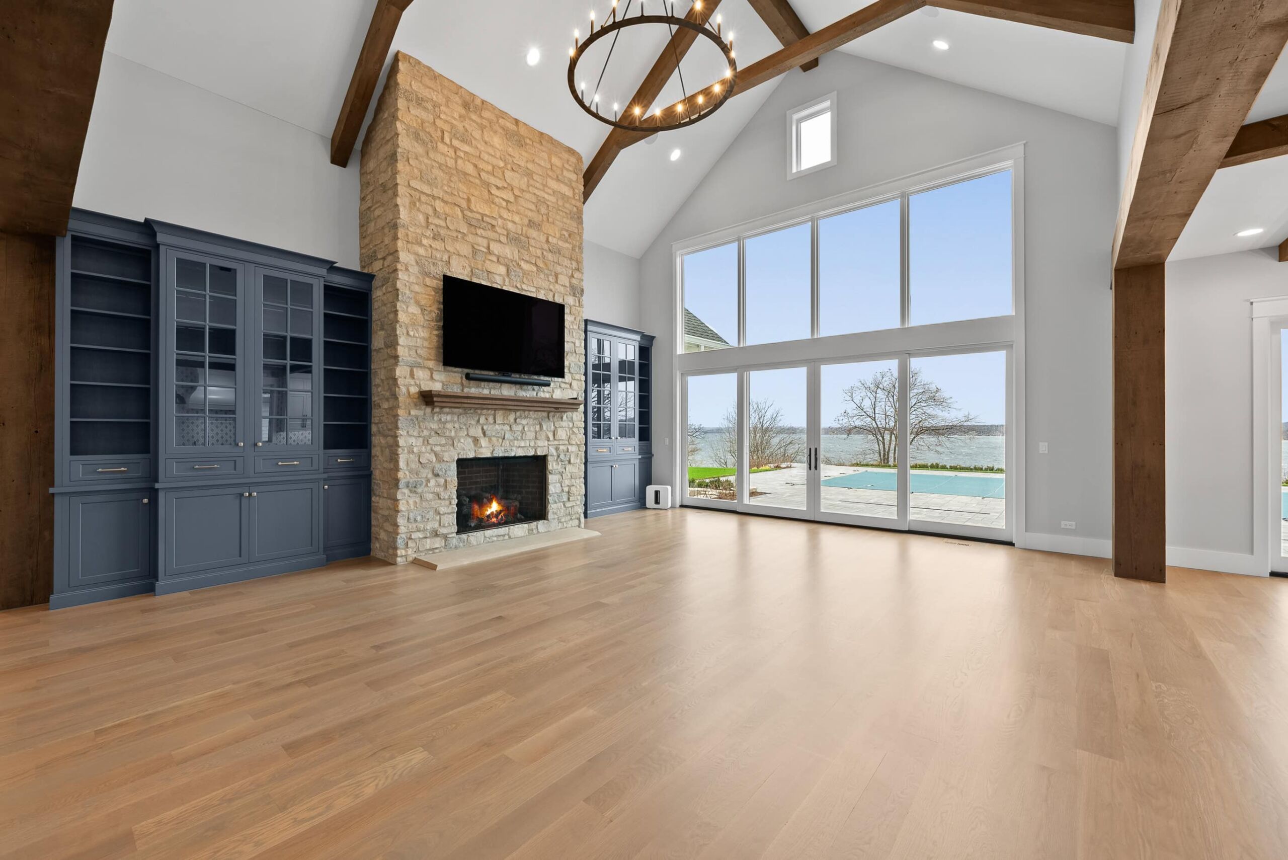 Matustik Builders crafted this exceptional custom lakefront home on Lake Geneva, WI, tailored perfectly to the homeowners' vision. The spectacular great room showcases elegant built-in cabinetry, a striking stone fireplace, and expansive windows that frame breathtaking lake views. The gourmet kitchen is a chef’s dream, boasting a large island and an abundance of custom cabinetry.Thoughtfully designed, the home features a stunning home office with a beautiful fireplace, a spacious bunk room for guests, a finished lower level for entertaining as well as a dedicated workout room. The exposed wood beams add to the home’s charm while enhancing its warm, lakefront ambiance. The custom built pool and firepit also offer a fantastic way to enjoy the lake views.