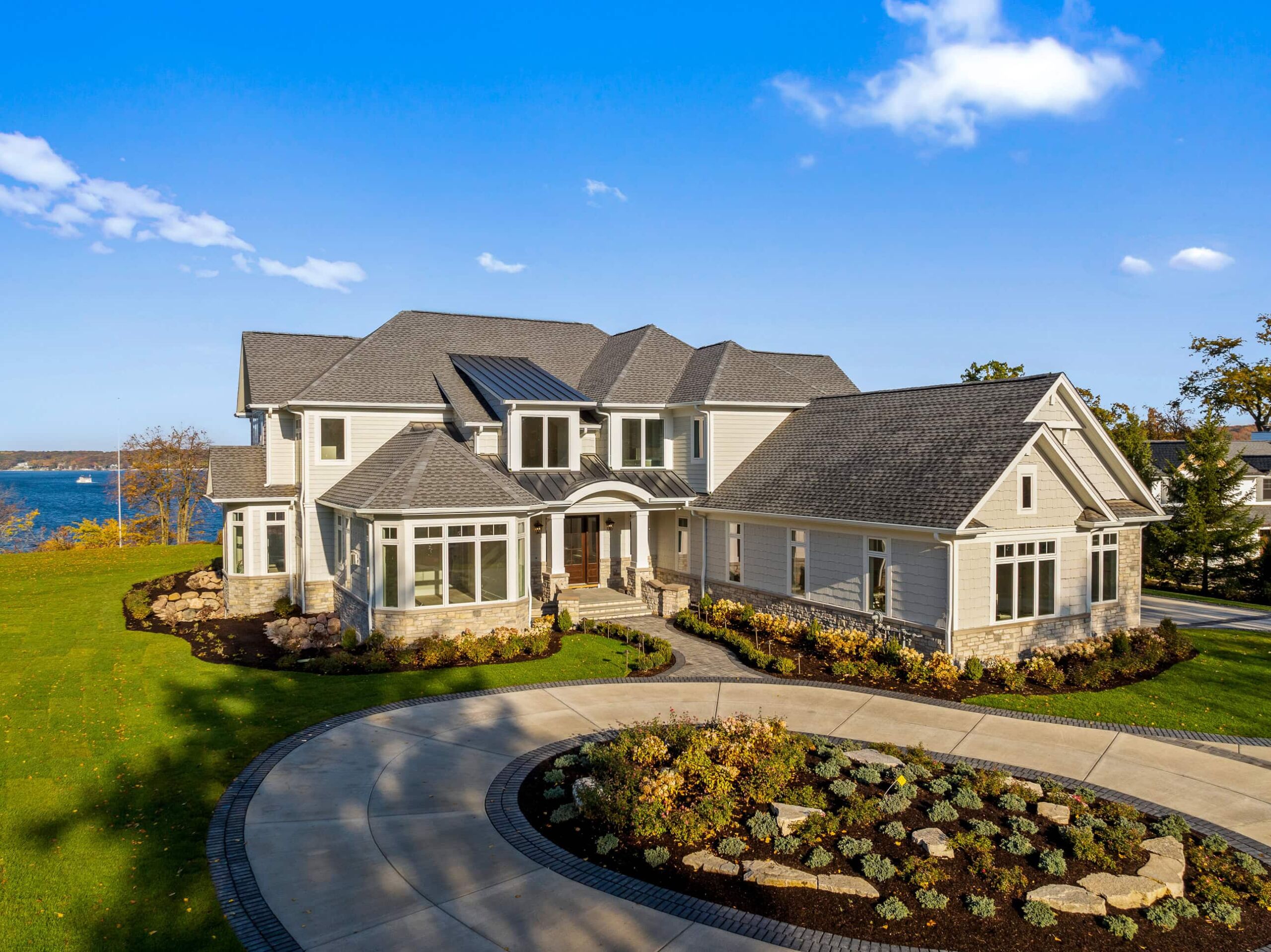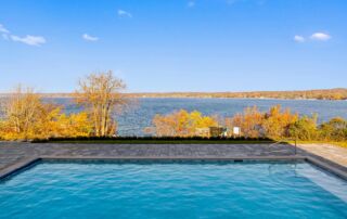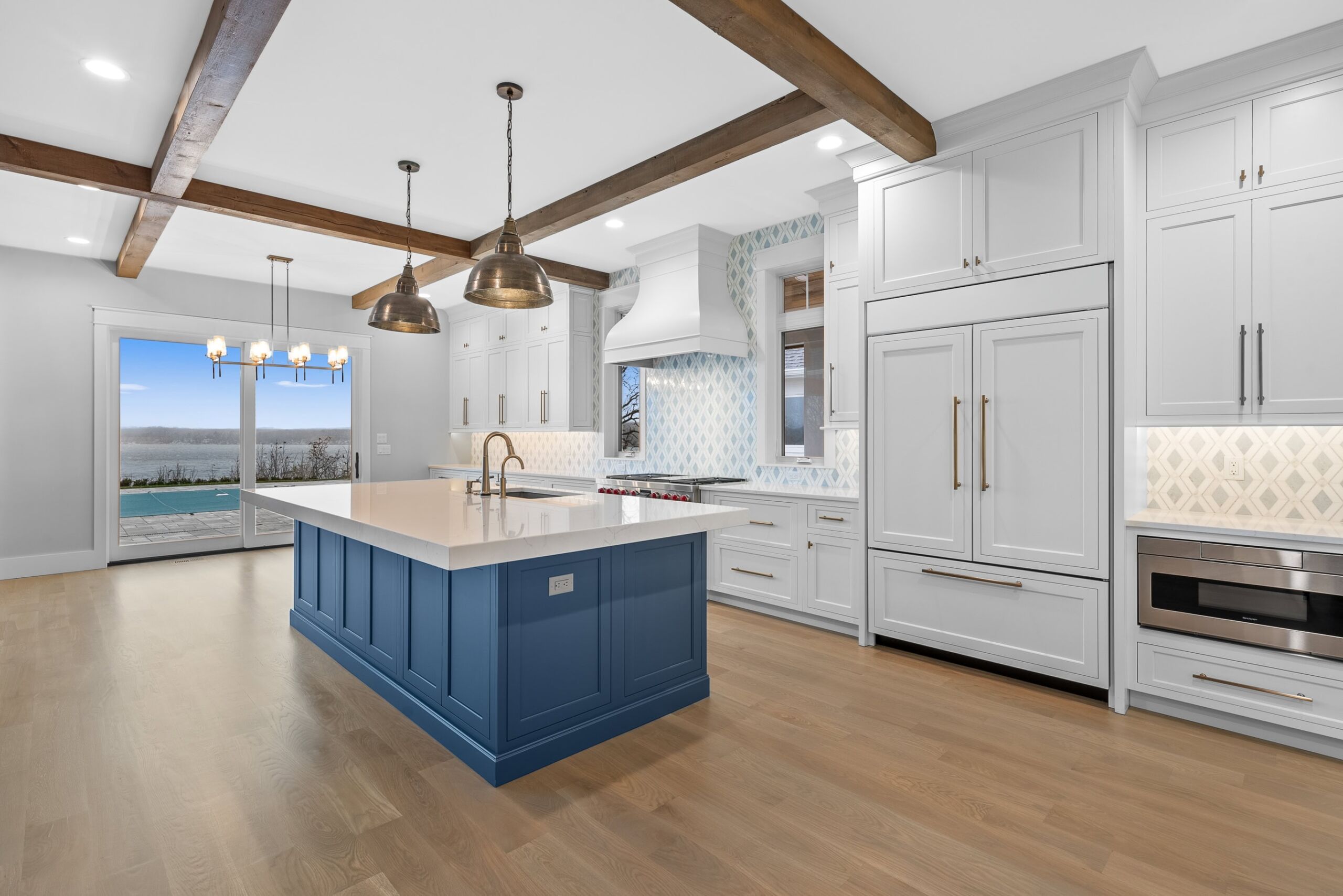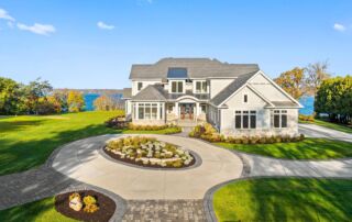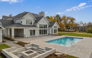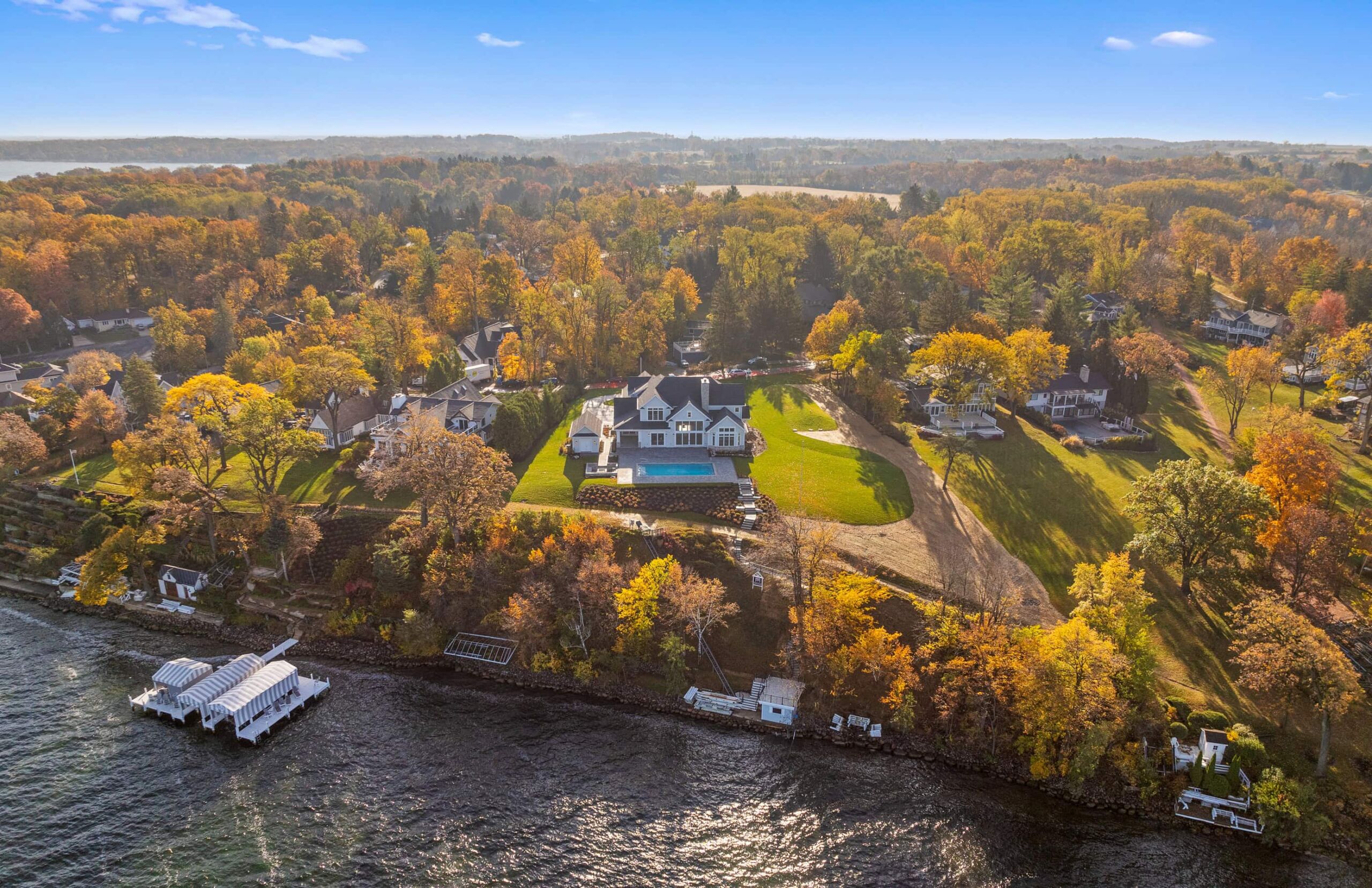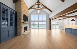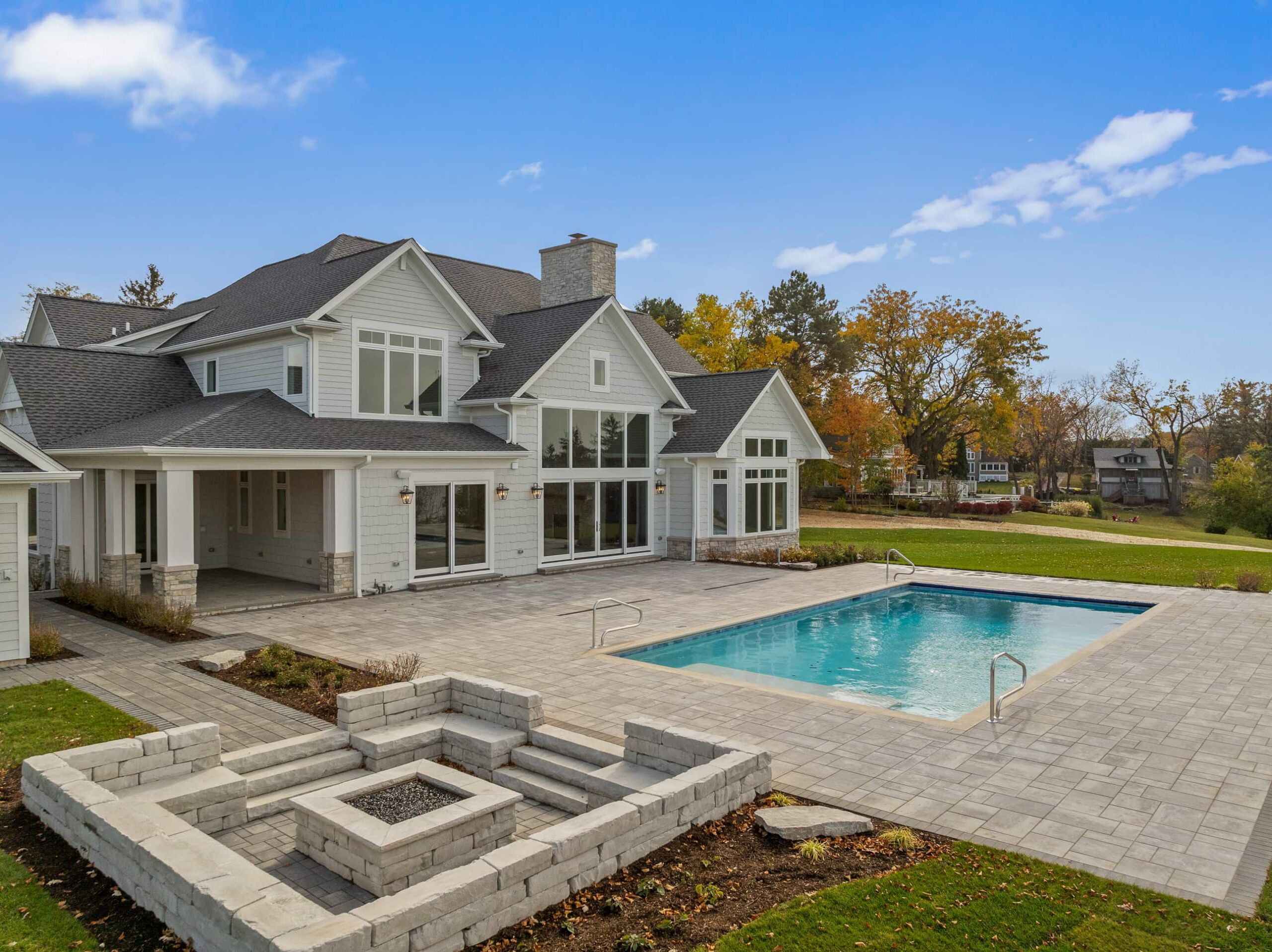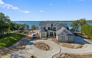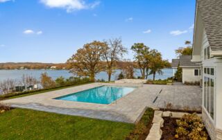 Matustik Builders crafted this exceptional custom lakefront home on Lake Geneva, WI, tailored perfectly to the homeowners' vision. The spectacular great room showcases elegant built-in cabinetry, a striking stone fireplace, and expansive windows that frame breathtaking lake views. The gourmet kitchen is a chef’s dream, boasting a large island and an abundance of custom cabinetry.Thoughtfully designed, the home features a stunning home office with a beautiful fireplace, a spacious bunk room for guests, a finished lower level for entertaining as well as a dedicated workout room. The exposed wood beams add to the home’s charm while enhancing its warm, lakefront ambiance. The custom built pool and firepit also offer a fantastic way to enjoy the lake views.