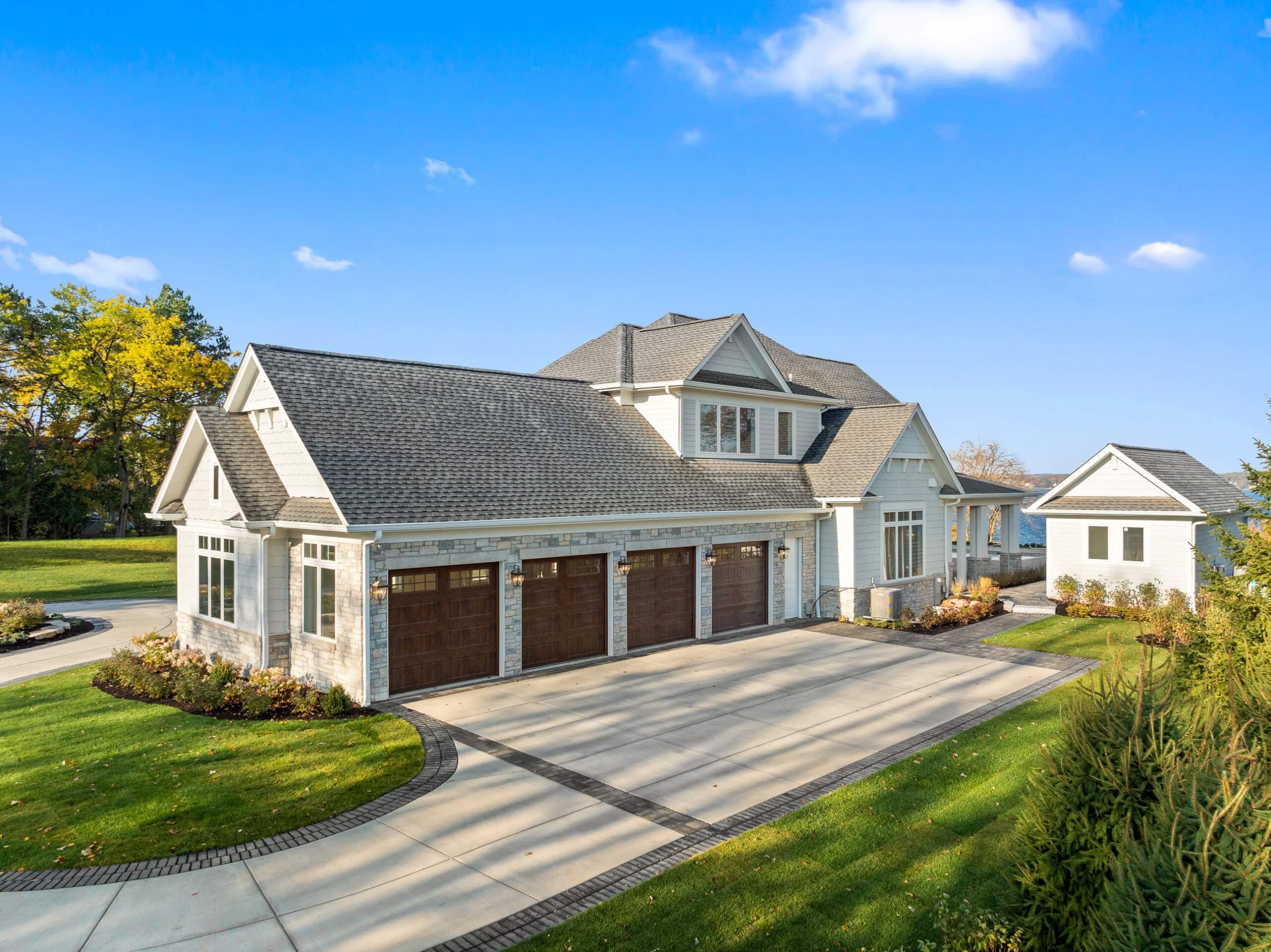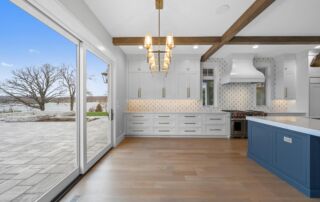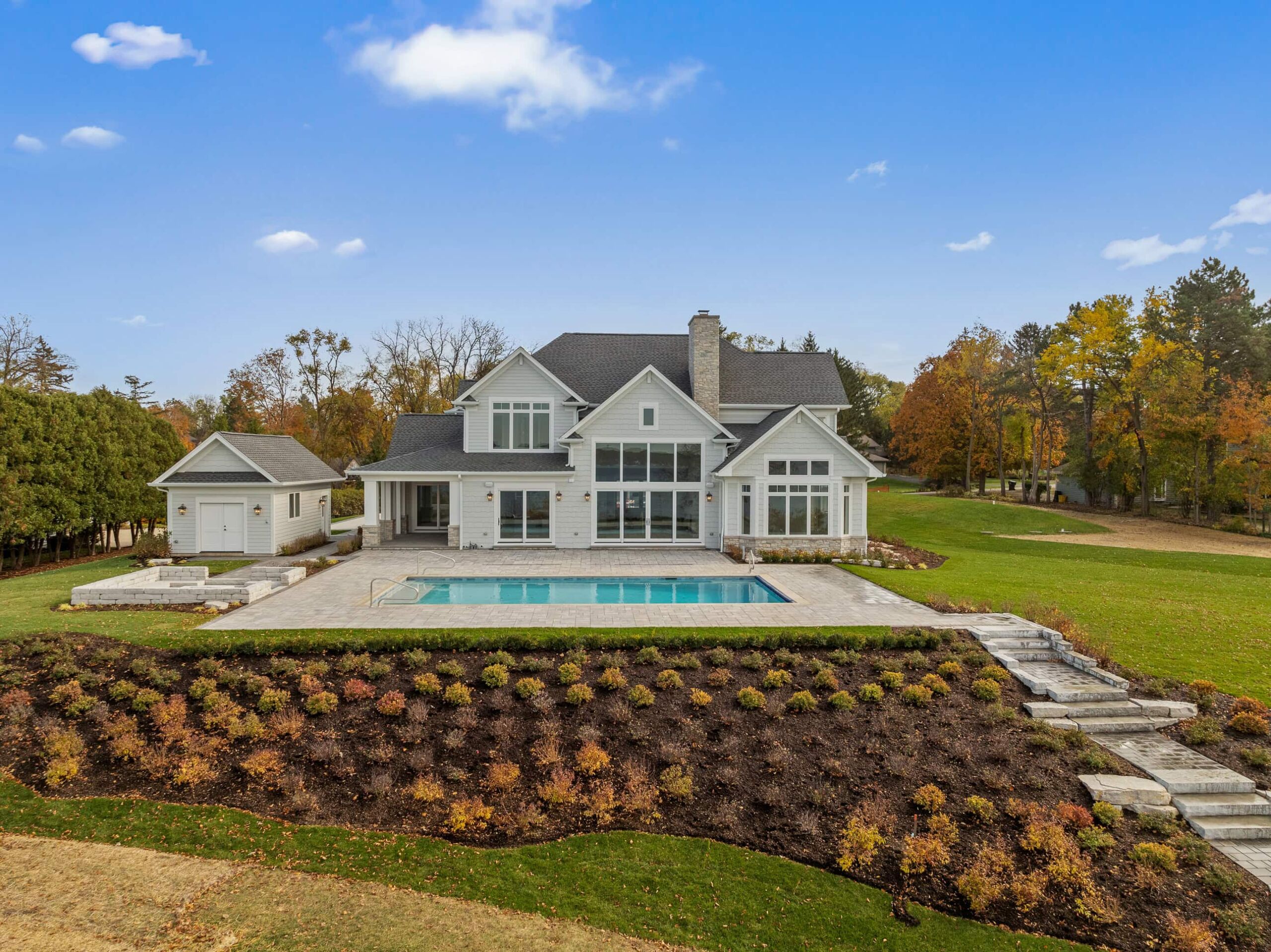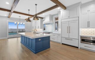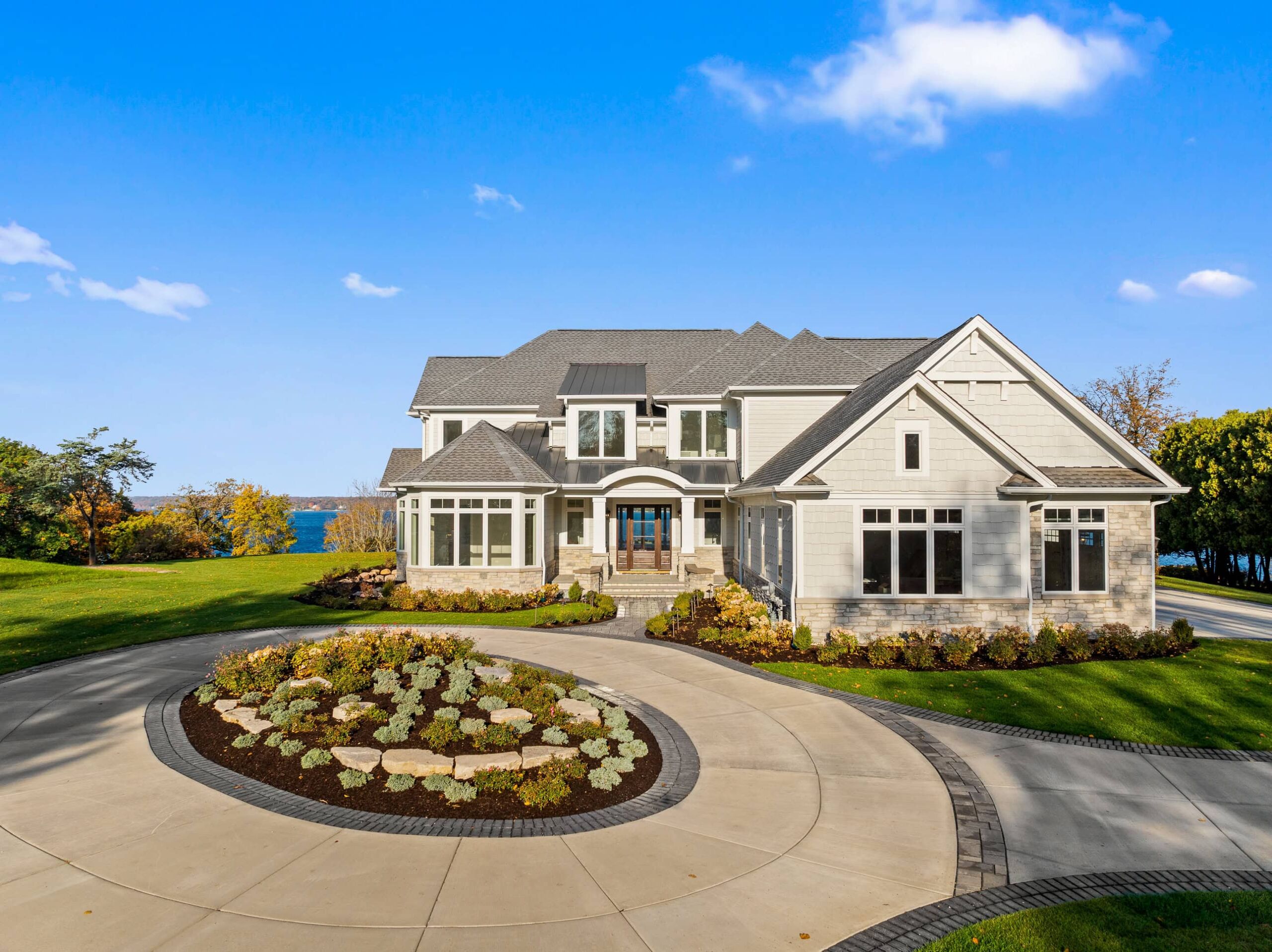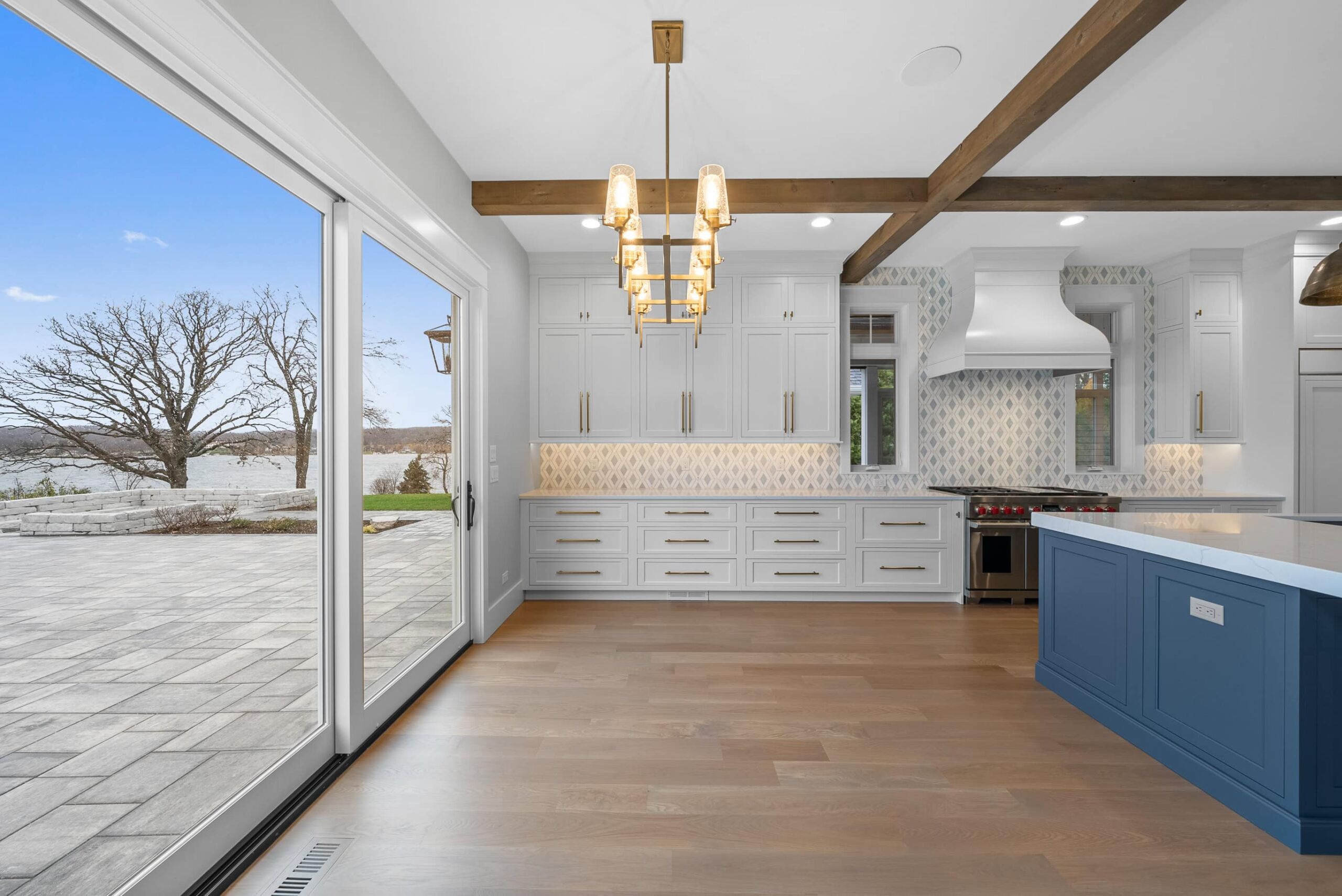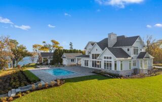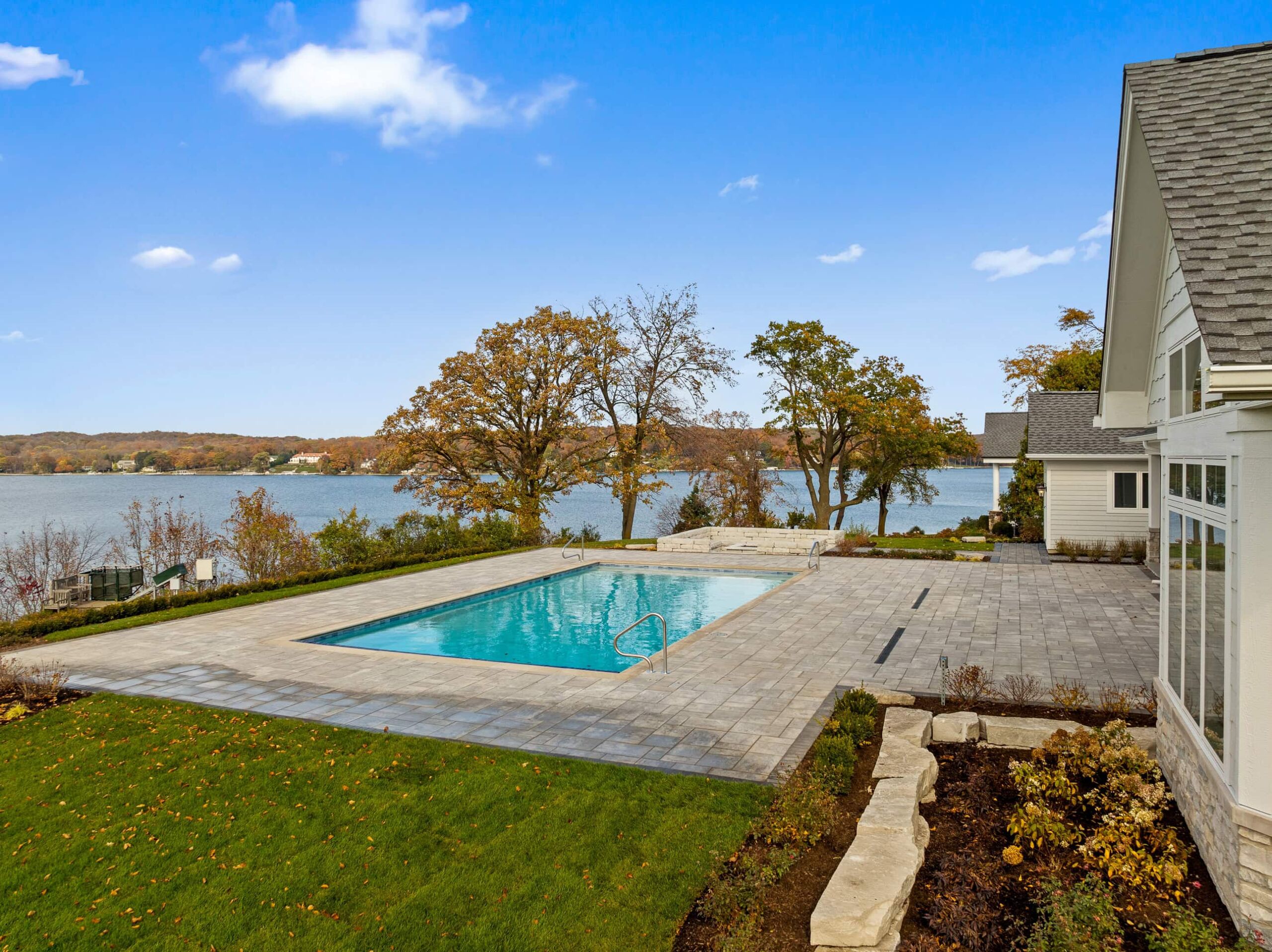 Matustik Builders crafted this exceptional custom lakefront home on Lake Geneva, WI, tailored perfectly to the homeowners' vision. The spectacular great room showcases elegant built-in cabinetry, a striking stone fireplace, and expansive windows that frame breathtaking lake views. The gourmet kitchen is a chef’s dream, boasting a large island and an abundance of custom cabinetry.Thoughtfully designed, the home features a stunning home office with a beautiful fireplace, a spacious bunk room for guests, a finished lower level for entertaining as well as a dedicated workout room. The exposed wood beams add to the home’s charm while enhancing its warm, lakefront ambiance. The custom built pool and firepit also offer a fantastic way to enjoy the lake views.