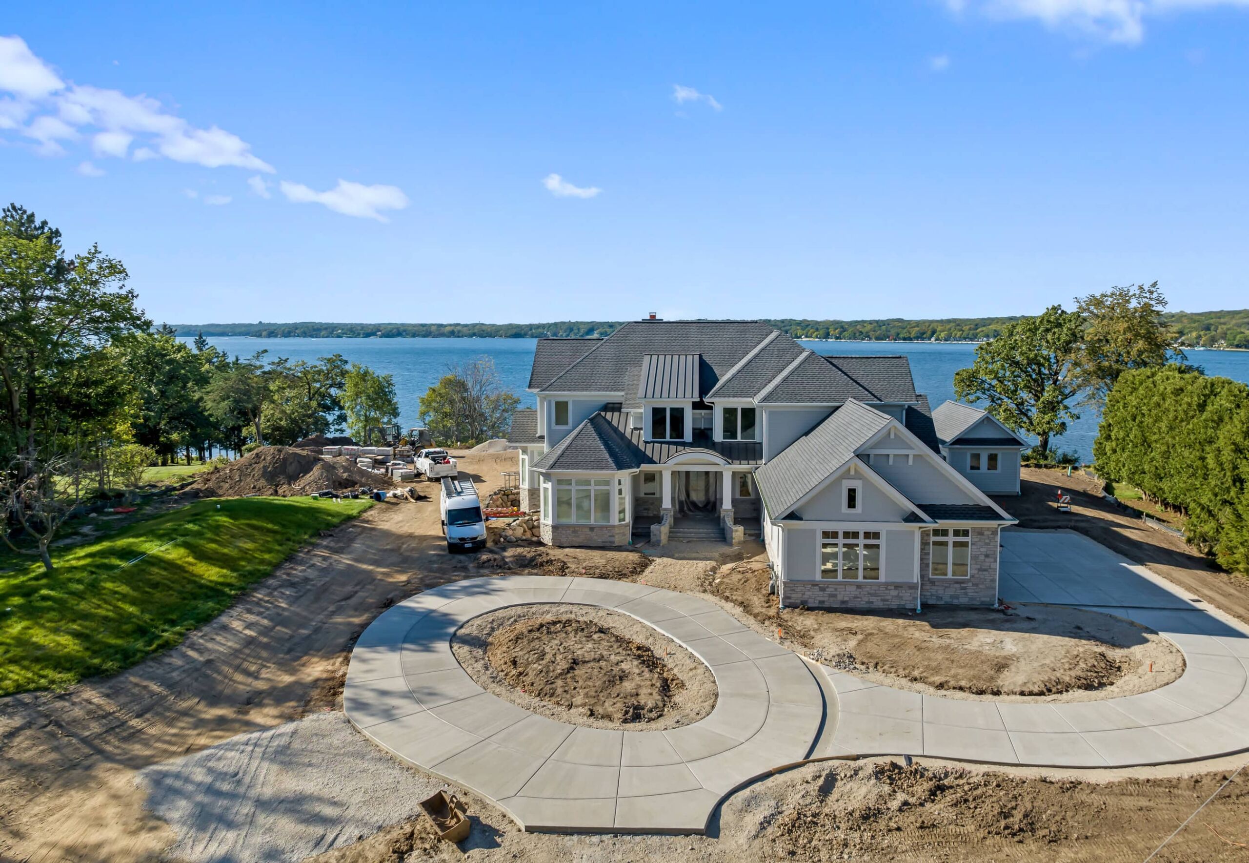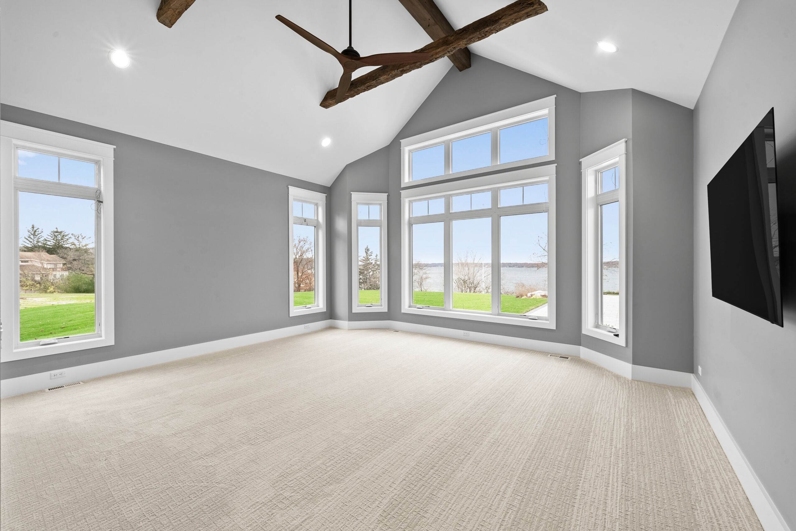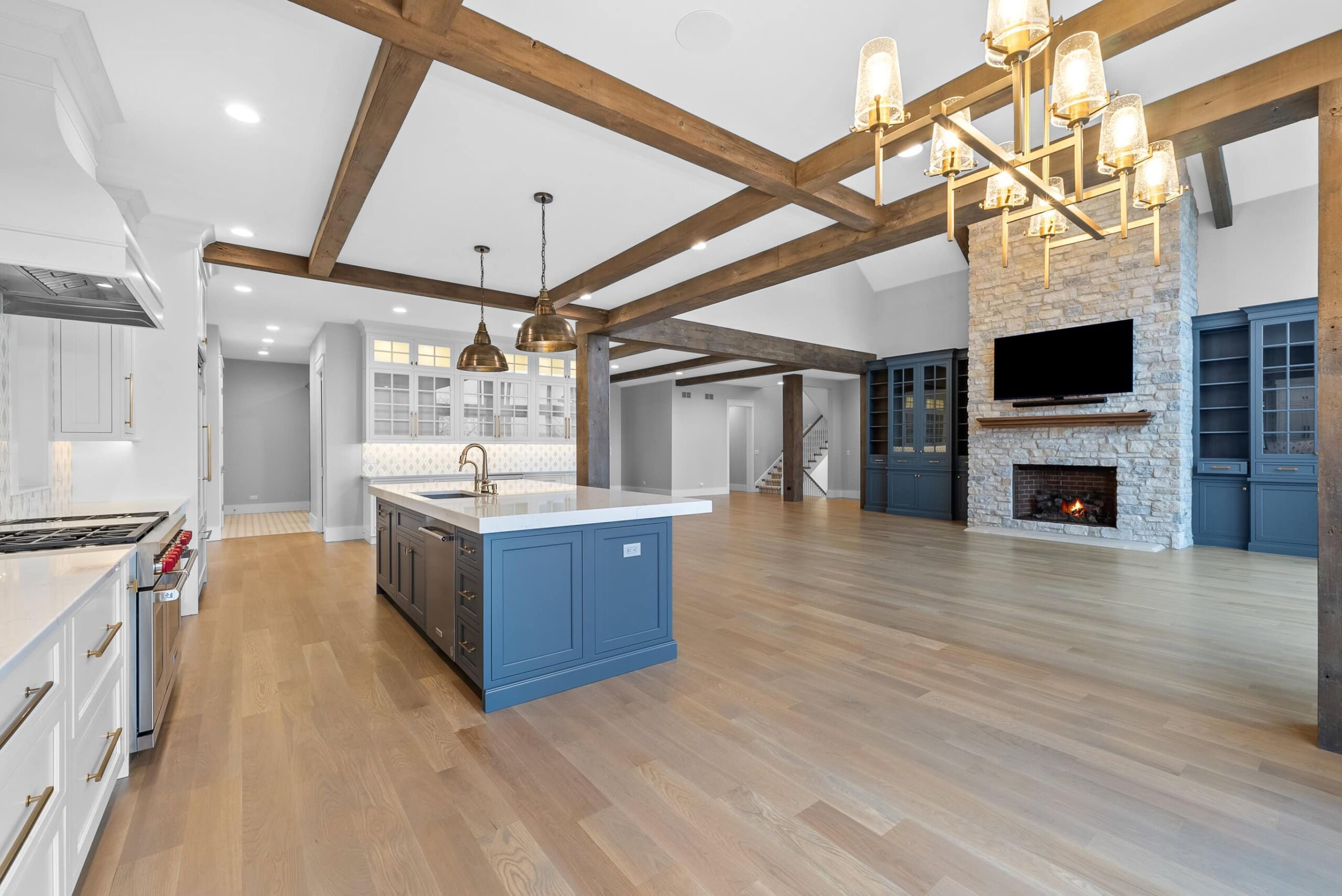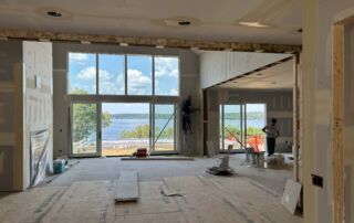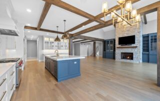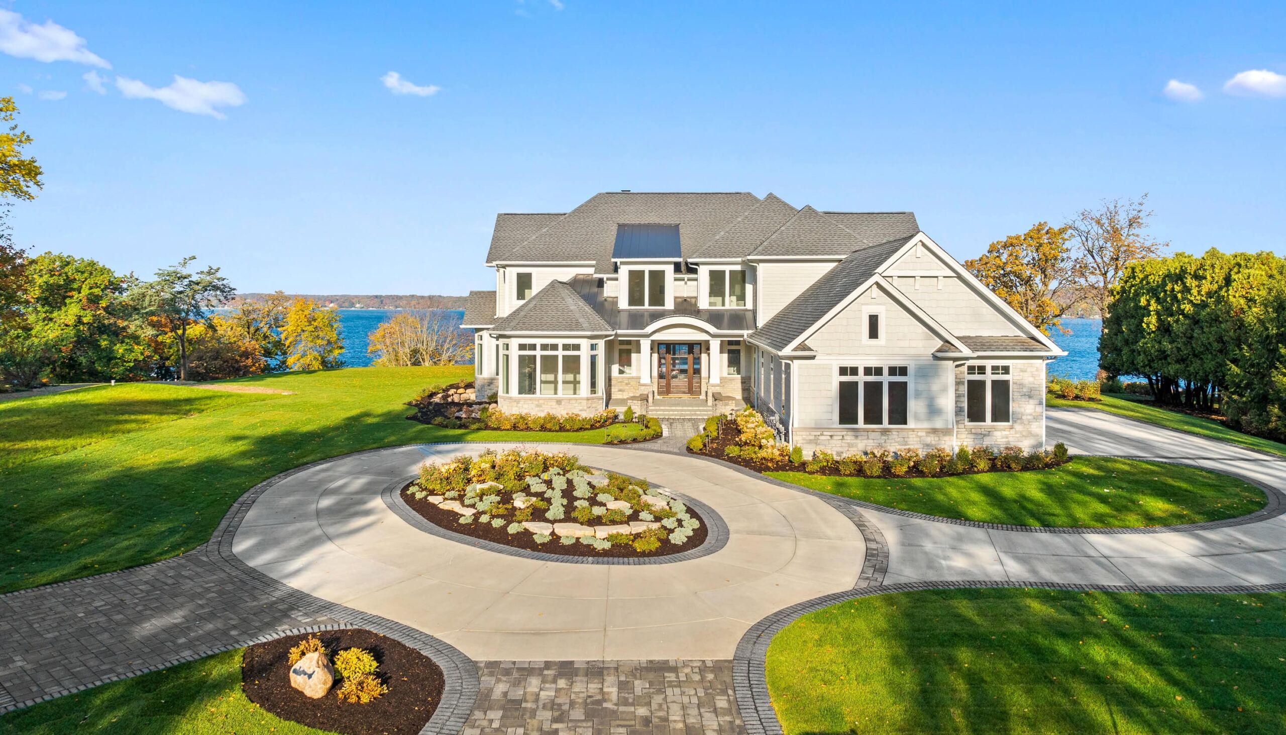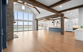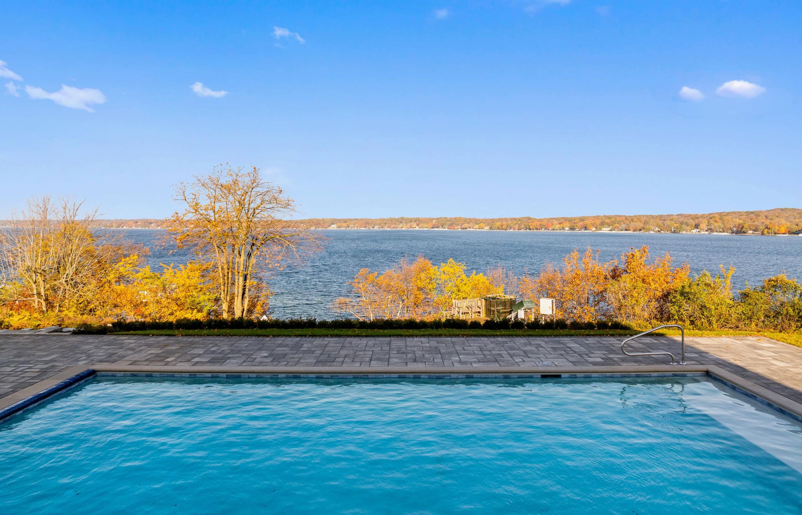 Matustik Builders crafted this exceptional custom lakefront home on Lake Geneva, WI, tailored perfectly to the homeowners' vision. The spectacular great room showcases elegant built-in cabinetry, a striking stone fireplace, and expansive windows that frame breathtaking lake views. The gourmet kitchen is a chef’s dream, boasting a large island and an abundance of custom cabinetry.Thoughtfully designed, the home features a stunning home office with a beautiful fireplace, a spacious bunk room for guests, a finished lower level for entertaining as well as a dedicated workout room. The exposed wood beams add to the home’s charm while enhancing its warm, lakefront ambiance. The custom built pool and firepit also offer a fantastic way to enjoy the lake views.