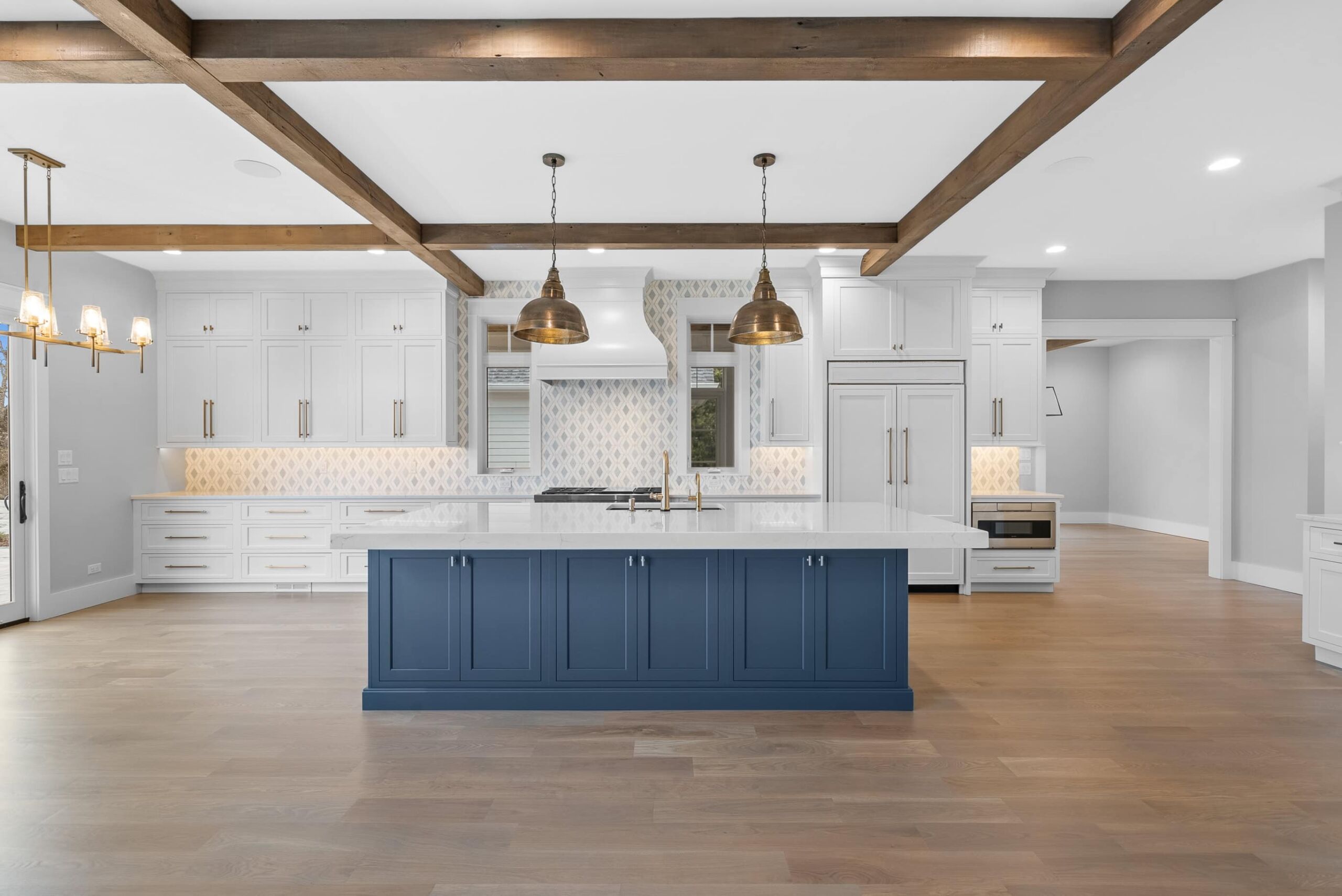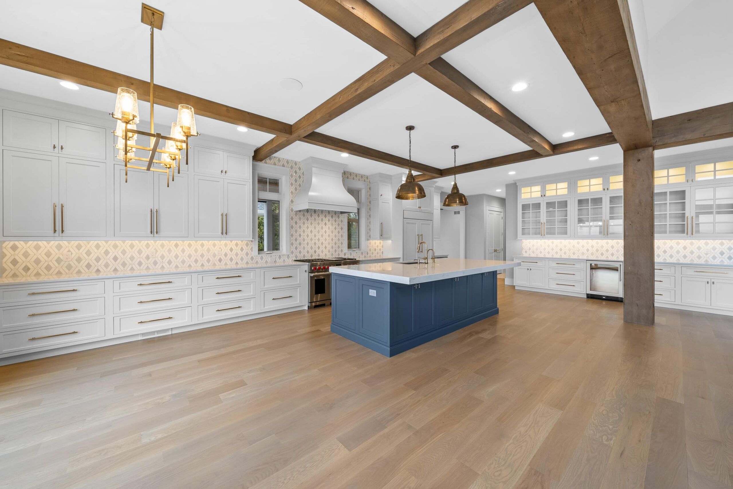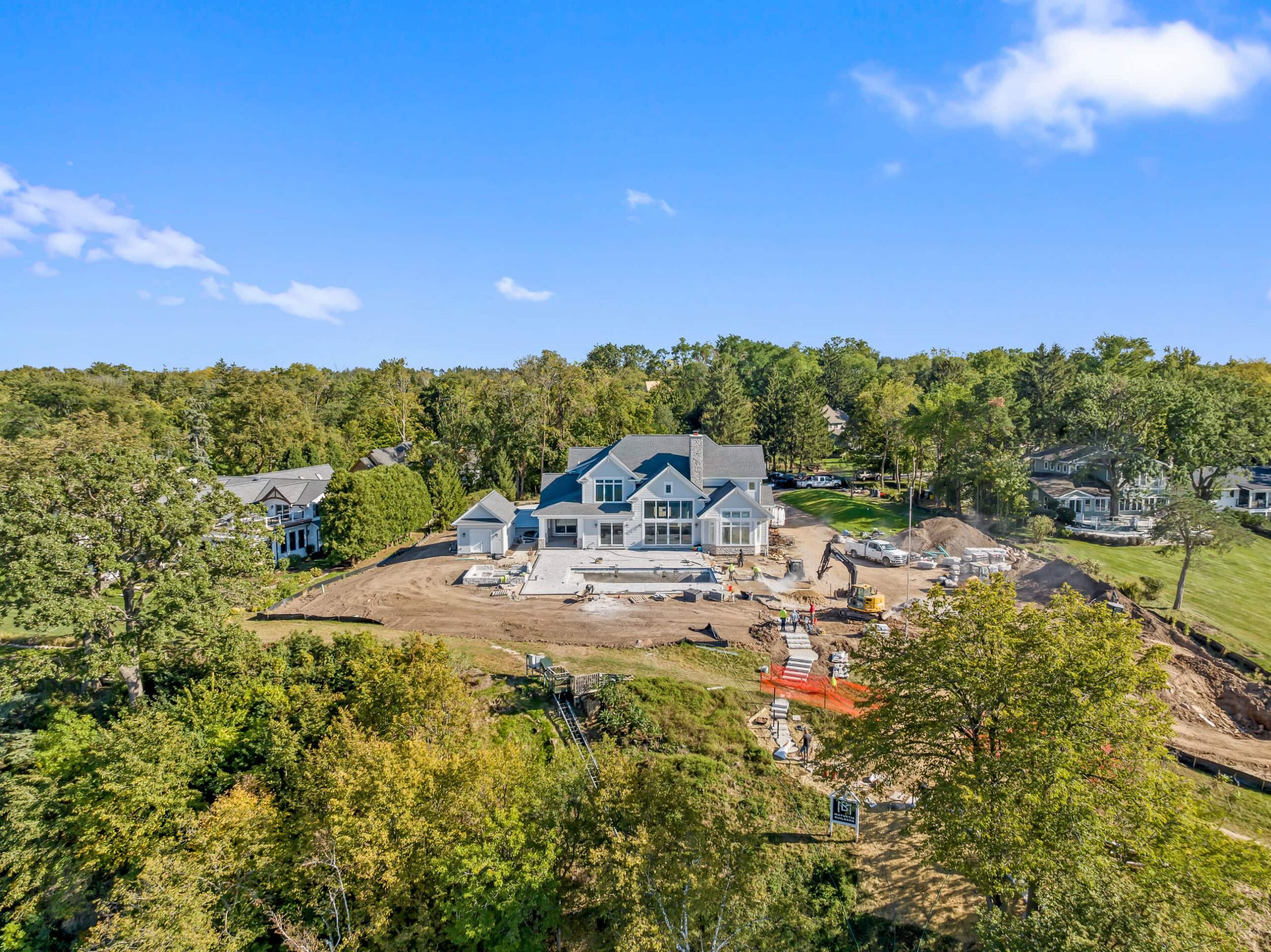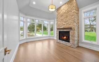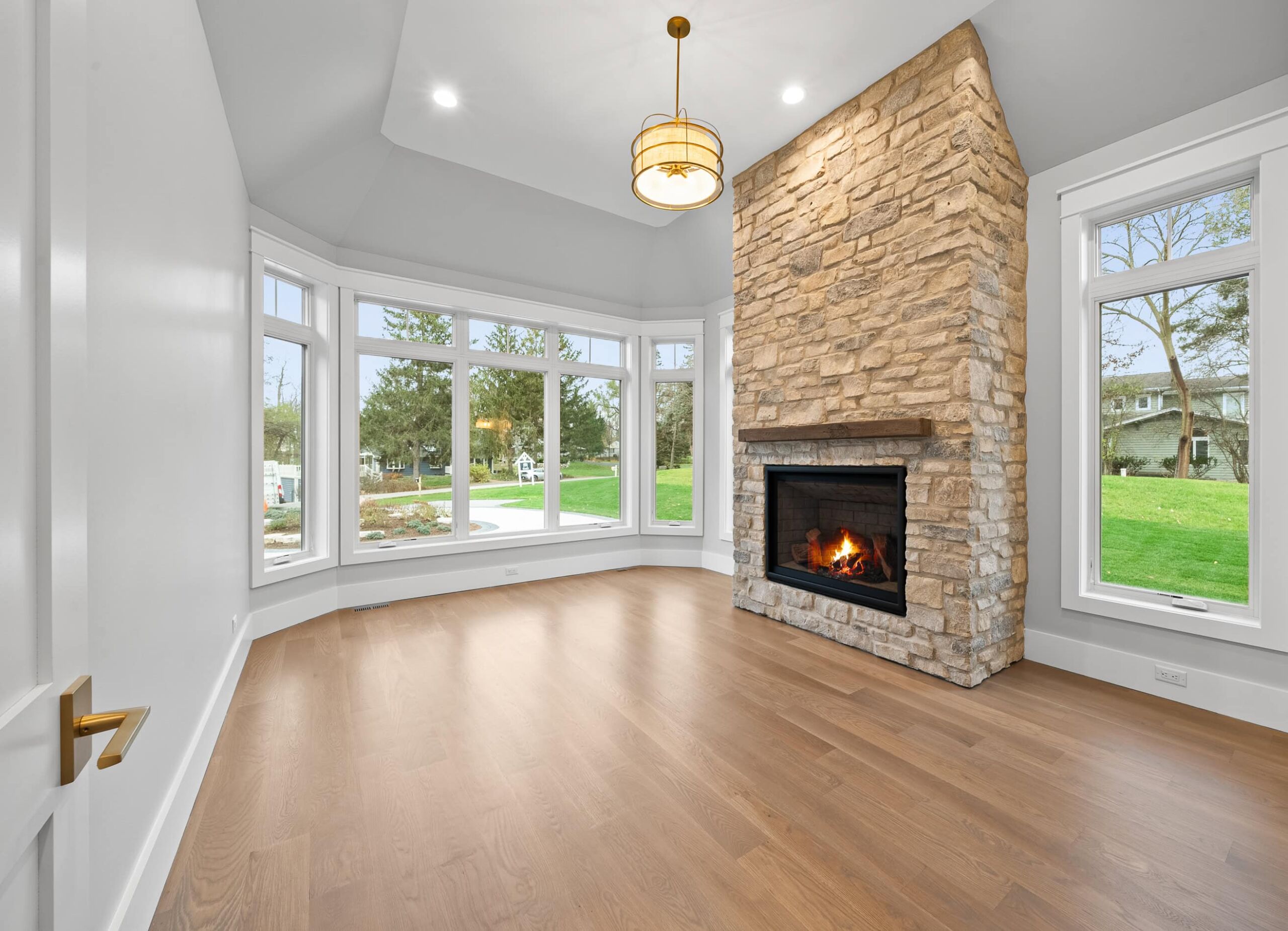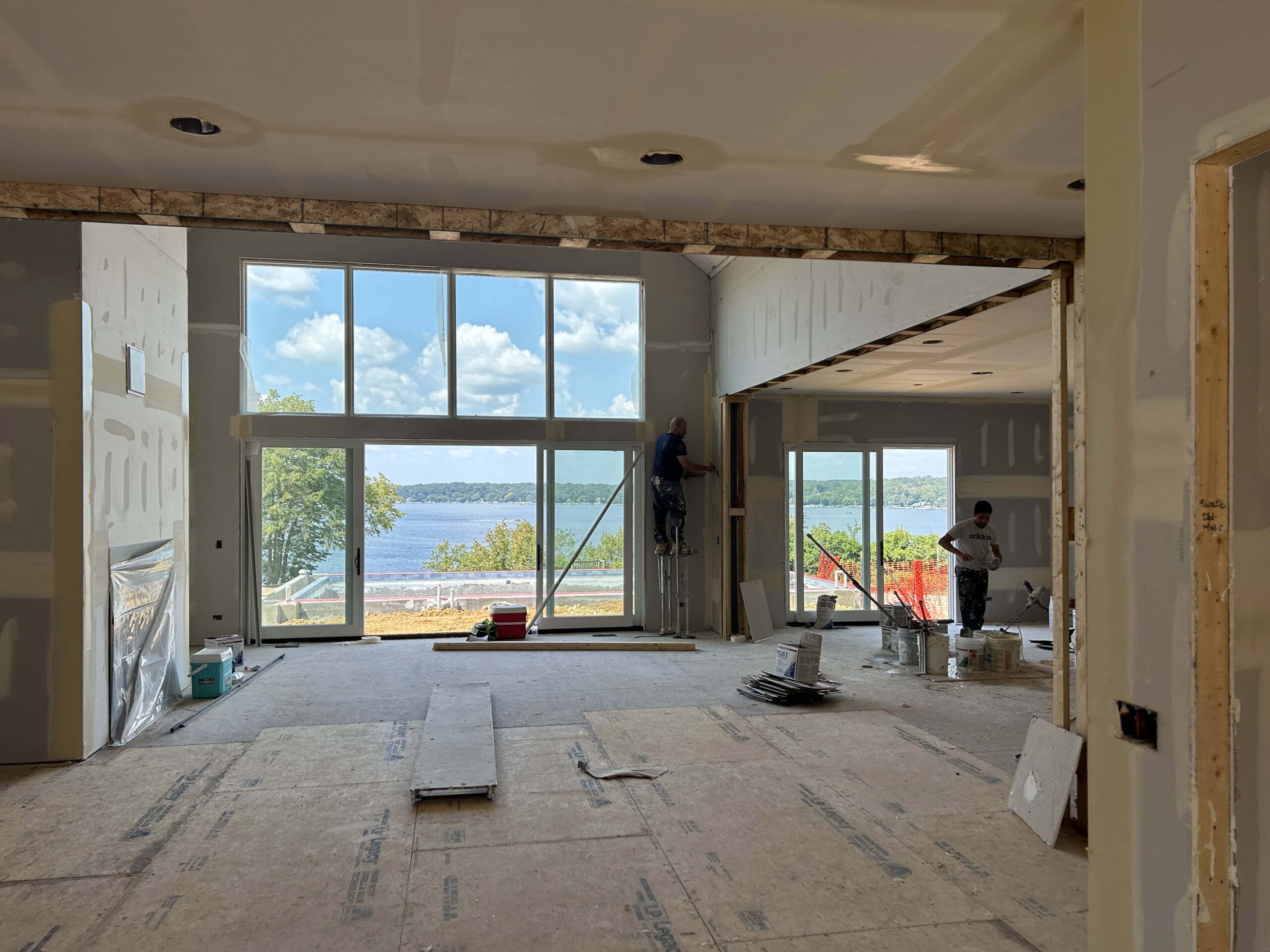 Matustik Builders crafted this exceptional custom lakefront home on Lake Geneva, WI, tailored perfectly to the homeowners' vision. The spectacular great room showcases elegant built-in cabinetry, a striking stone fireplace, and expansive windows that frame breathtaking lake views. The gourmet kitchen is a chef’s dream, boasting a large island and an abundance of custom cabinetry.Thoughtfully designed, the home features a stunning home office with a beautiful fireplace, a spacious bunk room for guests, a finished lower level for entertaining as well as a dedicated workout room. The exposed wood beams add to the home’s charm while enhancing its warm, lakefront ambiance. The custom built pool and firepit also offer a fantastic way to enjoy the lake views.