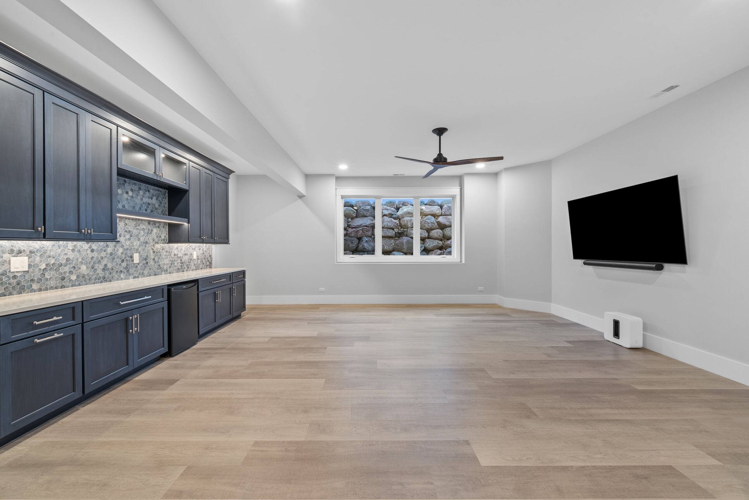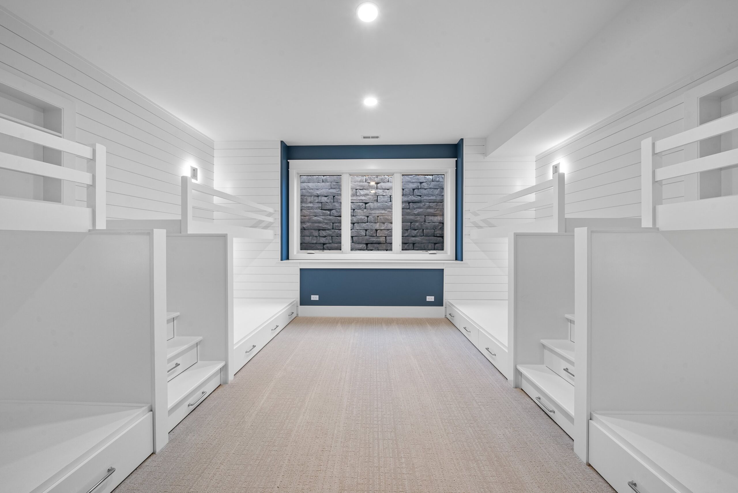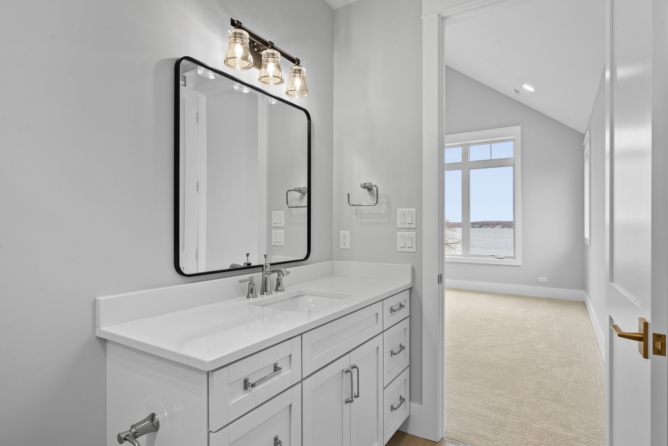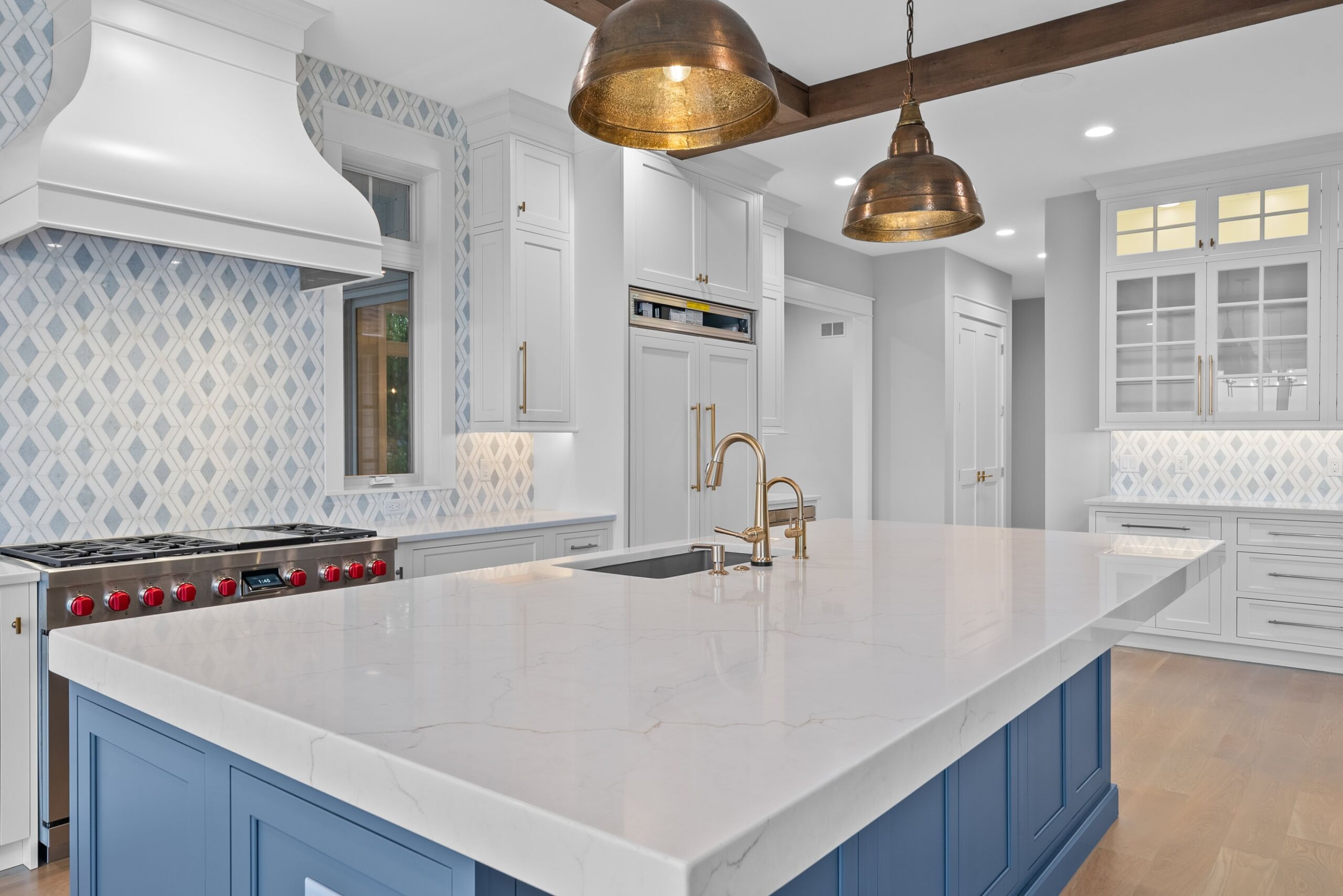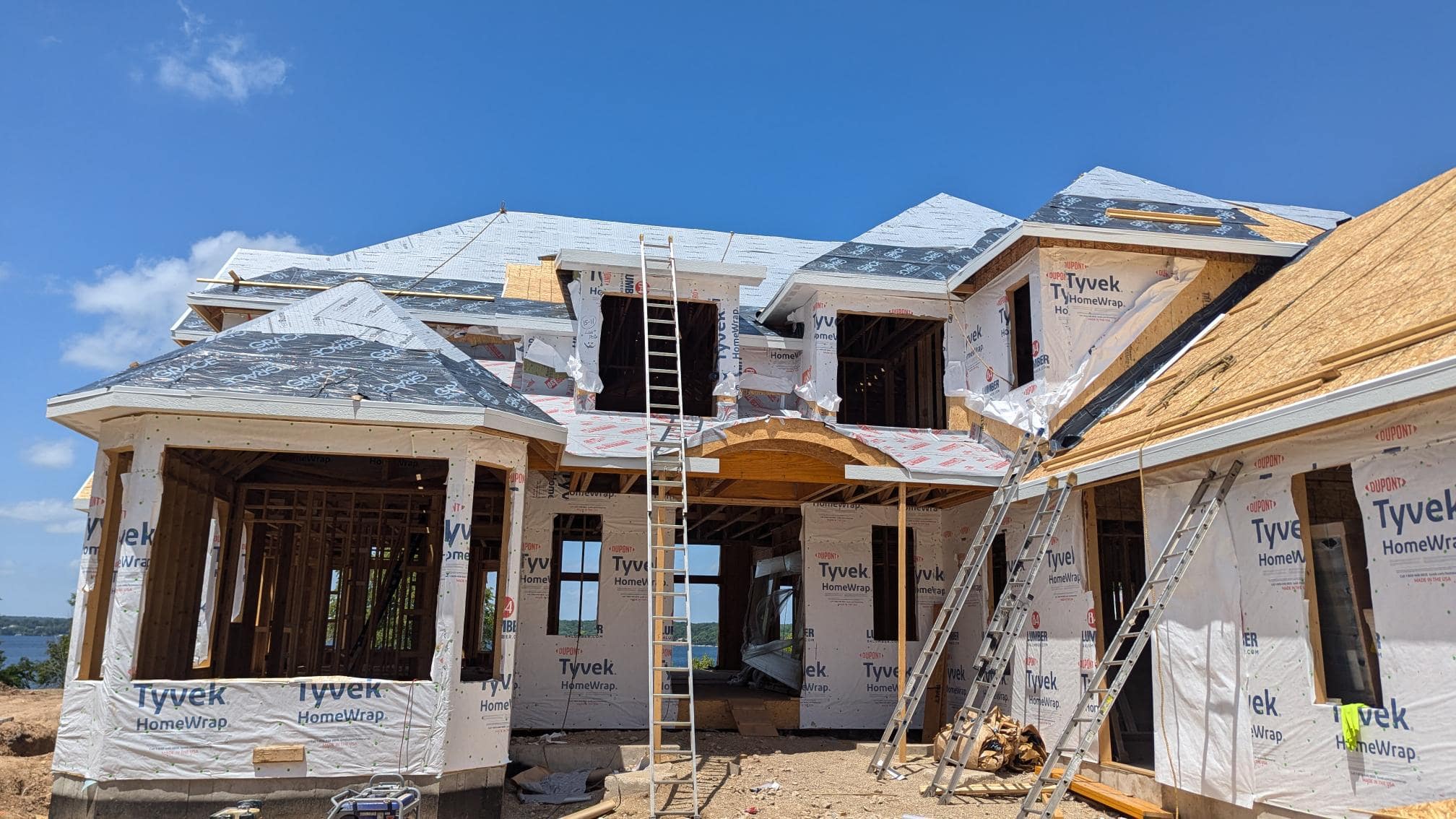 Matustik Builders crafted this exceptional custom lakefront home on Lake Geneva, WI, tailored perfectly to the homeowners' vision. The spectacular great room showcases elegant built-in cabinetry, a striking stone fireplace, and expansive windows that frame breathtaking lake views. The gourmet kitchen is a chef’s dream, boasting a large island and an abundance of custom cabinetry.Thoughtfully designed, the home features a stunning home office with a beautiful fireplace, a spacious bunk room for guests, a finished lower level for entertaining as well as a dedicated workout room. The exposed wood beams add to the home’s charm while enhancing its warm, lakefront ambiance. The custom built pool and firepit also offer a fantastic way to enjoy the lake views.