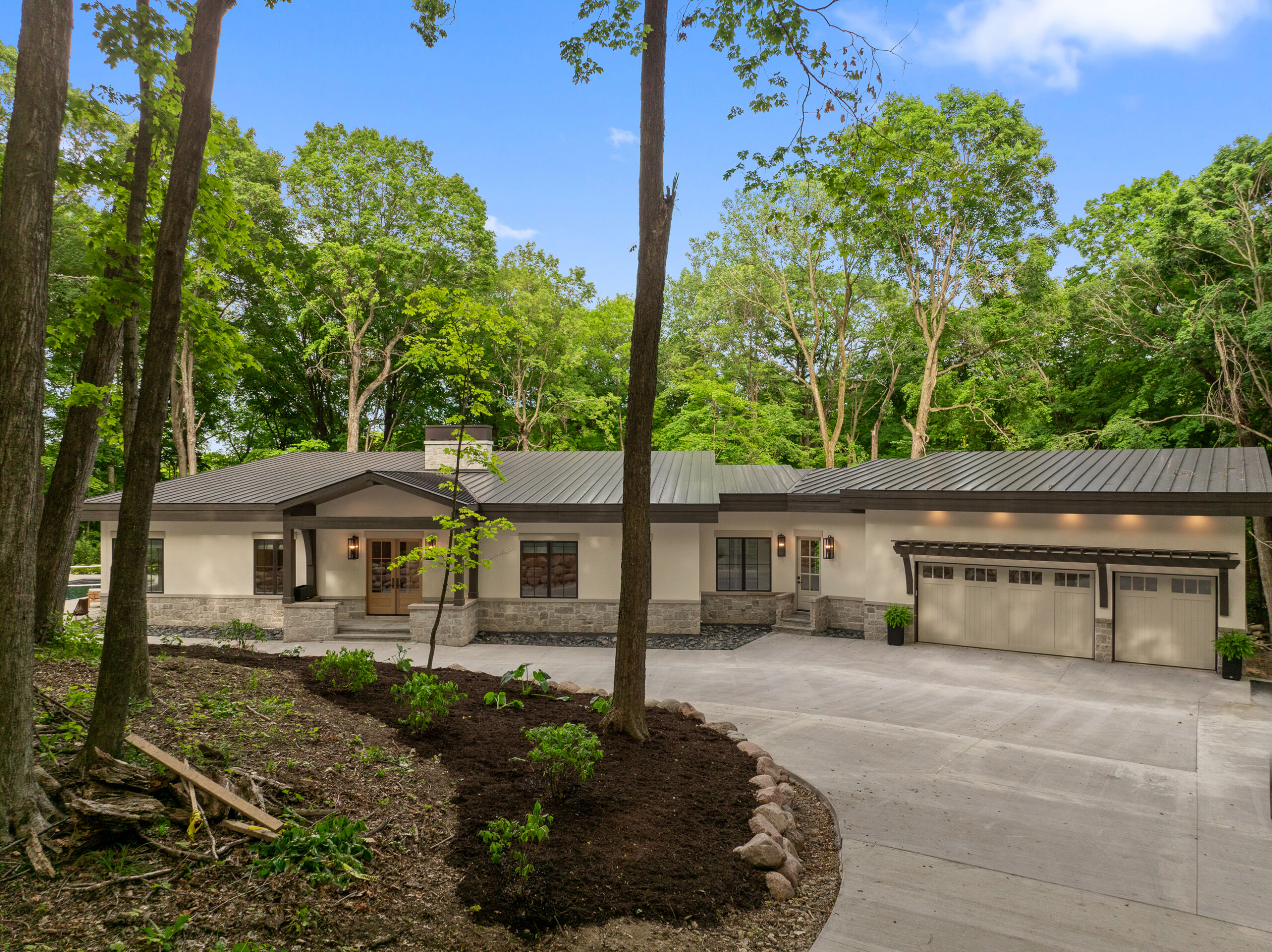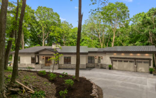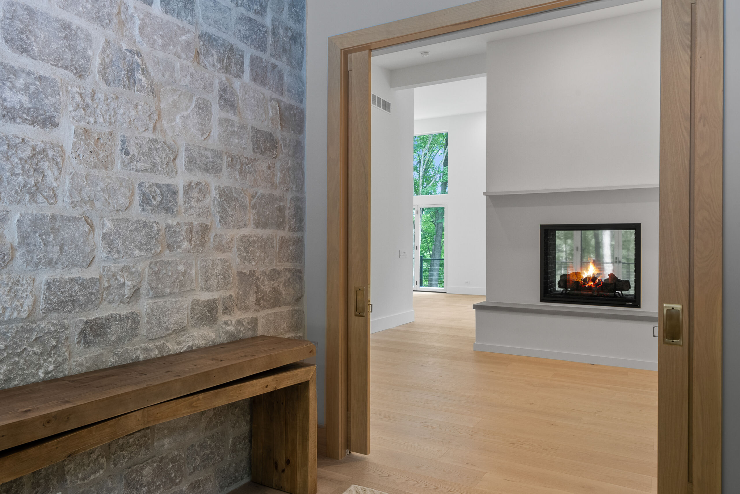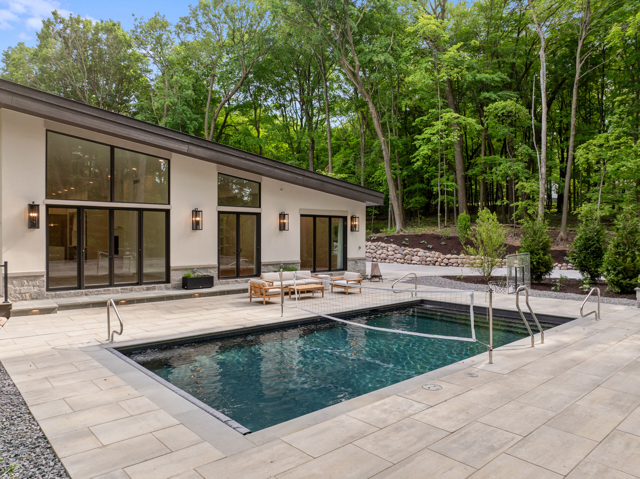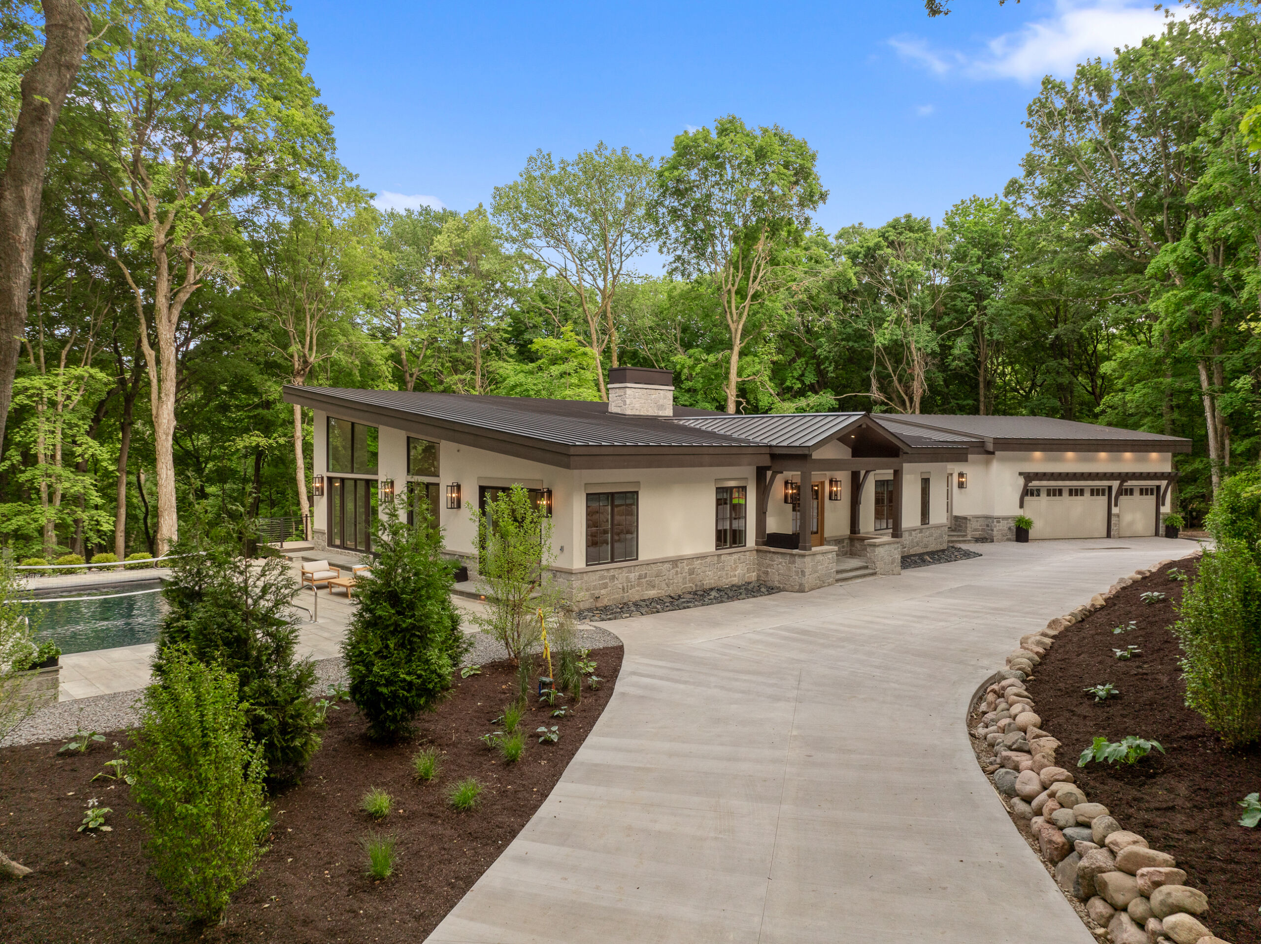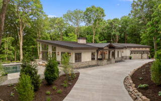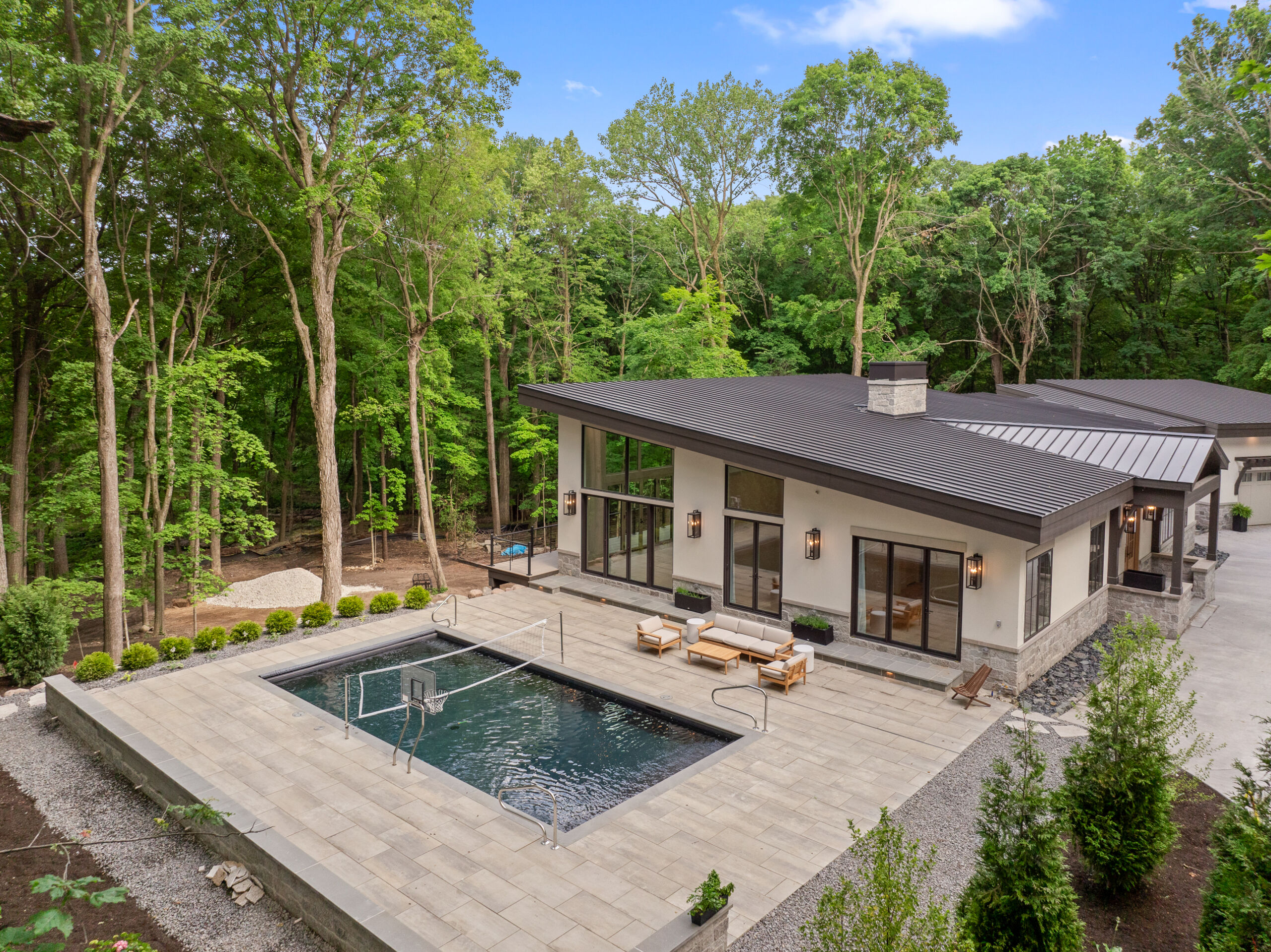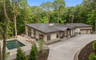 Matustik Builders collaborated with homeowners in Fontana, Wisconsin to design an amazing custom built home that perfectly complements its wooded surroundings. The home features a striking metal roof with stone and stucco finishes. Inside, the spacious great room showcases a gourmet kitchen with a large island and floor-to-ceiling windows, offering stunning views of the woods. A two-sided fireplace connects the entryway and living space, creating a warm, inviting atmosphere. The three-season room, equipped with ceiling heaters, allows for year-round enjoyment of the outdoors. Luxurious bathrooms boast solid surface countertops and floating vanities, while the outdoor pool area offers the perfect spot for family and guests to relax.