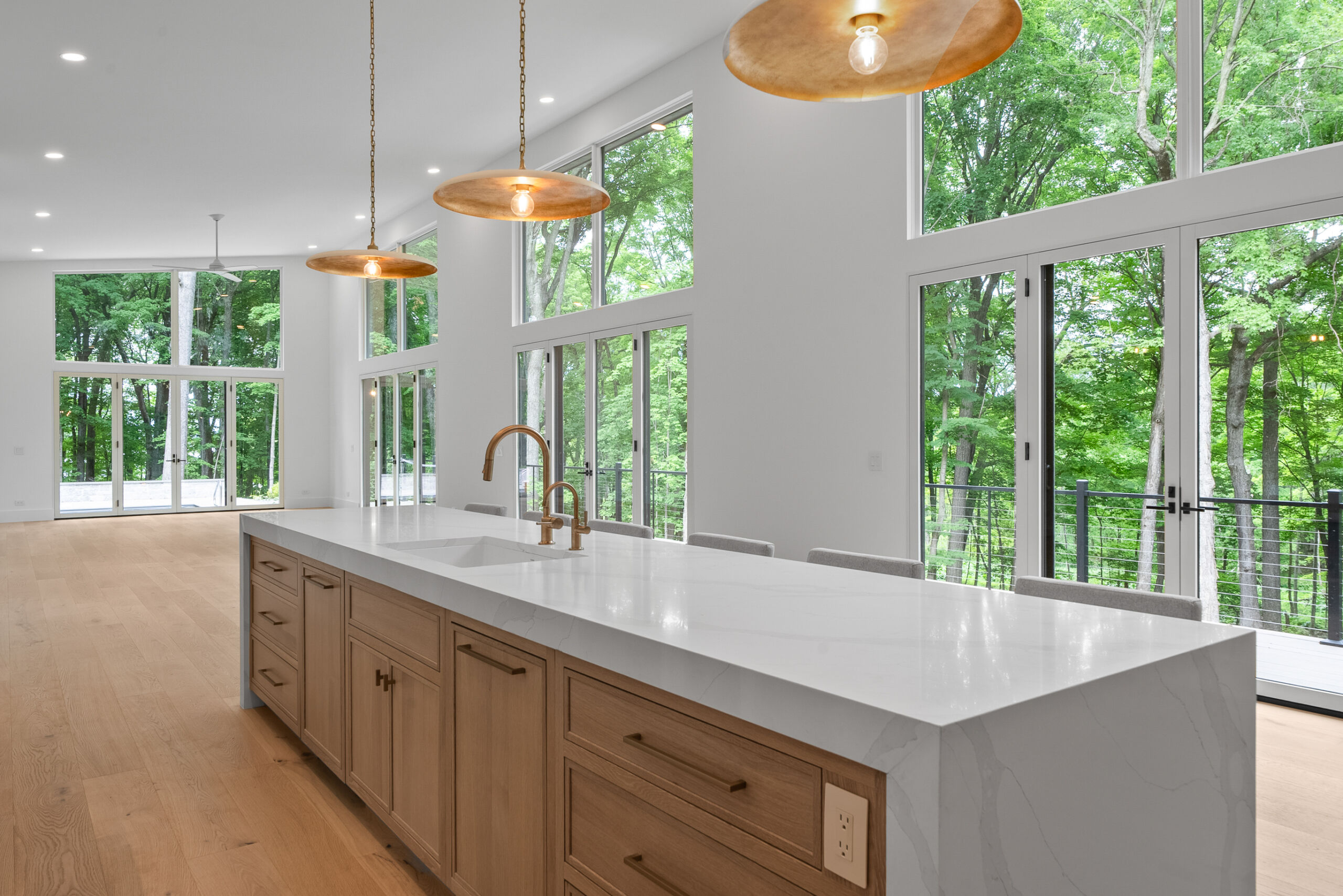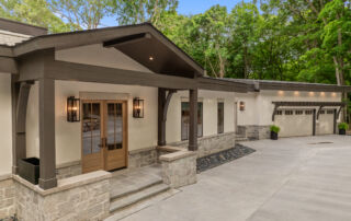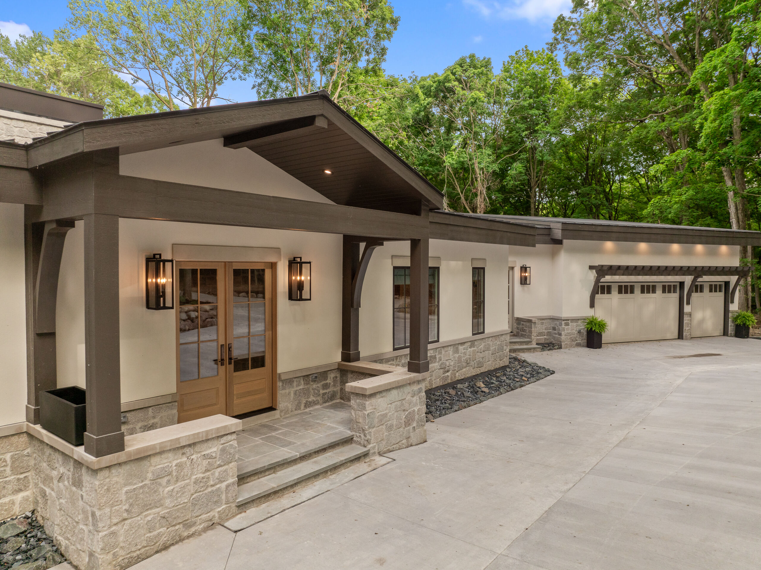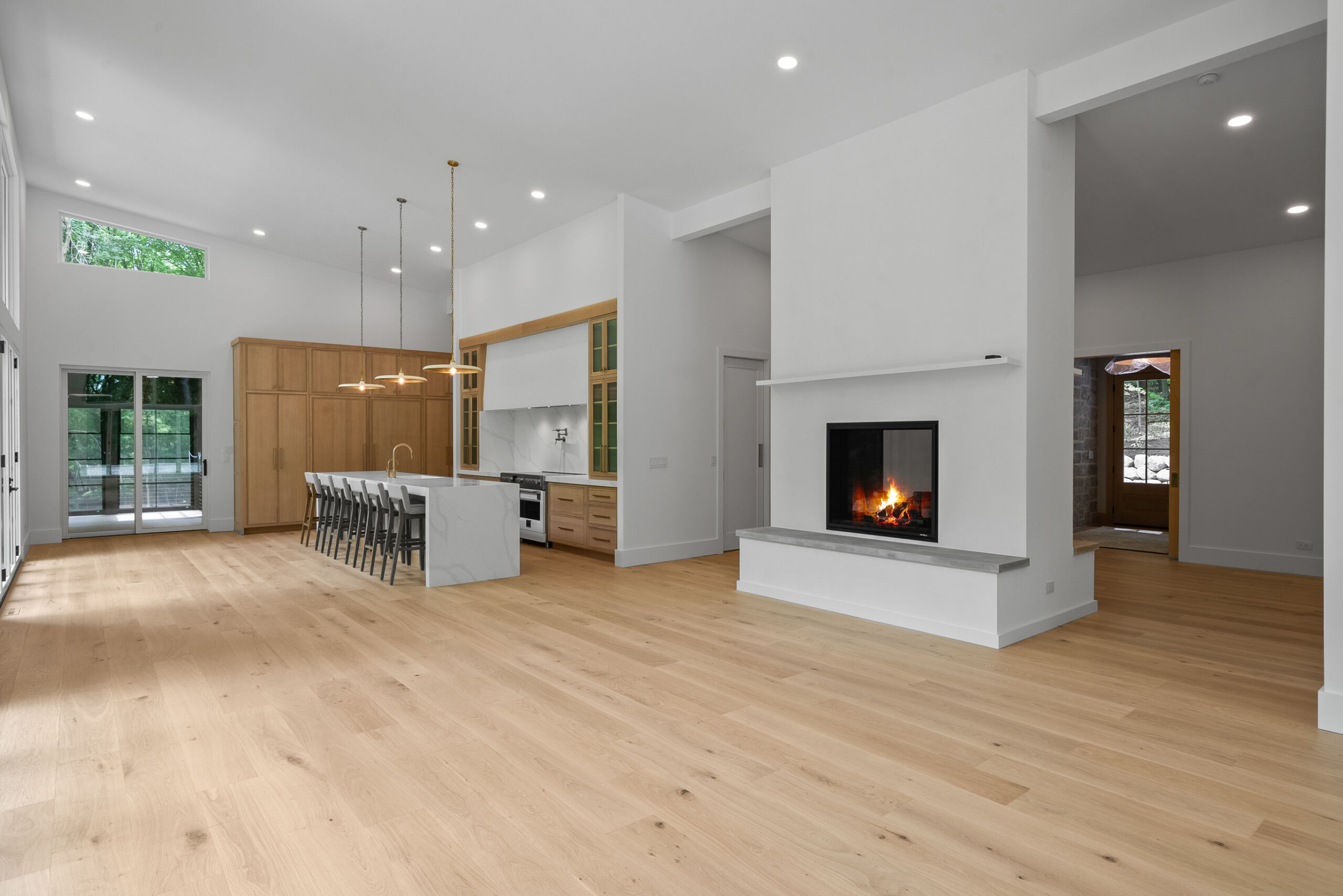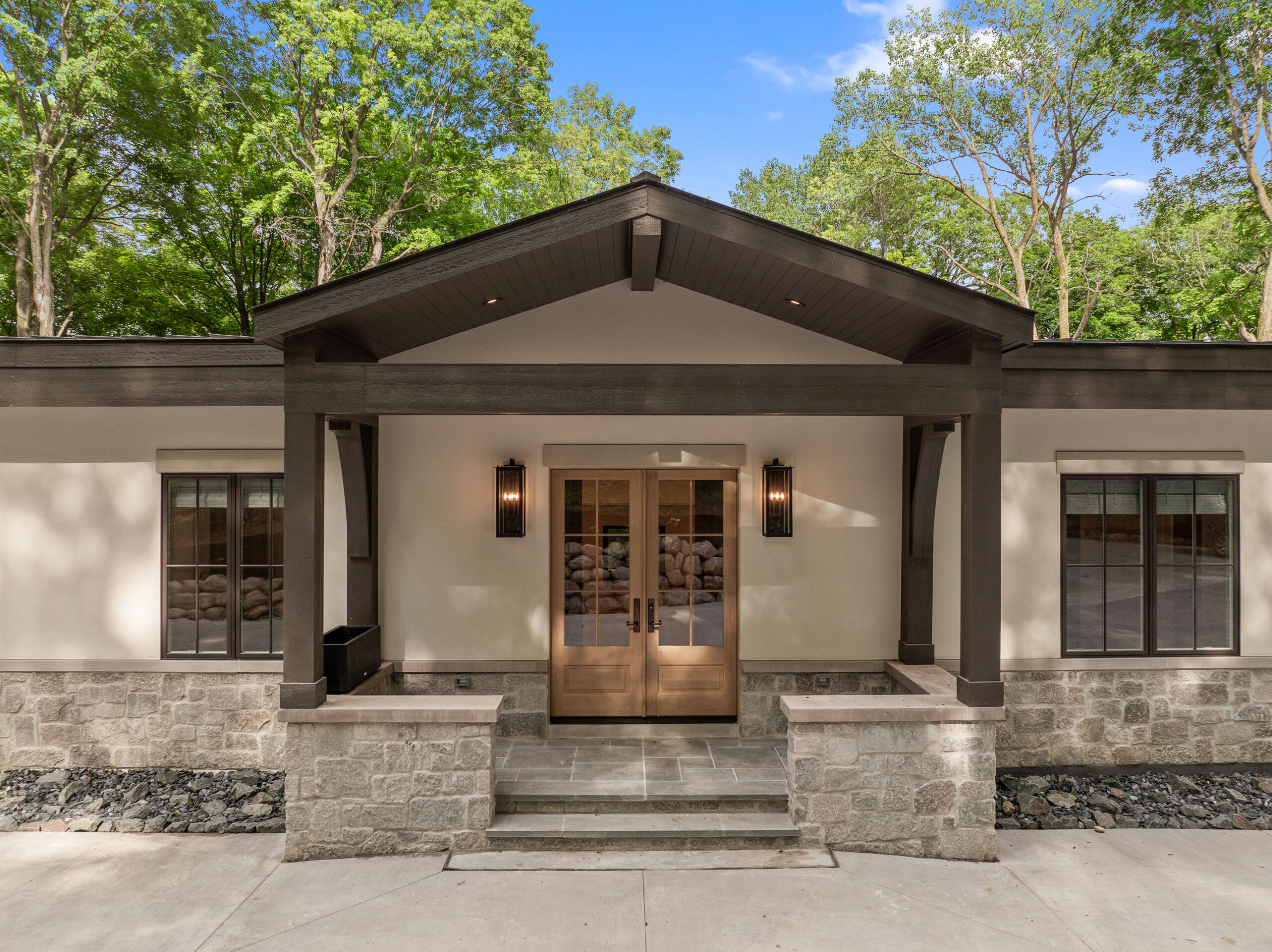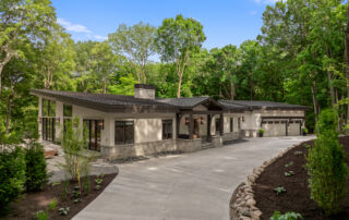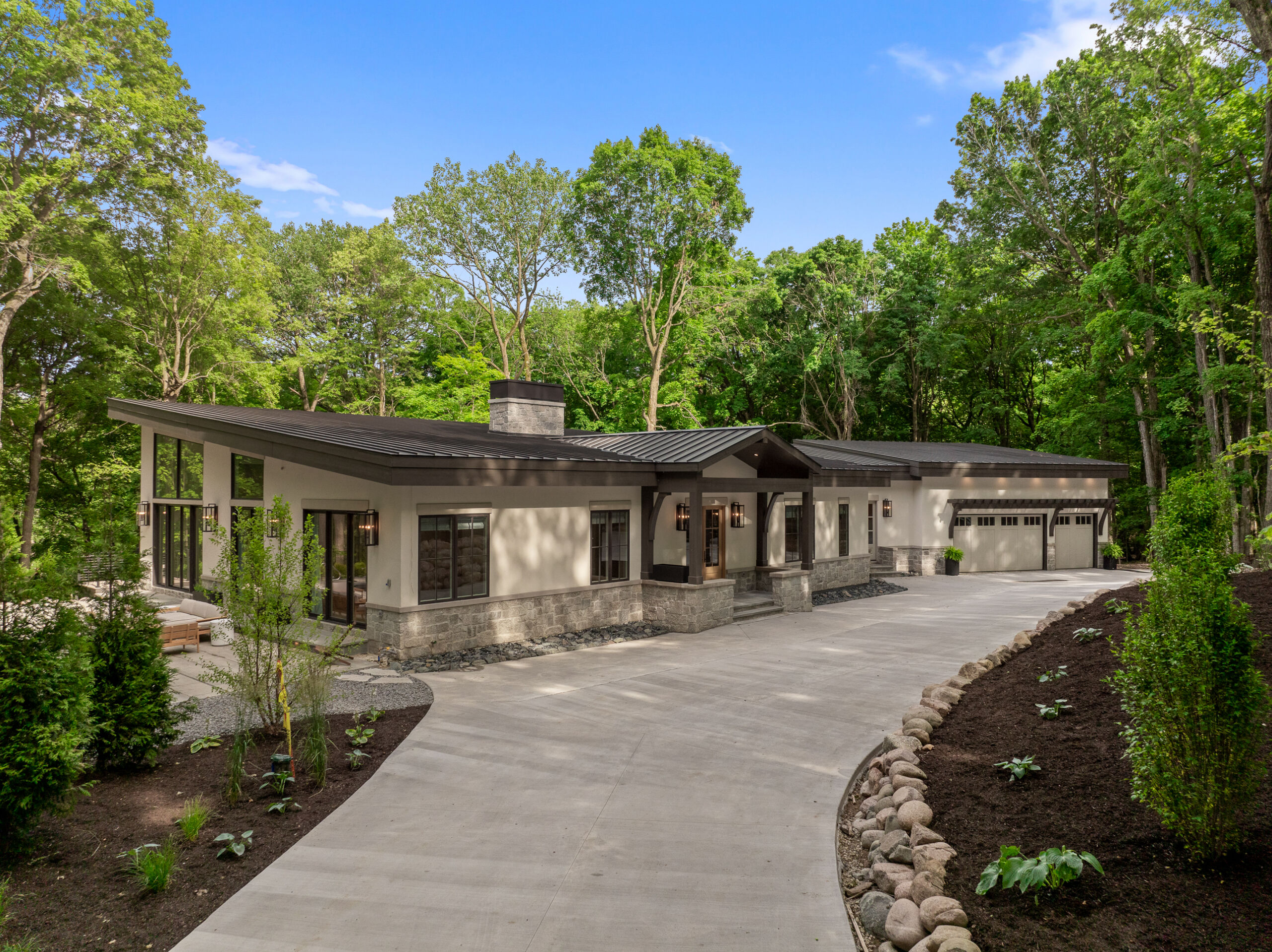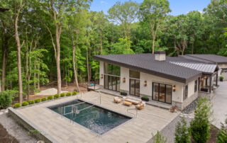 Matustik Builders collaborated with homeowners in Fontana, Wisconsin to design an amazing custom built home that perfectly complements its wooded surroundings. The home features a striking metal roof with stone and stucco finishes. Inside, the spacious great room showcases a gourmet kitchen with a large island and floor-to-ceiling windows, offering stunning views of the woods. A two-sided fireplace connects the entryway and living space, creating a warm, inviting atmosphere. The three-season room, equipped with ceiling heaters, allows for year-round enjoyment of the outdoors. Luxurious bathrooms boast solid surface countertops and floating vanities, while the outdoor pool area offers the perfect spot for family and guests to relax.