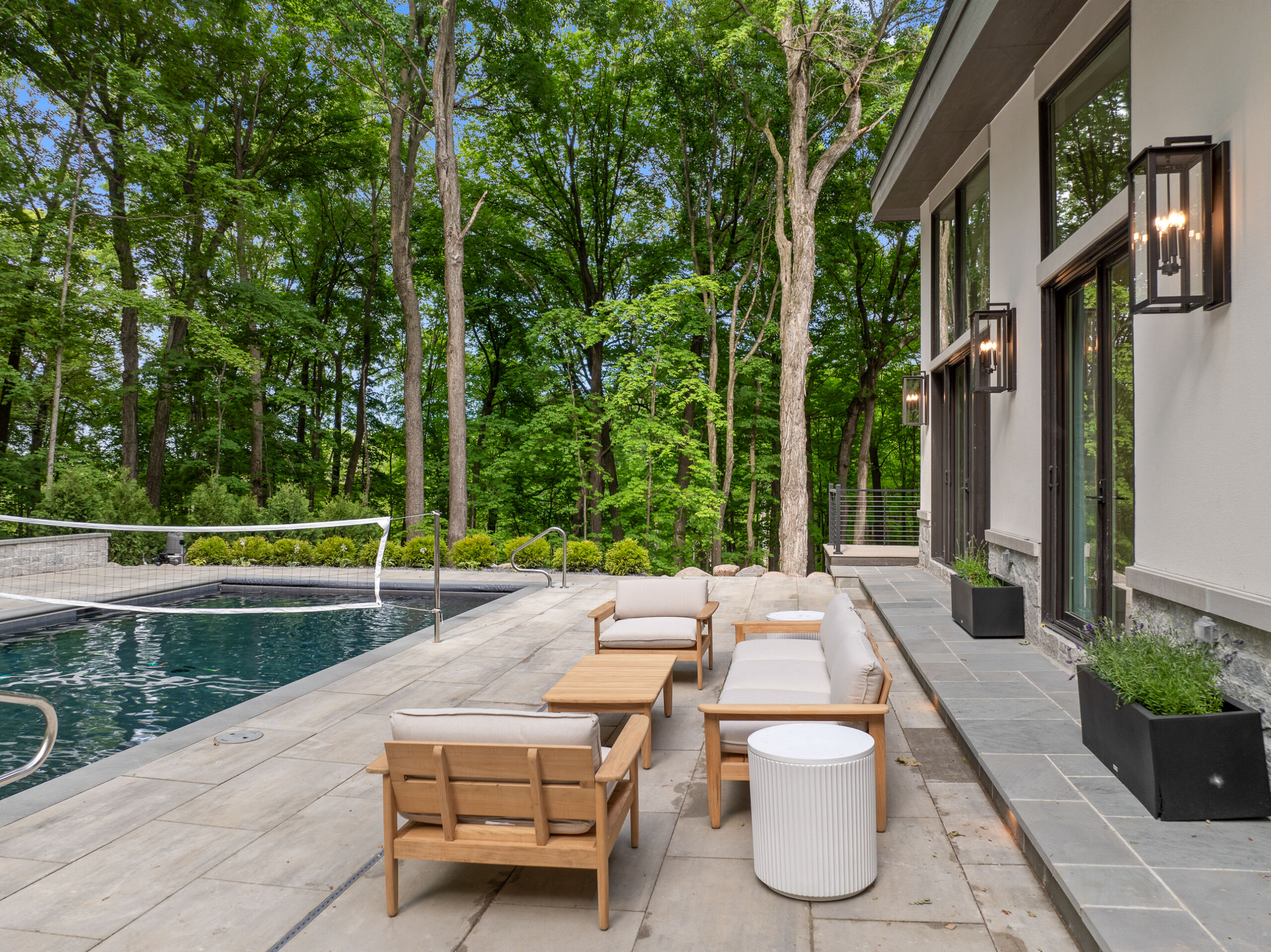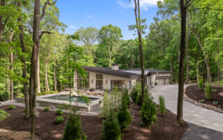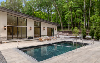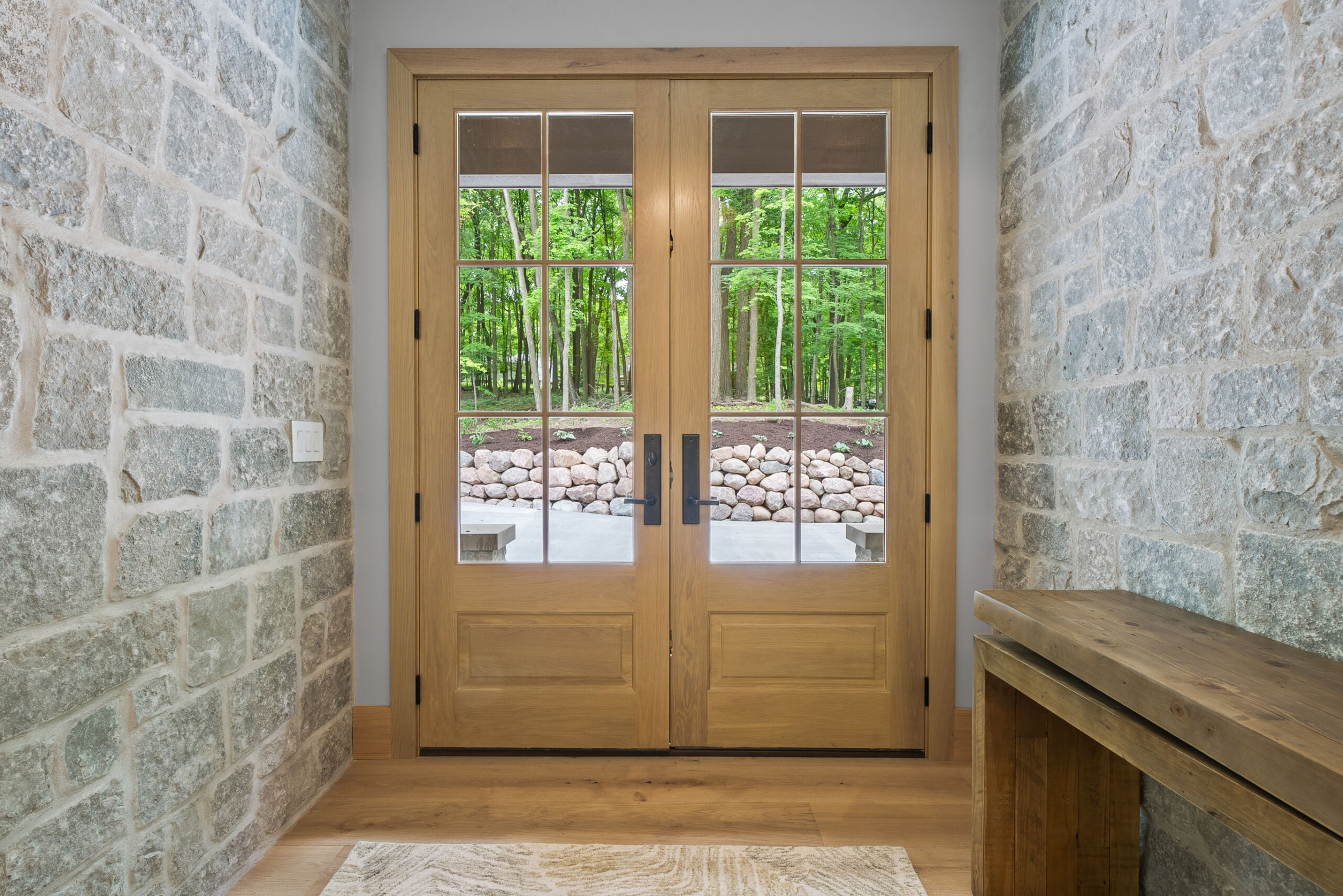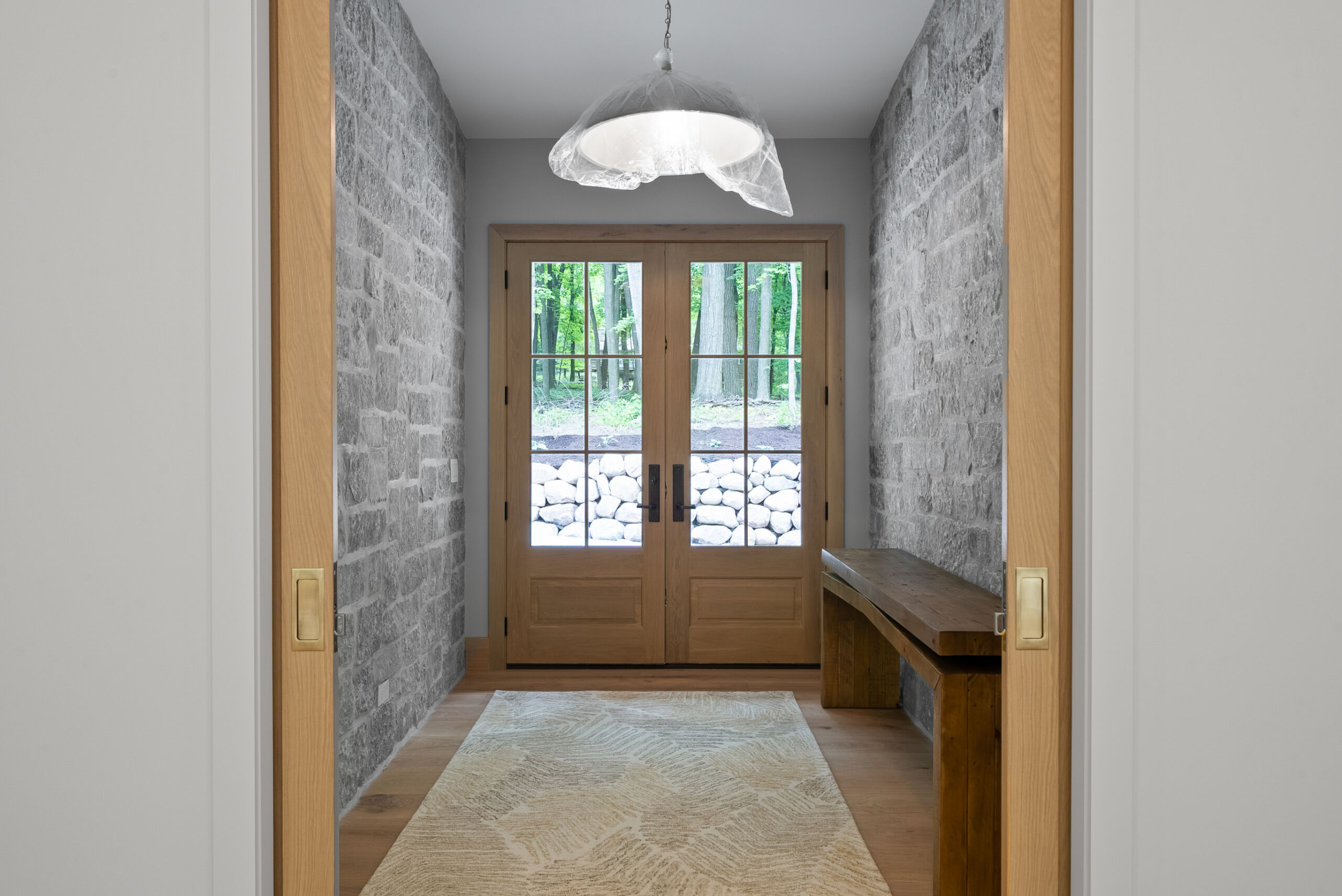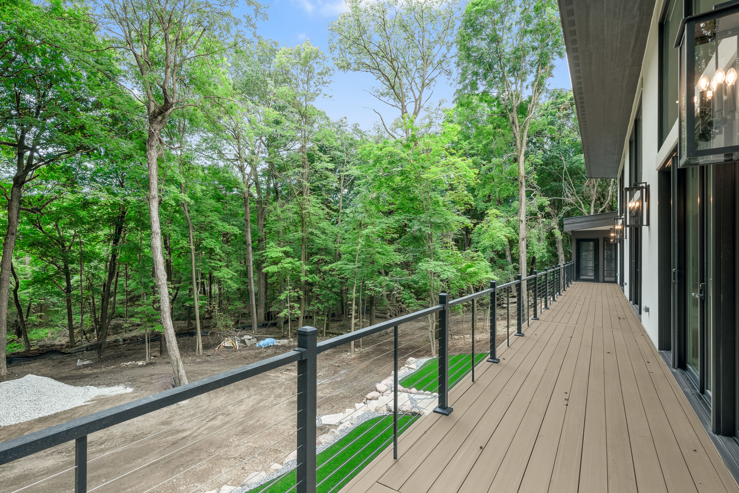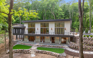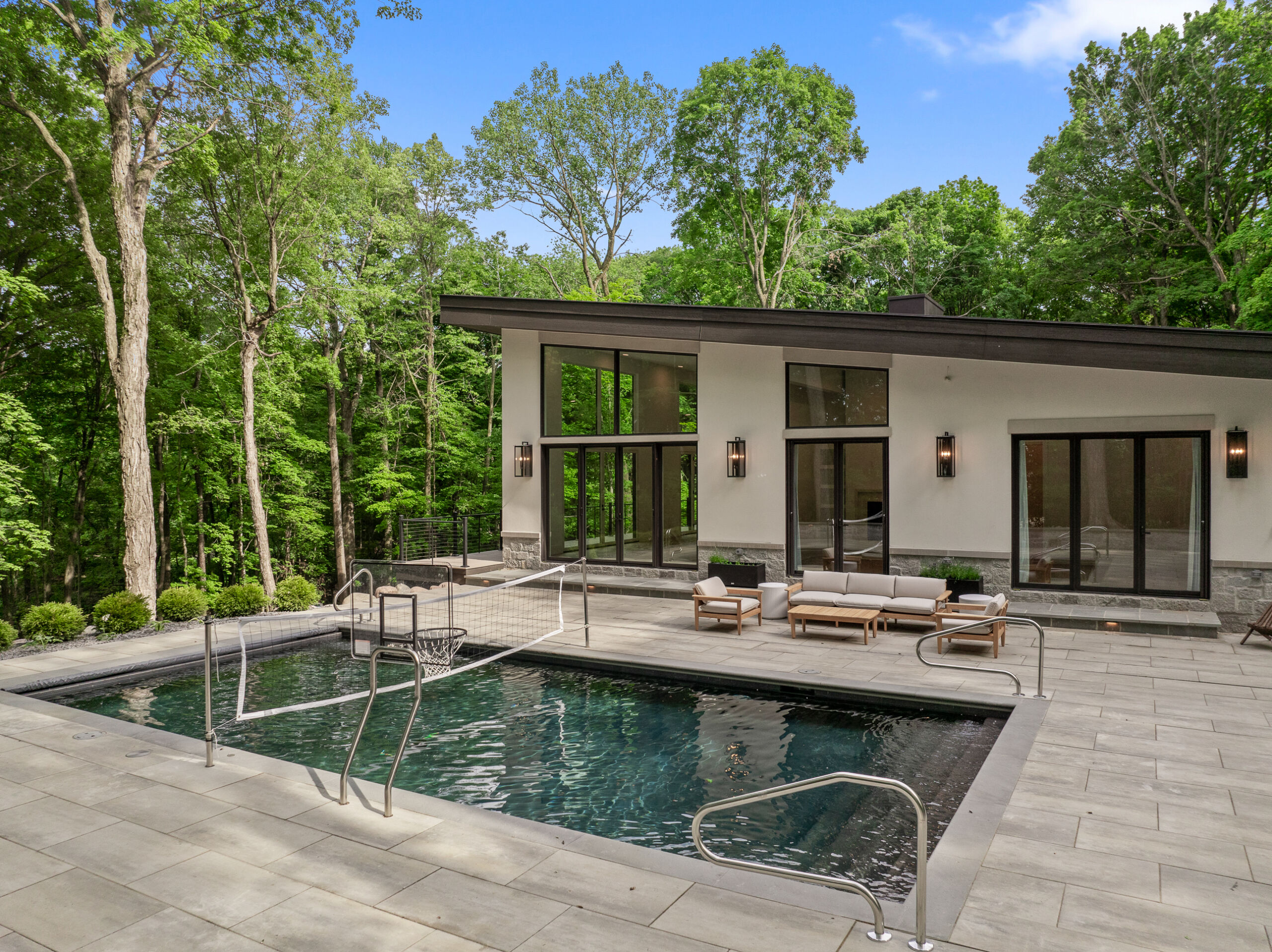 Matustik Builders collaborated with homeowners in Fontana, Wisconsin to design an amazing custom built home that perfectly complements its wooded surroundings. The home features a striking metal roof with stone and stucco finishes. Inside, the spacious great room showcases a gourmet kitchen with a large island and floor-to-ceiling windows, offering stunning views of the woods. A two-sided fireplace connects the entryway and living space, creating a warm, inviting atmosphere. The three-season room, equipped with ceiling heaters, allows for year-round enjoyment of the outdoors. Luxurious bathrooms boast solid surface countertops and floating vanities, while the outdoor pool area offers the perfect spot for family and guests to relax.