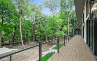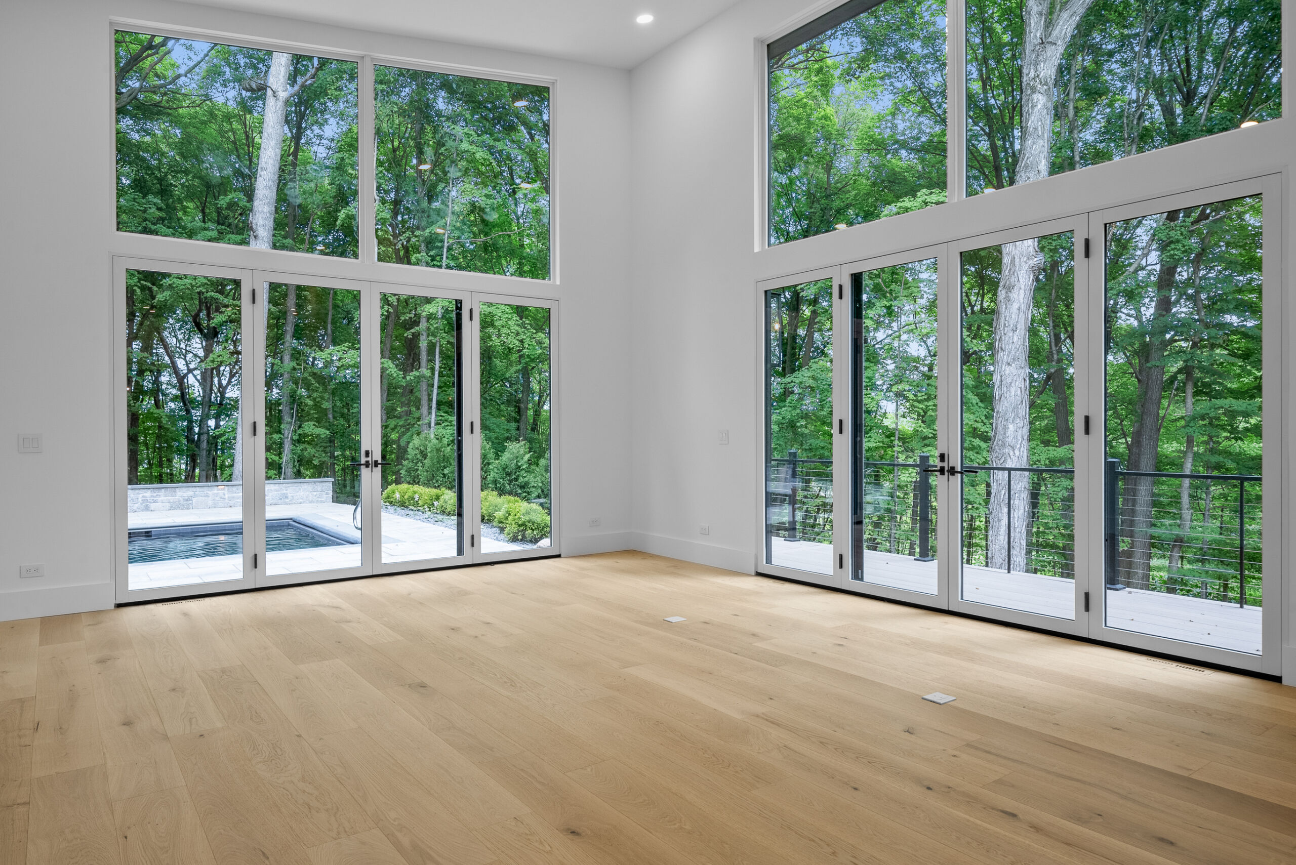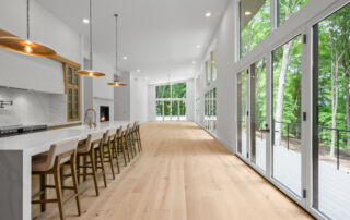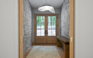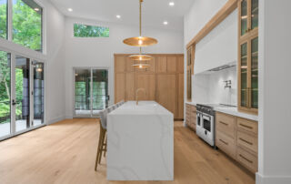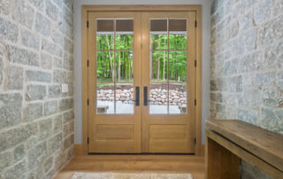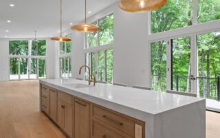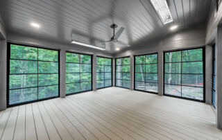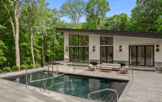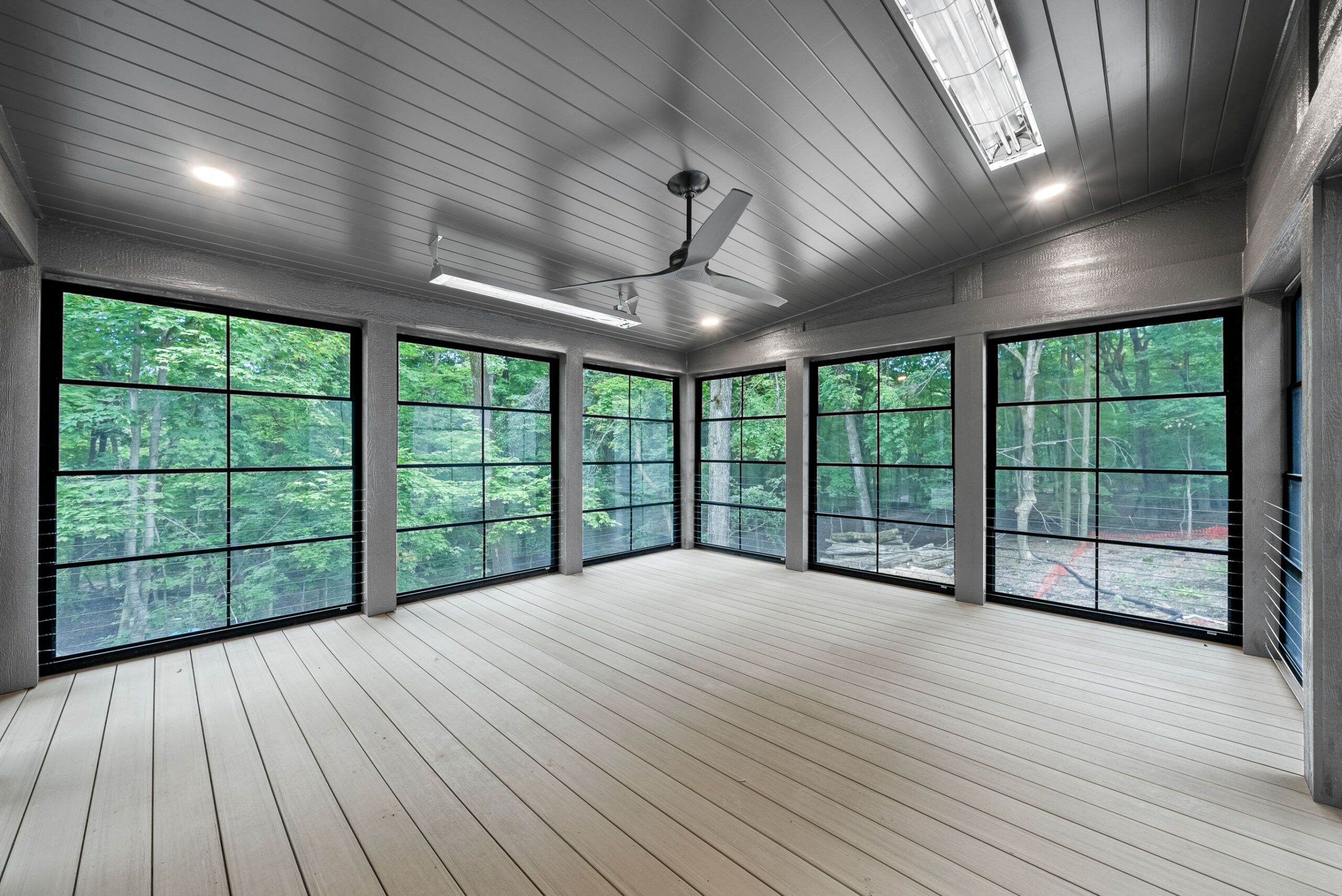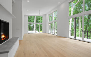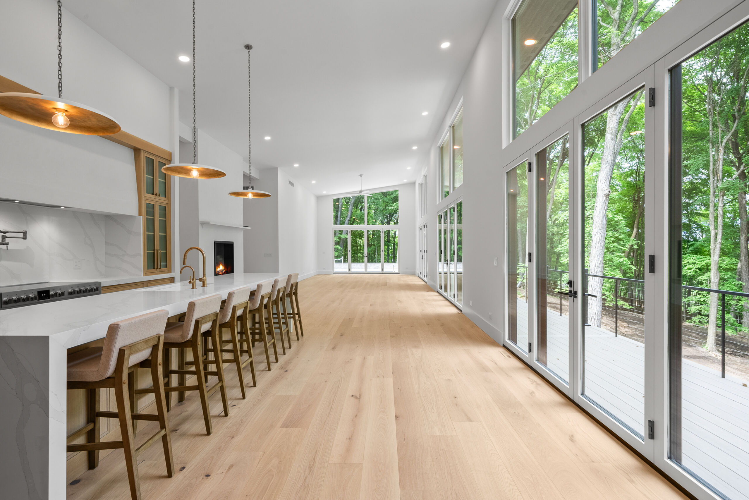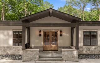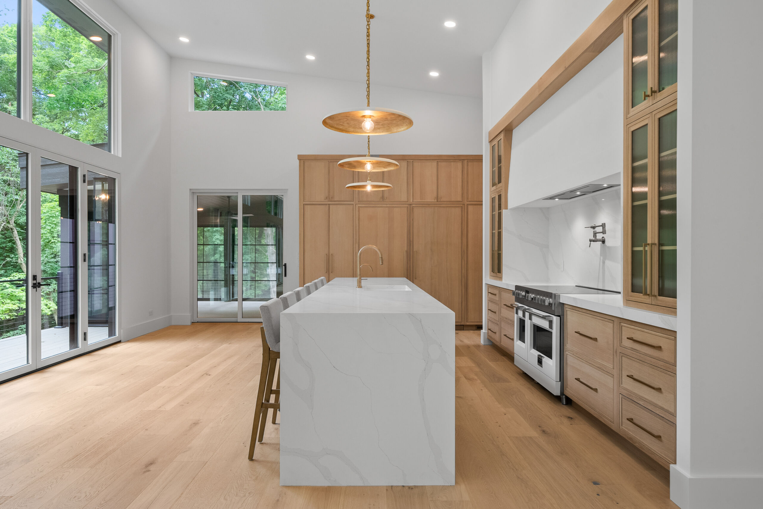 Matustik Builders collaborated with homeowners in Fontana, Wisconsin to design an amazing custom built home that perfectly complements its wooded surroundings. The home features a striking metal roof with stone and stucco finishes. Inside, the spacious great room showcases a gourmet kitchen with a large island and floor-to-ceiling windows, offering stunning views of the woods. A two-sided fireplace connects the entryway and living space, creating a warm, inviting atmosphere. The three-season room, equipped with ceiling heaters, allows for year-round enjoyment of the outdoors. Luxurious bathrooms boast solid surface countertops and floating vanities, while the outdoor pool area offers the perfect spot for family and guests to relax.