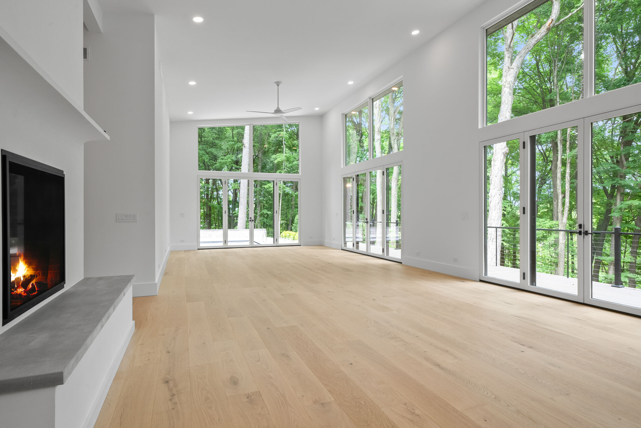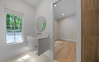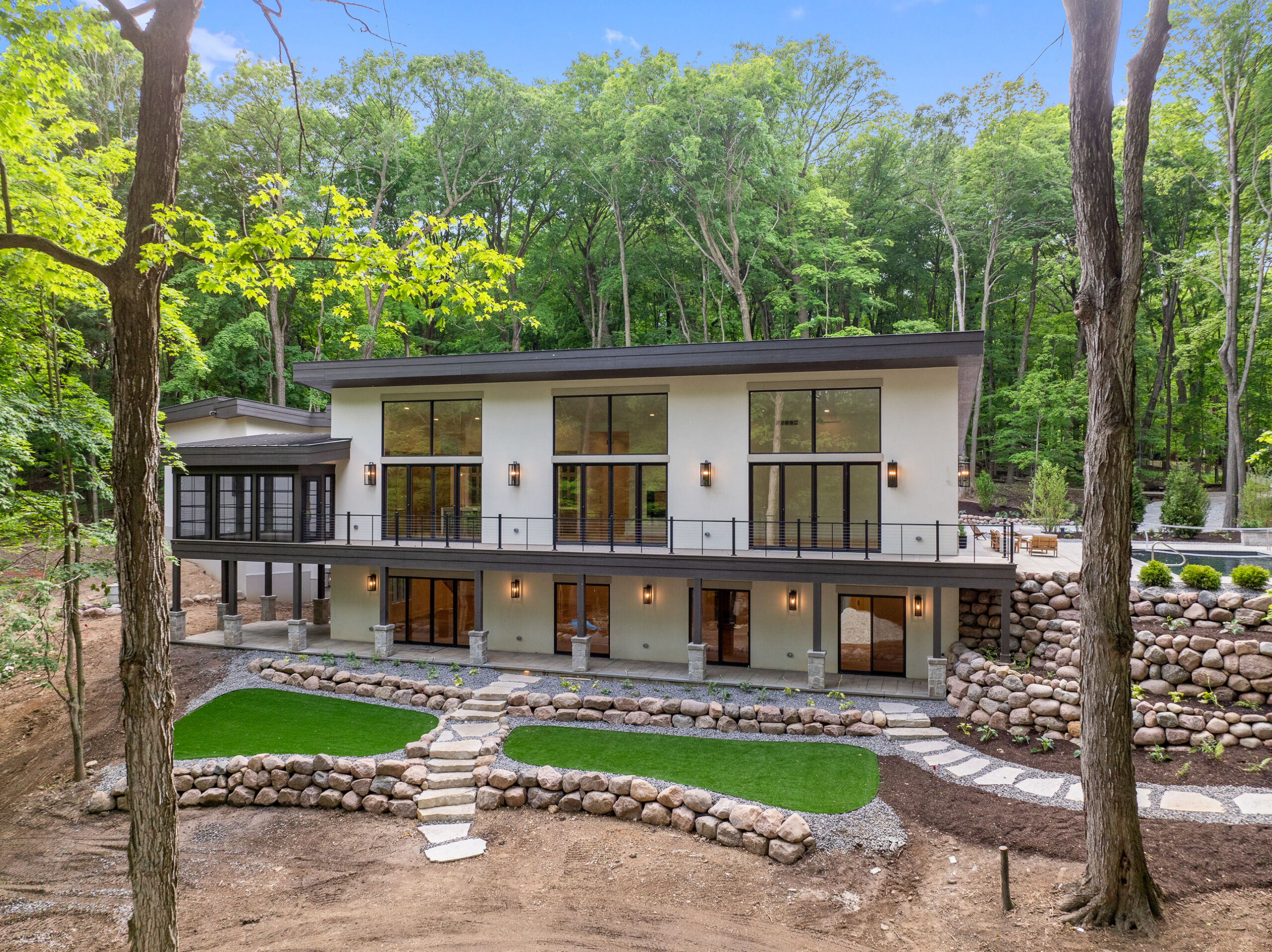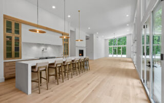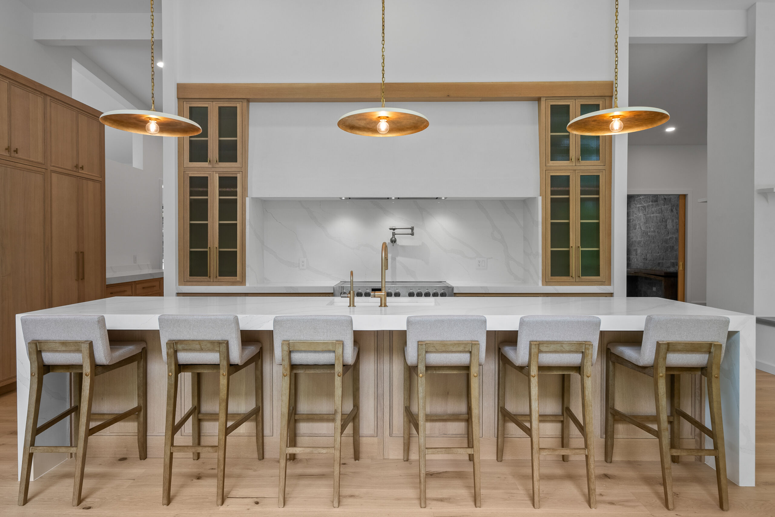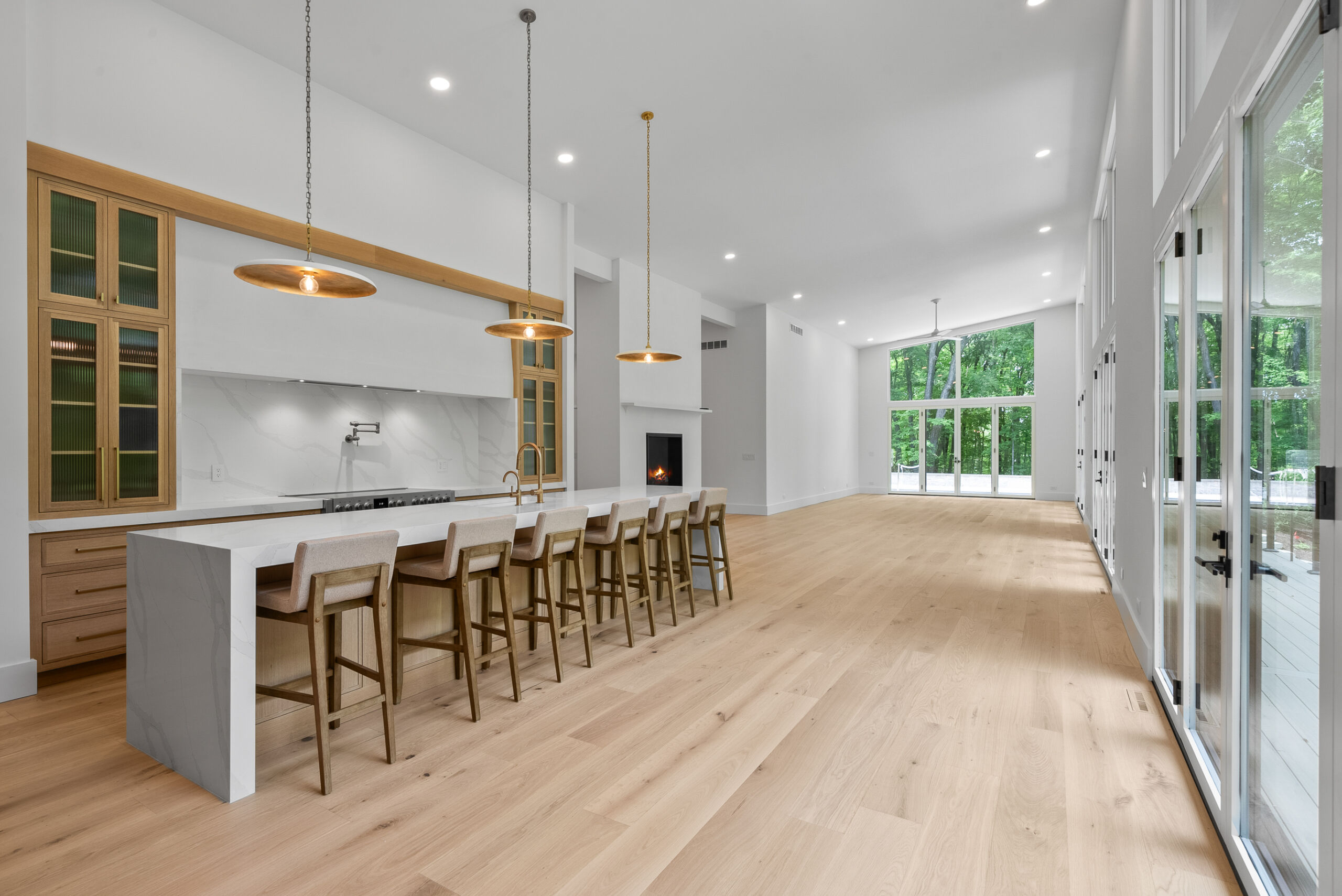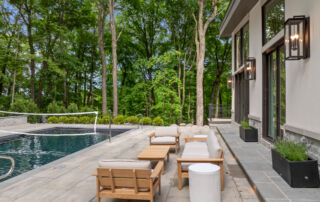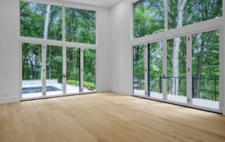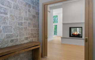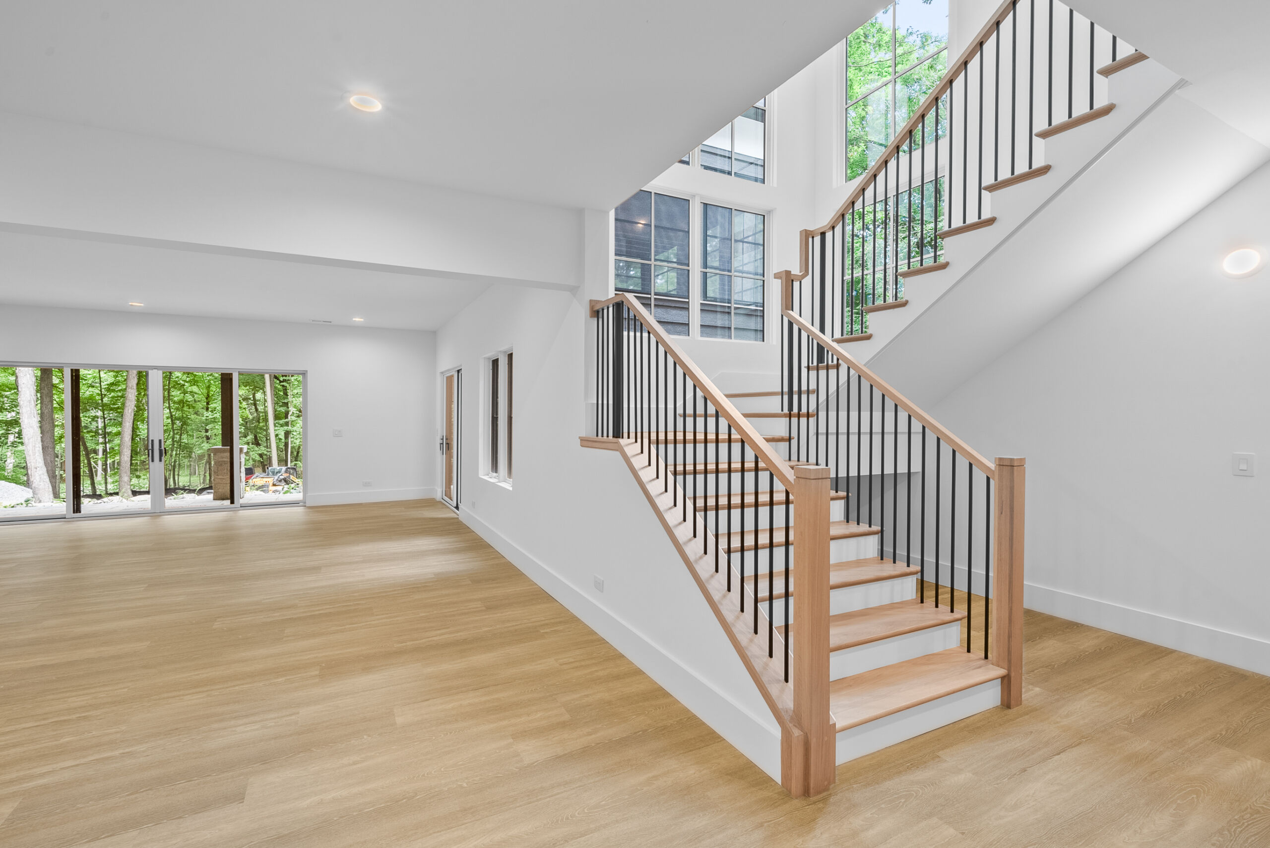 Matustik Builders collaborated with homeowners in Fontana, Wisconsin to design an amazing custom built home that perfectly complements its wooded surroundings. The home features a striking metal roof with stone and stucco finishes. Inside, the spacious great room showcases a gourmet kitchen with a large island and floor-to-ceiling windows, offering stunning views of the woods. A two-sided fireplace connects the entryway and living space, creating a warm, inviting atmosphere. The three-season room, equipped with ceiling heaters, allows for year-round enjoyment of the outdoors. Luxurious bathrooms boast solid surface countertops and floating vanities, while the outdoor pool area offers the perfect spot for family and guests to relax.