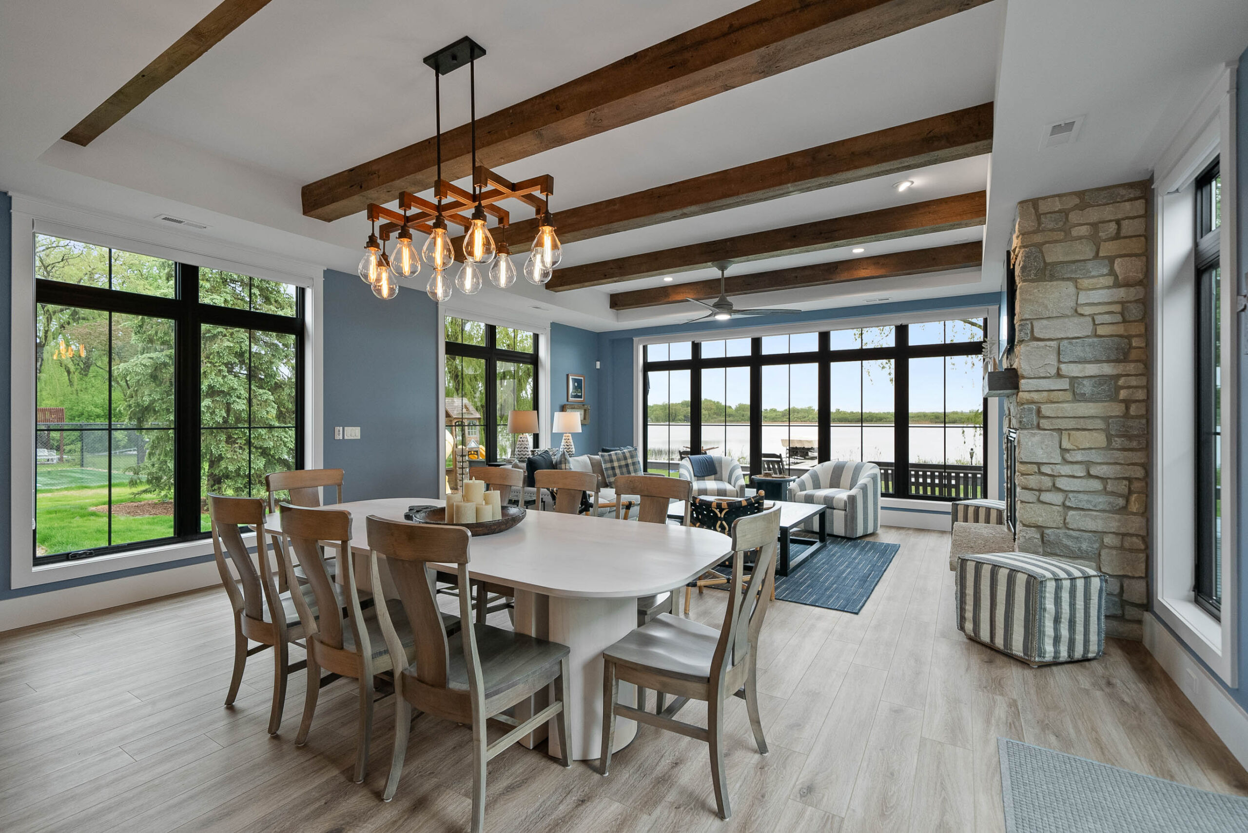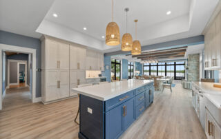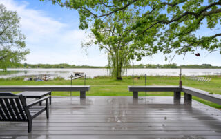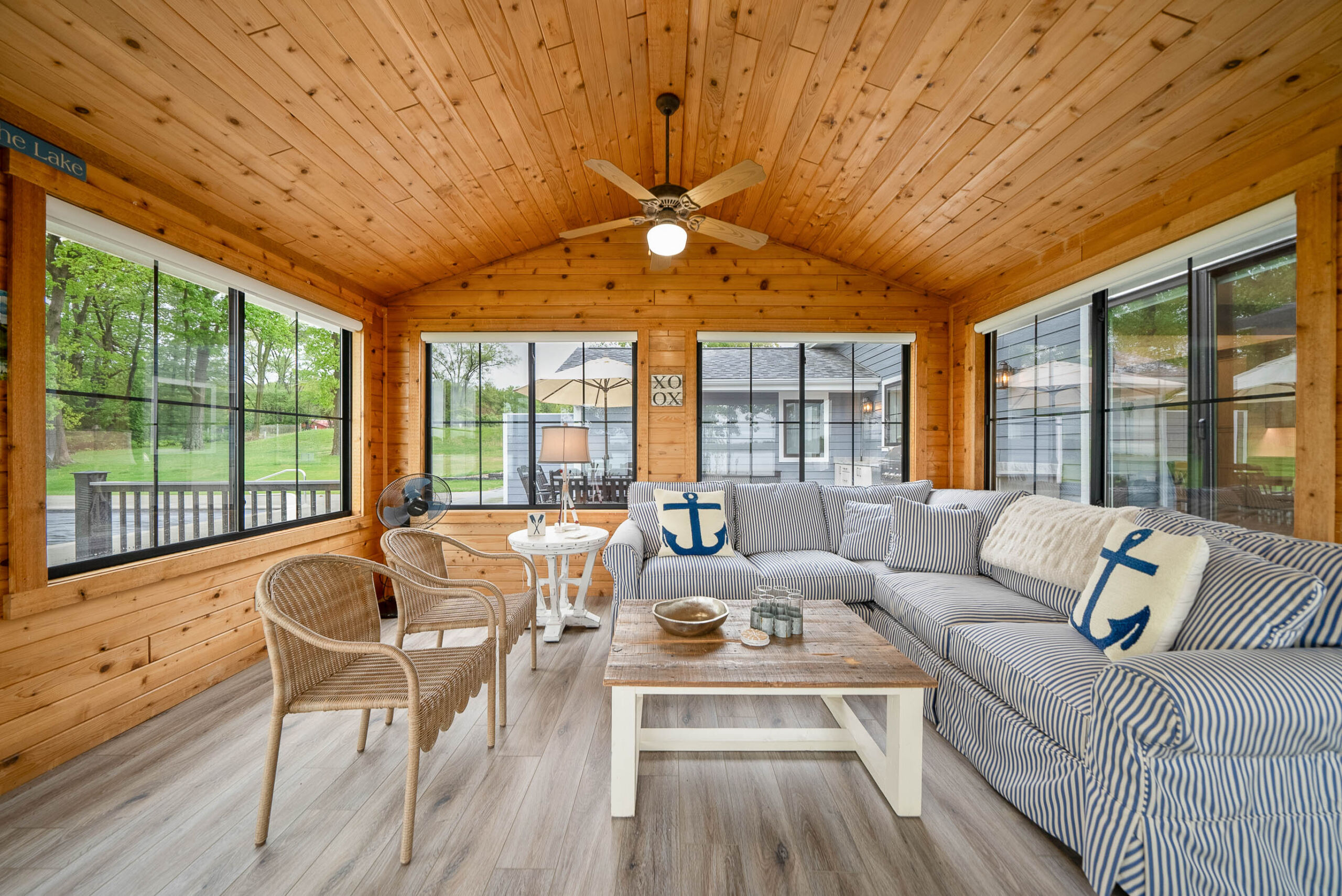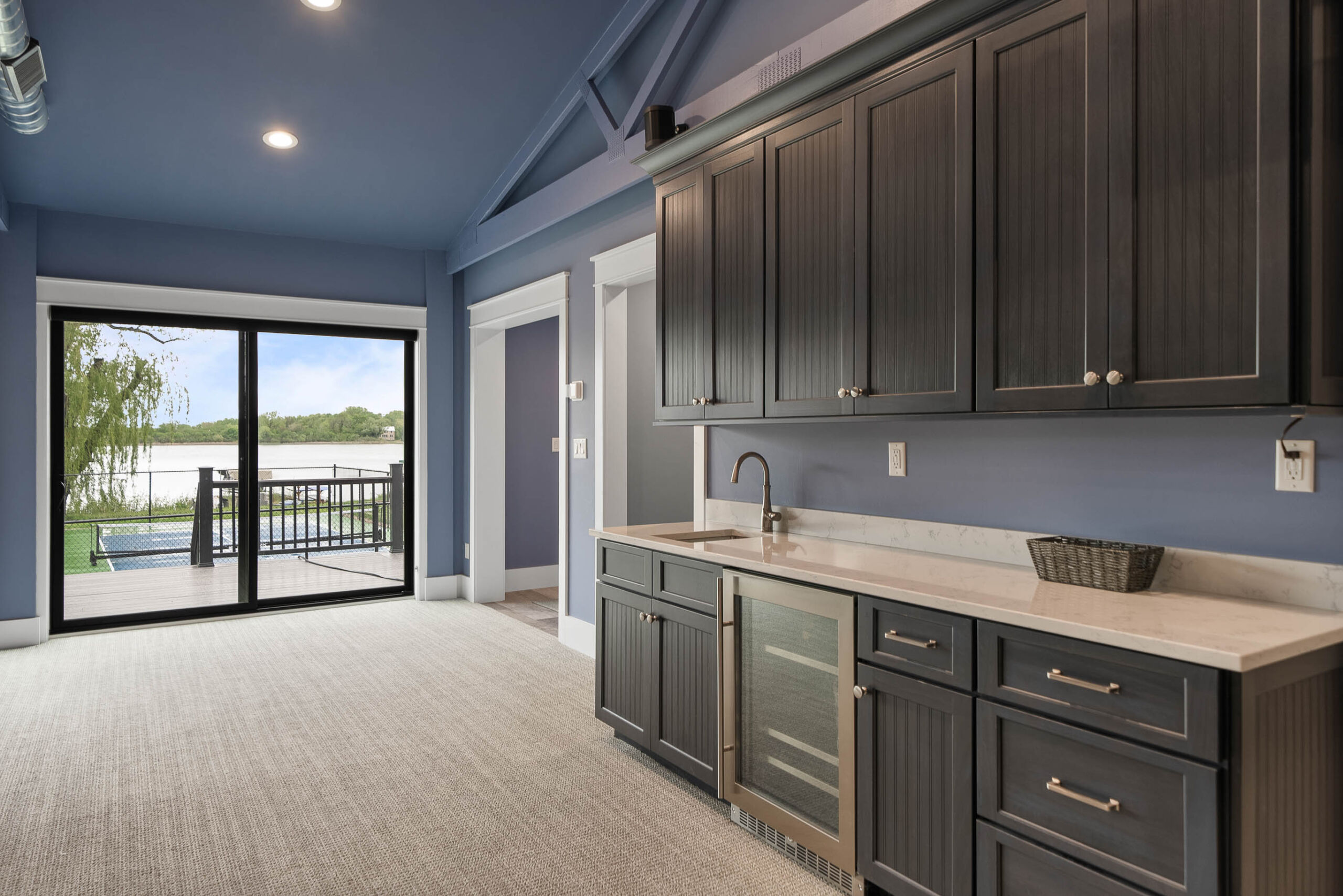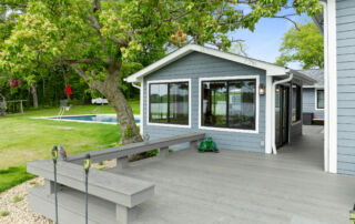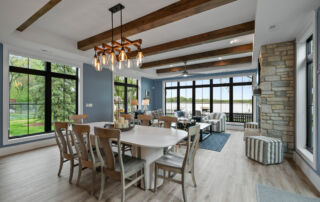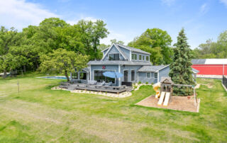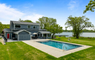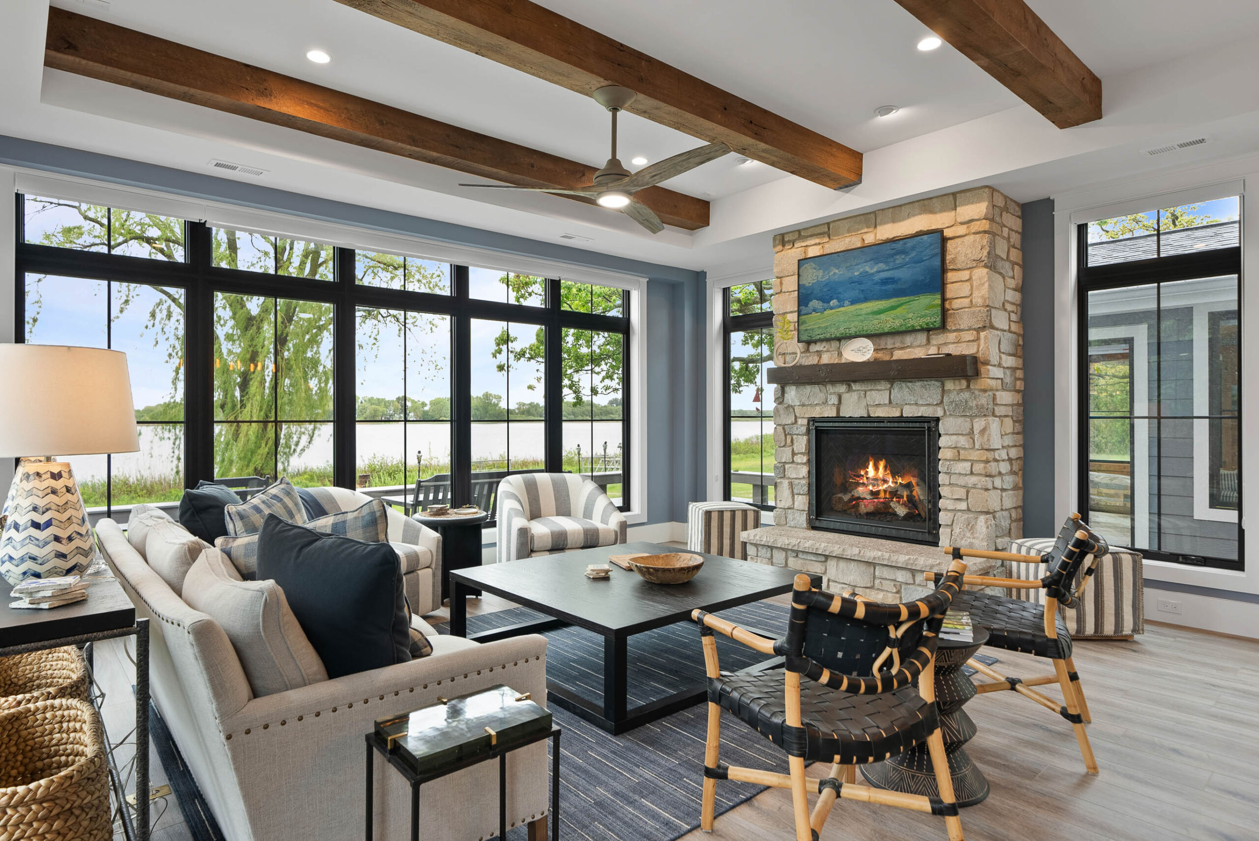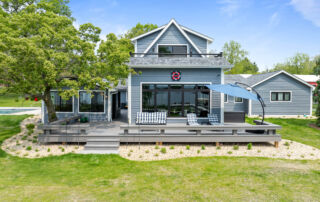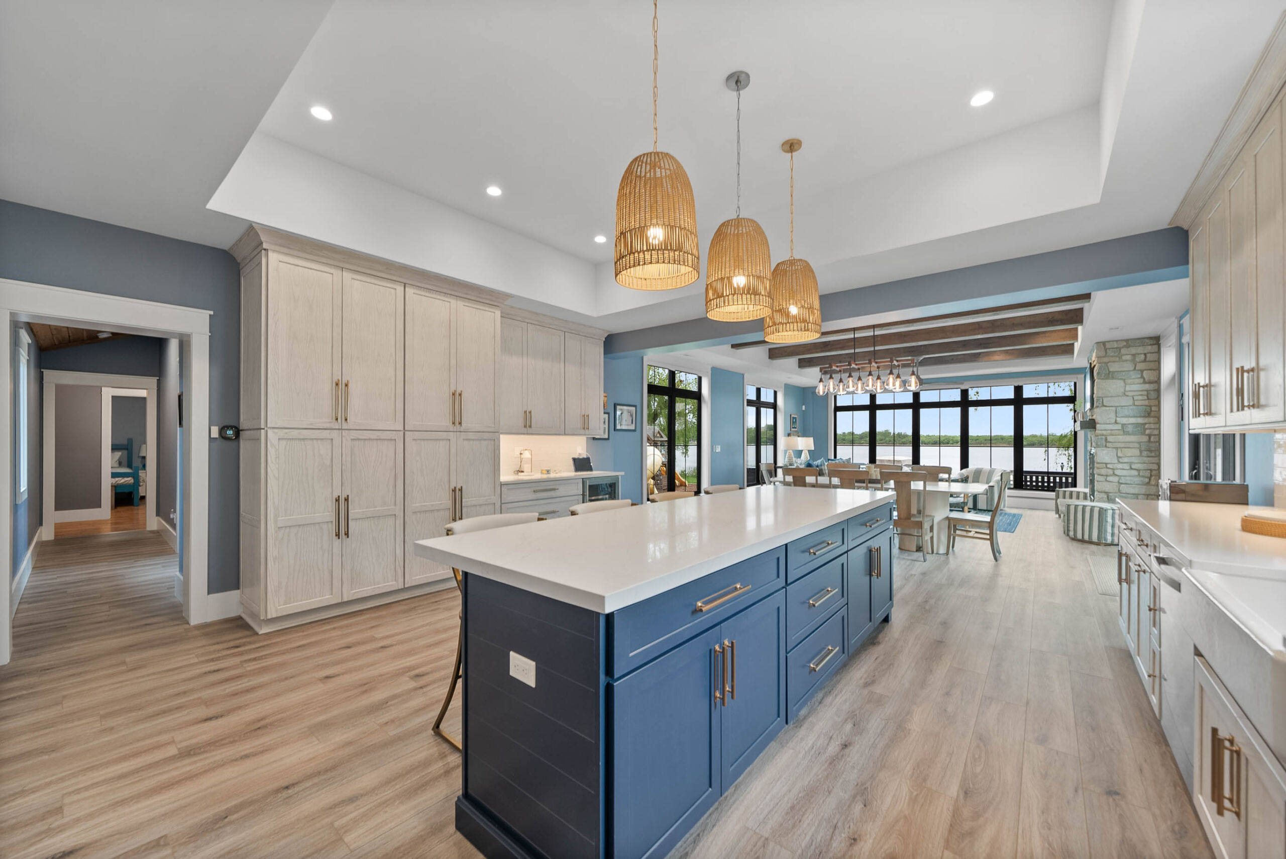 Matustik Builders transformed a dated residence in Turtle Lake, Wisconsin into a warm and inviting lakefront cottage designed with today’s modern amenities. The charming yet functional kitchen with high end details opens to the family room and showcases enhanced lake views, a striking stone fireplace, and exposed wood beams—an ideal setting for gatherings. A knotty pine three-season room adds a rustic touch, creating a serene retreat overlooking the property.