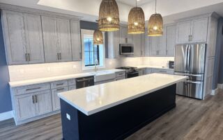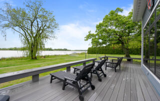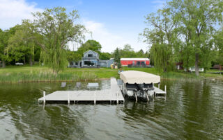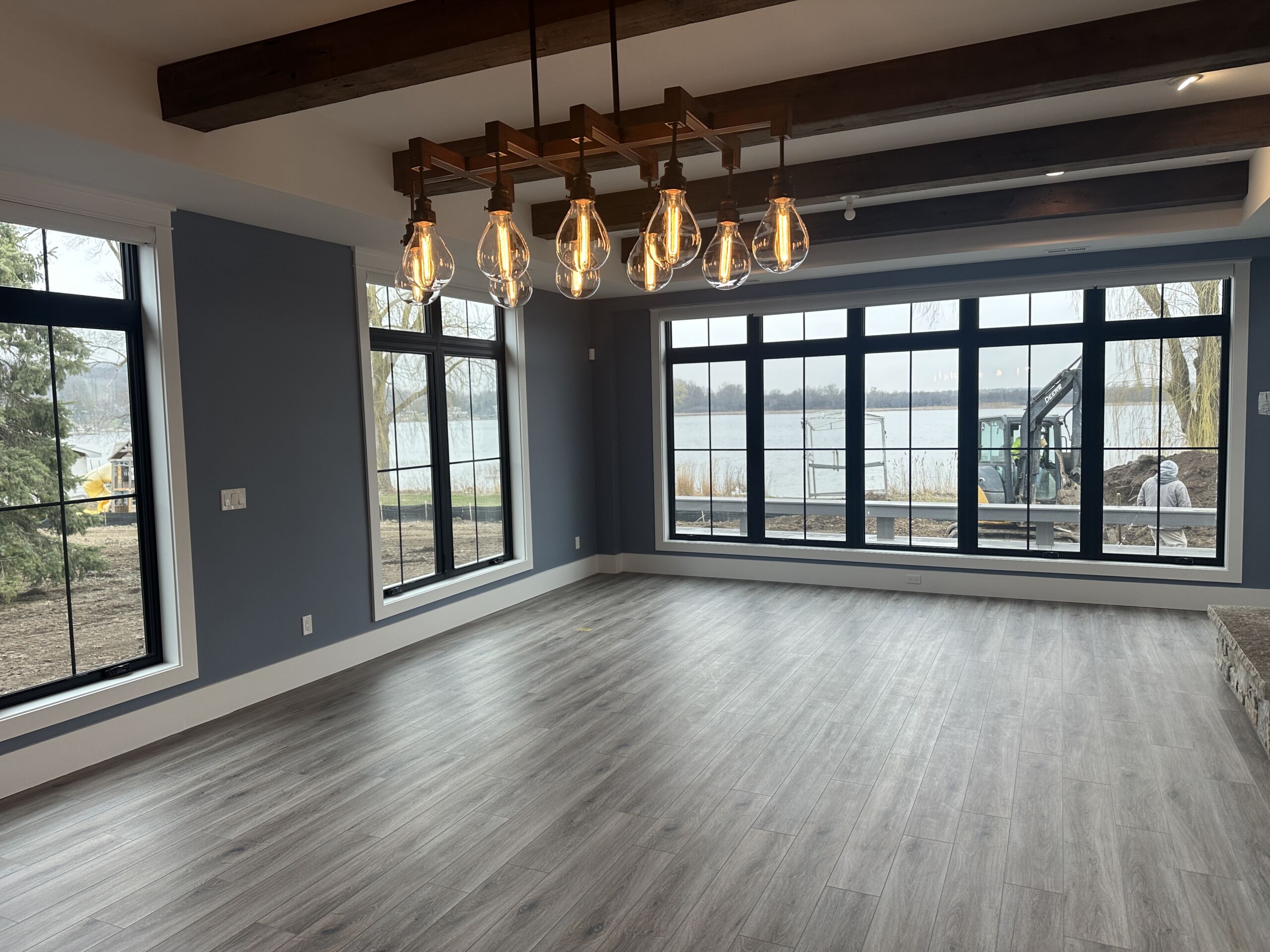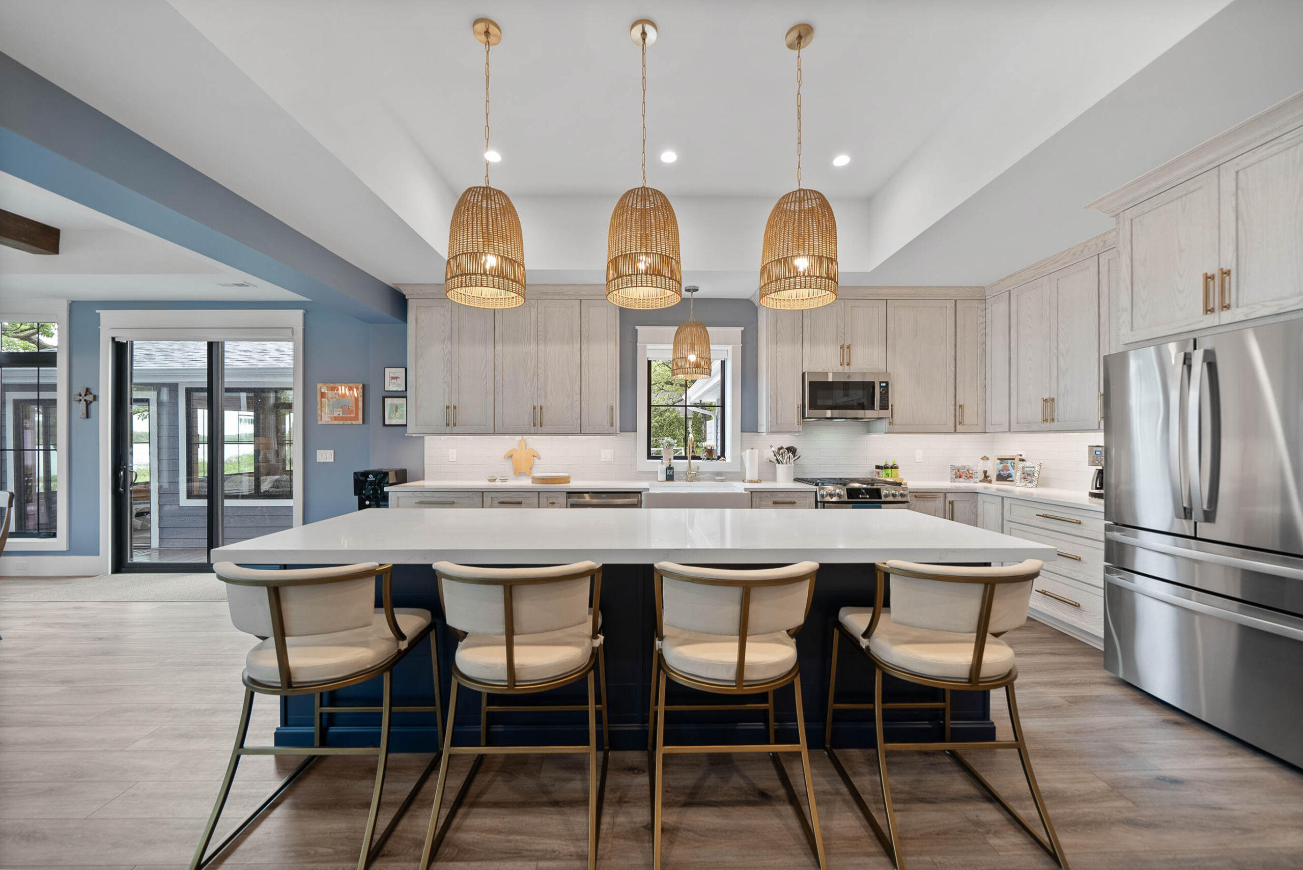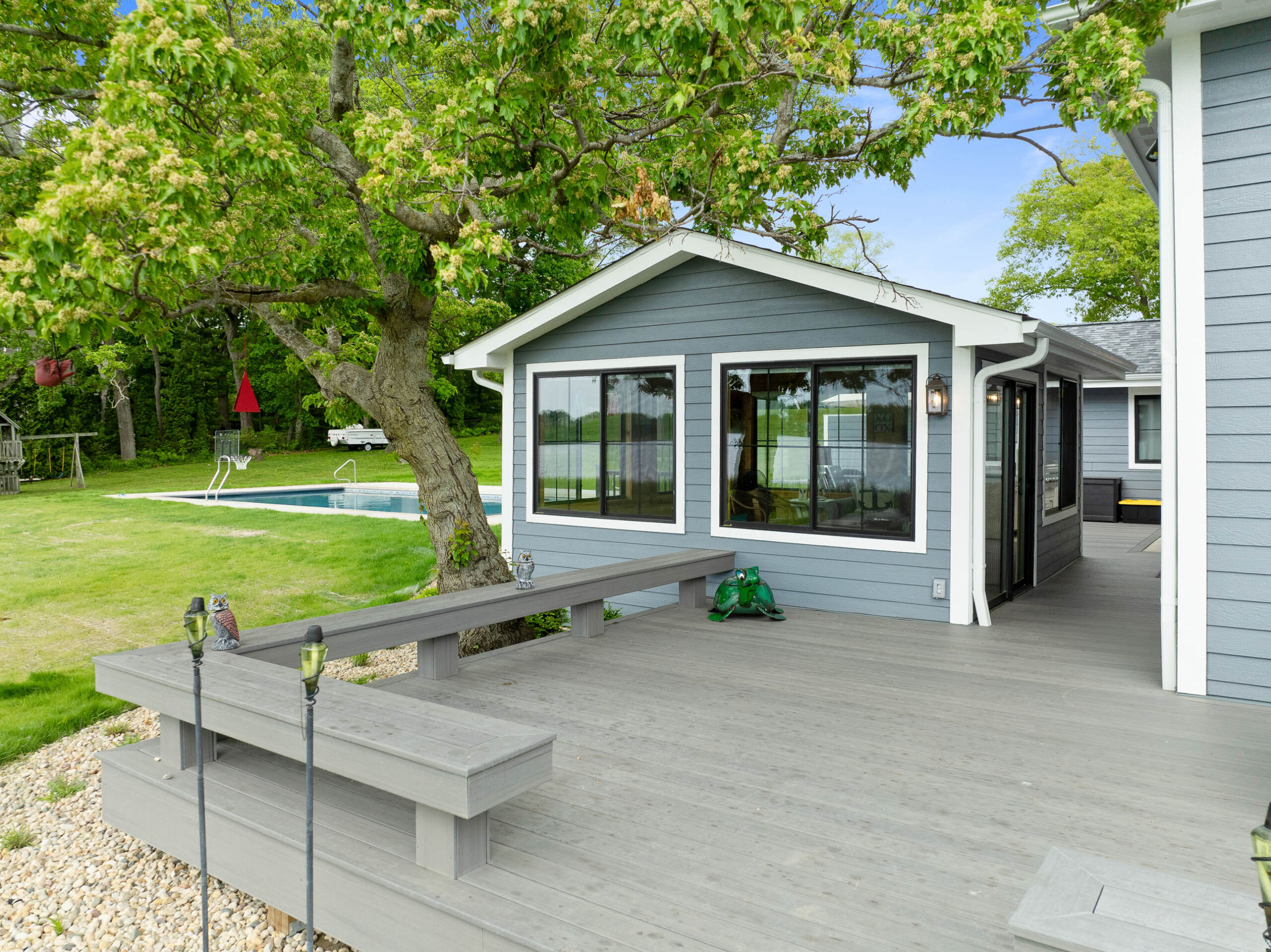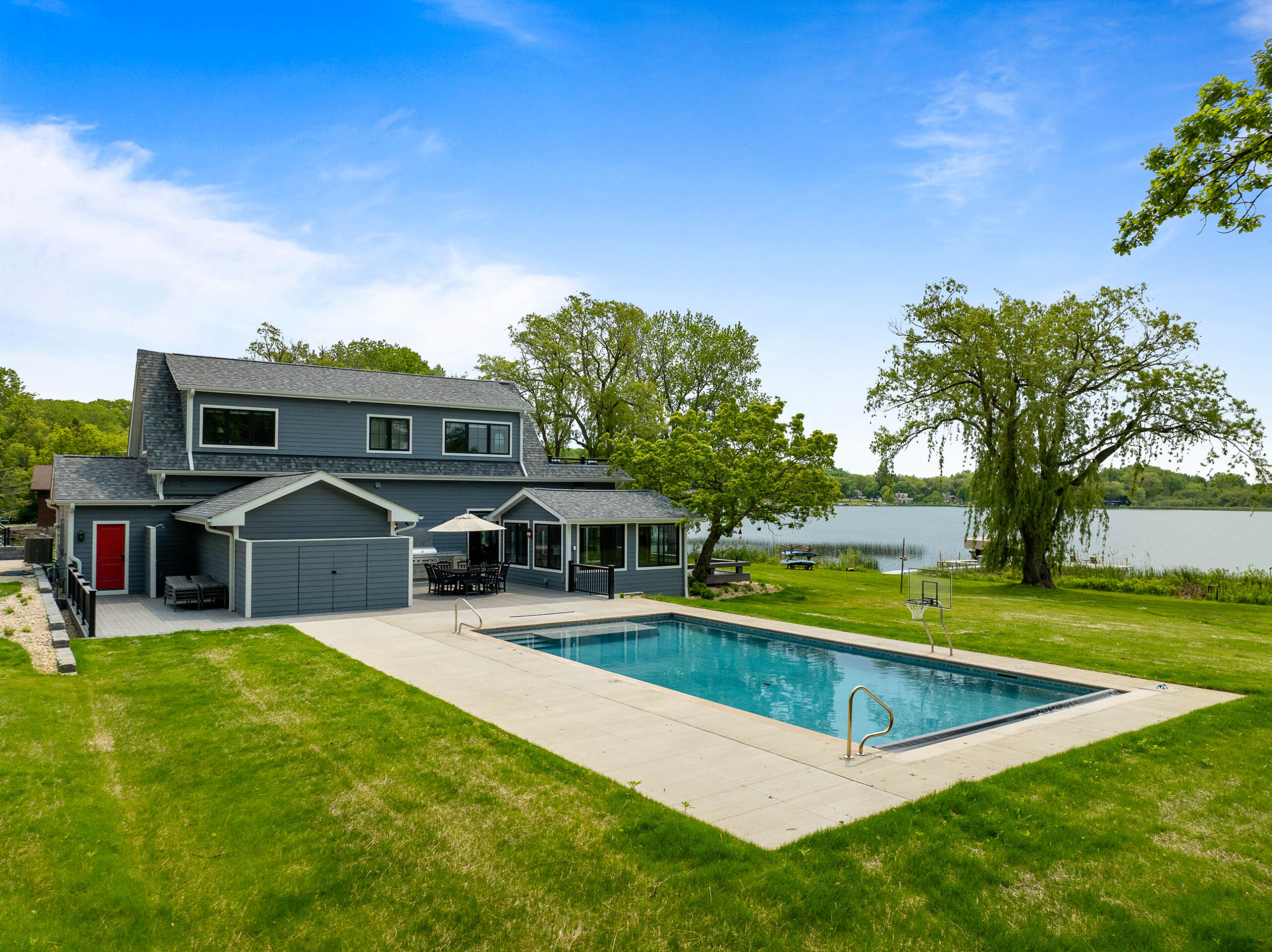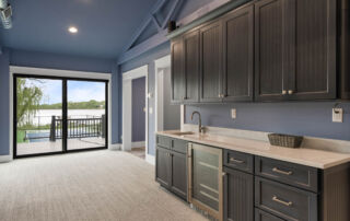 Matustik Builders transformed a dated residence in Turtle Lake, Wisconsin into a warm and inviting lakefront cottage designed with today’s modern amenities. The charming yet functional kitchen with high end details opens to the family room and showcases enhanced lake views, a striking stone fireplace, and exposed wood beams—an ideal setting for gatherings. A knotty pine three-season room adds a rustic touch, creating a serene retreat overlooking the property.
