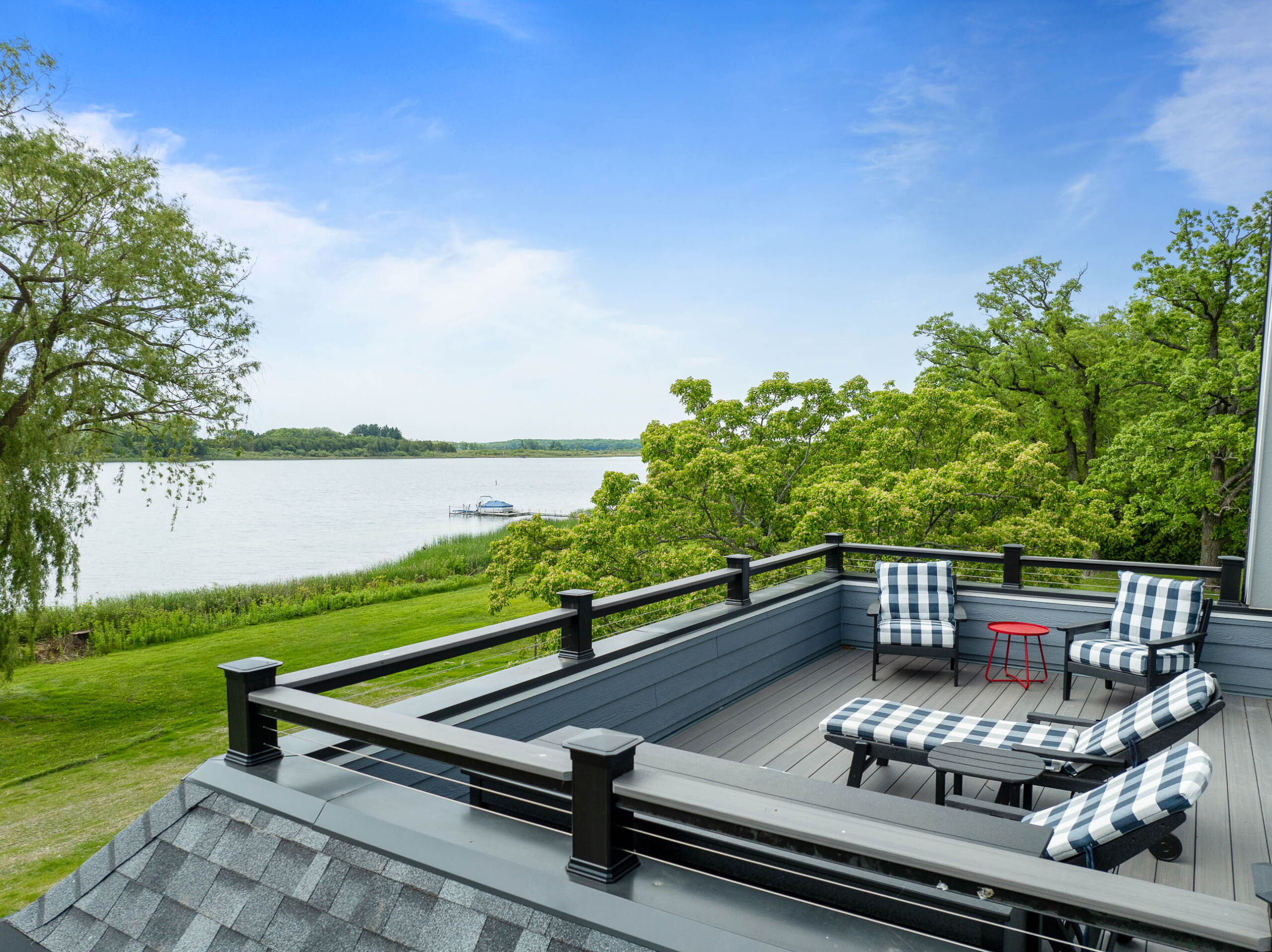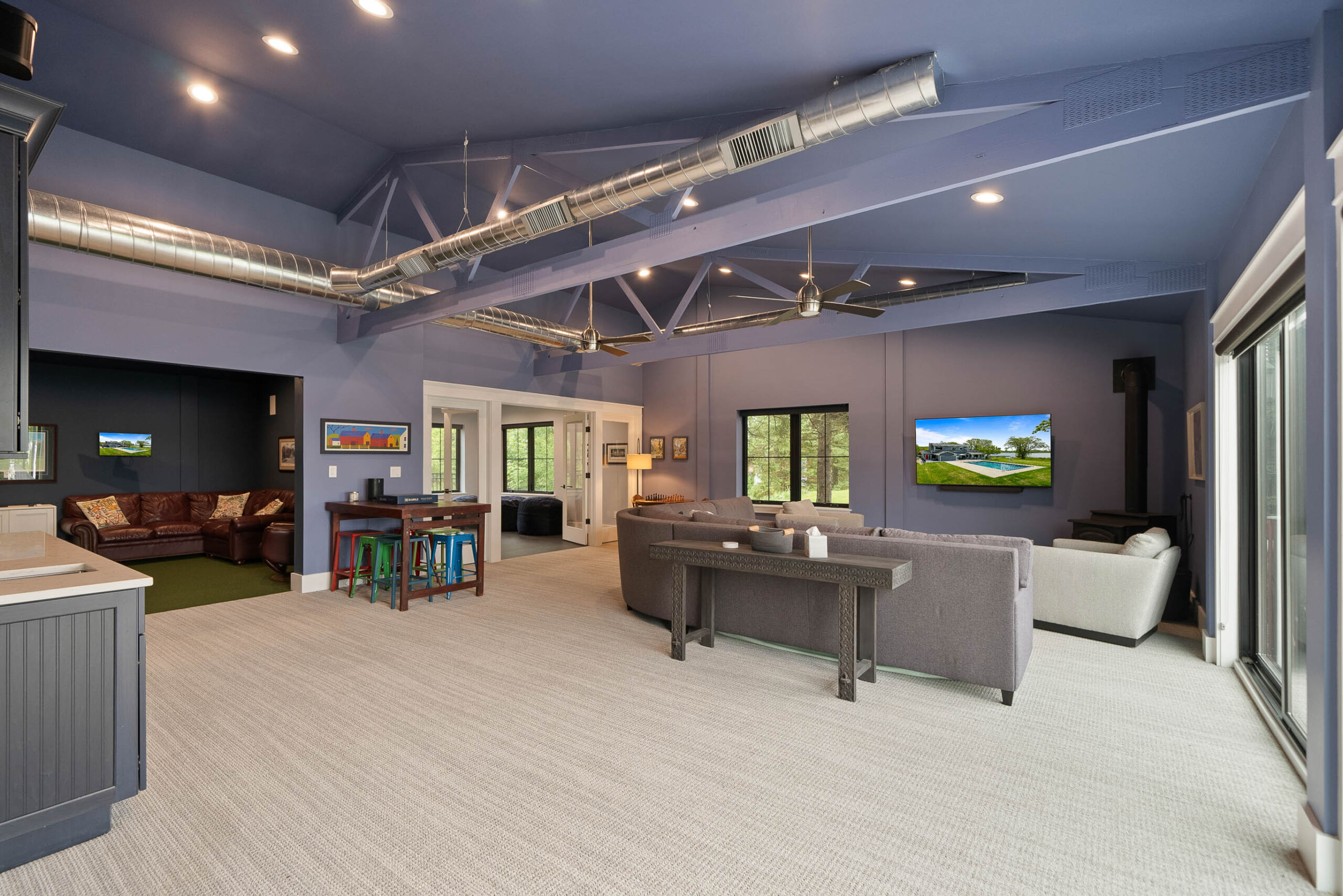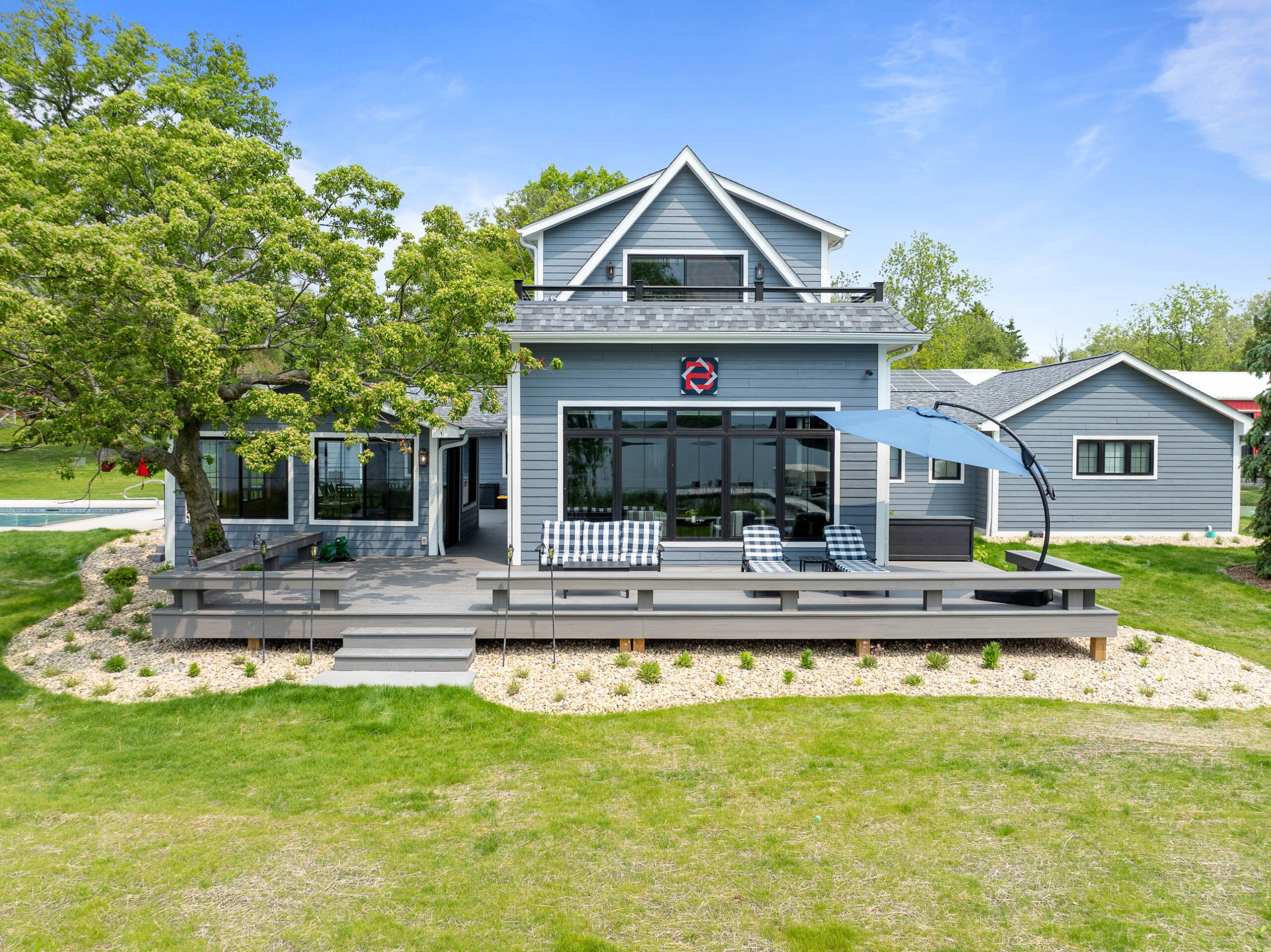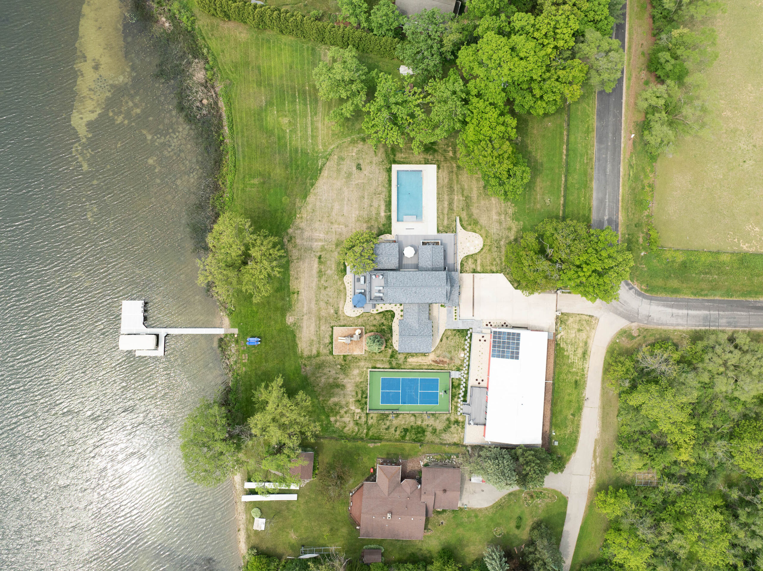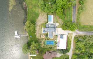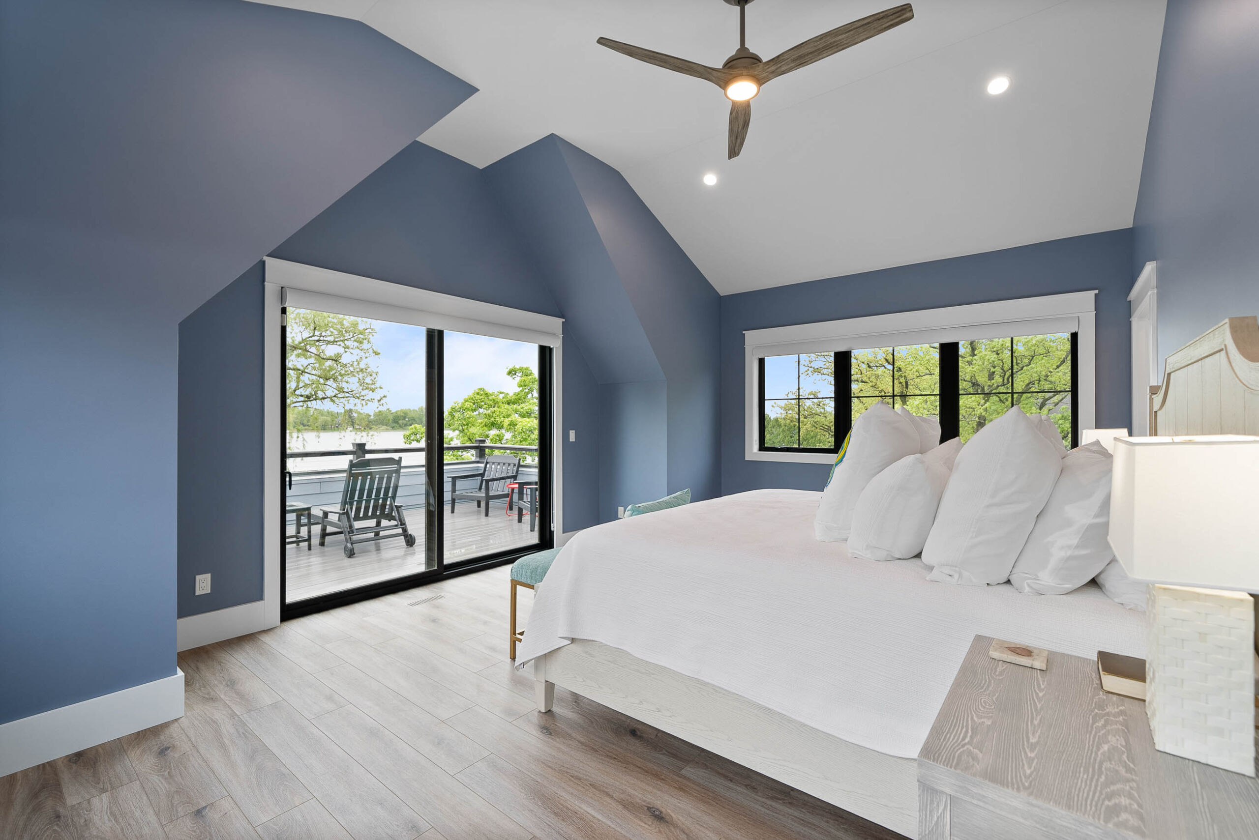 The primary suite features soaring ceilings and a private balcony with panoramic lake views. Additional highlights include a reimagined barn with an entertaining space and golf simulator. Outdoors, the property offers a built-in pool, tennis court, outdoor kitchen, and expansive decks that create a seamless blend of relaxation and recreation against the lakefront backdrop.