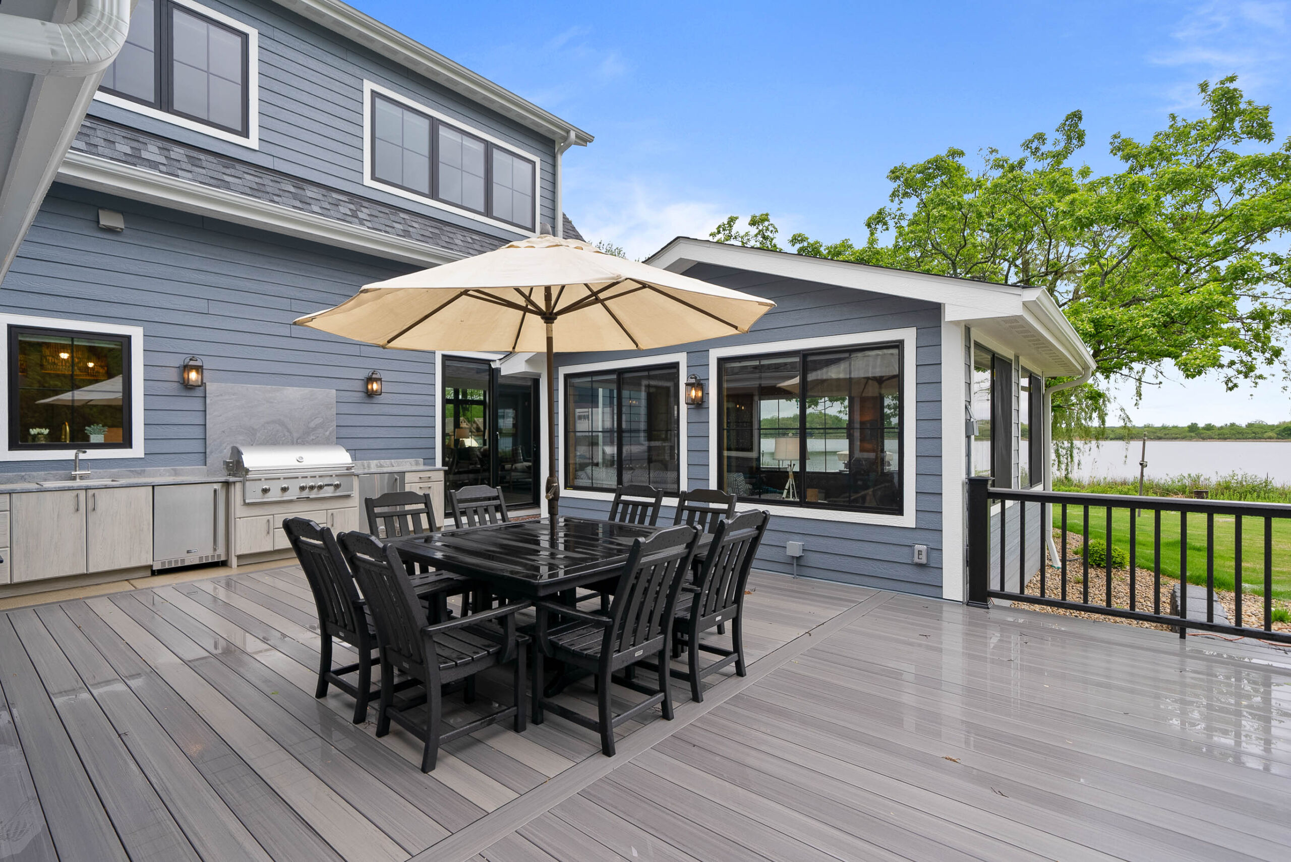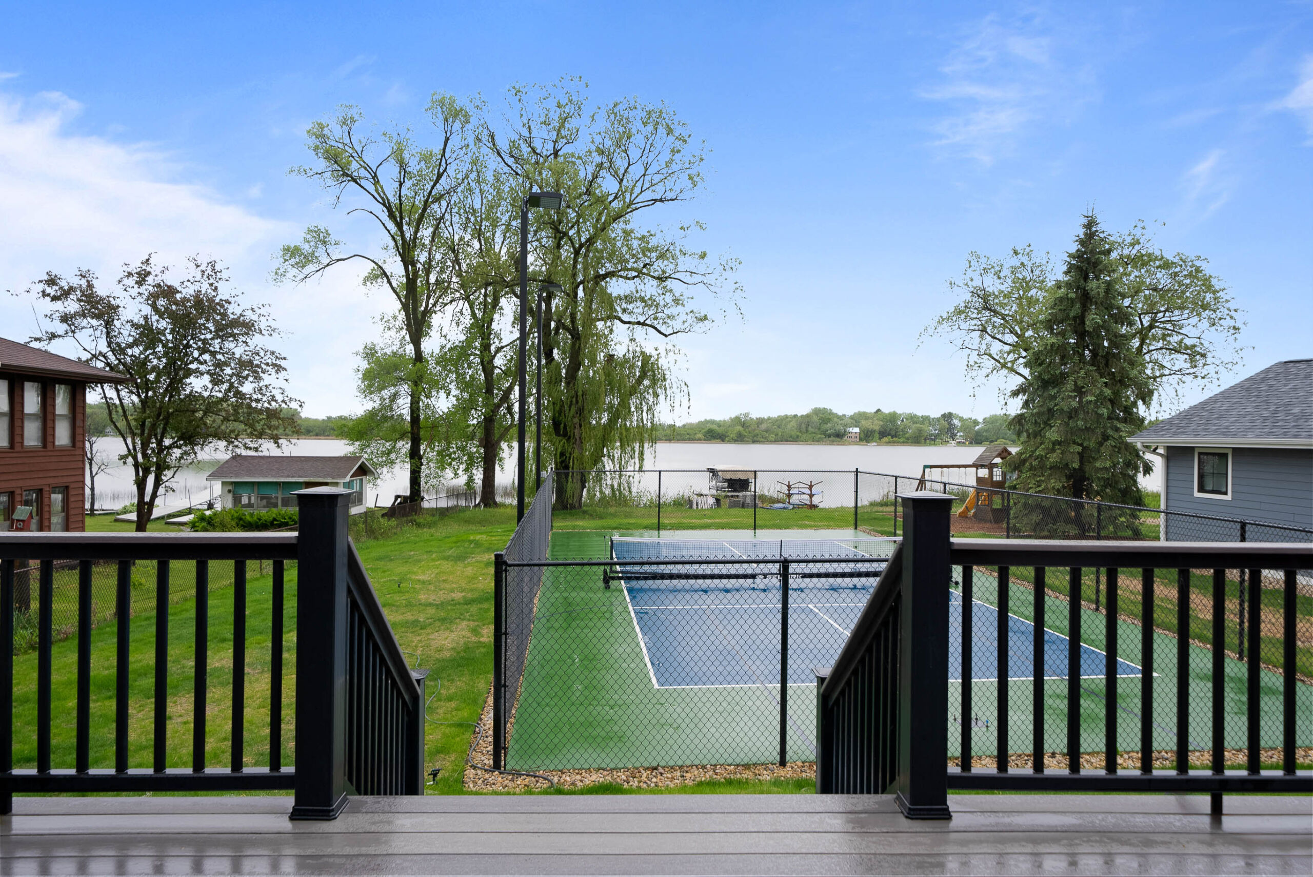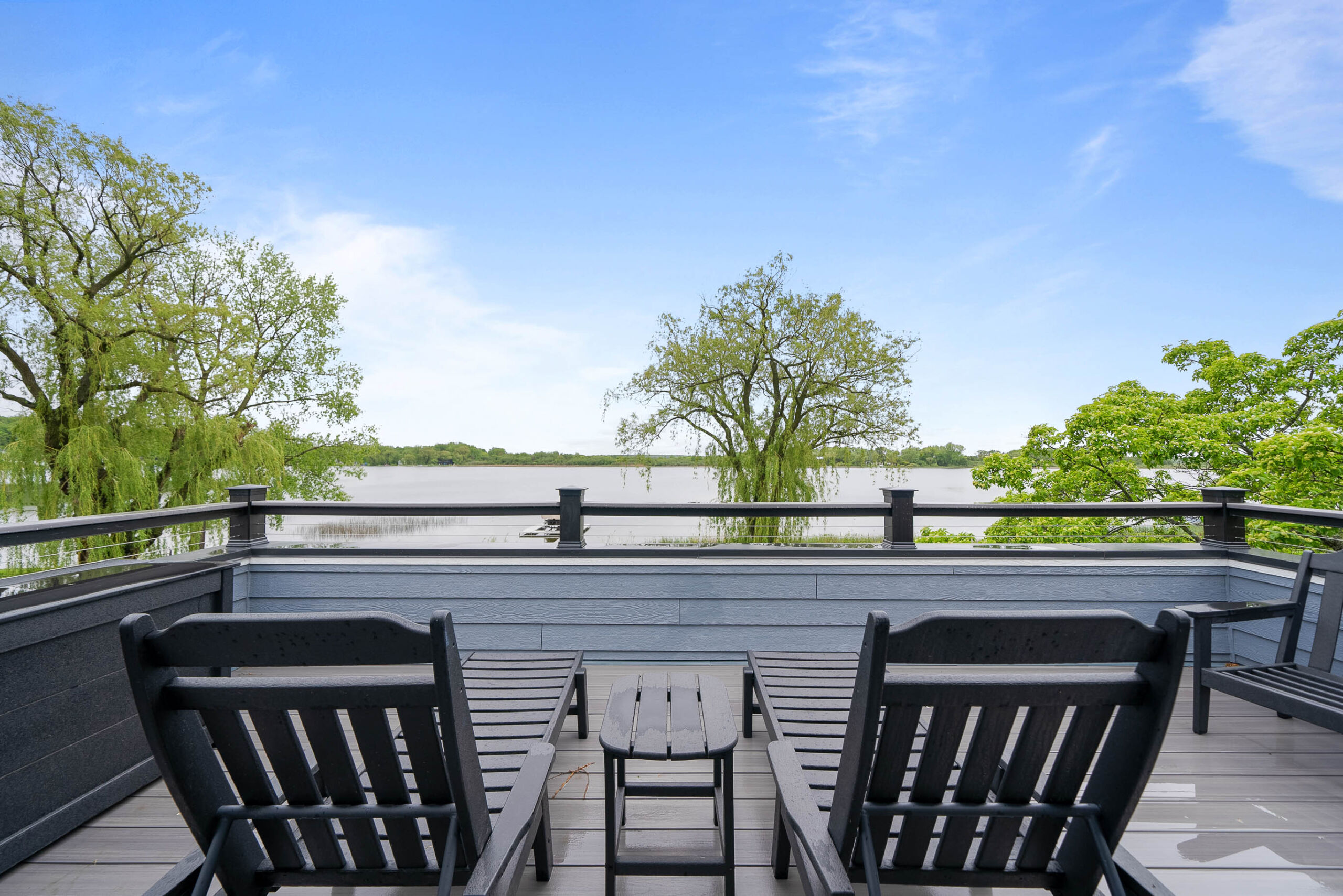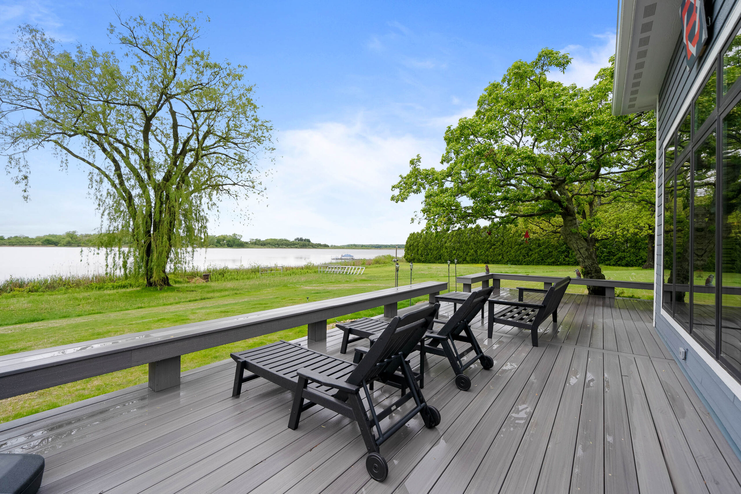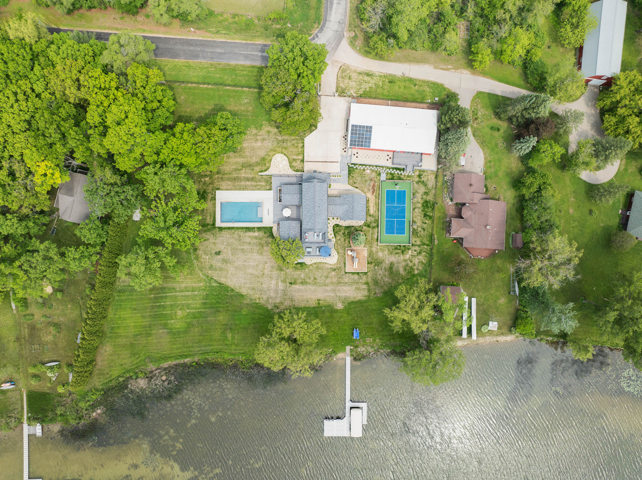 The primary suite features soaring ceilings and a private balcony with panoramic lake views. Additional highlights include a reimagined barn with an entertaining space and golf simulator. Outdoors, the property offers a built-in pool, tennis court, outdoor kitchen, and expansive decks that create a seamless blend of relaxation and recreation against the lakefront backdrop.