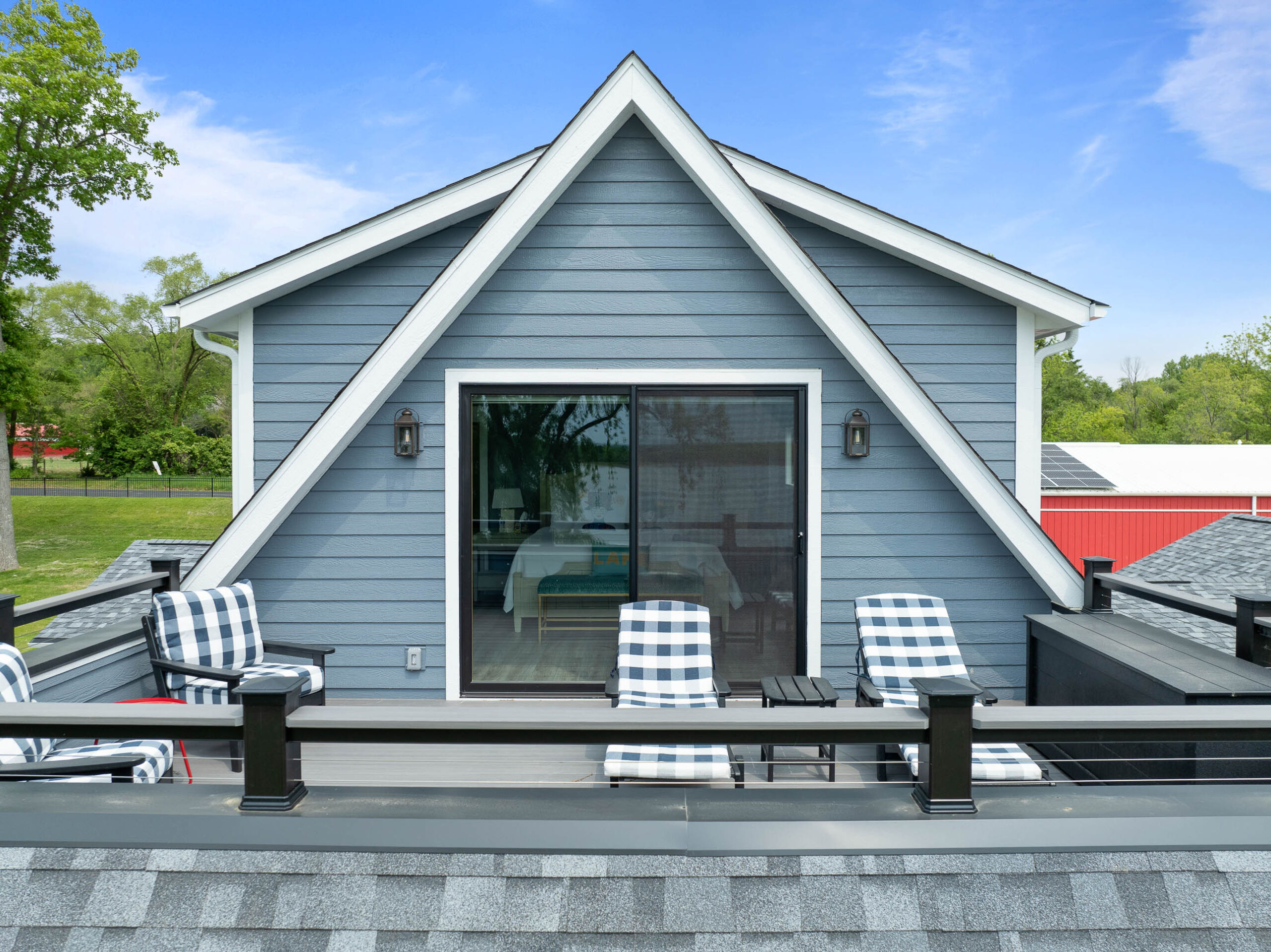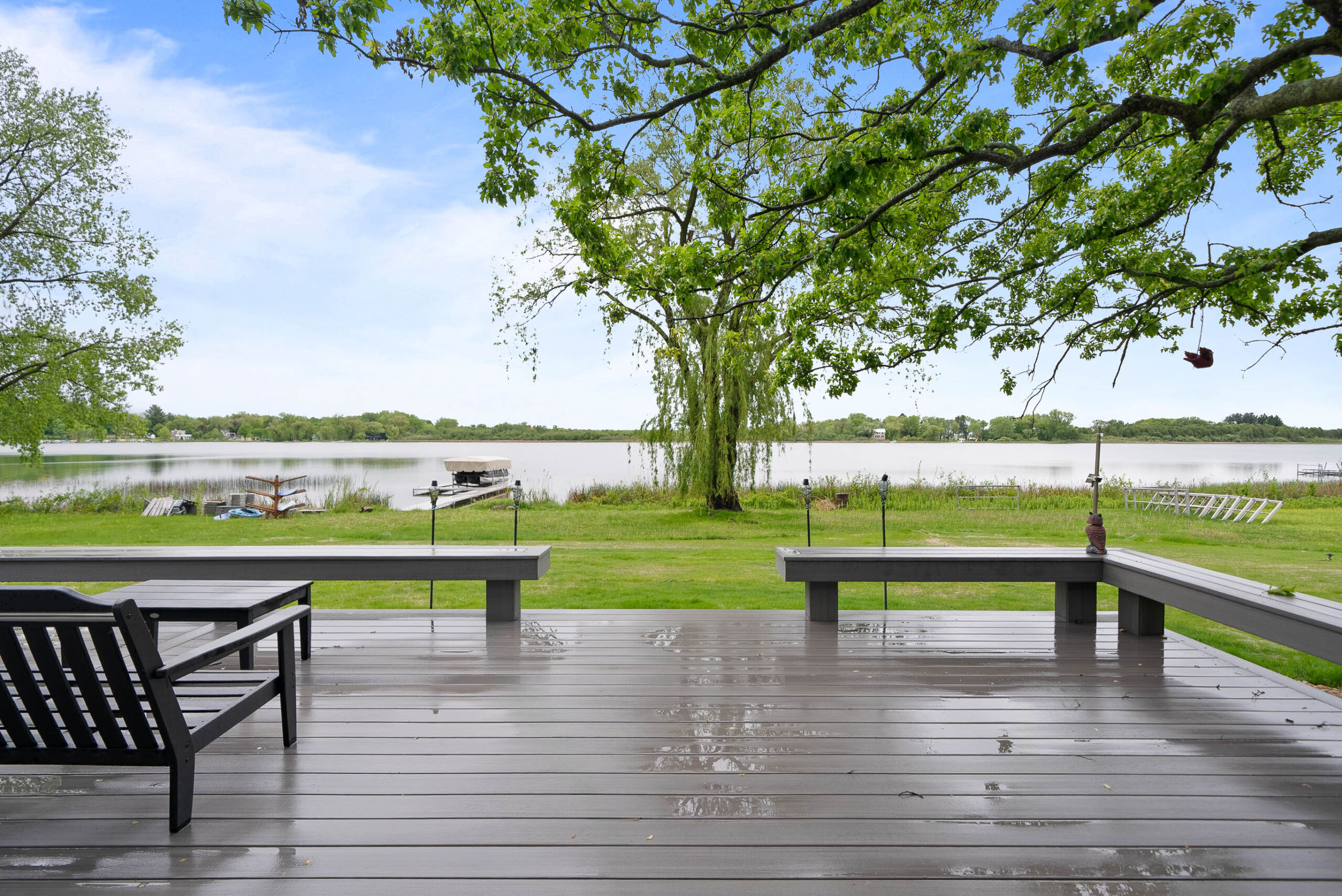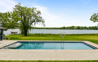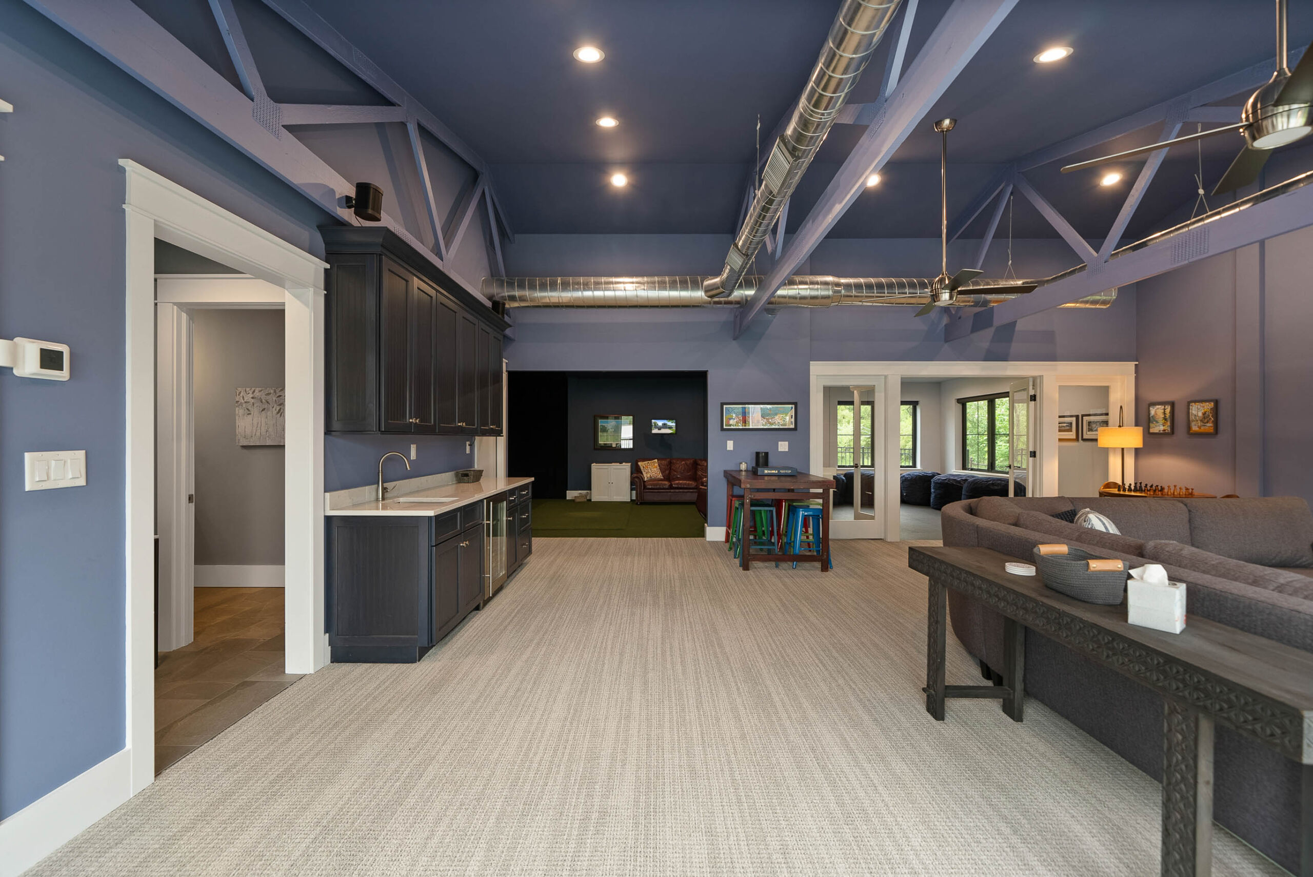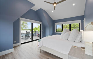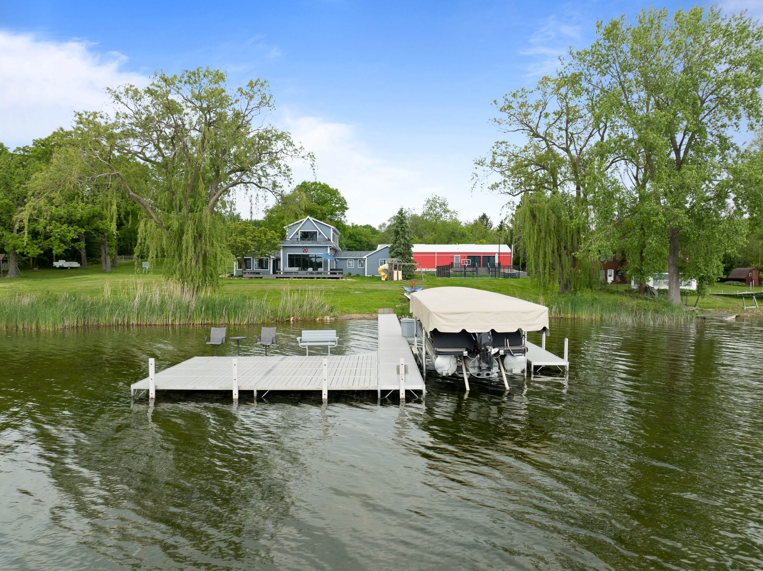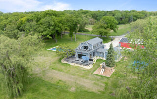 The primary suite features soaring ceilings and a private balcony with panoramic lake views. Additional highlights include a reimagined barn with an entertaining space and golf simulator. Outdoors, the property offers a built-in pool, tennis court, outdoor kitchen, and expansive decks that create a seamless blend of relaxation and recreation against the lakefront backdrop.