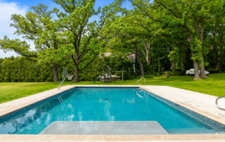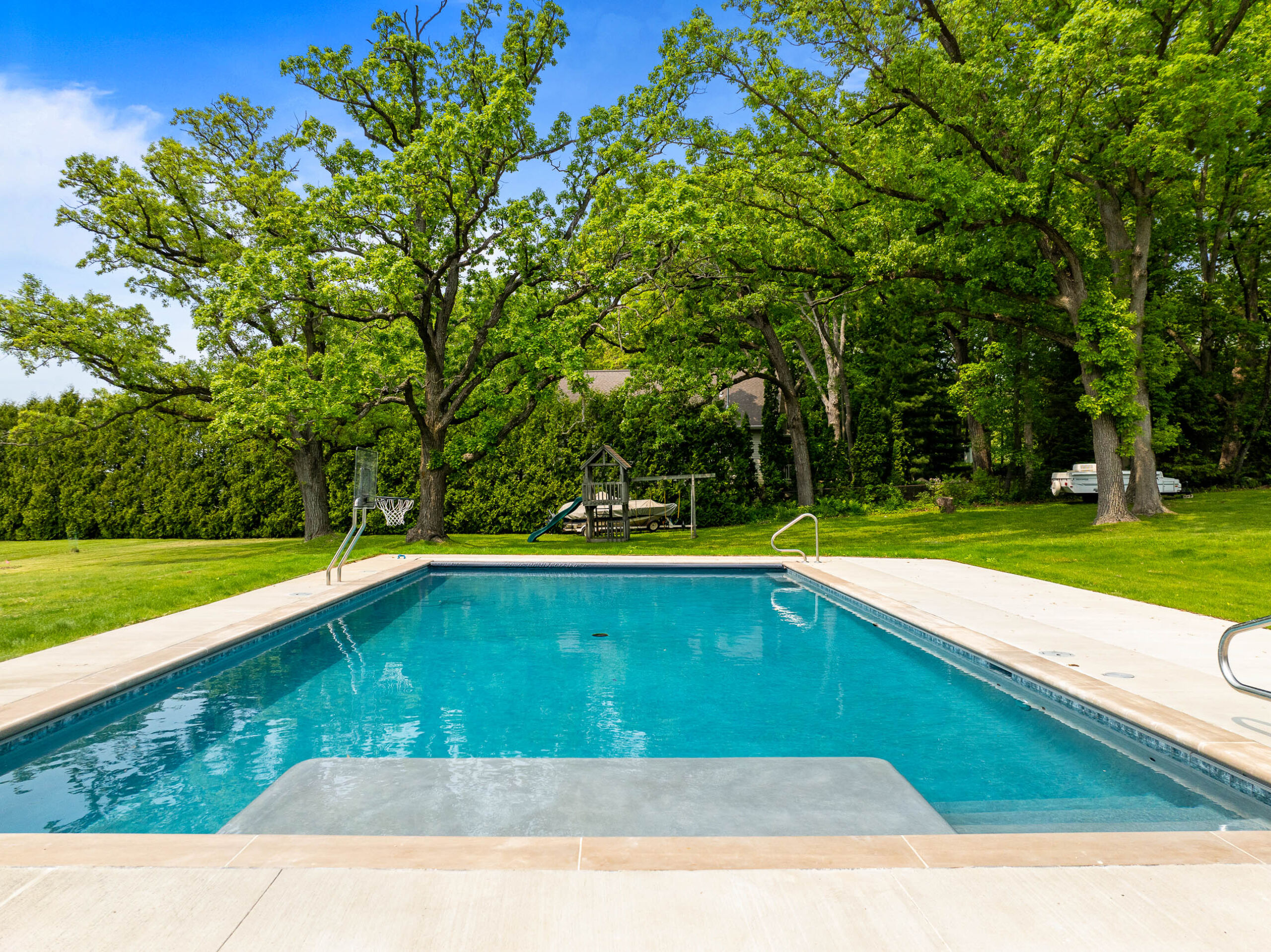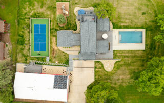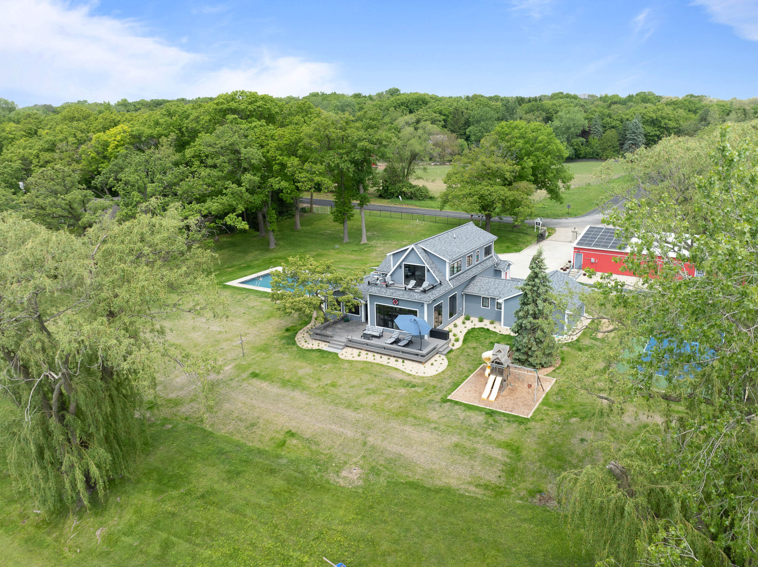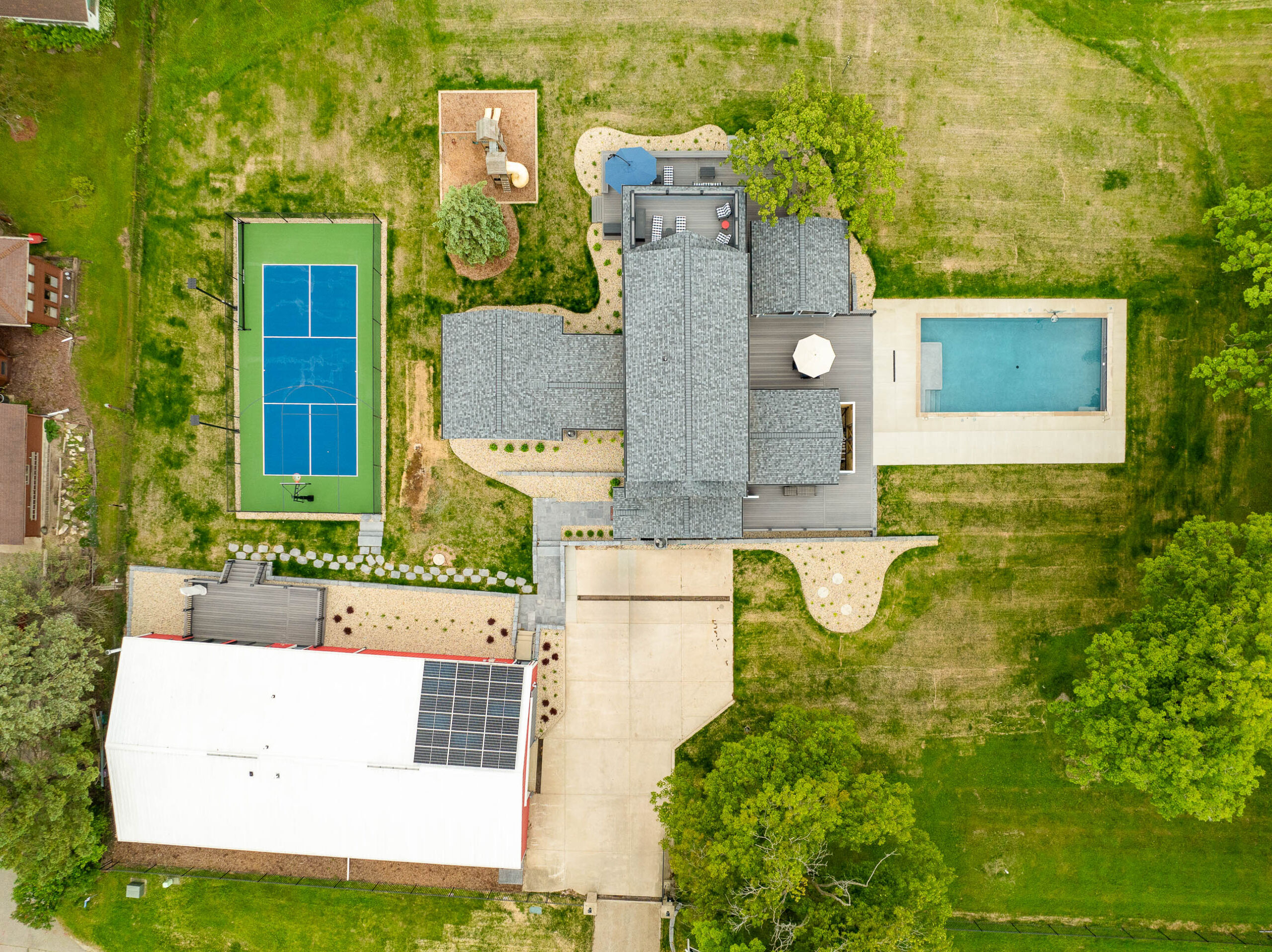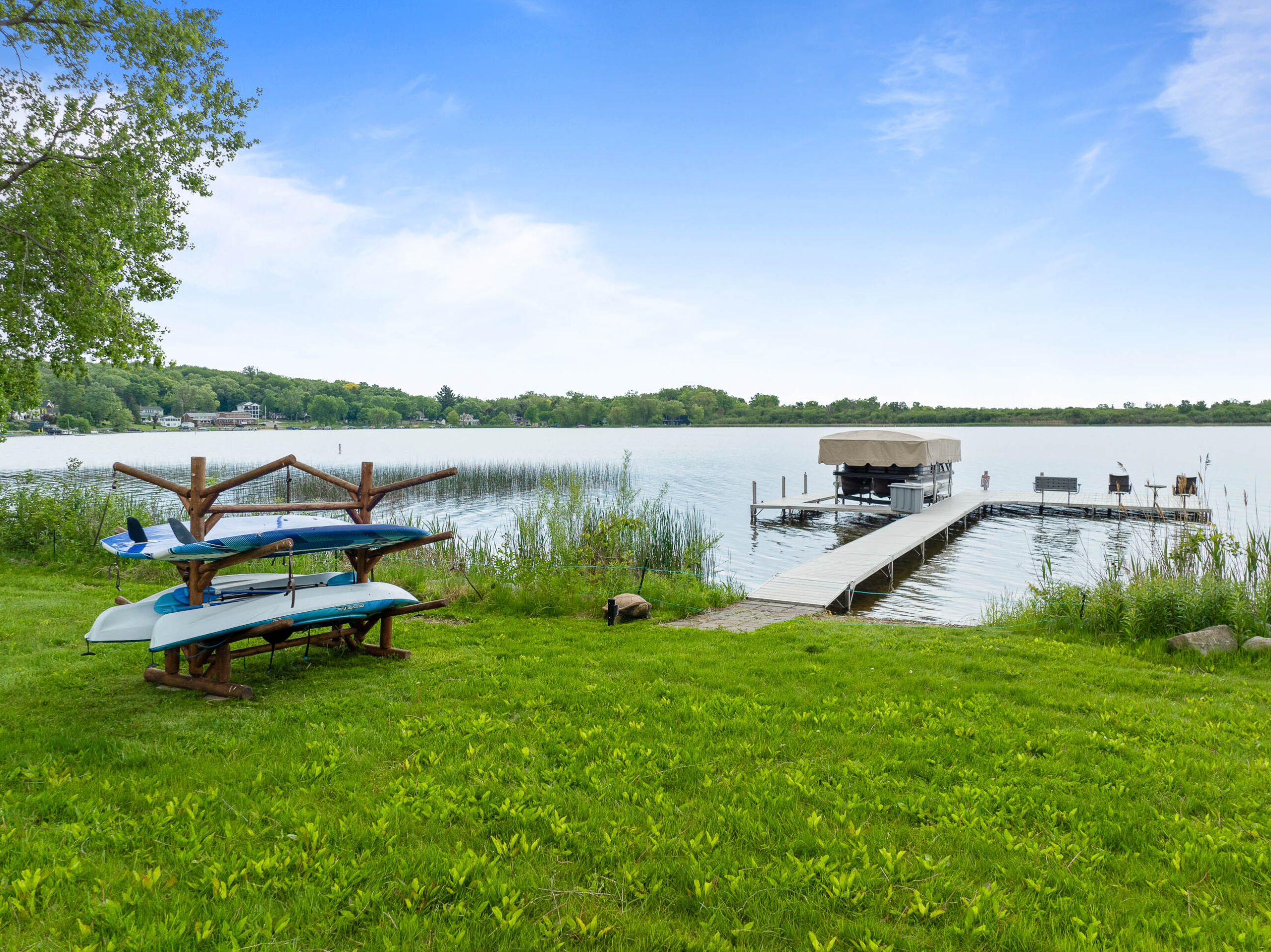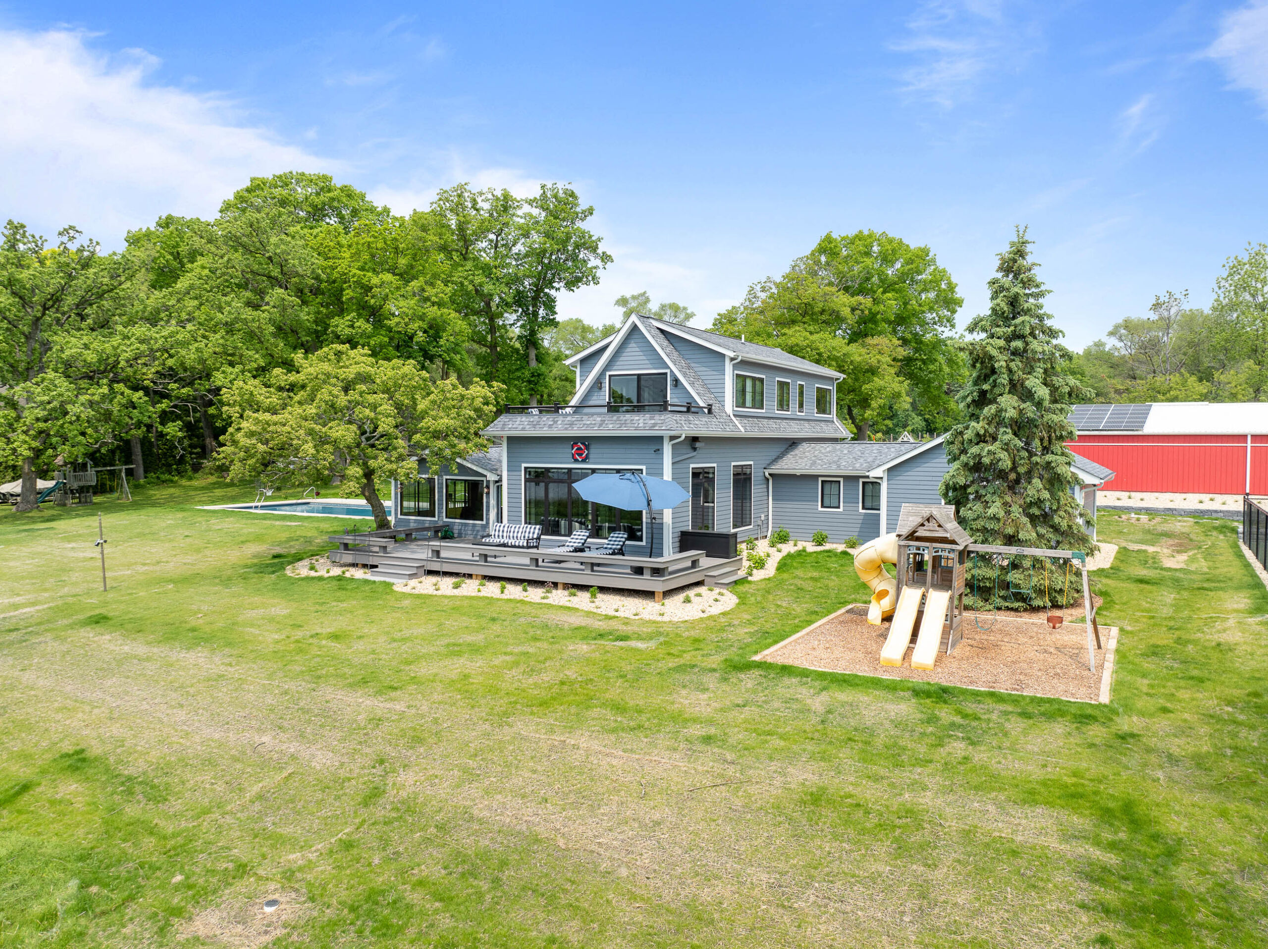 The primary suite features soaring ceilings and a private balcony with panoramic lake views. Additional highlights include a reimagined barn with an entertaining space and golf simulator. Outdoors, the property offers a built-in pool, tennis court, outdoor kitchen, and expansive decks that create a seamless blend of relaxation and recreation against the lakefront backdrop.